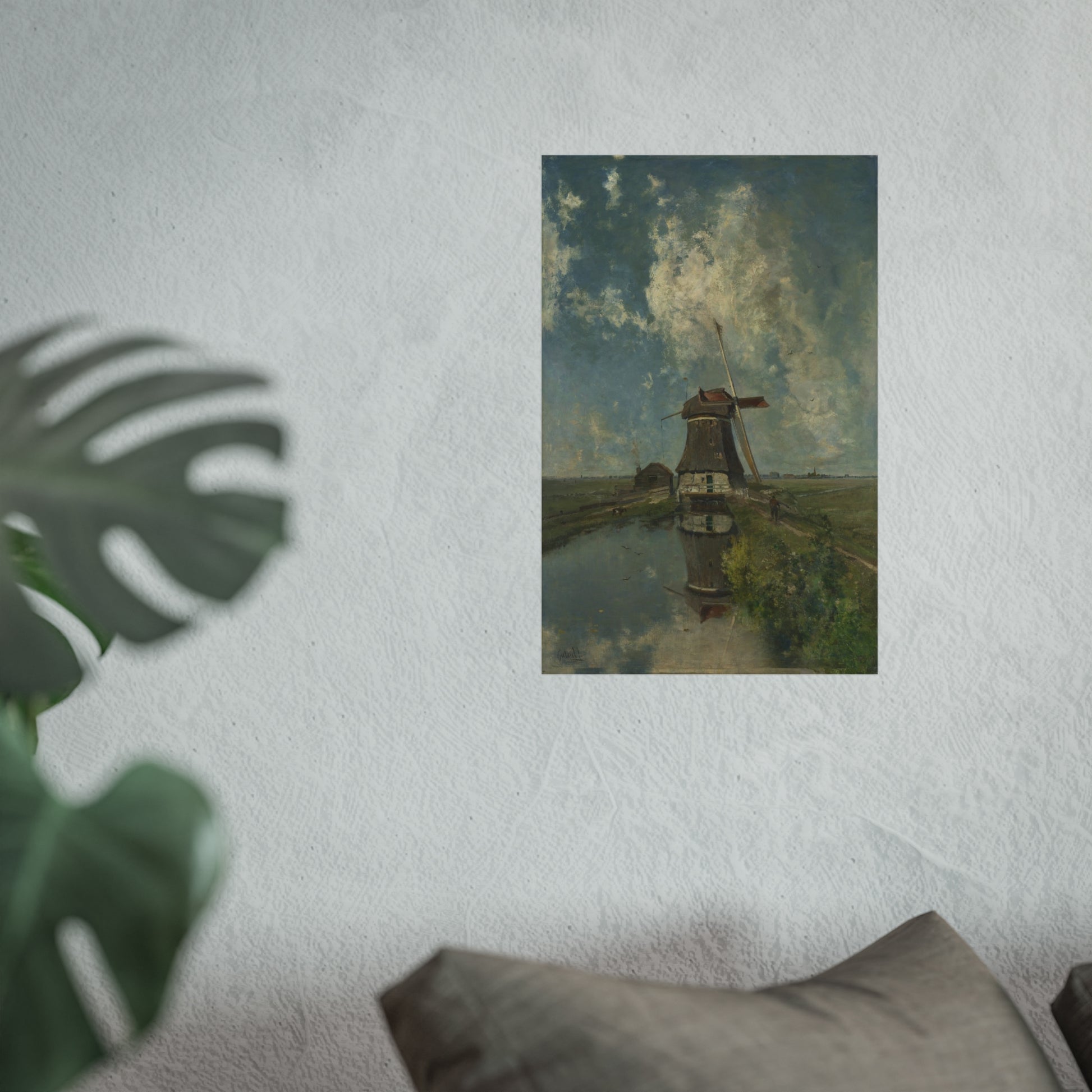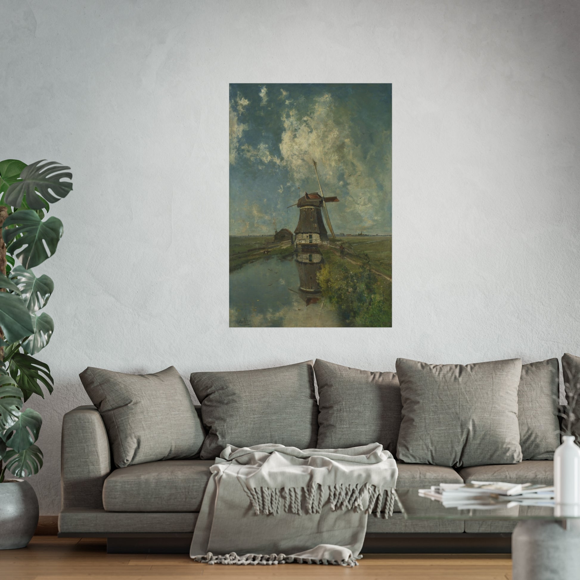 Experience the tranquil beauty of summer with this depiction of a windmill situated by a polder waterway. The windmill's reflection dances on the water's surface, creating a serene atmosphere. To the right, a man ambles along the path leading to the windmill, while on the left, a quaint house sits quietly.