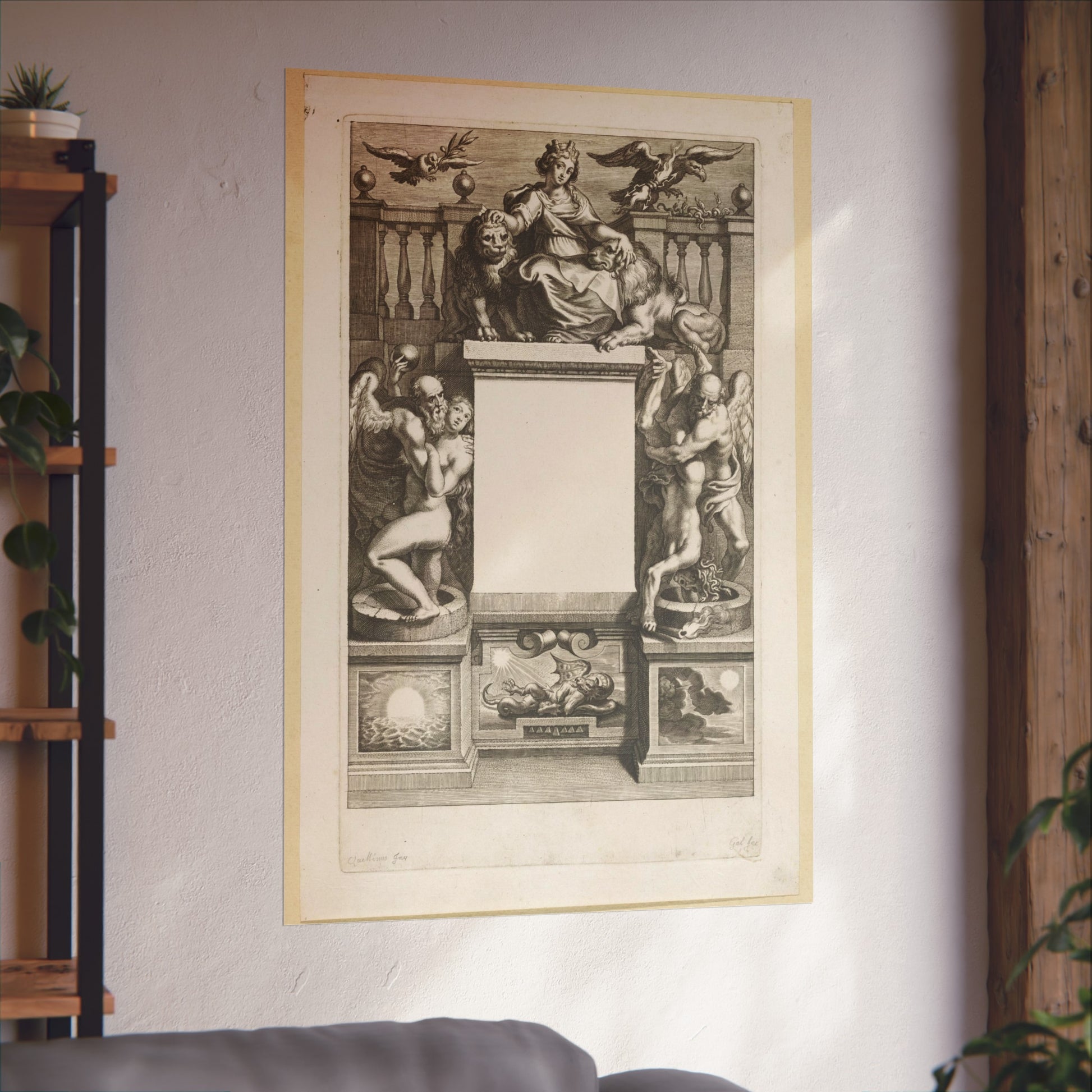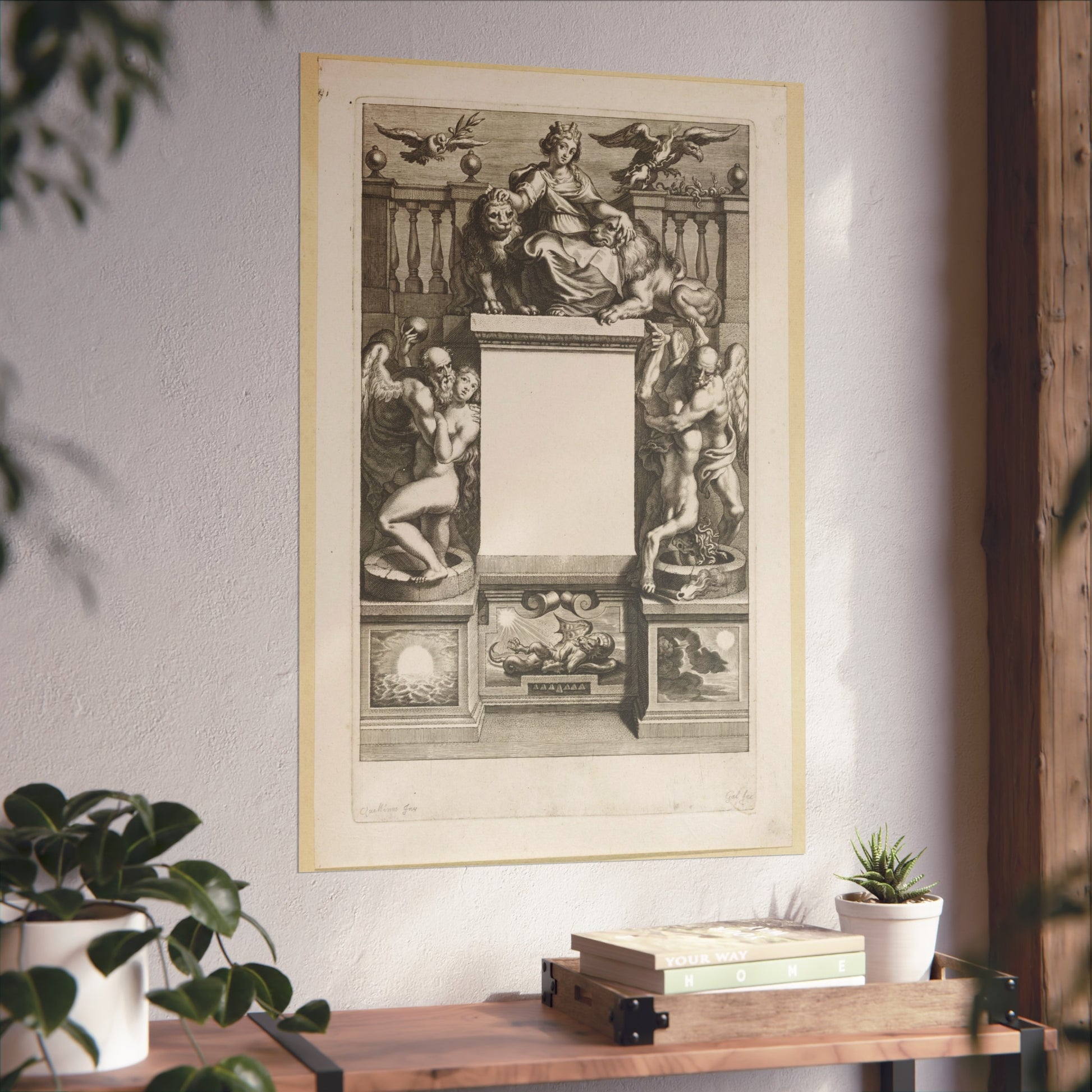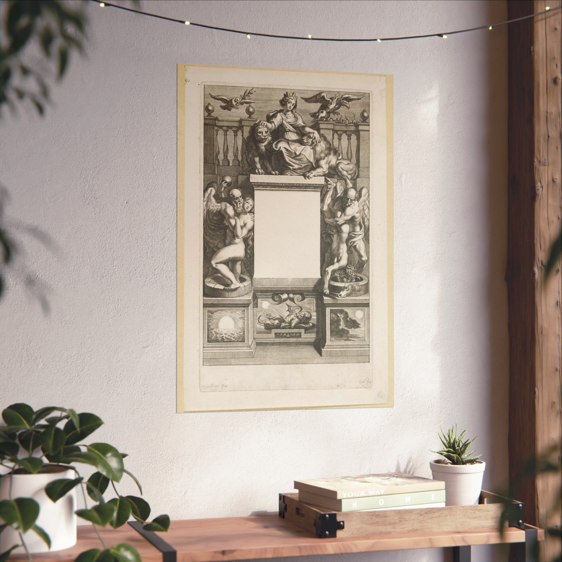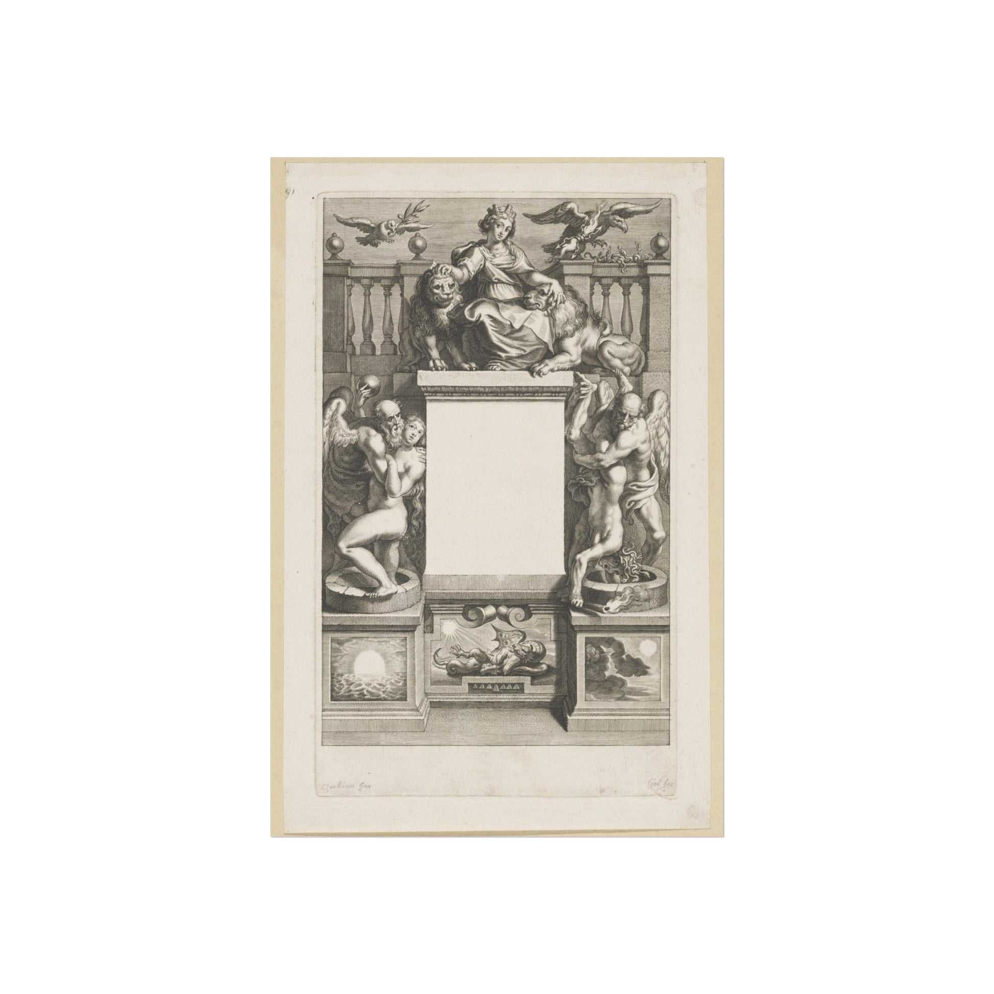 An allegorical figure, adorned with a city crown and flanked by two lions, sits before a balustrade. On either side, symbolic representations of peace (a dove) and battle (an eagle clutching a lightning bolt) are depicted. To the left, Father Time reveals the Truth, while on the right, he conceals Envy. This artwork serves as the title page for a book detailing the conflict between Maria de' Medici and her son Louis XIII.