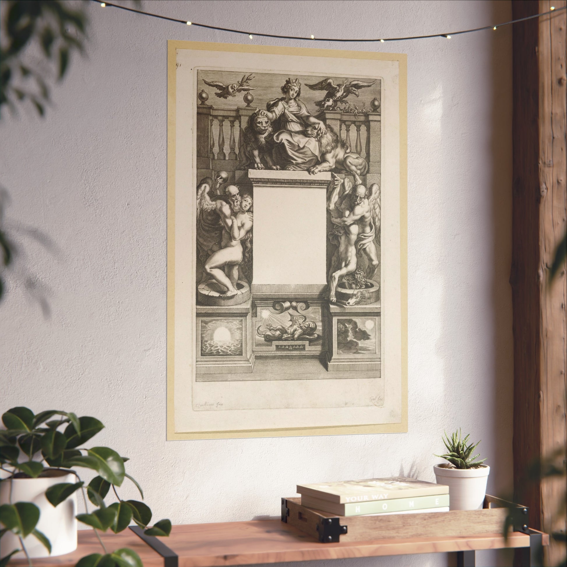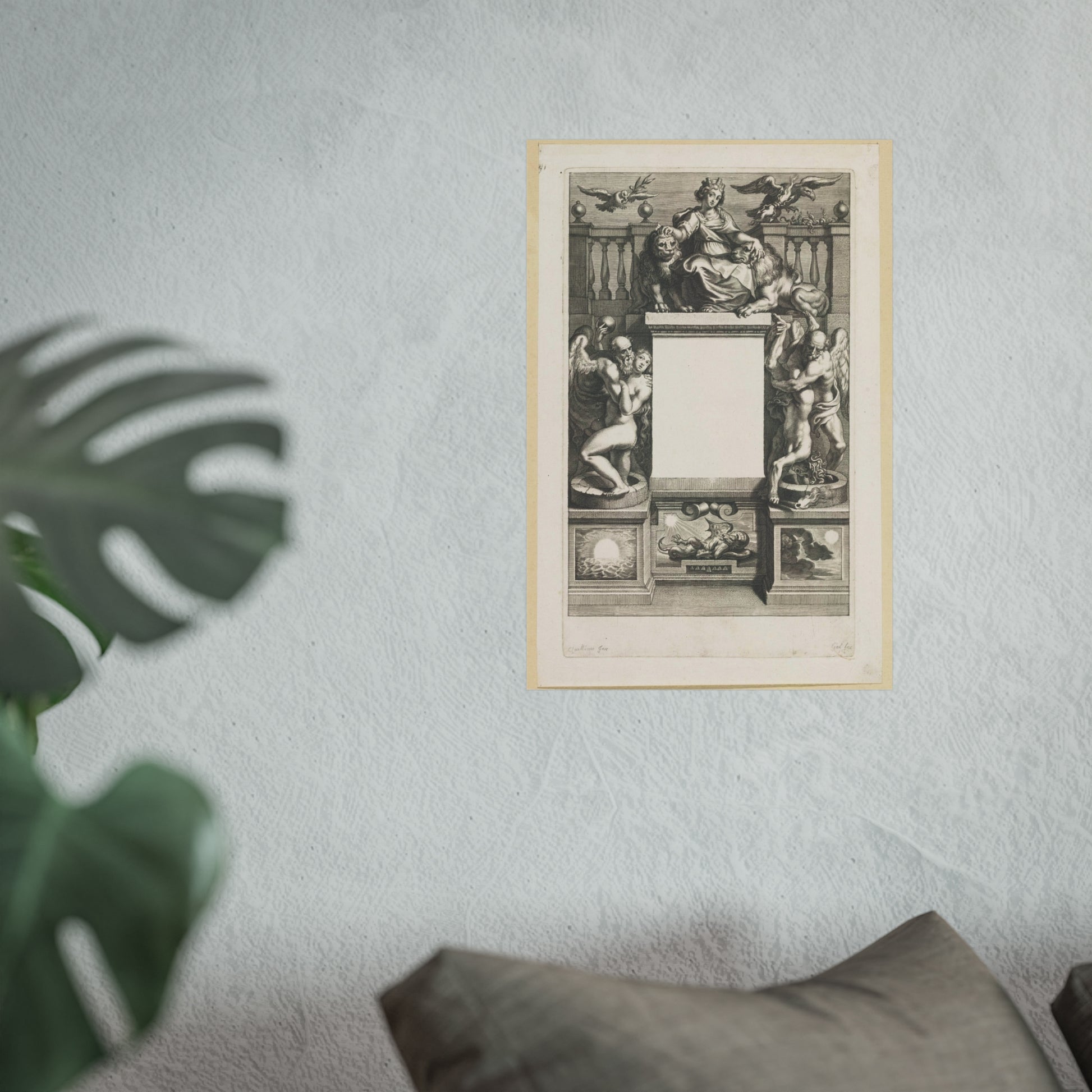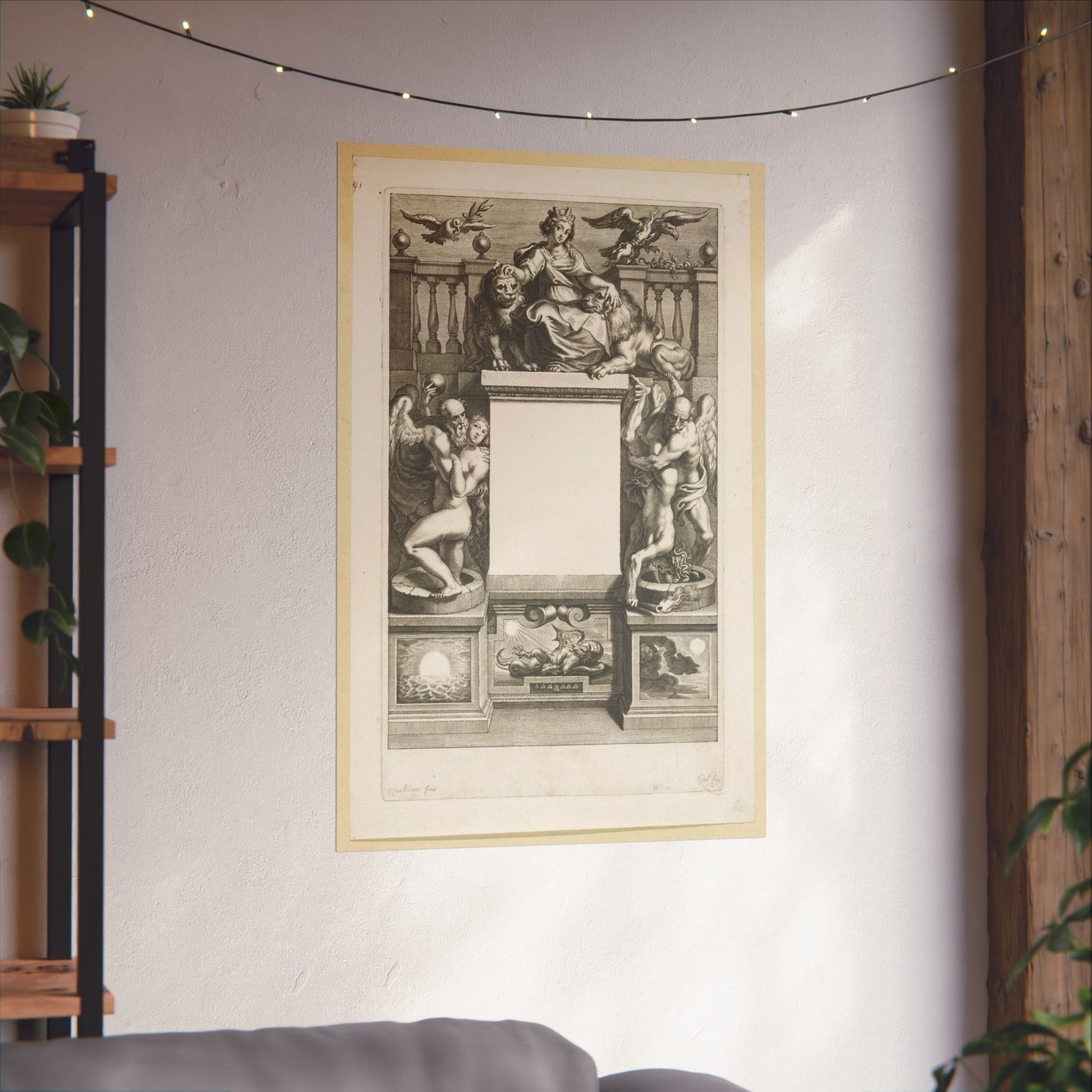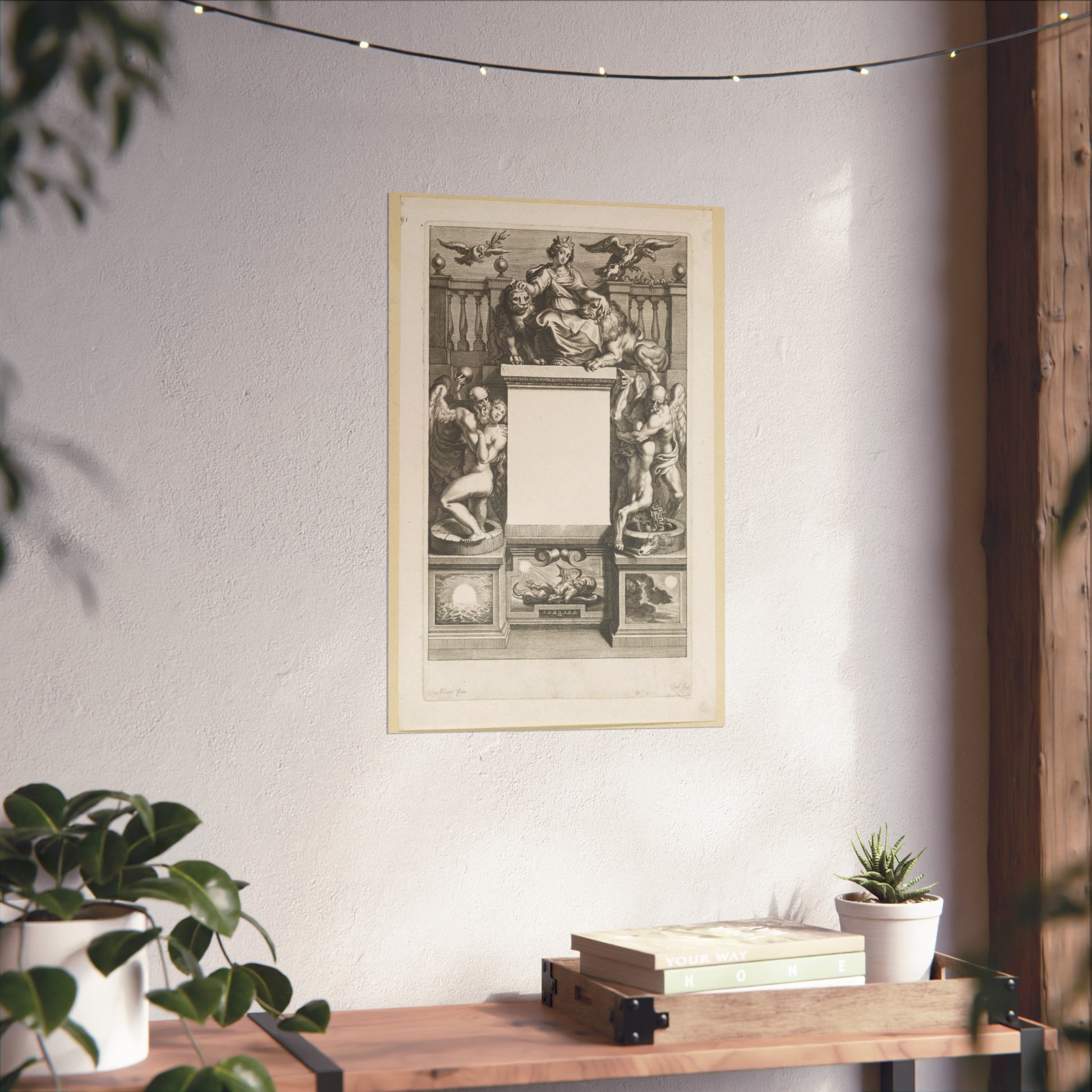 An allegorical figure, adorned with a city crown and flanked by two lions, sits before a balustrade. On either side, symbolic representations of peace (a dove) and battle (an eagle clutching a lightning bolt) are depicted. To the left, Father Time reveals the Truth, while on the right, he conceals Envy. This artwork serves as the title page for a book detailing the conflict between Maria de' Medici and her son Louis XIII.