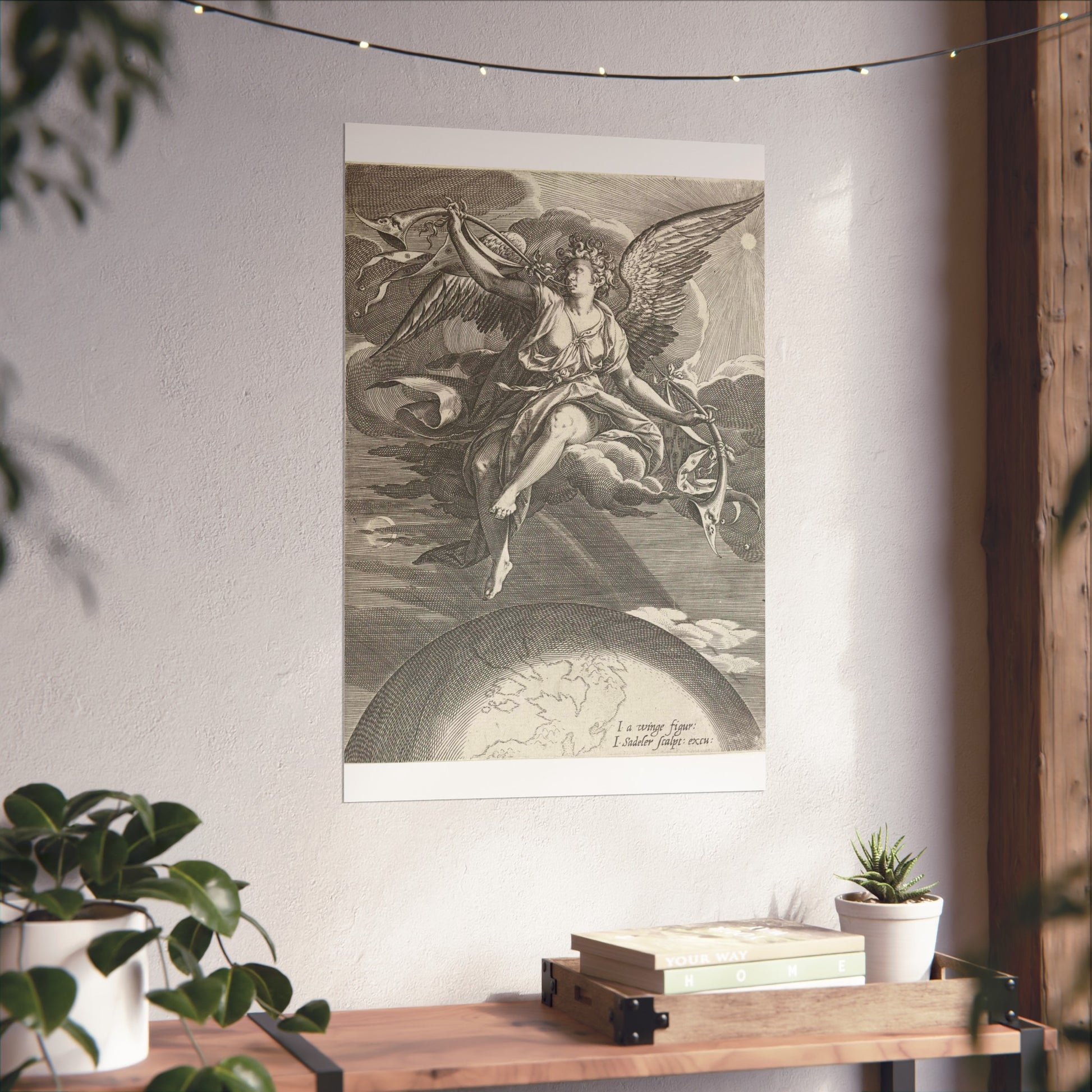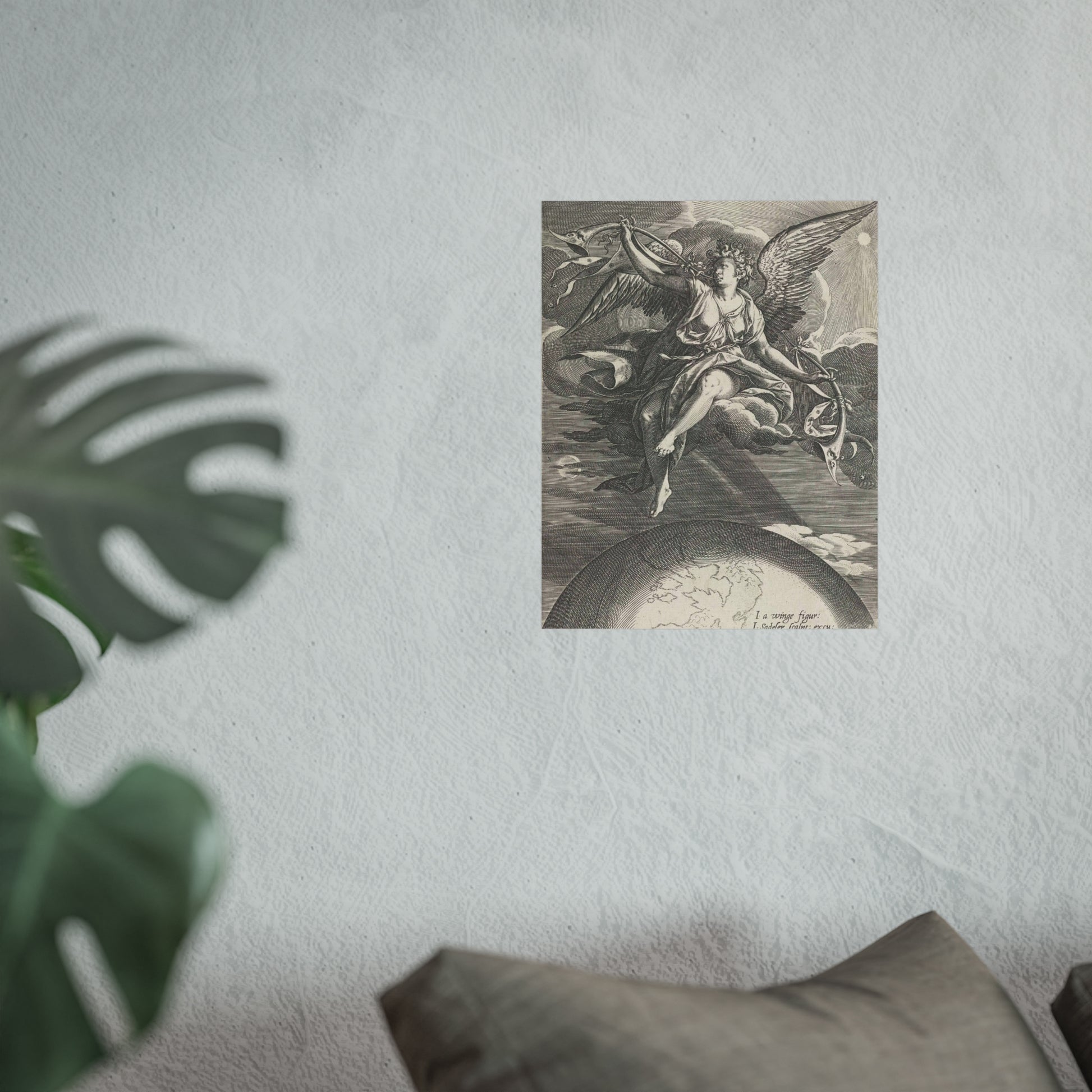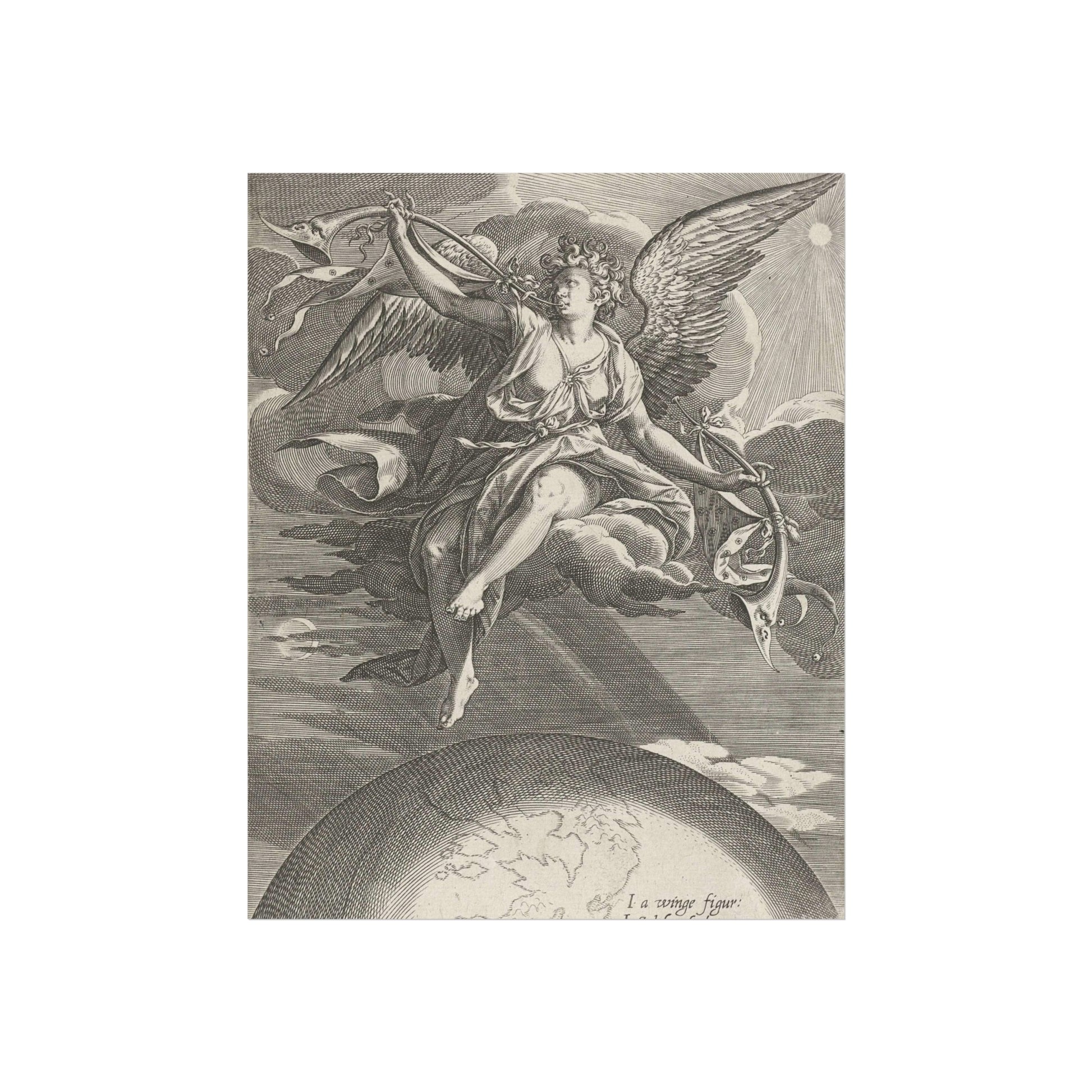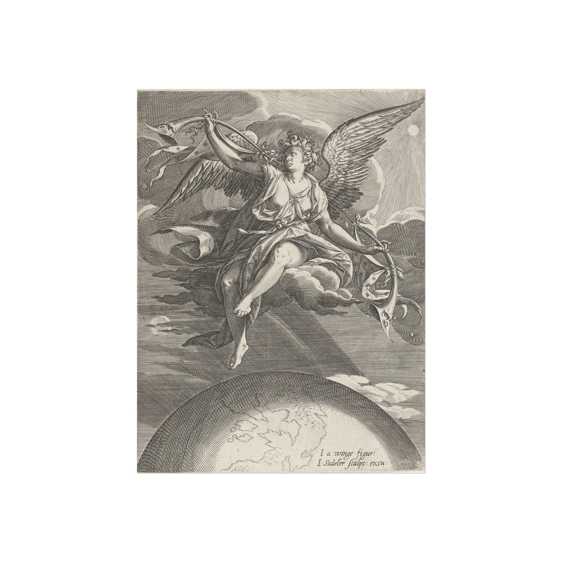 The winged personification of Fame (Fama) soars high above the globe, her lips pressed to one of her two trumpets of praise. The sound echoes across the world, a testament to her power and reach.