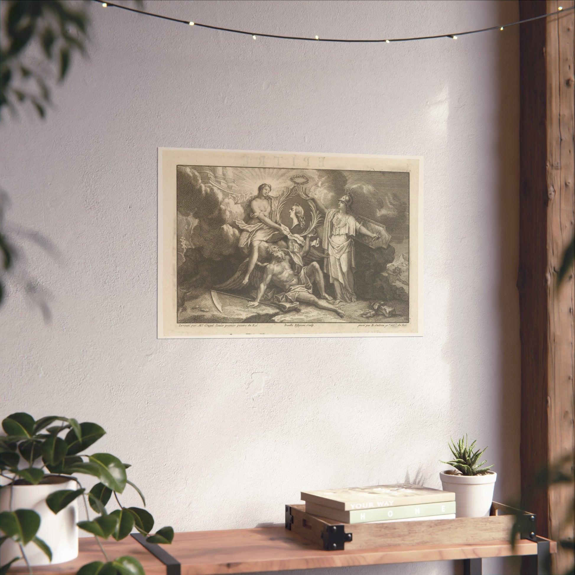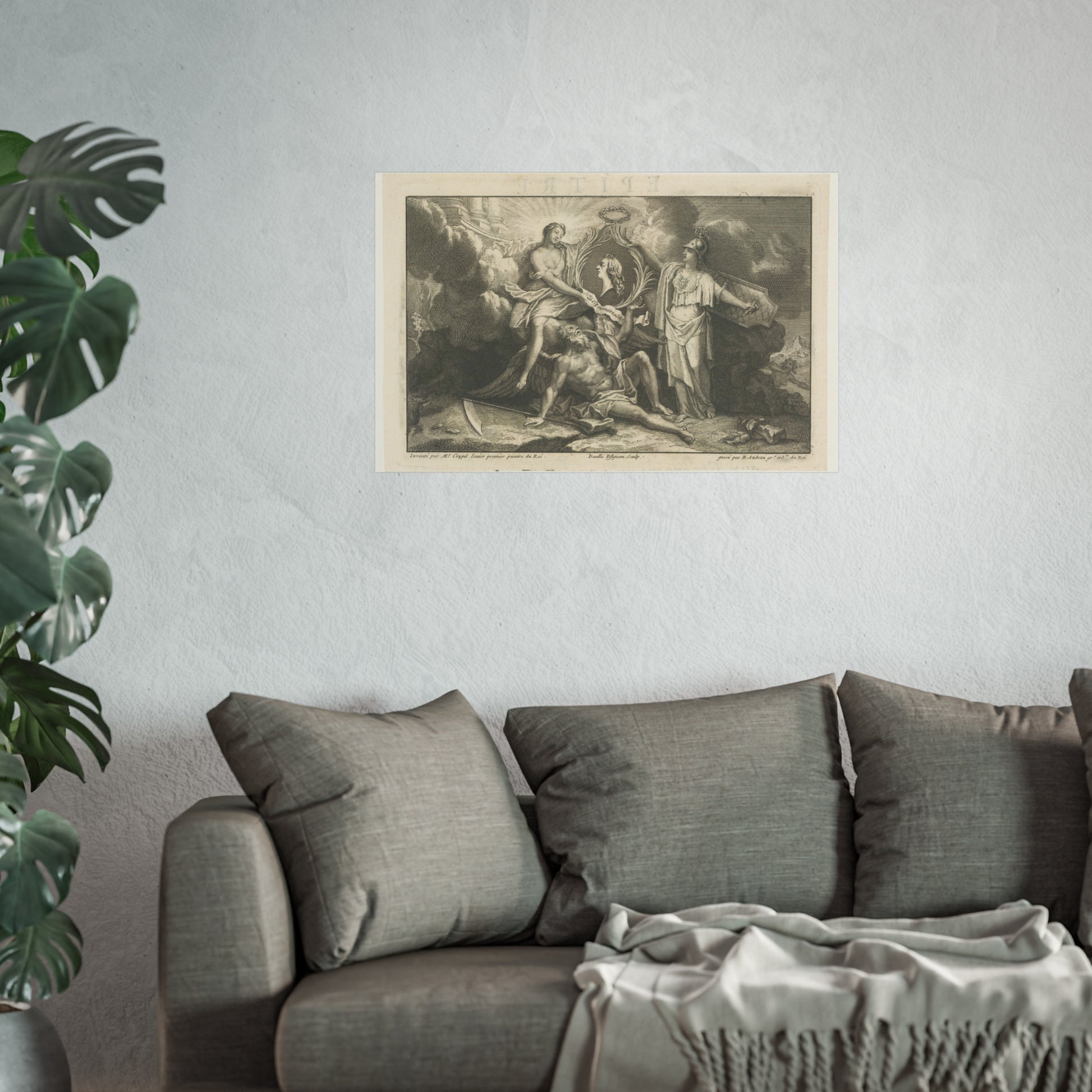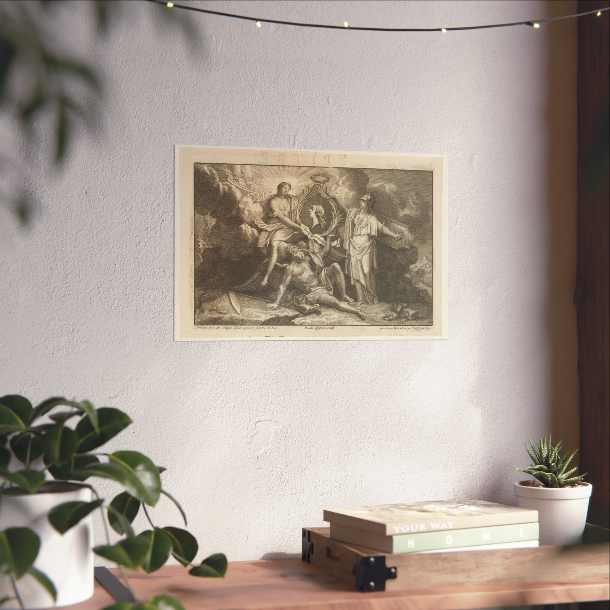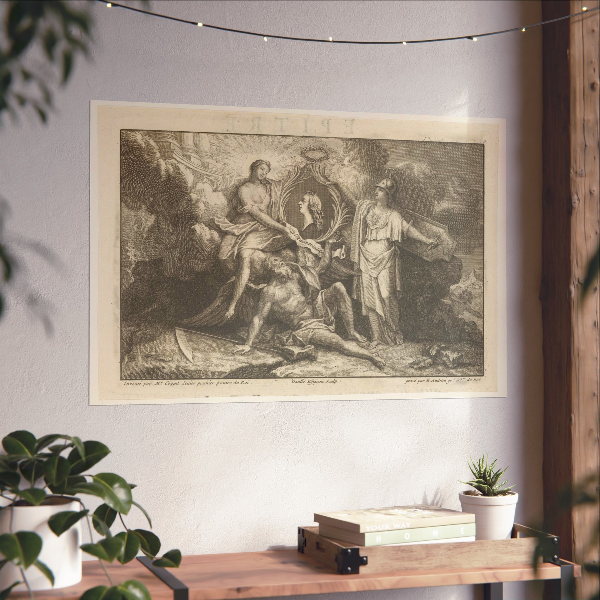 At the center of the artwork, the profile of the French king commands attention. To his left, an allegorical figure radiates with sunbeams, while Minerva, the goddess of wisdom, stands to his right. Below them, Chronos, the personification of time, anchors the scene.