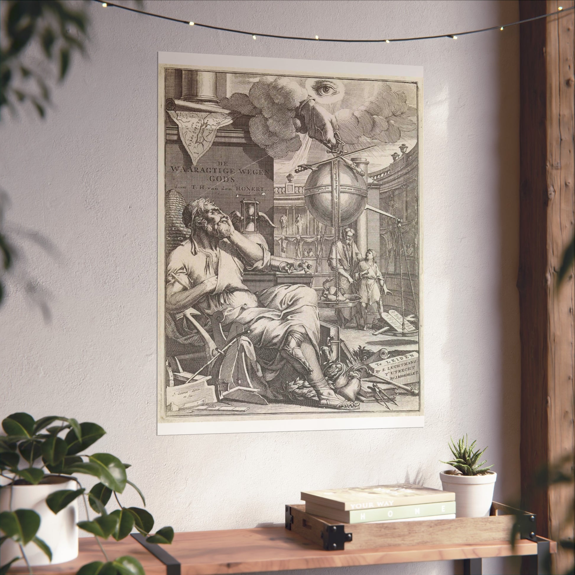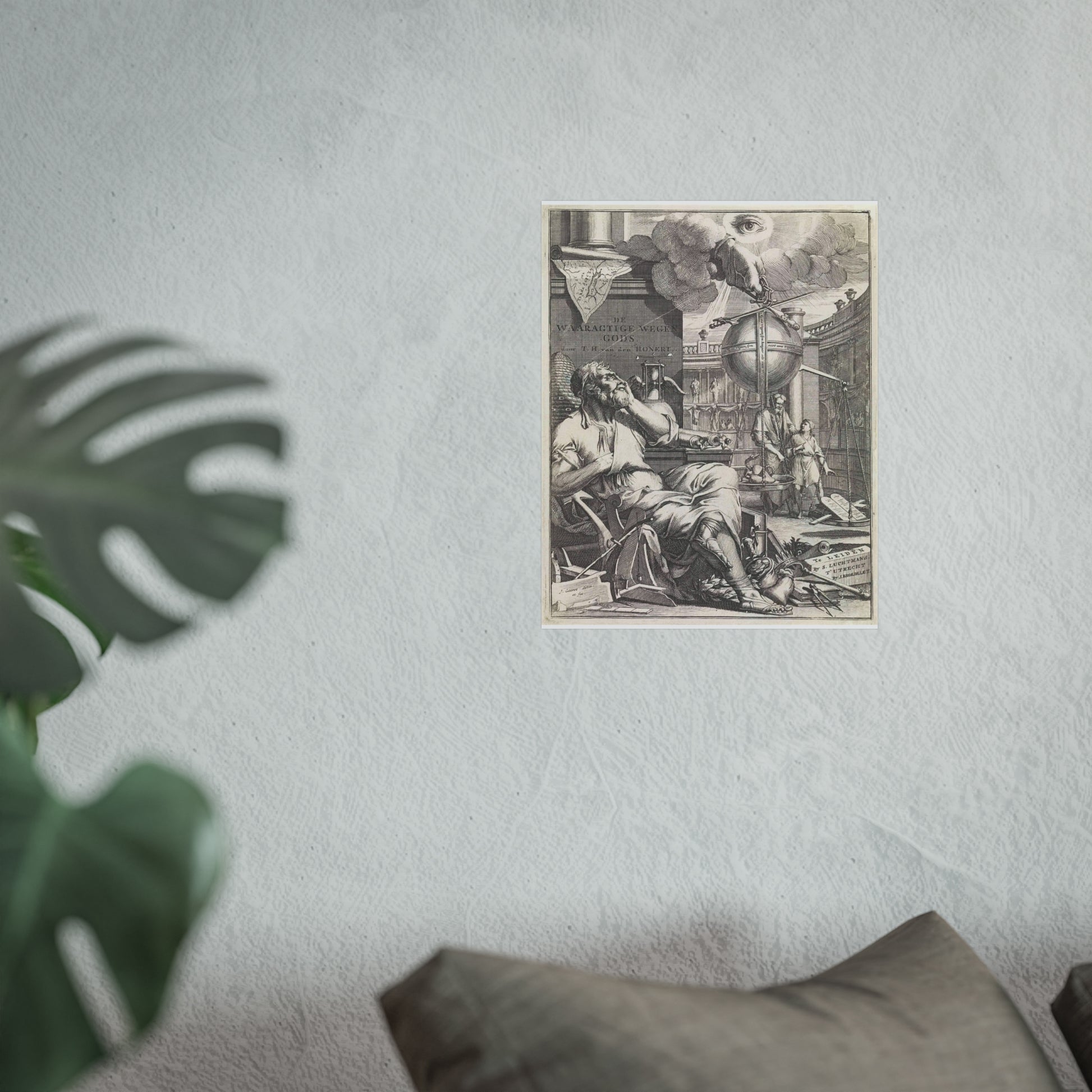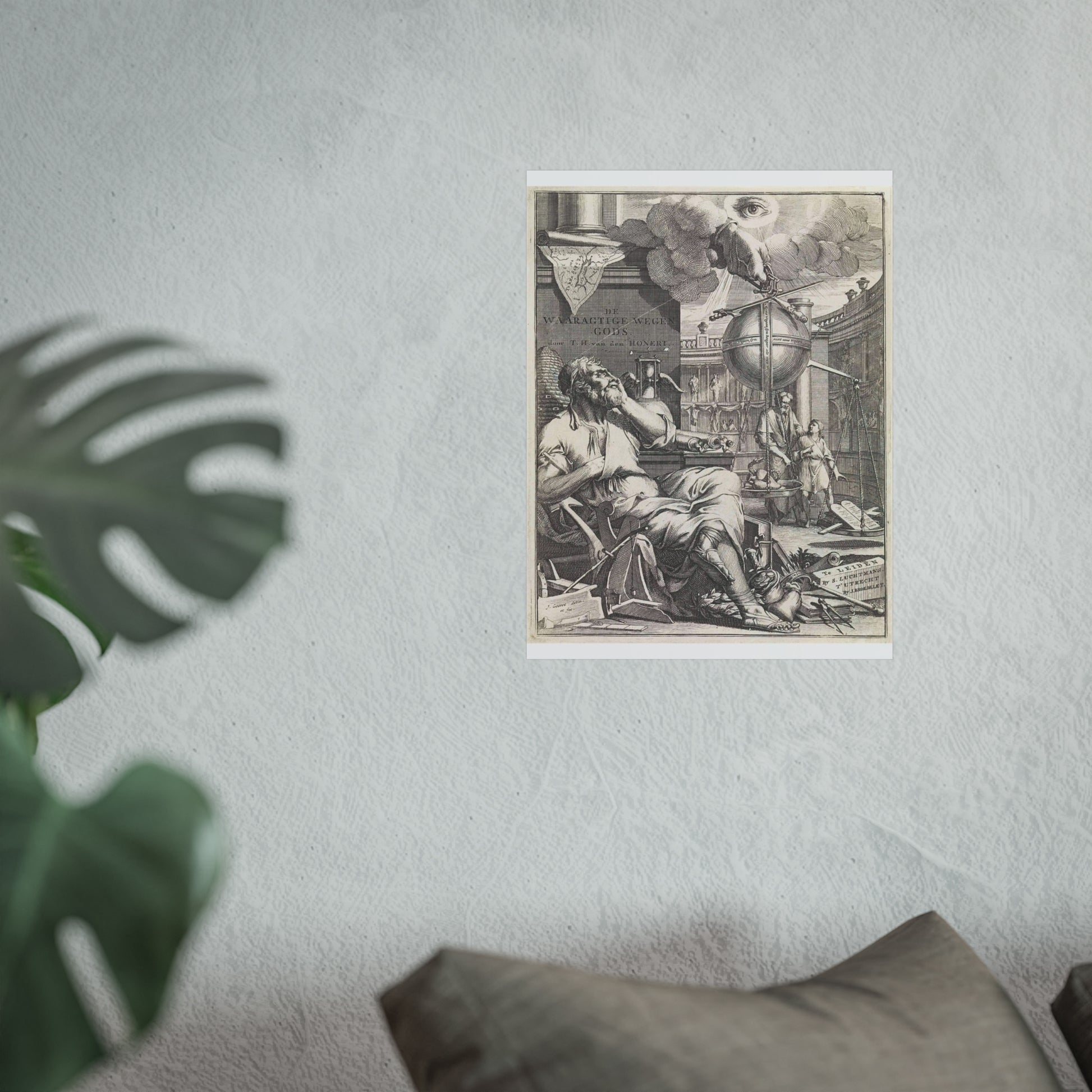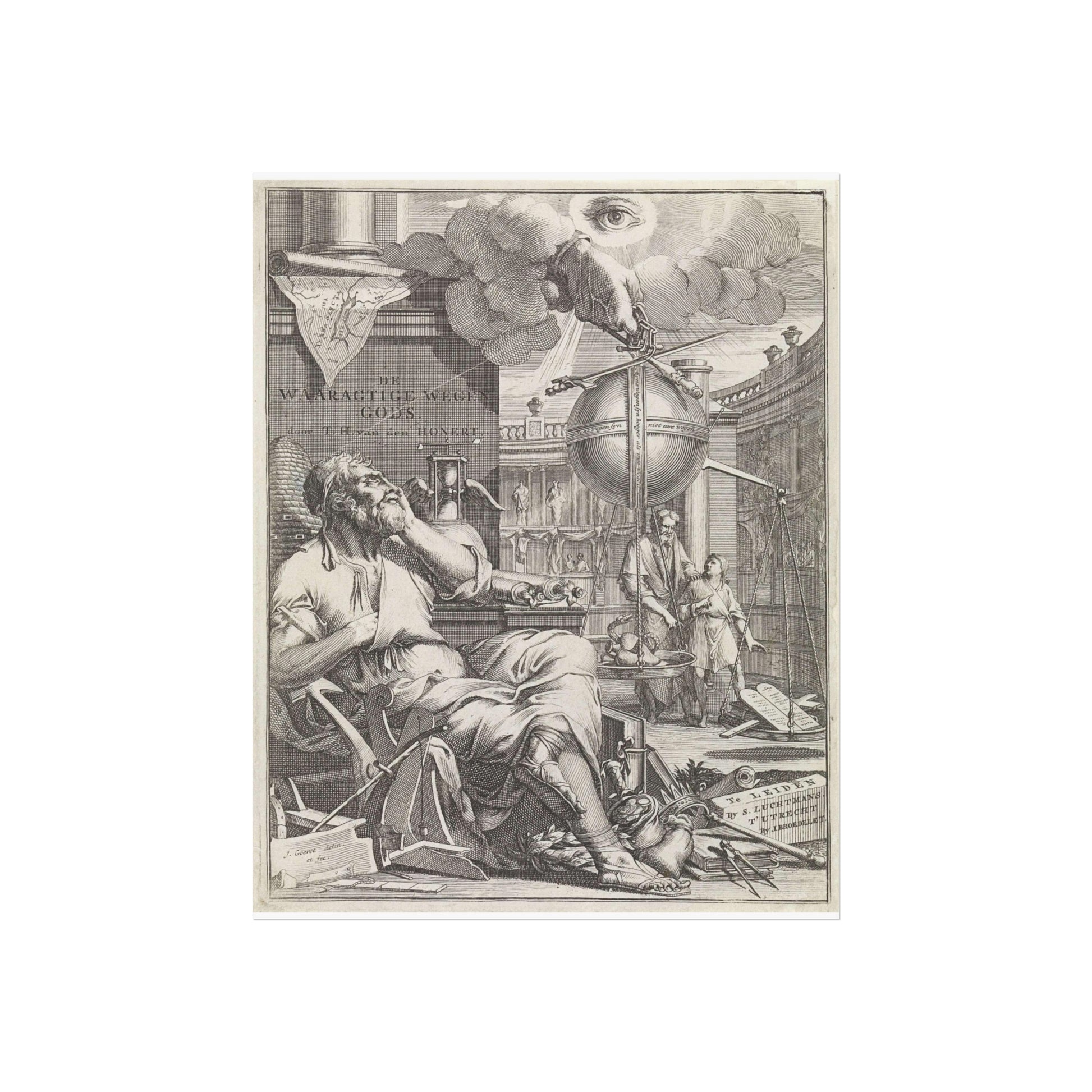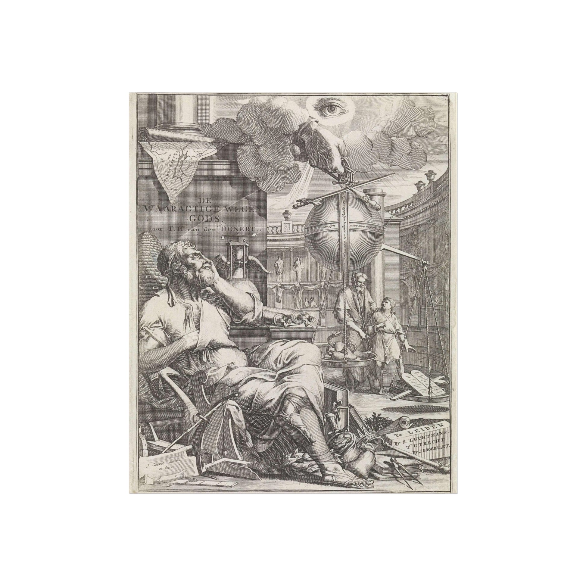 A man sits in a chair, deep in contemplation about the power of God. Encircling him are symbols representing both religious life, like an anchor and beehive, and worldly existence, such as a purse of money, crown, compass, and winged hourglass. Behind him, the title of the book is inscribed on a wall. Above him in the sky are the All-Seeing Eye of God and the Hand of God. The Hand holds a scale weighing Good and Evil. In the background, a teacher imparts knowledge to a youth.
