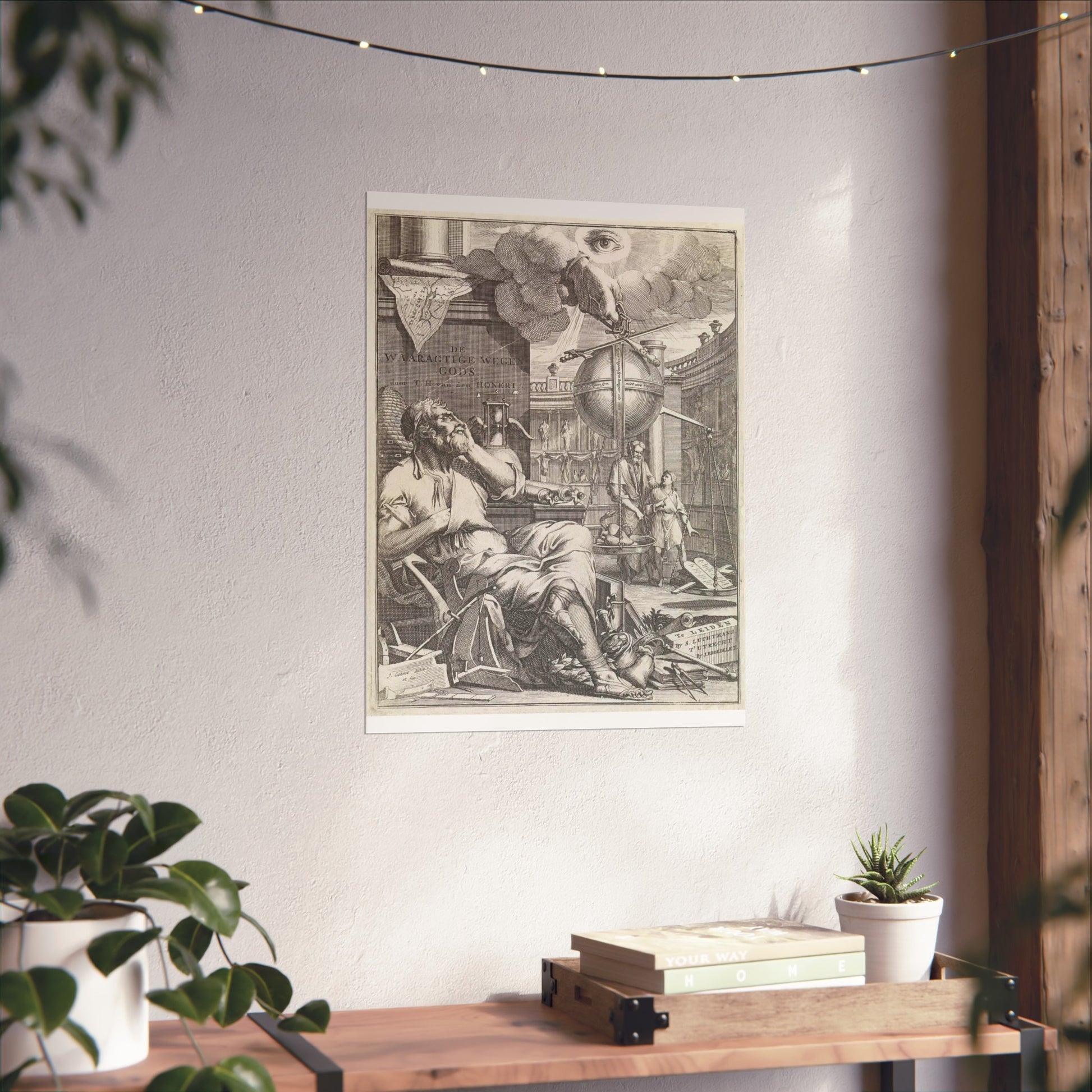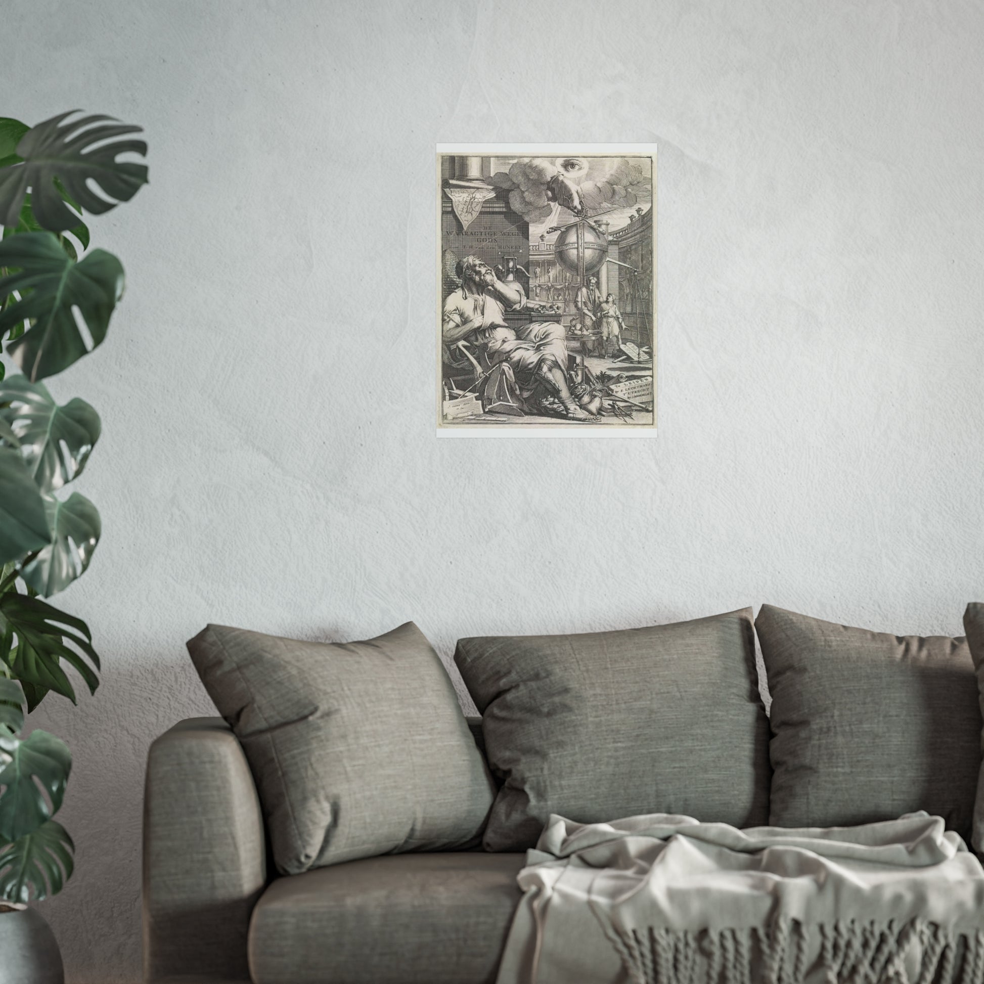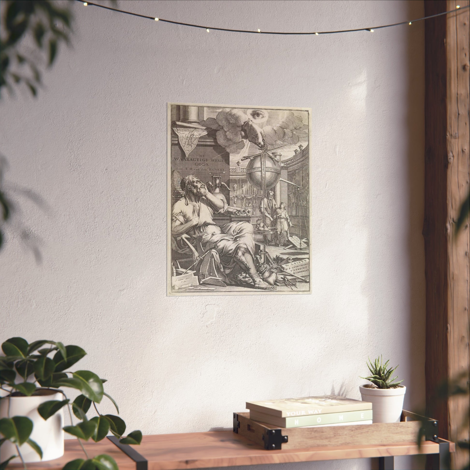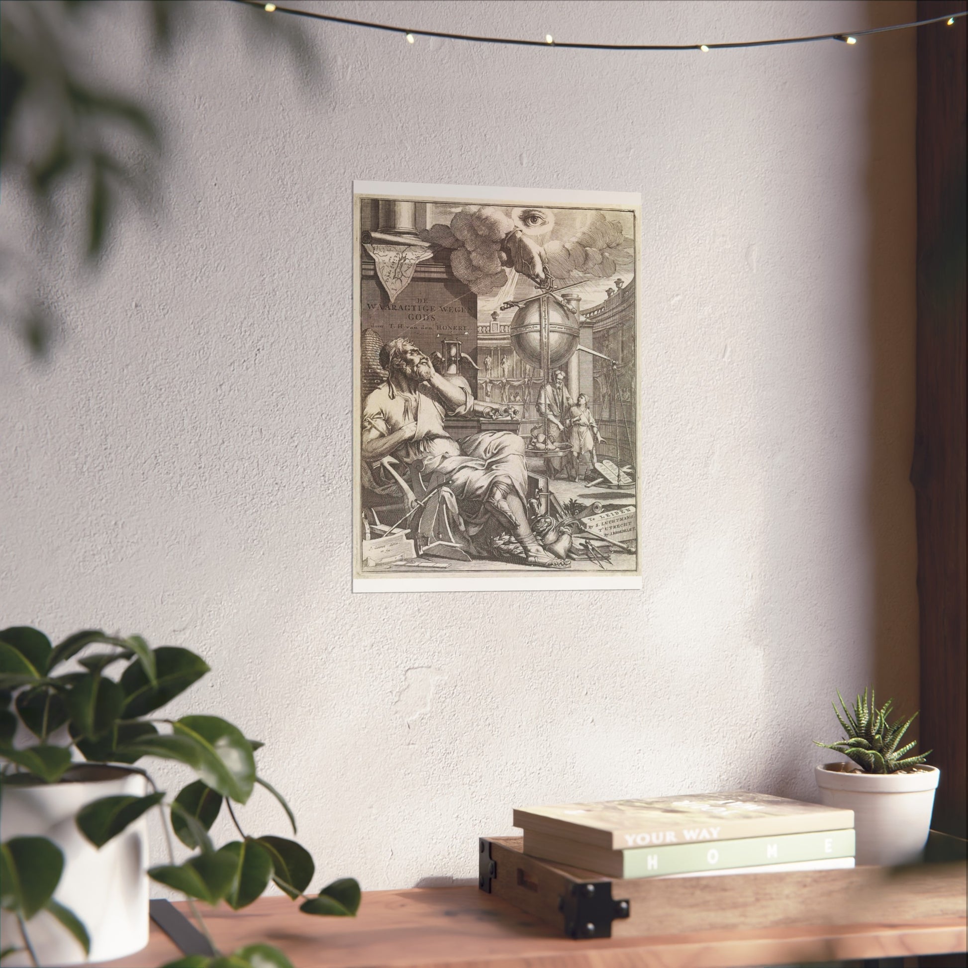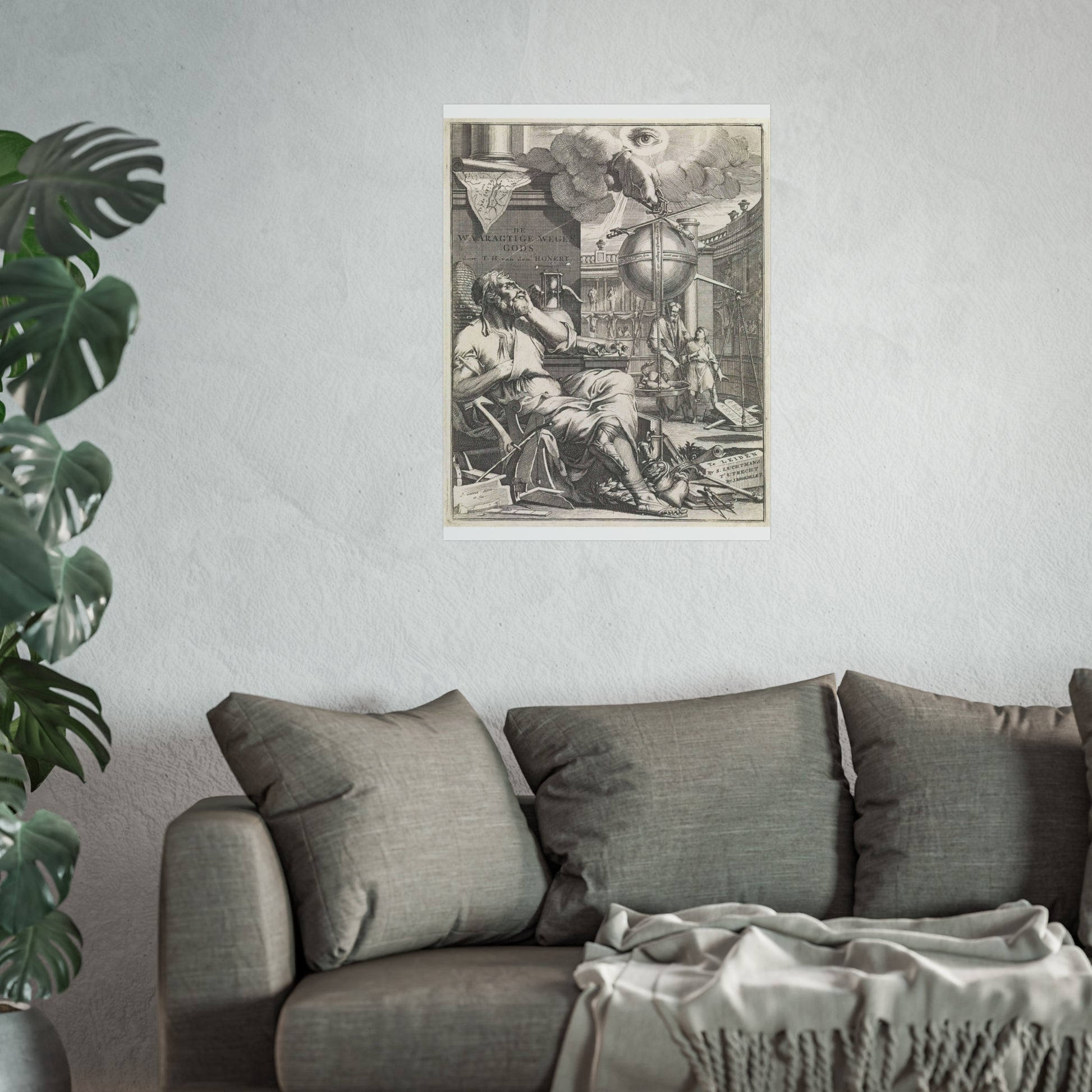 A man sits in a chair, deep in contemplation about the power of God. Encircling him are symbols representing both religious life, like an anchor and beehive, and worldly existence, such as a purse of money, crown, compass, and winged hourglass. Behind him, the title of the book is inscribed on a wall. Above him in the sky are the All-Seeing Eye of God and the Hand of God. The Hand holds a scale weighing Good and Evil. In the background, a teacher imparts knowledge to a youth.