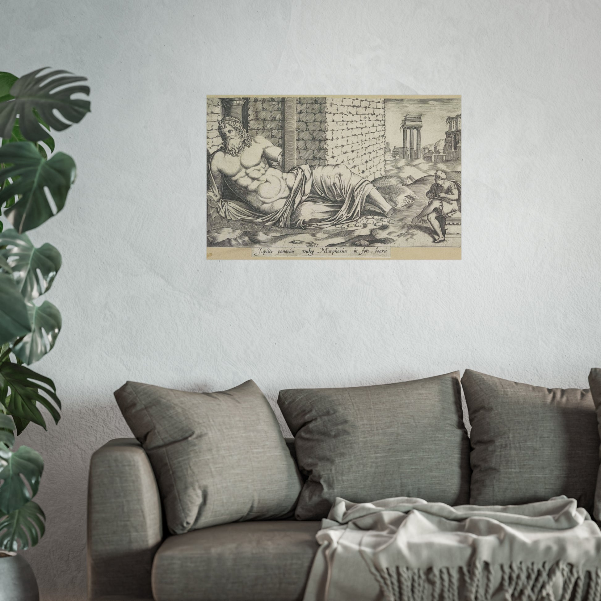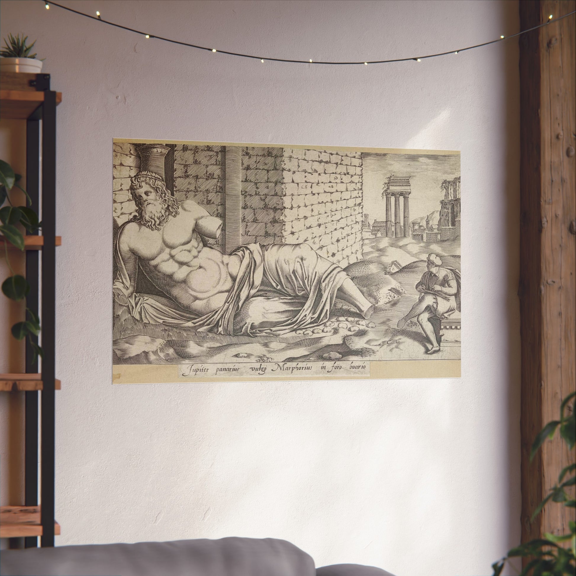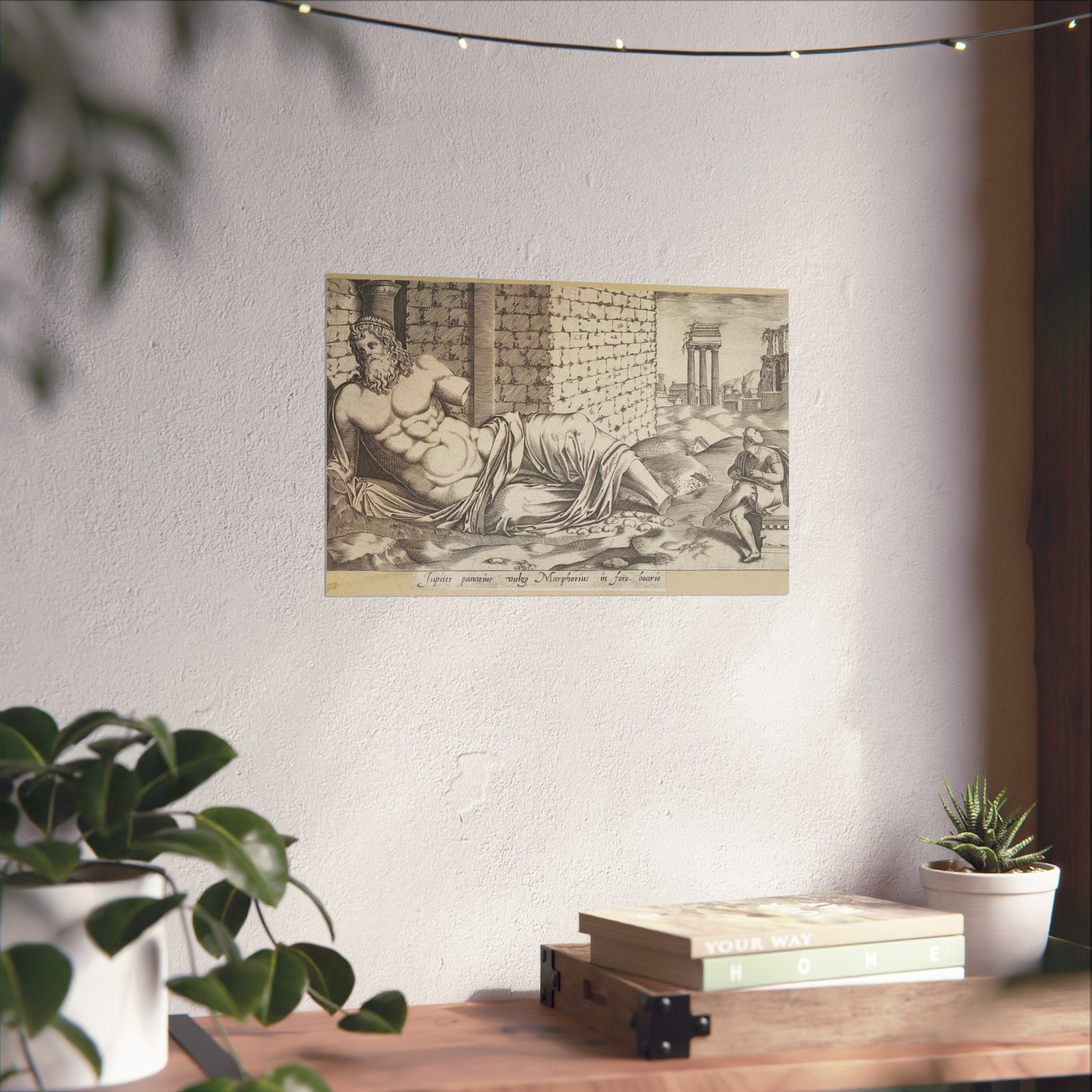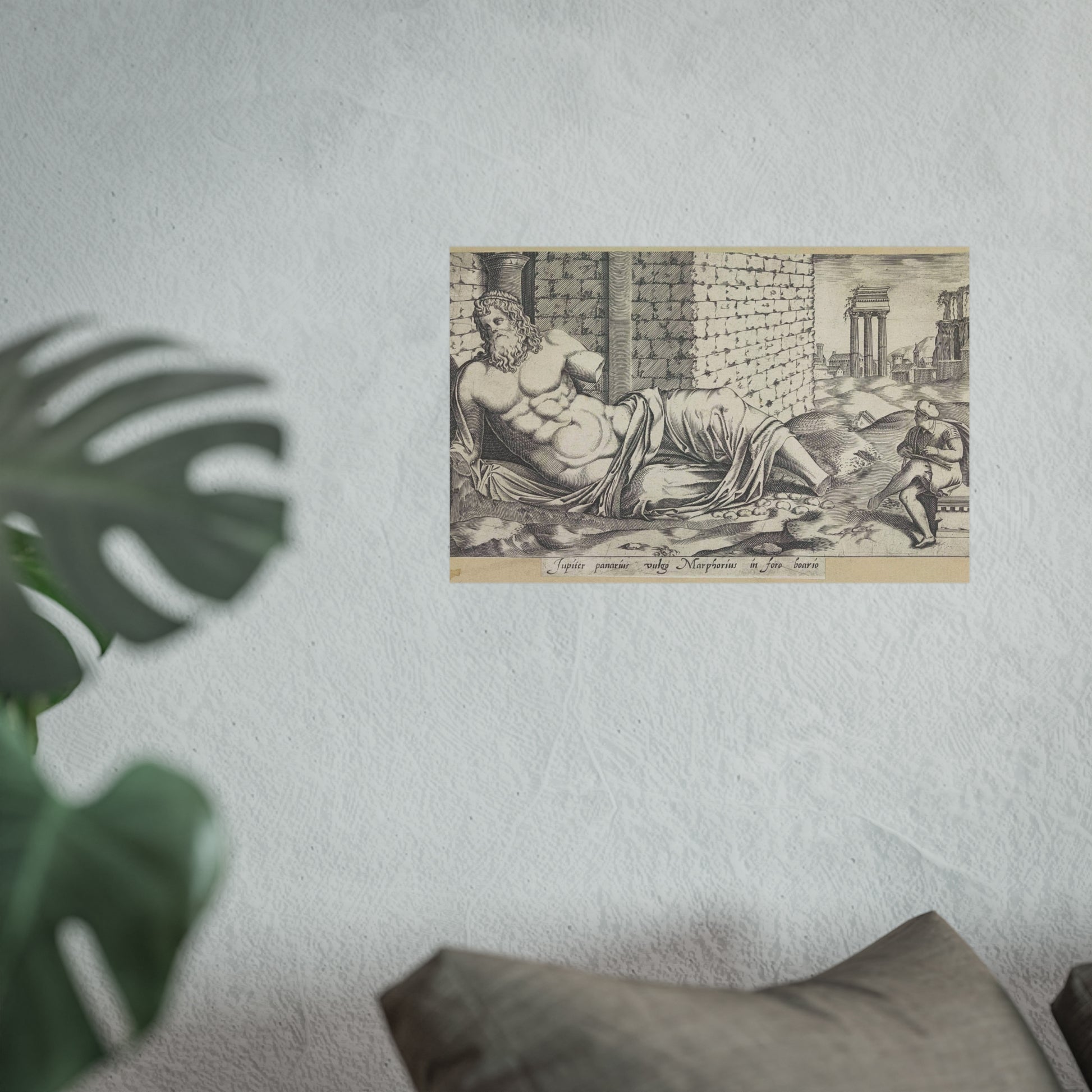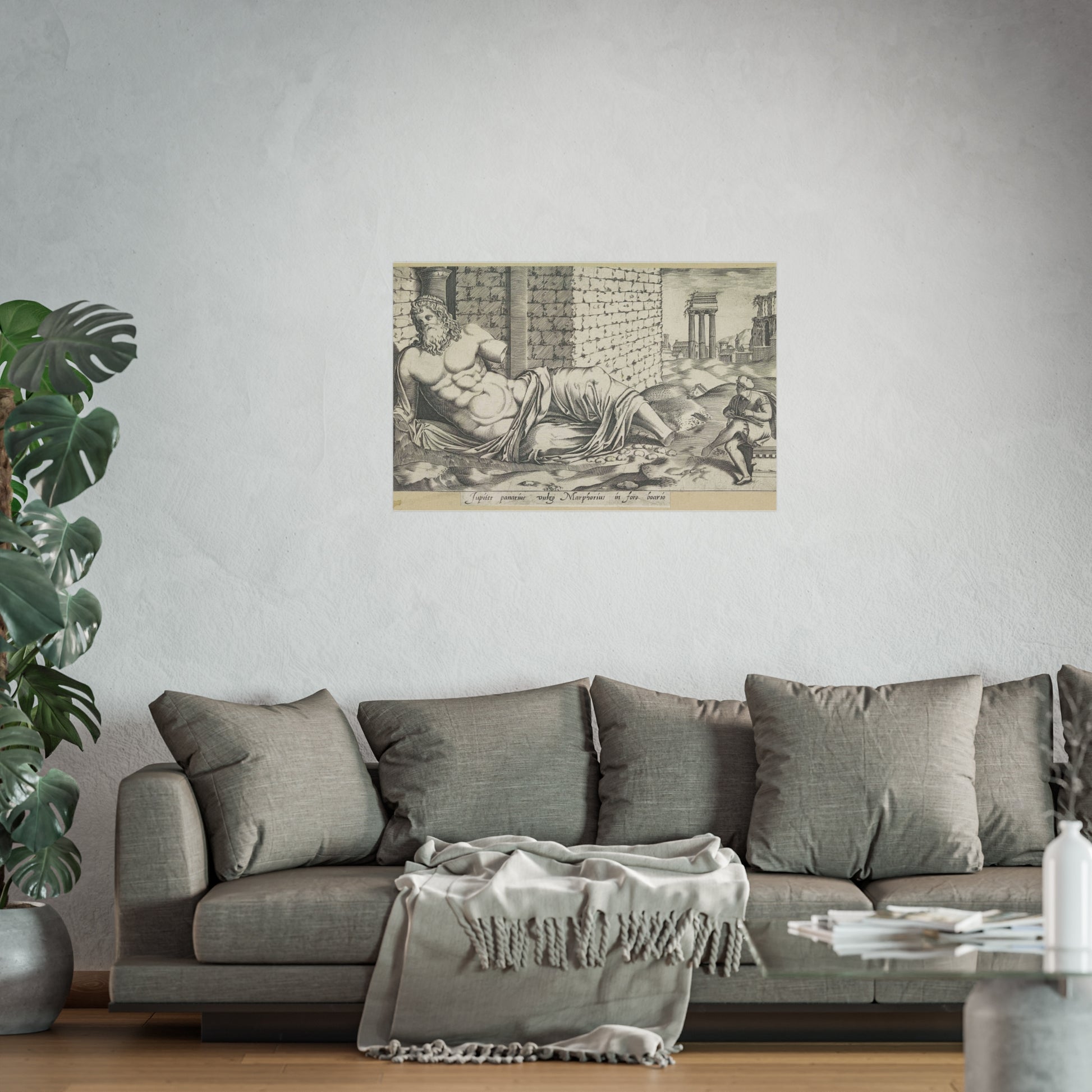 This captivating artwork captures the statue of the river god Tiber, also known as Marforio, one of Rome's talking statues located at the Roman Forum. To the right, an artist is depicted sitting on a marble block, deeply engrossed in his sketching. The piece is further embellished with text in the lower margin.