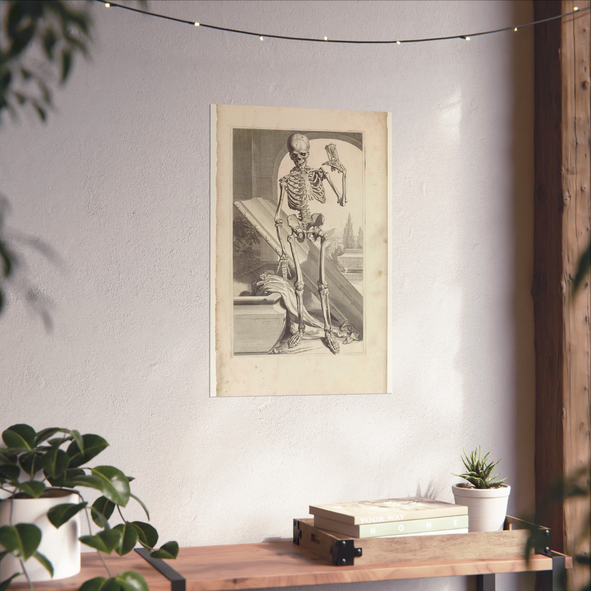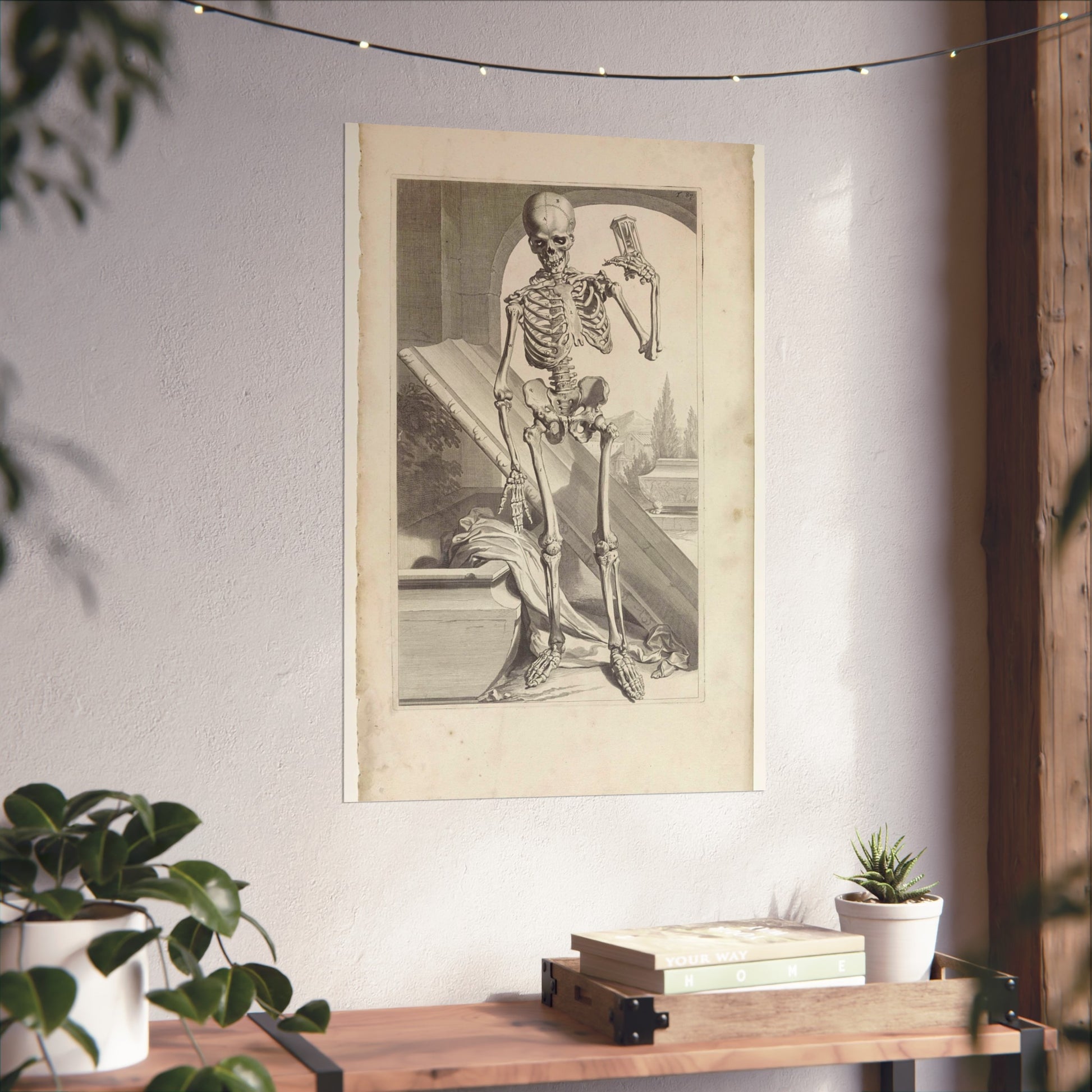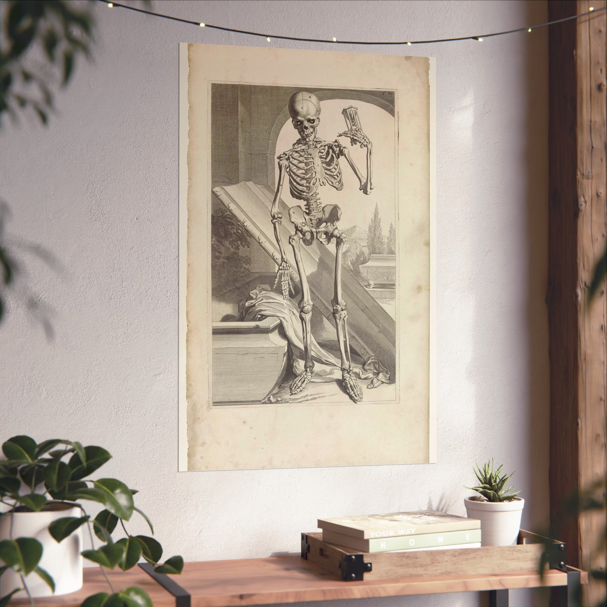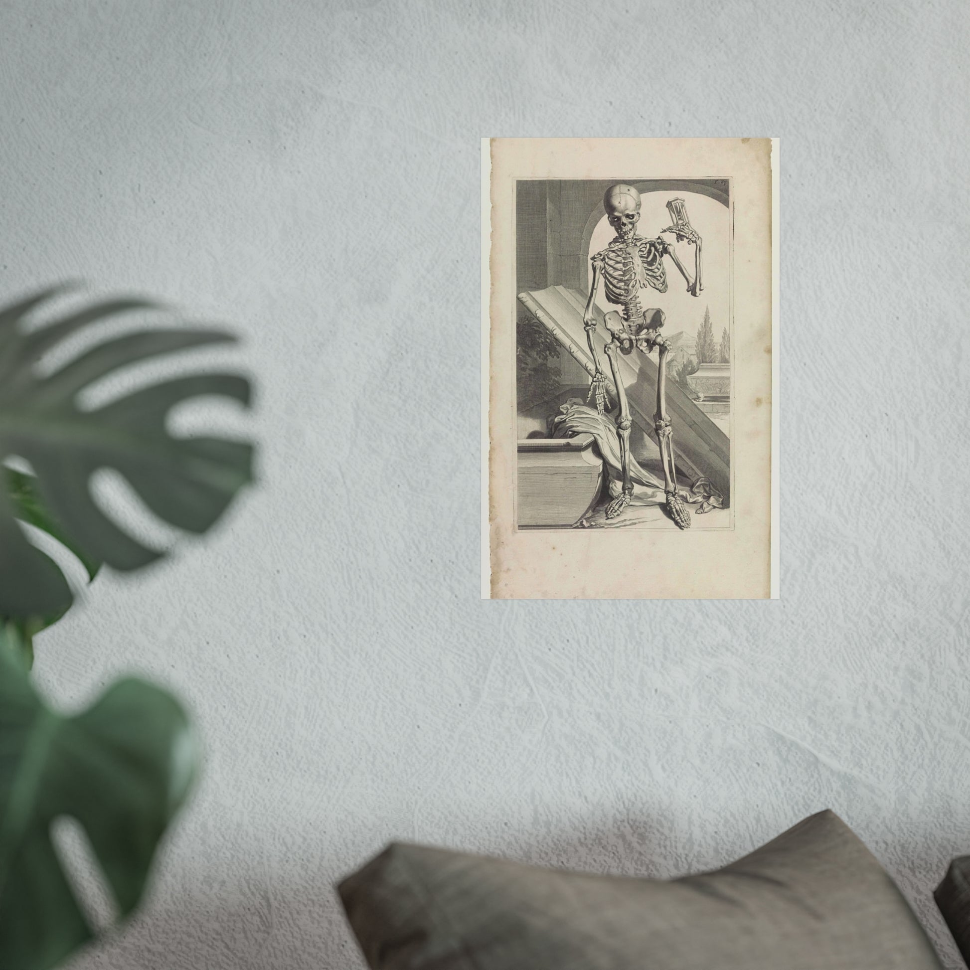 Behold an intriguing representation of an anatomical model of a human skeleton. The skeleton grips a time-telling hourglass in its left hand, symbolizing the inevitable passage of time. Adjacent to it, a grave is depicted, further emphasizing the theme of mortality. This stunning piece is marked with the number T. 87 at the top right corner.