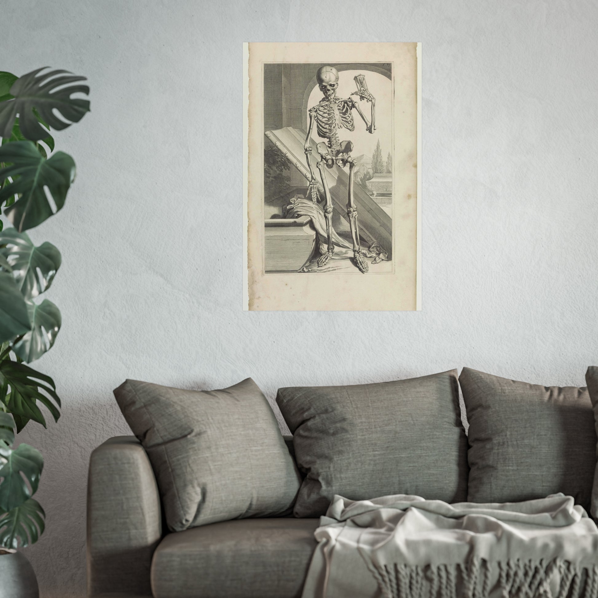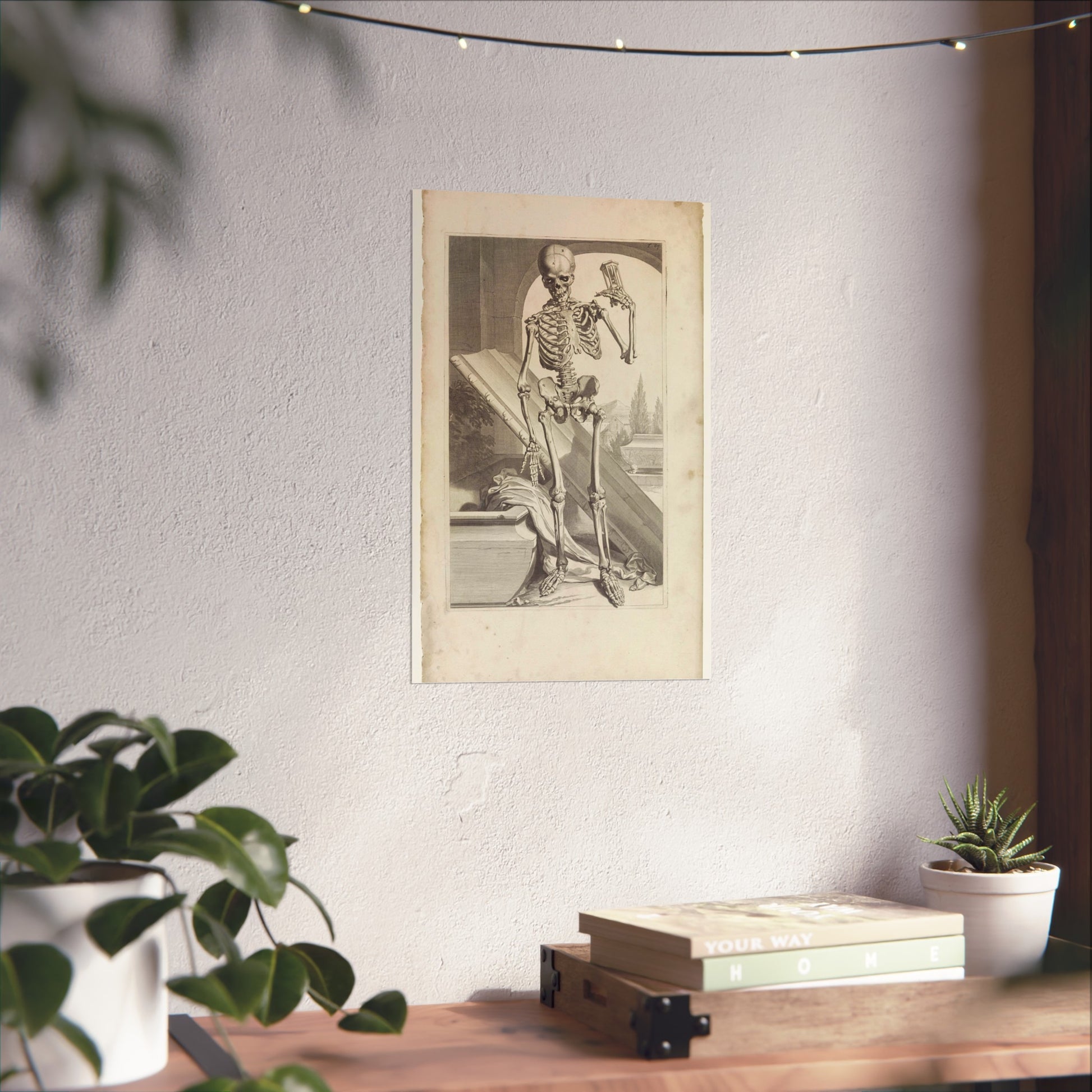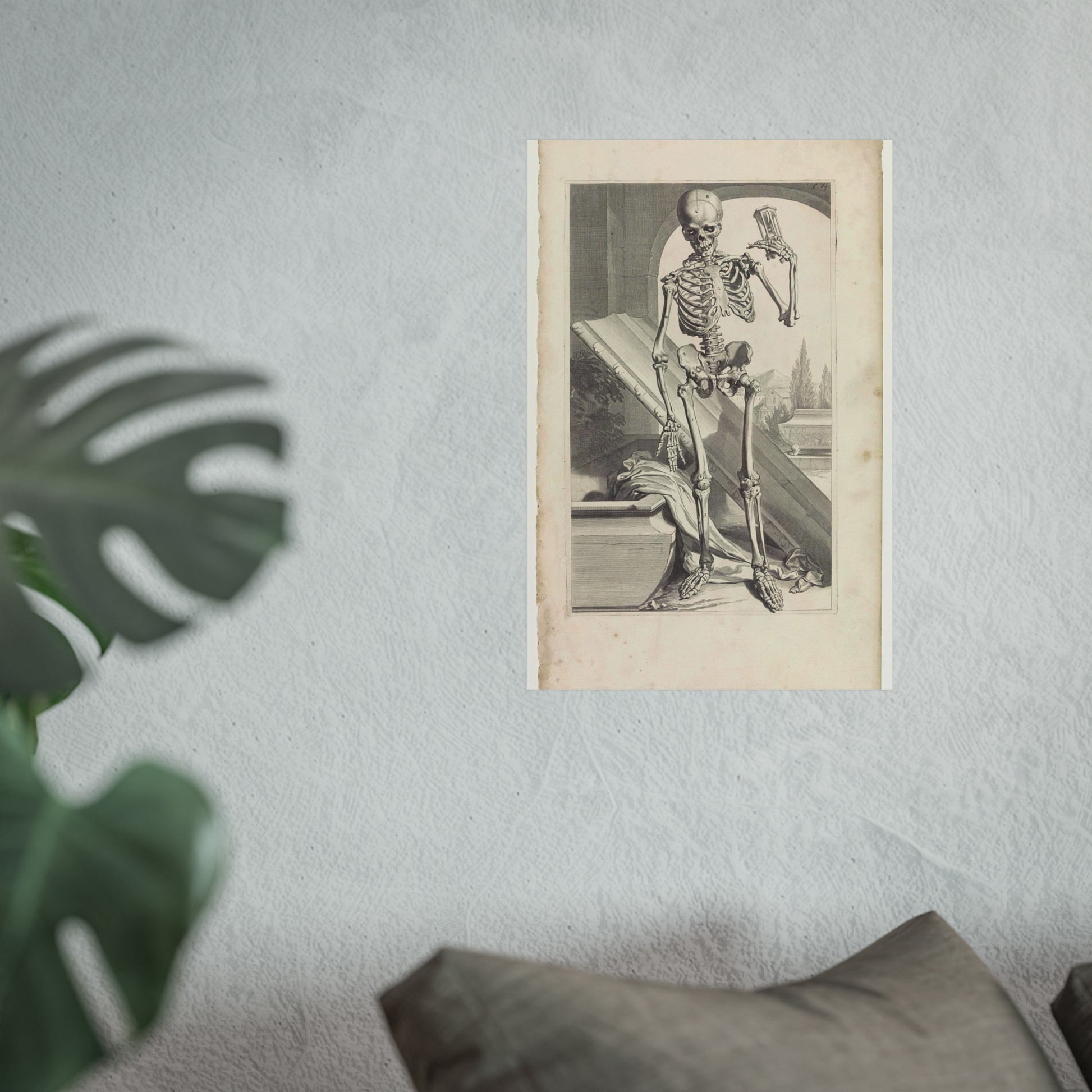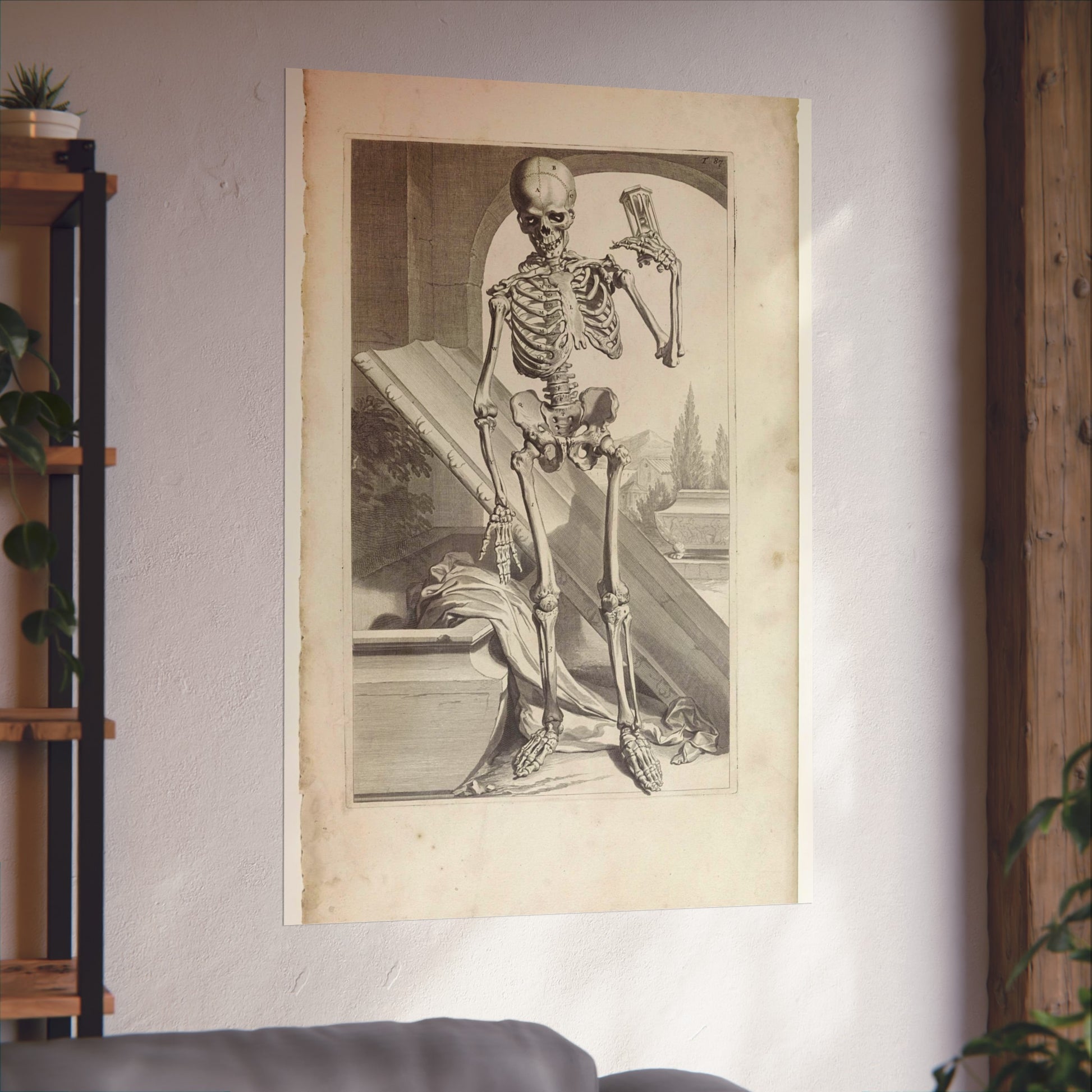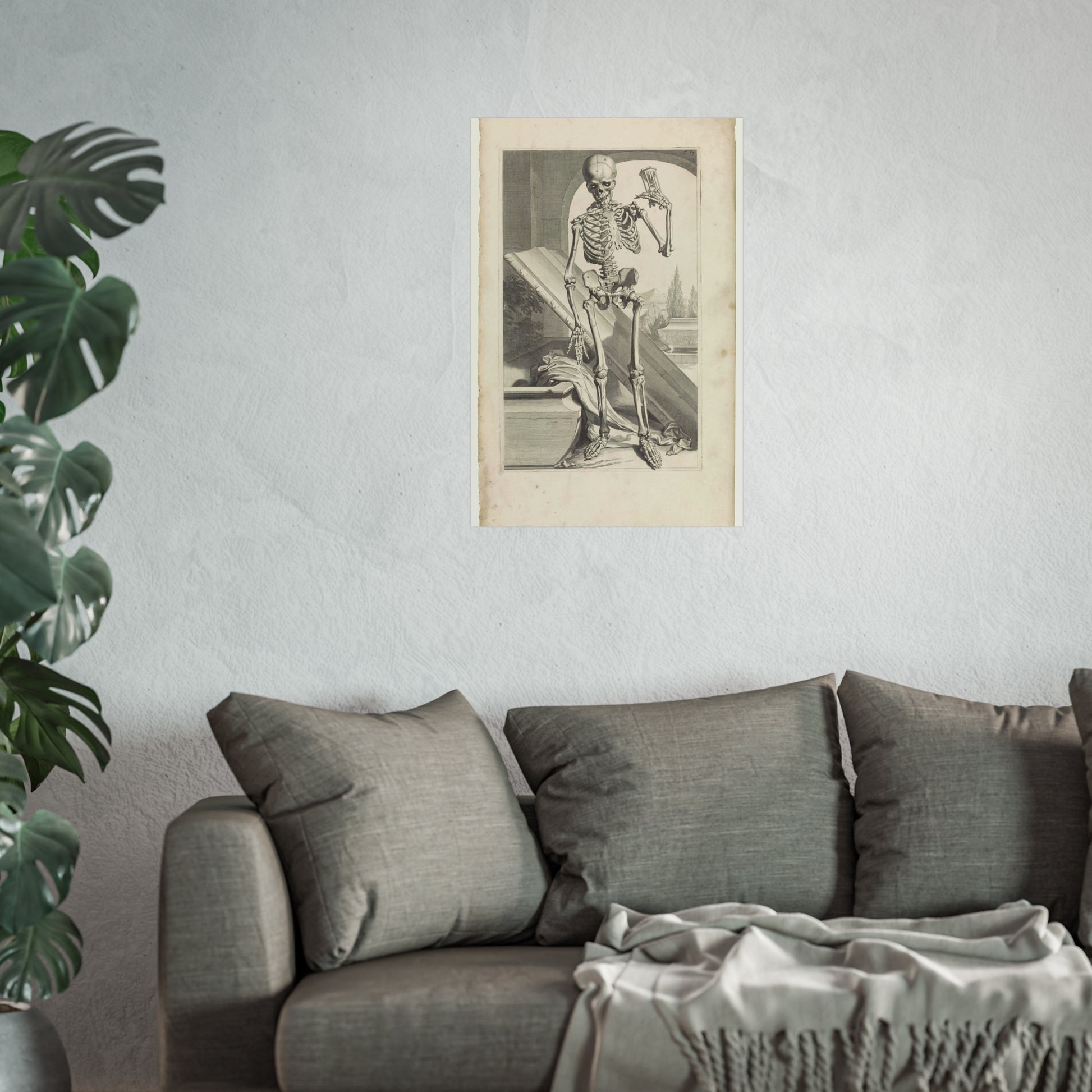 Behold an intriguing representation of an anatomical model of a human skeleton. The skeleton grips a time-telling hourglass in its left hand, symbolizing the inevitable passage of time. Adjacent to it, a grave is depicted, further emphasizing the theme of mortality. This stunning piece is marked with the number T. 87 at the top right corner.