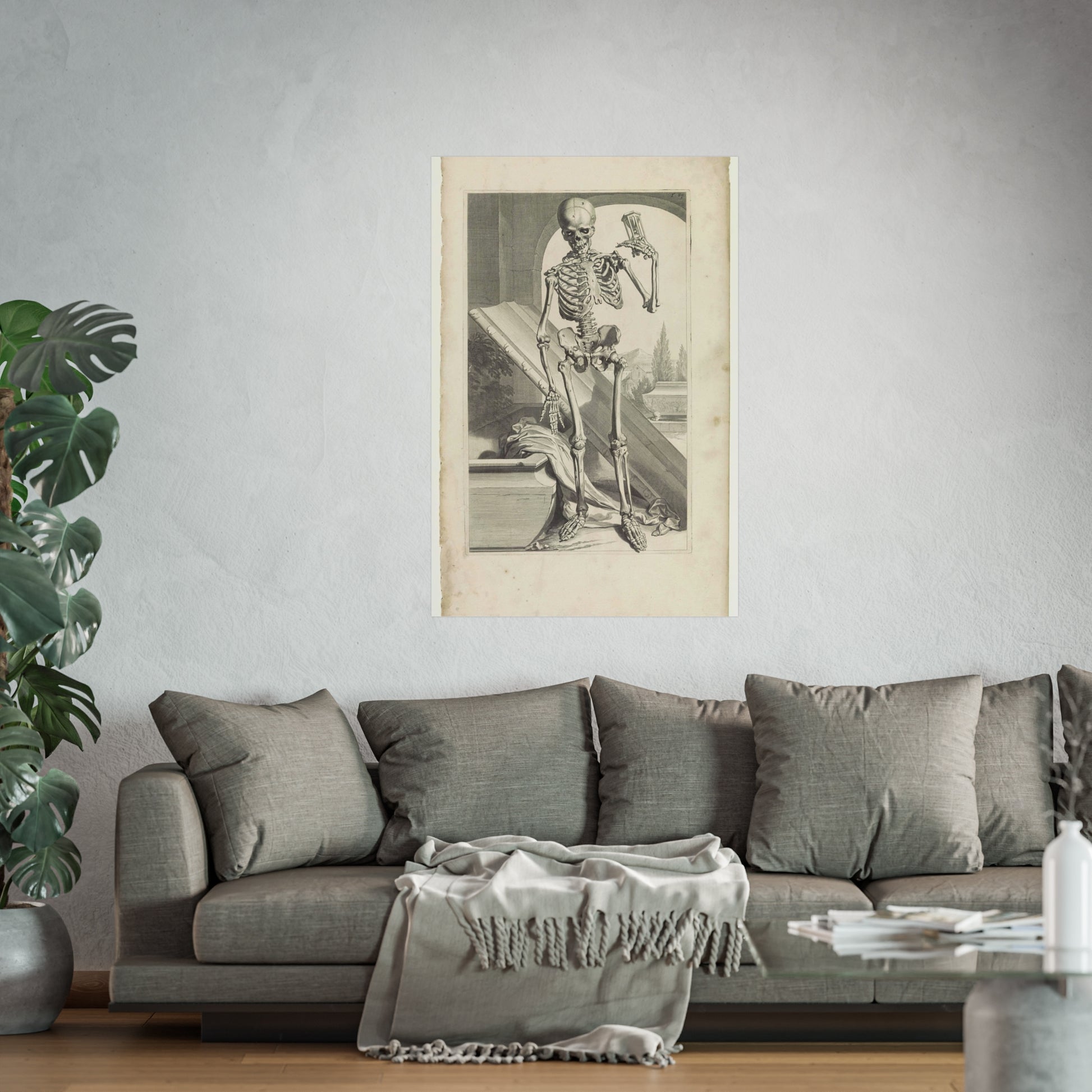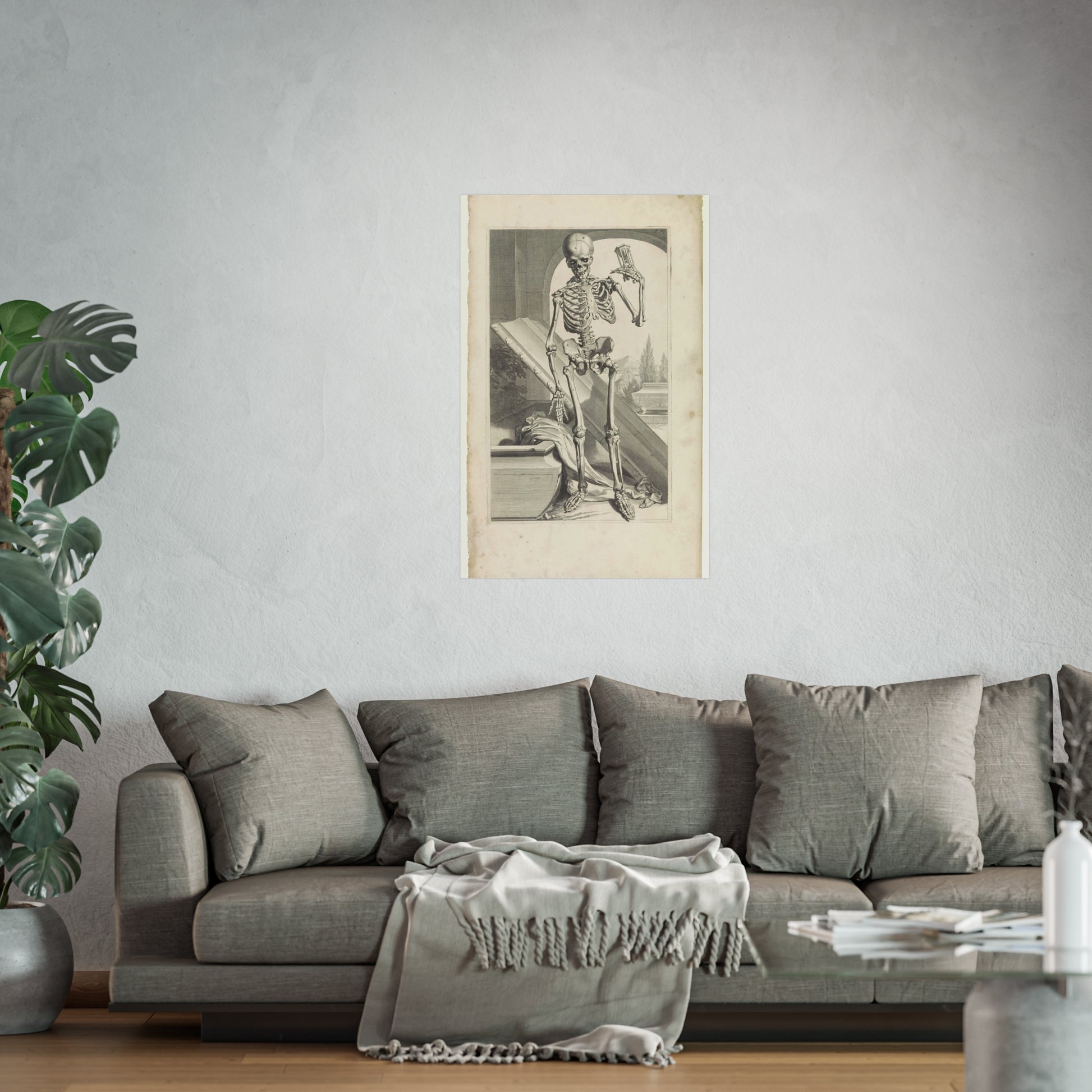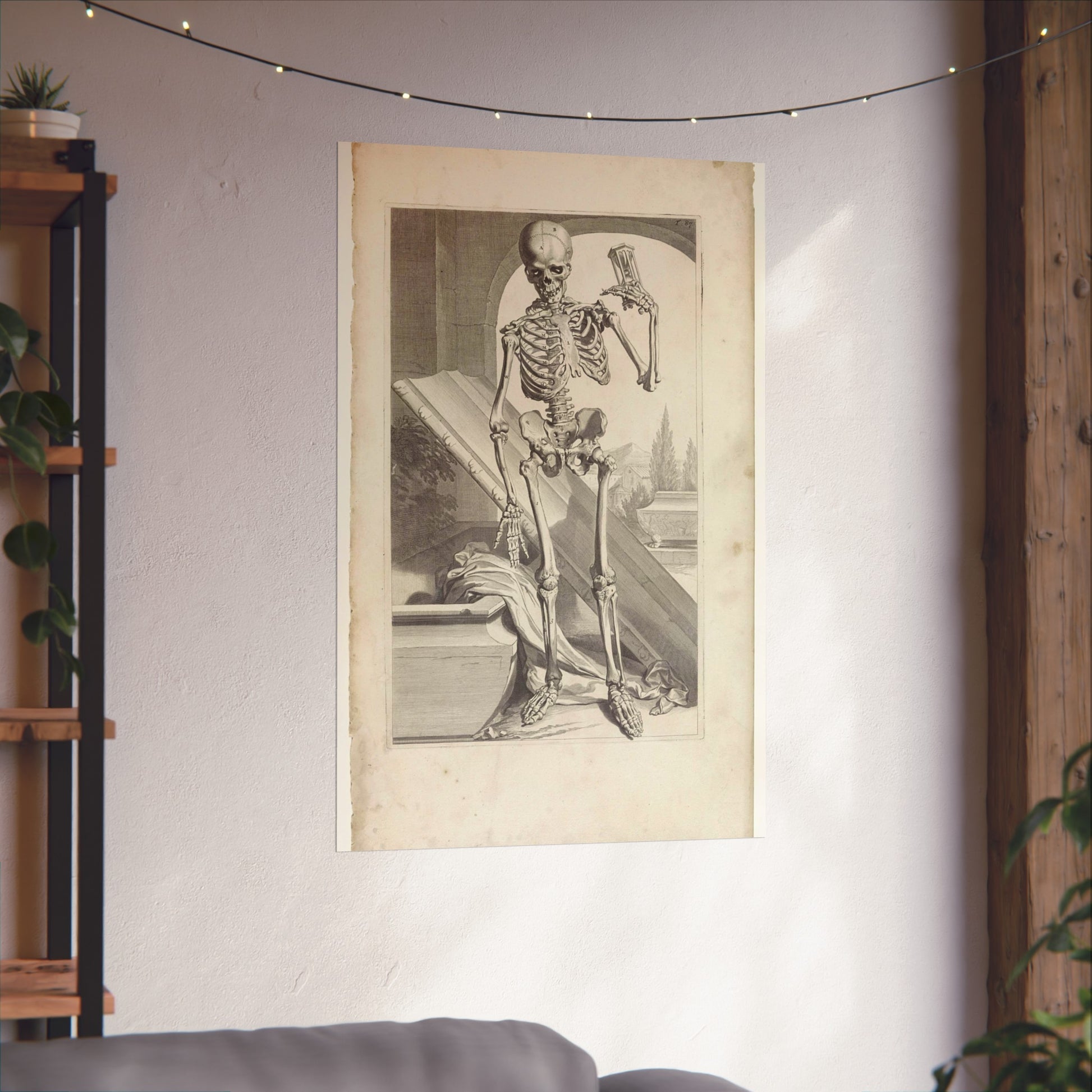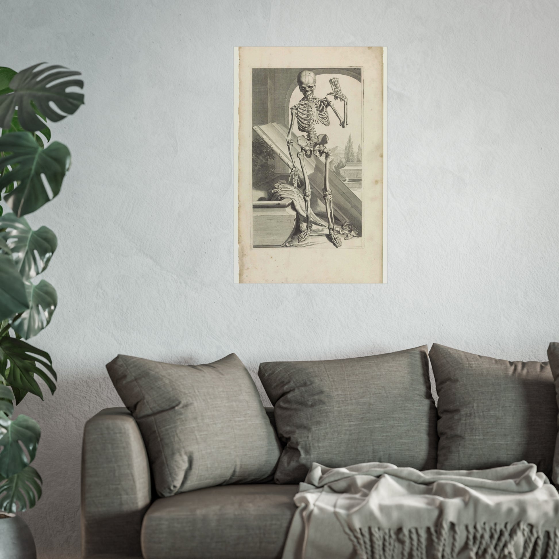 Behold an intriguing representation of an anatomical model of a human skeleton. The skeleton grips a time-telling hourglass in its left hand, symbolizing the inevitable passage of time. Adjacent to it, a grave is depicted, further emphasizing the theme of mortality. This stunning piece is marked with the number T. 87 at the top right corner.