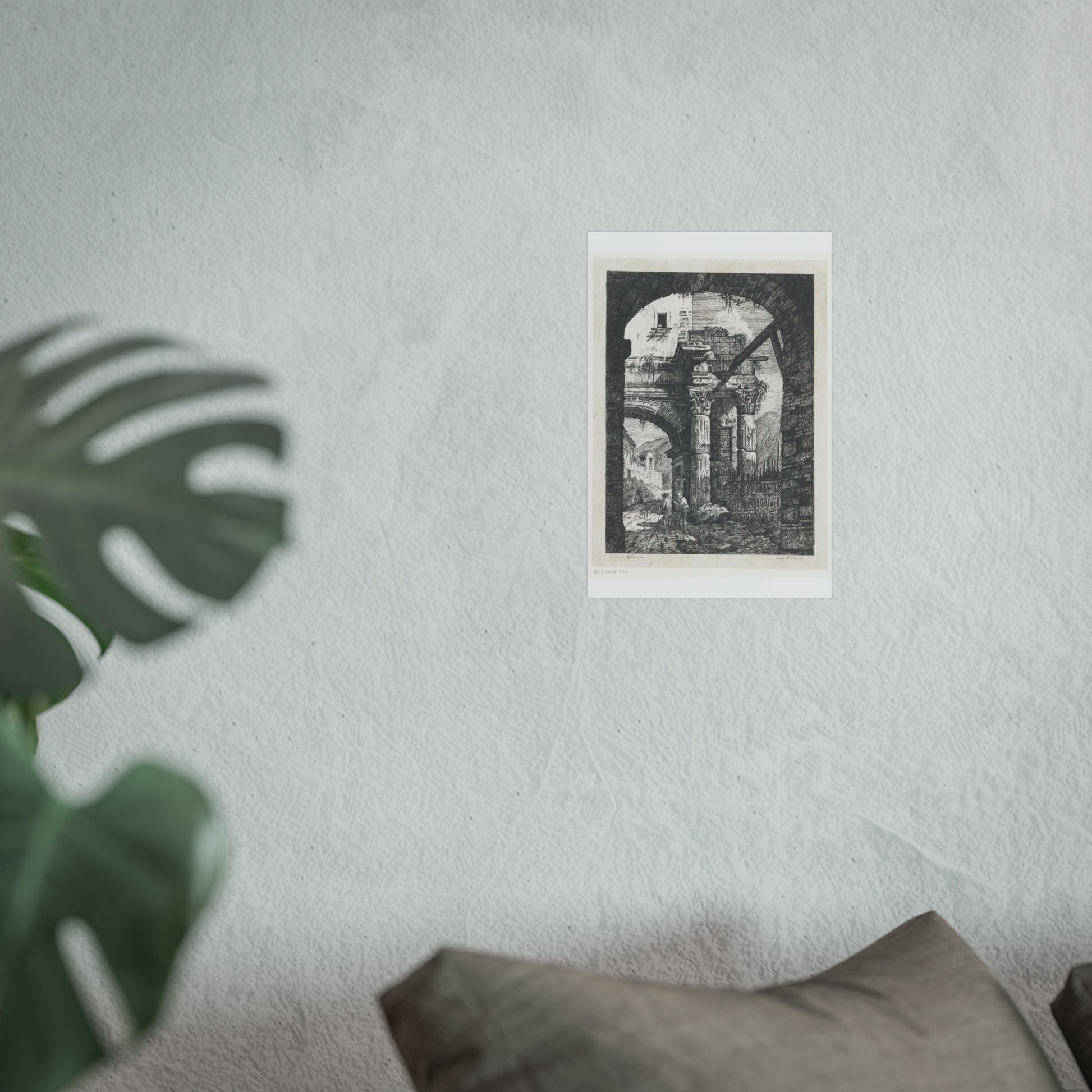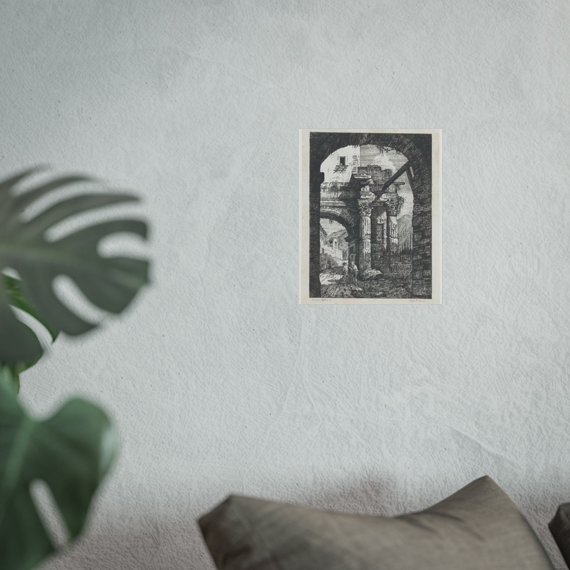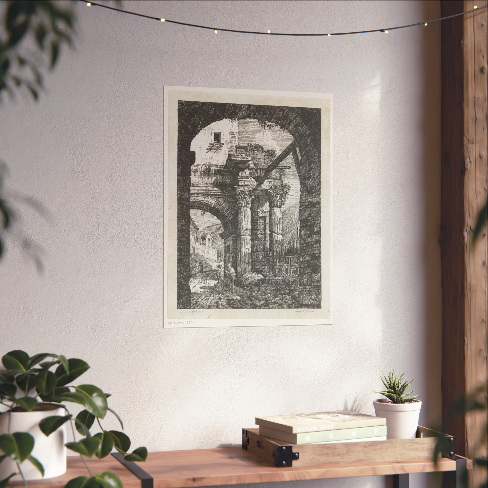 Witness the captivating image of an ancient ruin featuring Corinthian columns. A path meandering beneath the majestic gate hosts two wanderers accompanied by their loyal dogs. The backdrop showcases a rugged mountainous landscape, adding to the scene's depth and allure. Framing this captivating vista is another gate in the foreground, adding a unique layer to the composition.