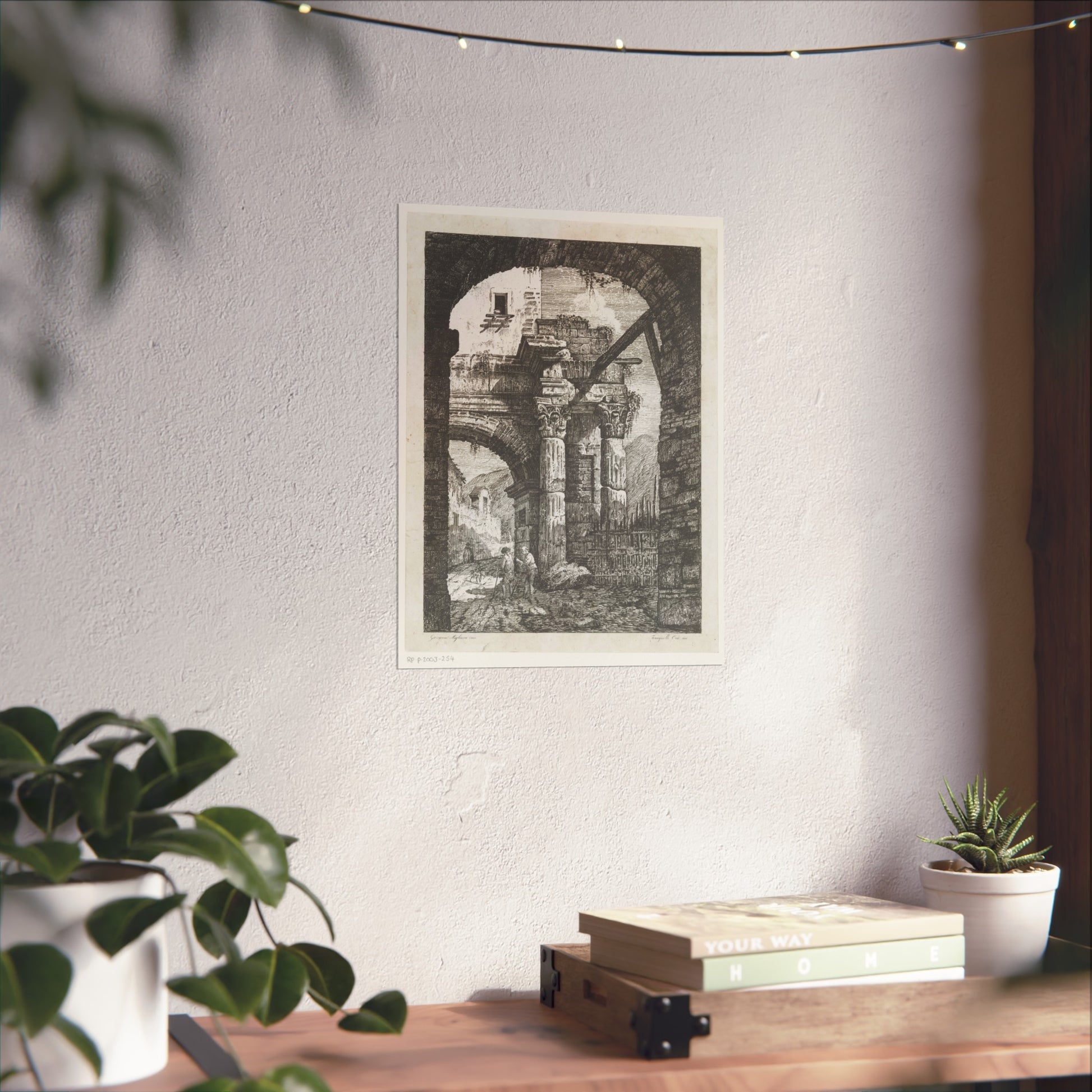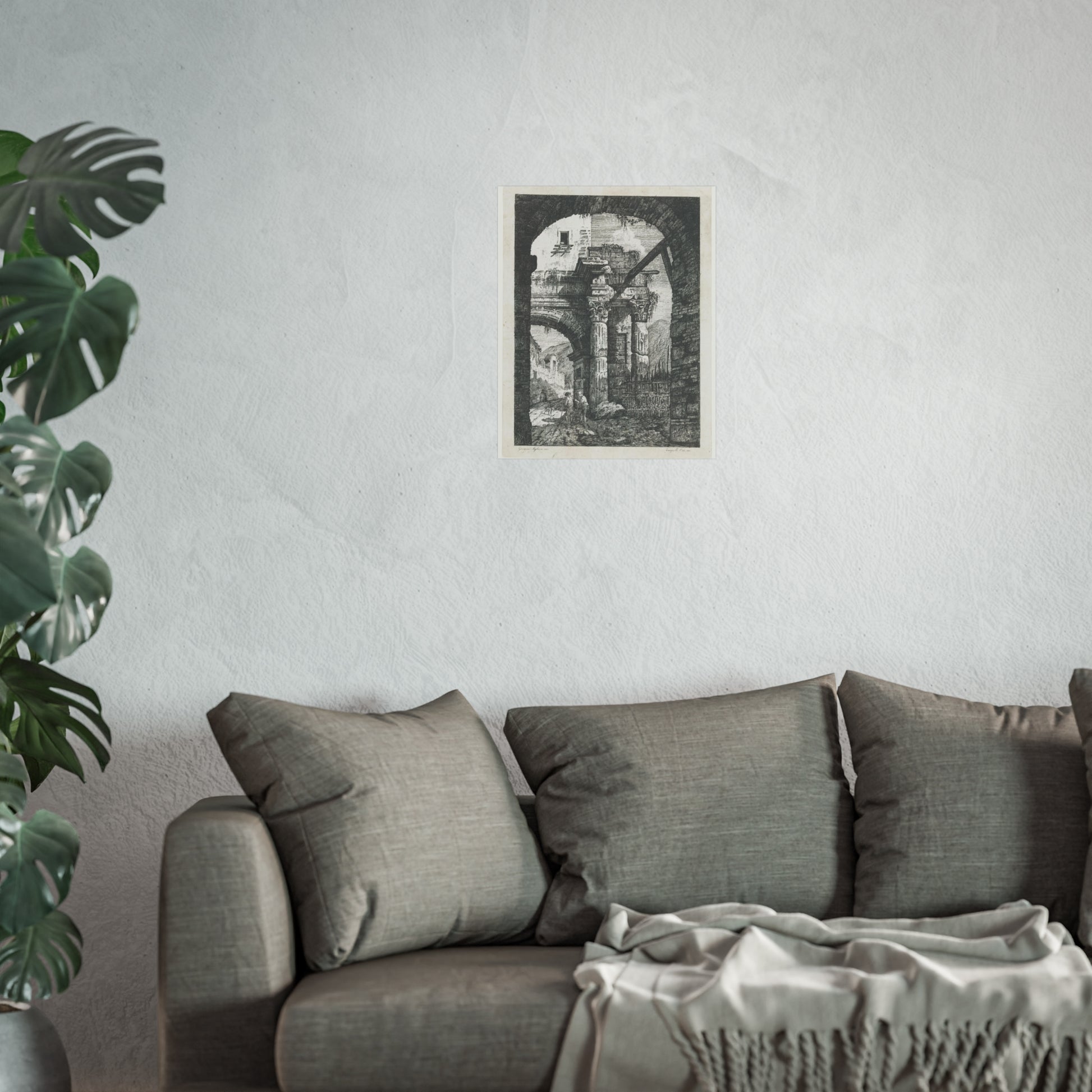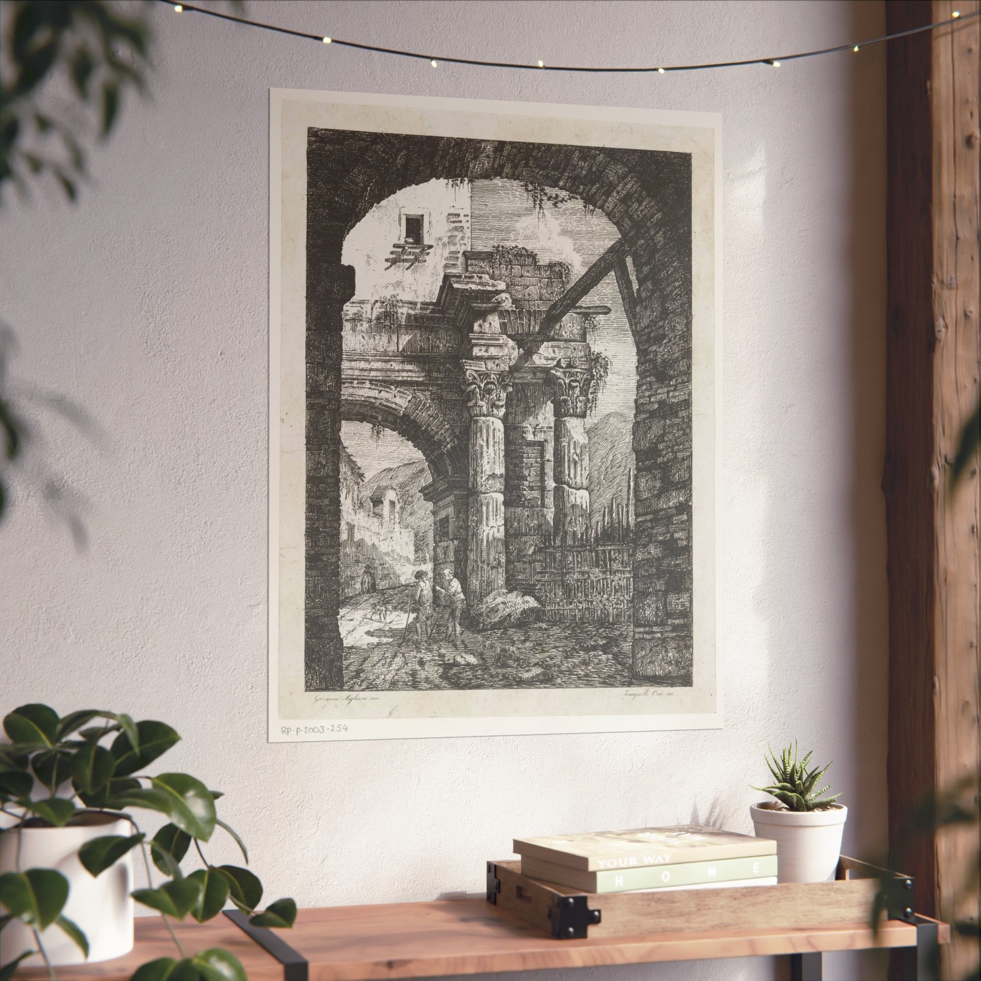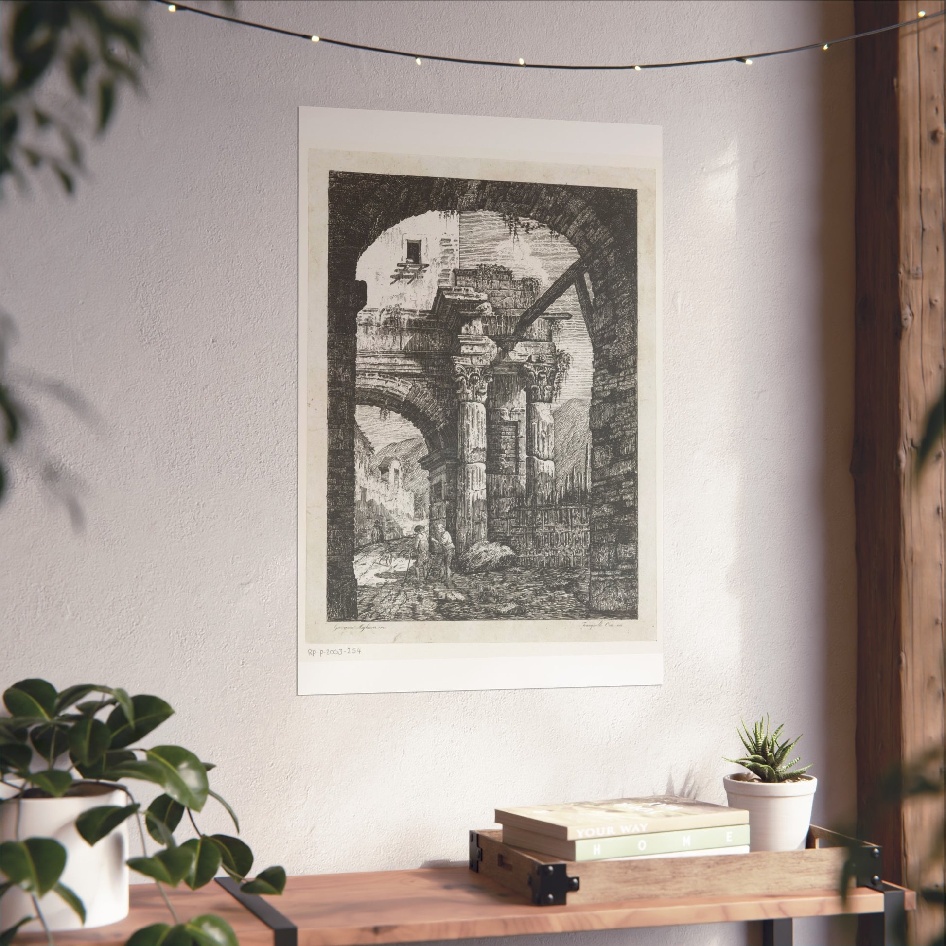 Witness the captivating image of an ancient ruin featuring Corinthian columns. A path meandering beneath the majestic gate hosts two wanderers accompanied by their loyal dogs. The backdrop showcases a rugged mountainous landscape, adding to the scene's depth and allure. Framing this captivating vista is another gate in the foreground, adding a unique layer to the composition.