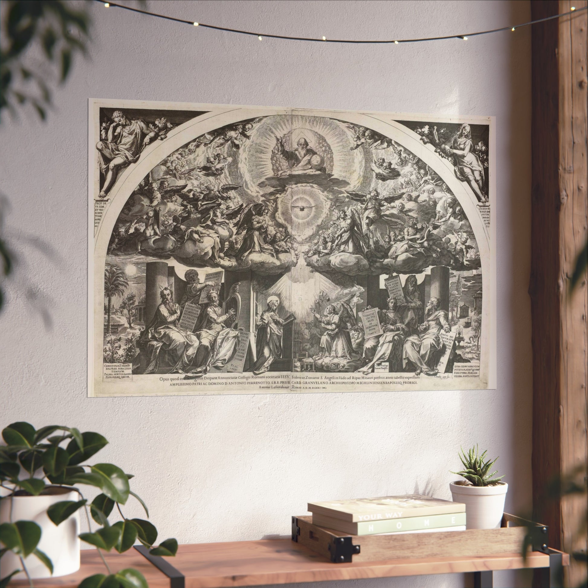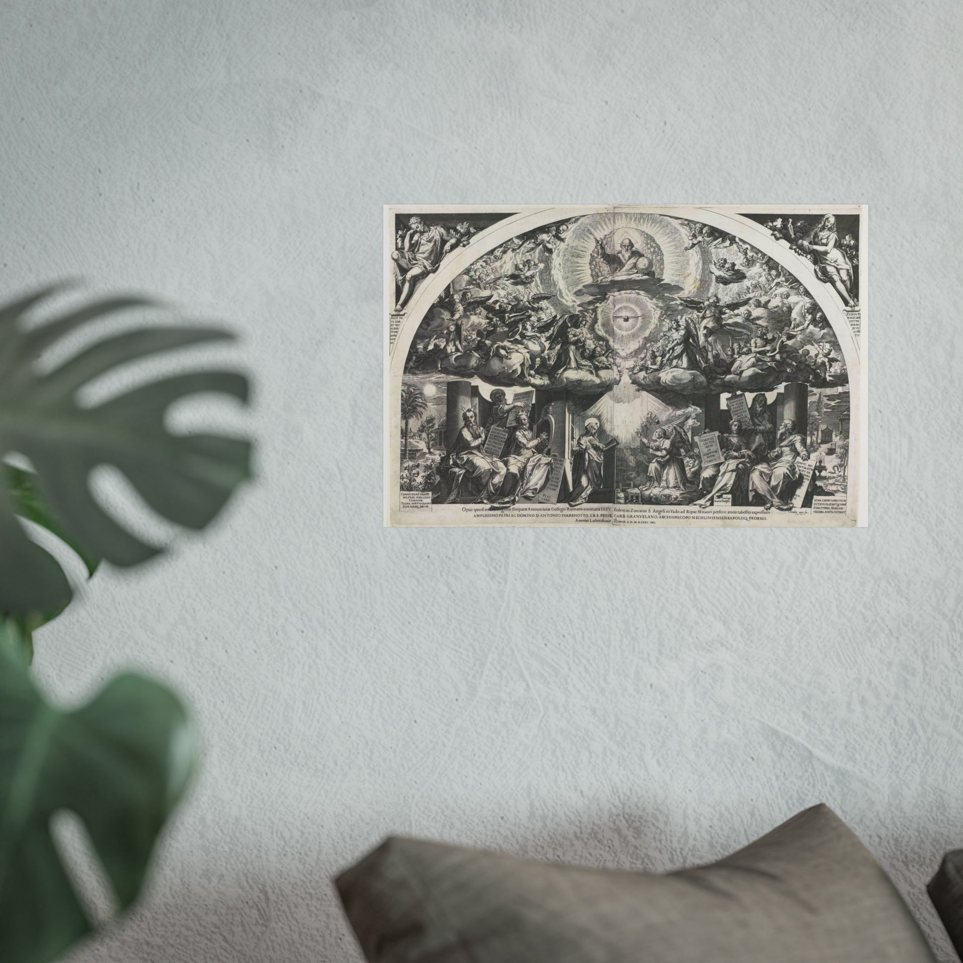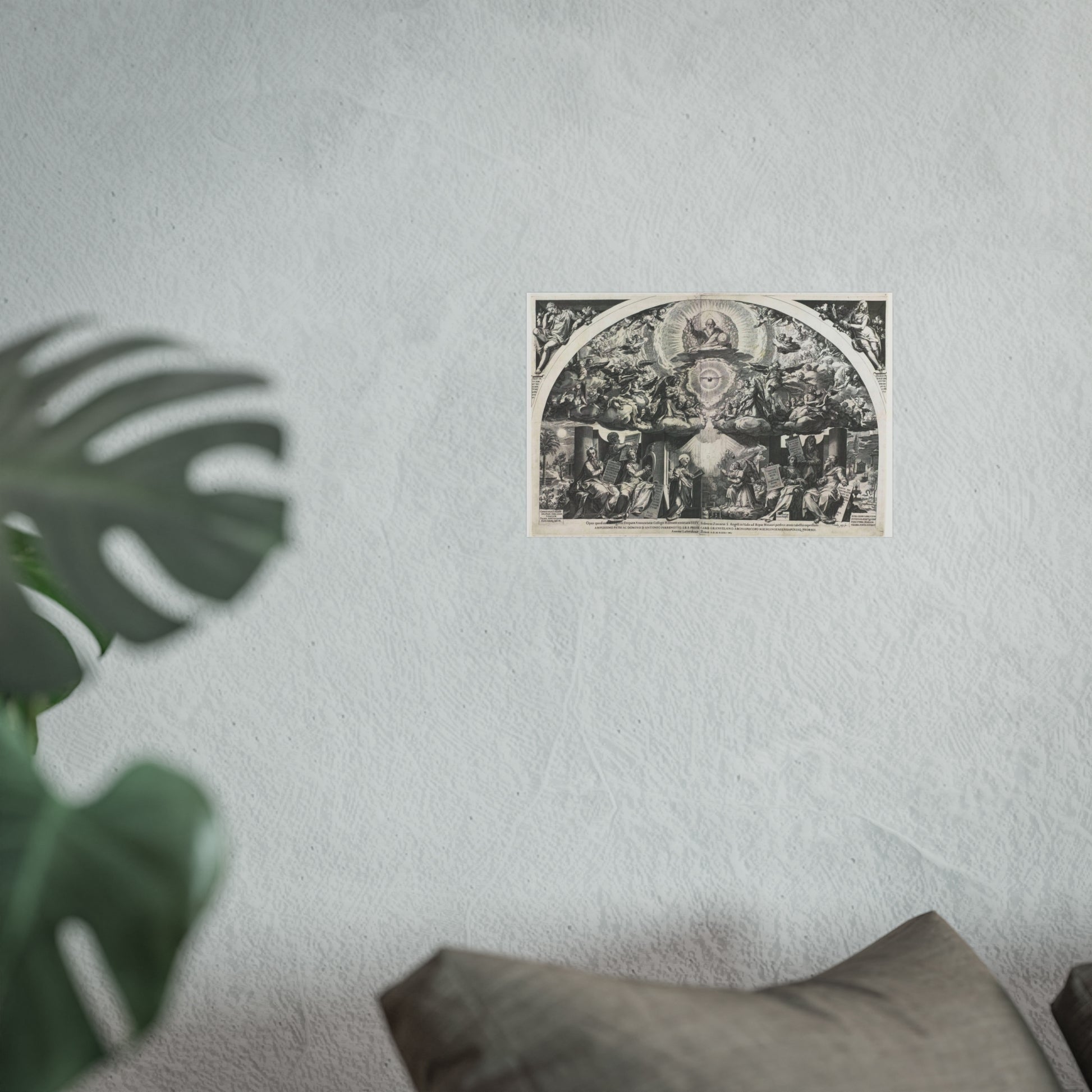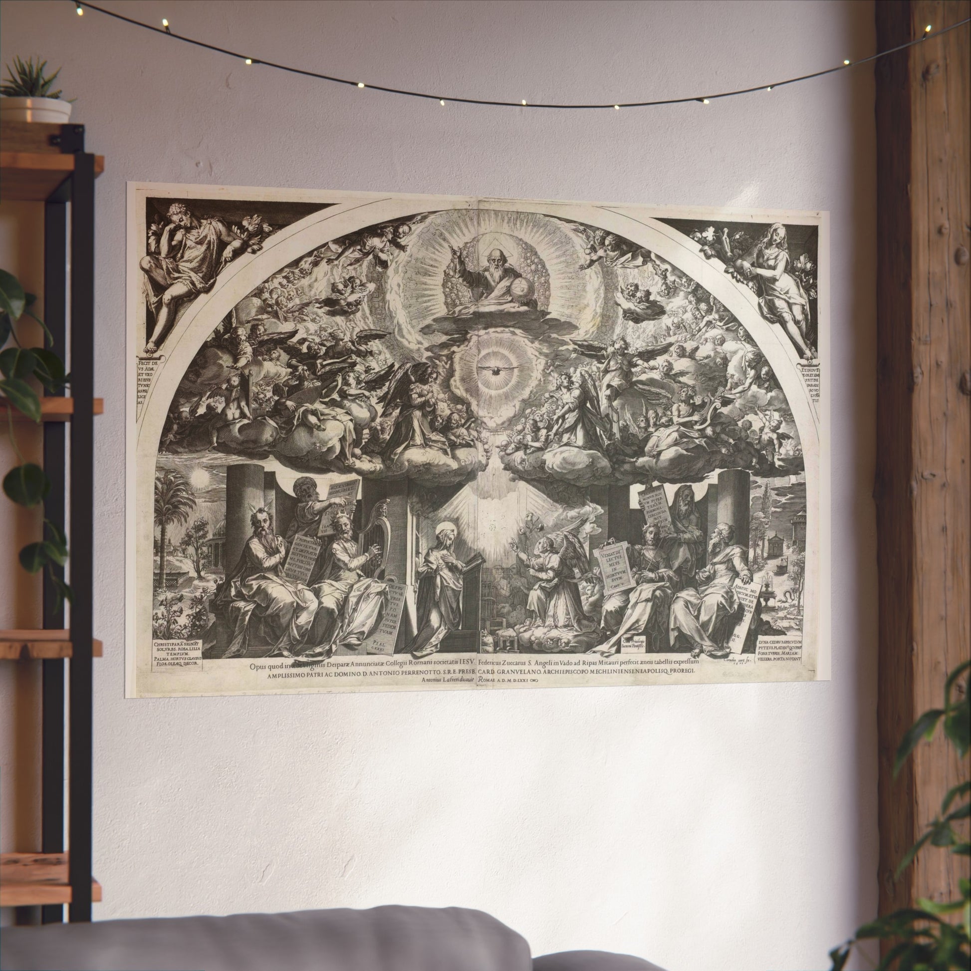 At the heart of the painting, we find a kneeling Mary, captivated by an angel who kneels before her, presenting a lily. On either side, prophets stand as silent observers. Above them, choirs of angels float amidst the clouds, forming a celestial backdrop. In the midst of a radiant halo, God the Father appears as an elderly man holding a globe, accompanied by the Holy Spirit taking the form of a dove.