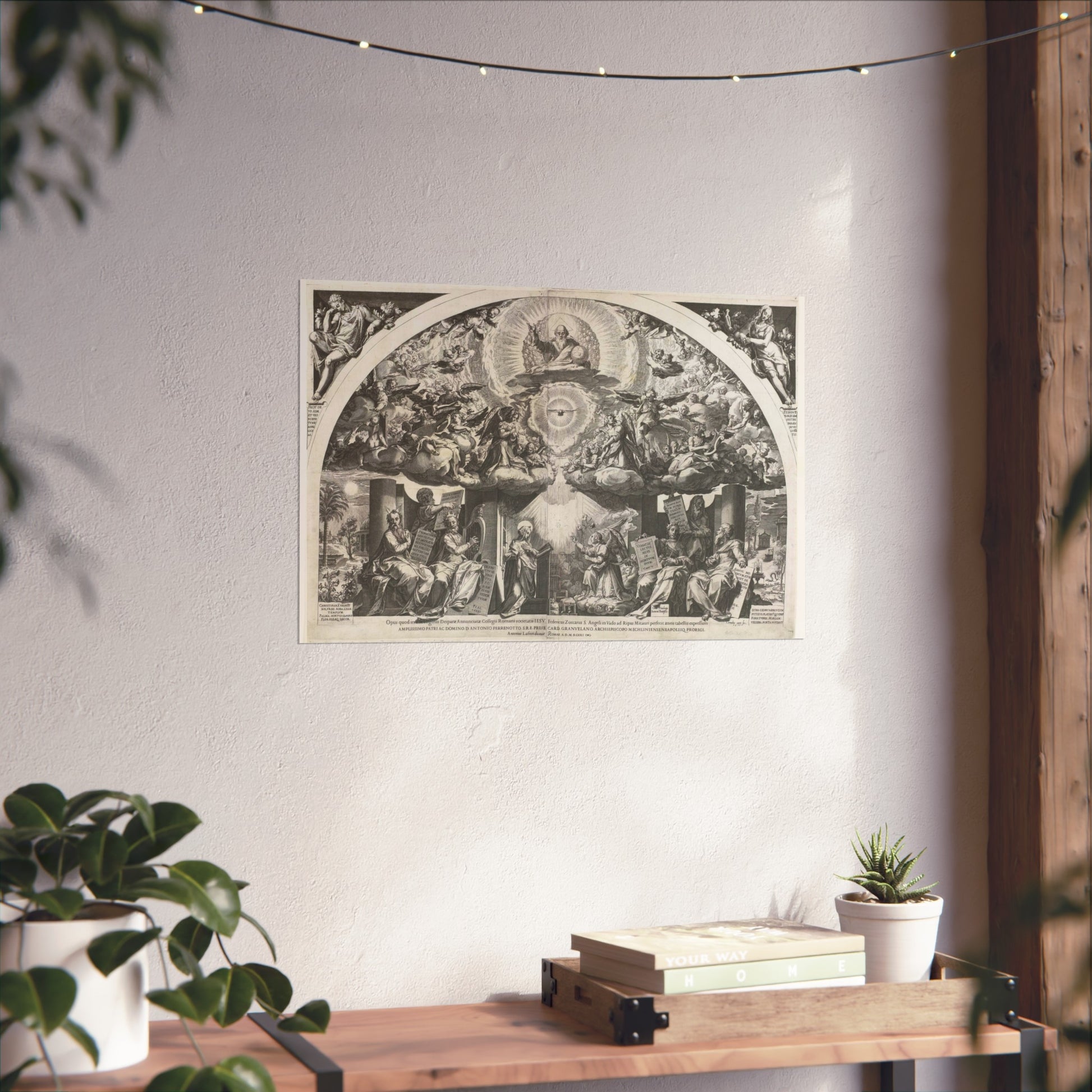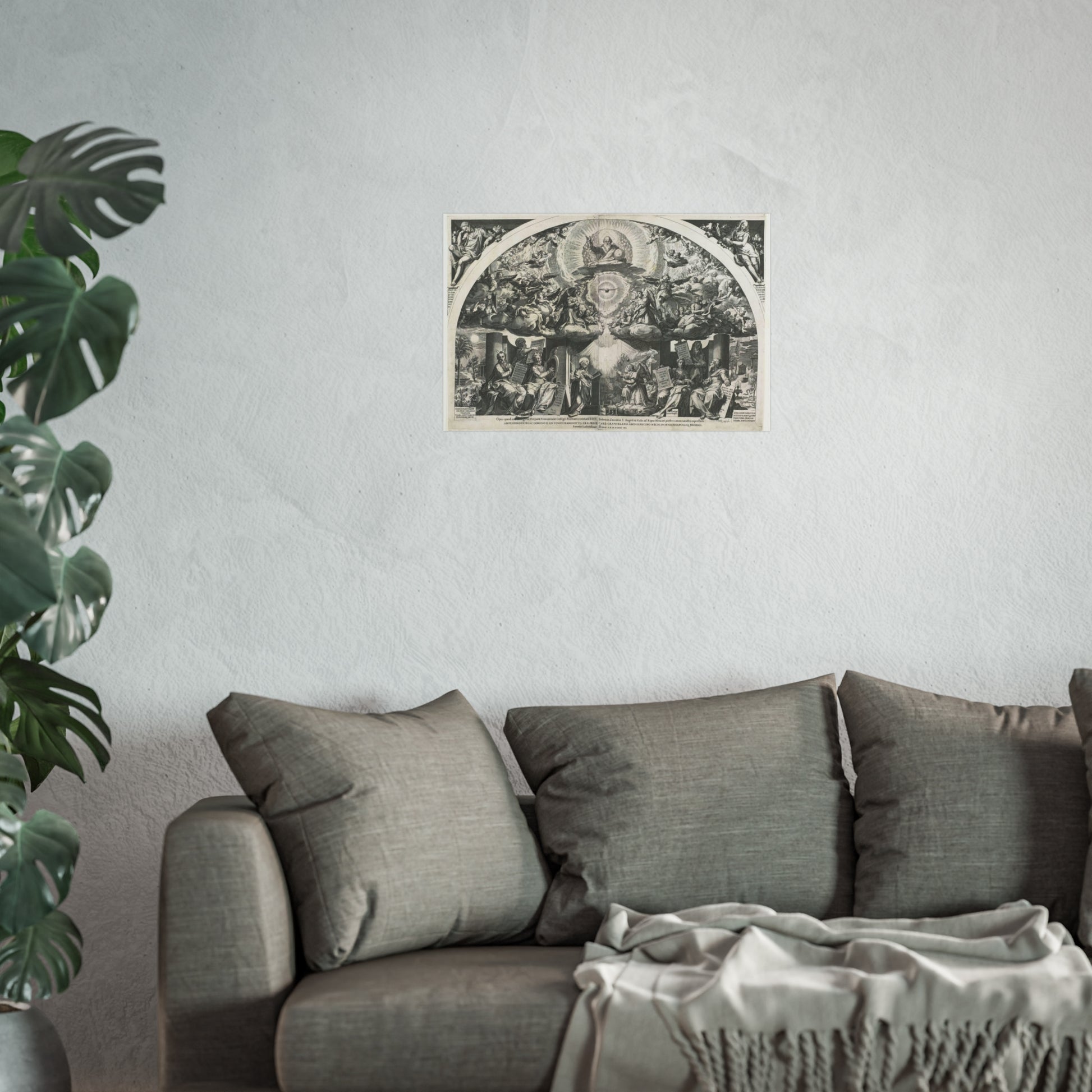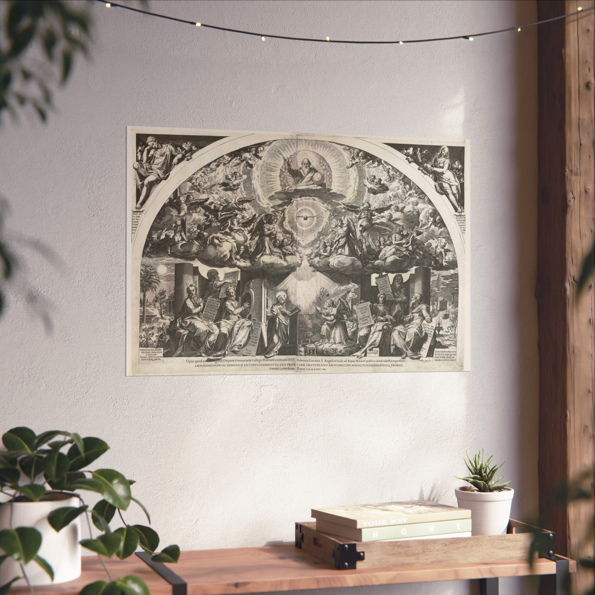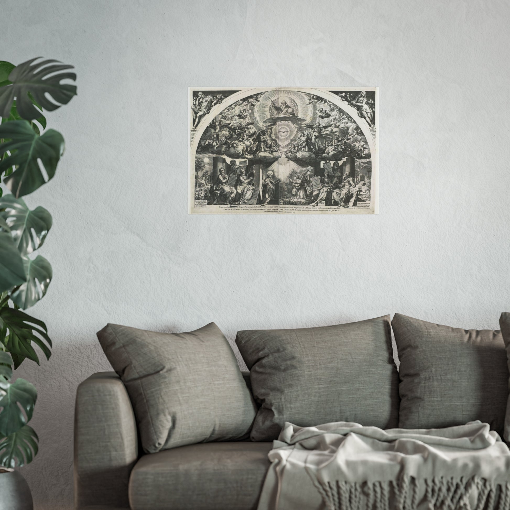 At the heart of the painting, we find a kneeling Mary, captivated by an angel who kneels before her, presenting a lily. On either side, prophets stand as silent observers. Above them, choirs of angels float amidst the clouds, forming a celestial backdrop. In the midst of a radiant halo, God the Father appears as an elderly man holding a globe, accompanied by the Holy Spirit taking the form of a dove.
