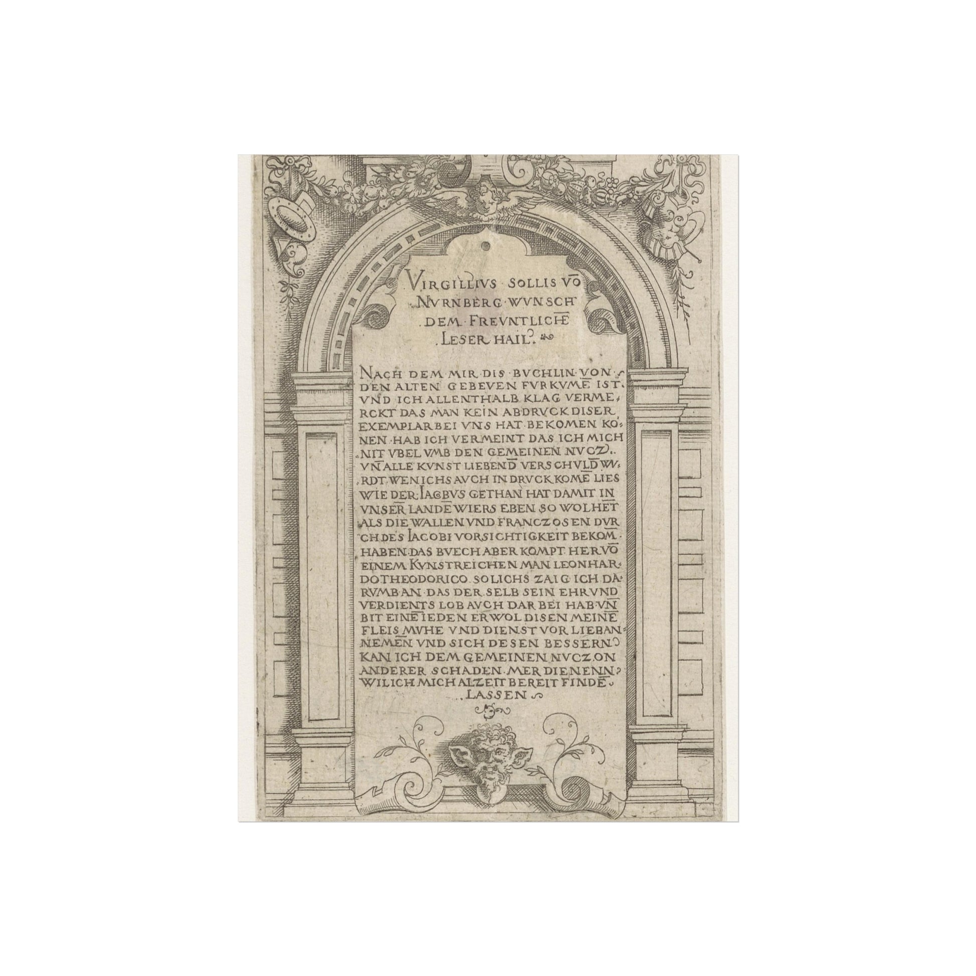 This intriguing piece by Virgilius Solis invites viewers into a world of profound symbolism. The artwork captures an arch, which is a recurring theme in Solis' work, beautifully conveying a message from the printmaker himself. Its subtle details and intricate design reflect the artist's masterful technique, making it a captivating addition to any art collection.