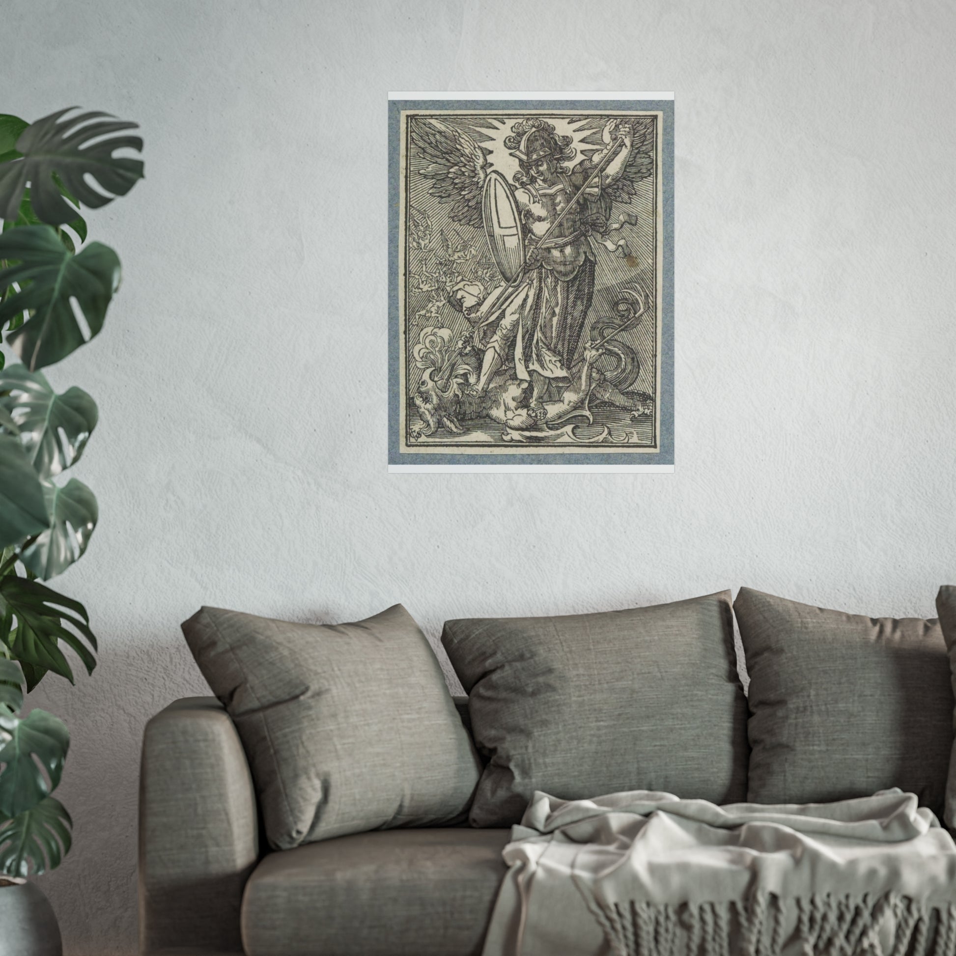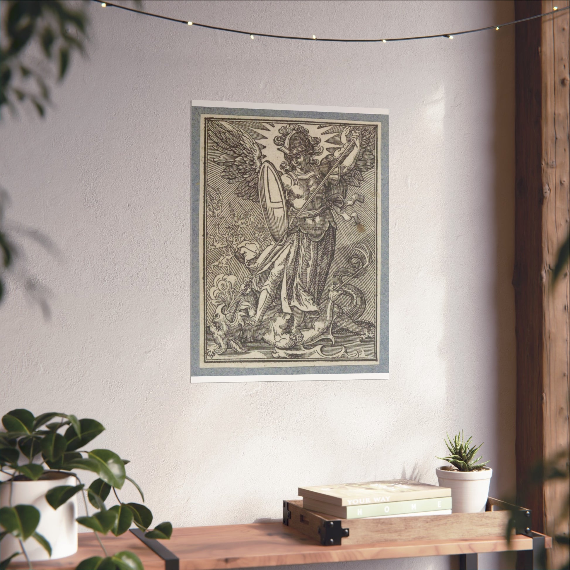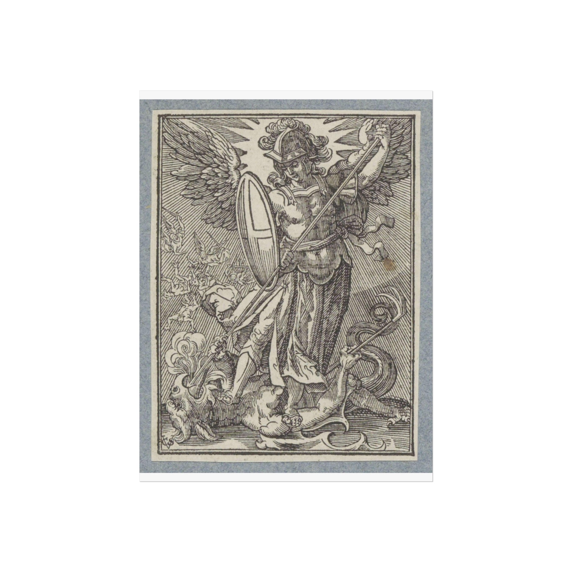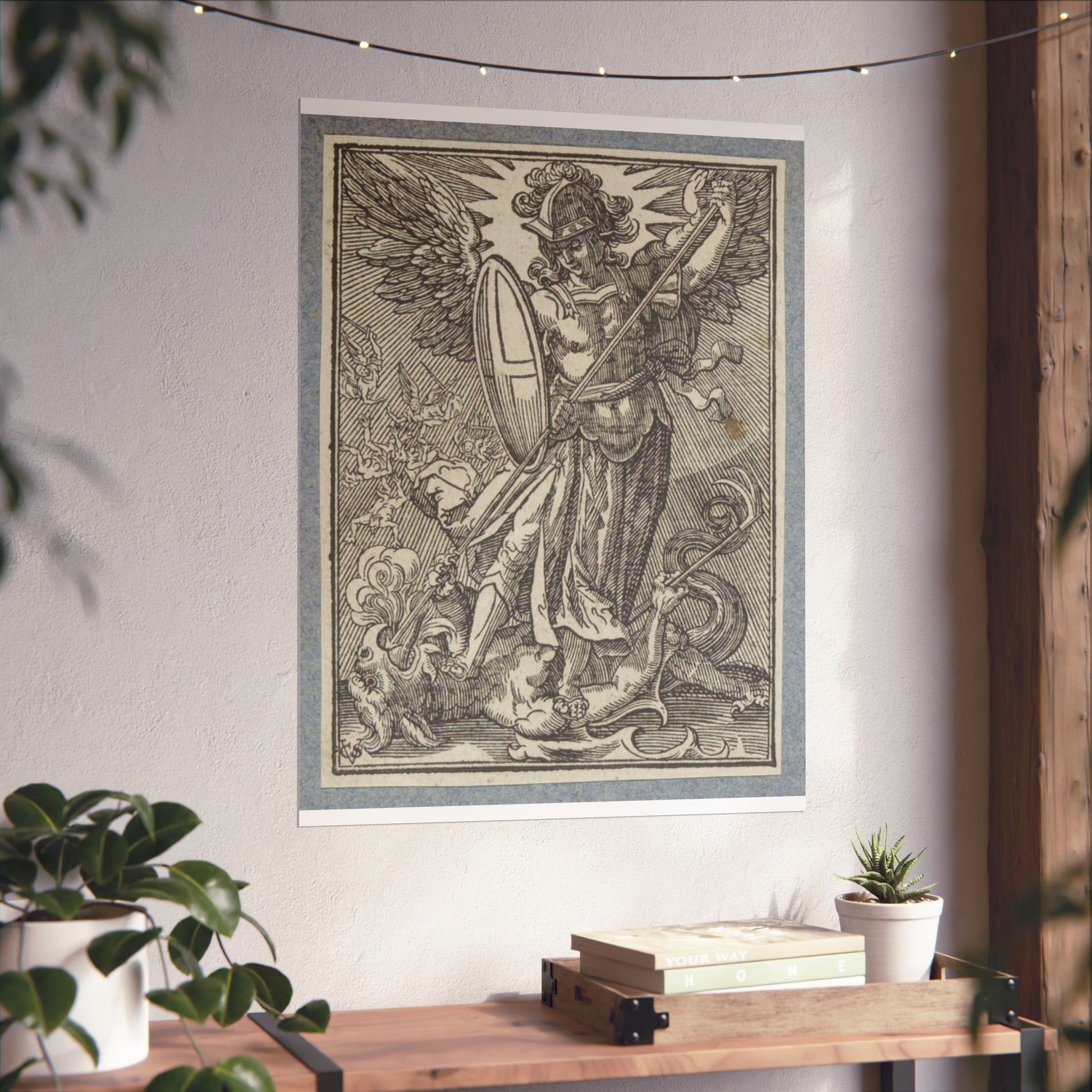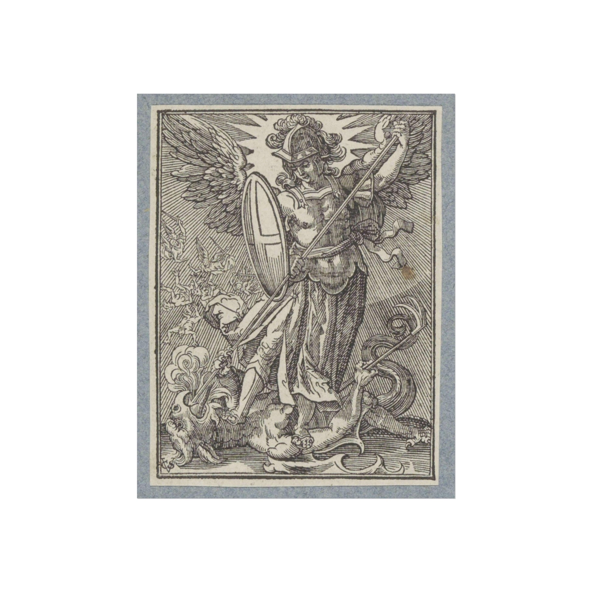 This captivating piece portrays the powerful Archangel Michael, armed with shield and spear, vanquishing a dragon beneath his feet. In the backdrop, angels are shown defeating devils in the heavens. This print is part of an album, adding to its historical significance and narrative depth.