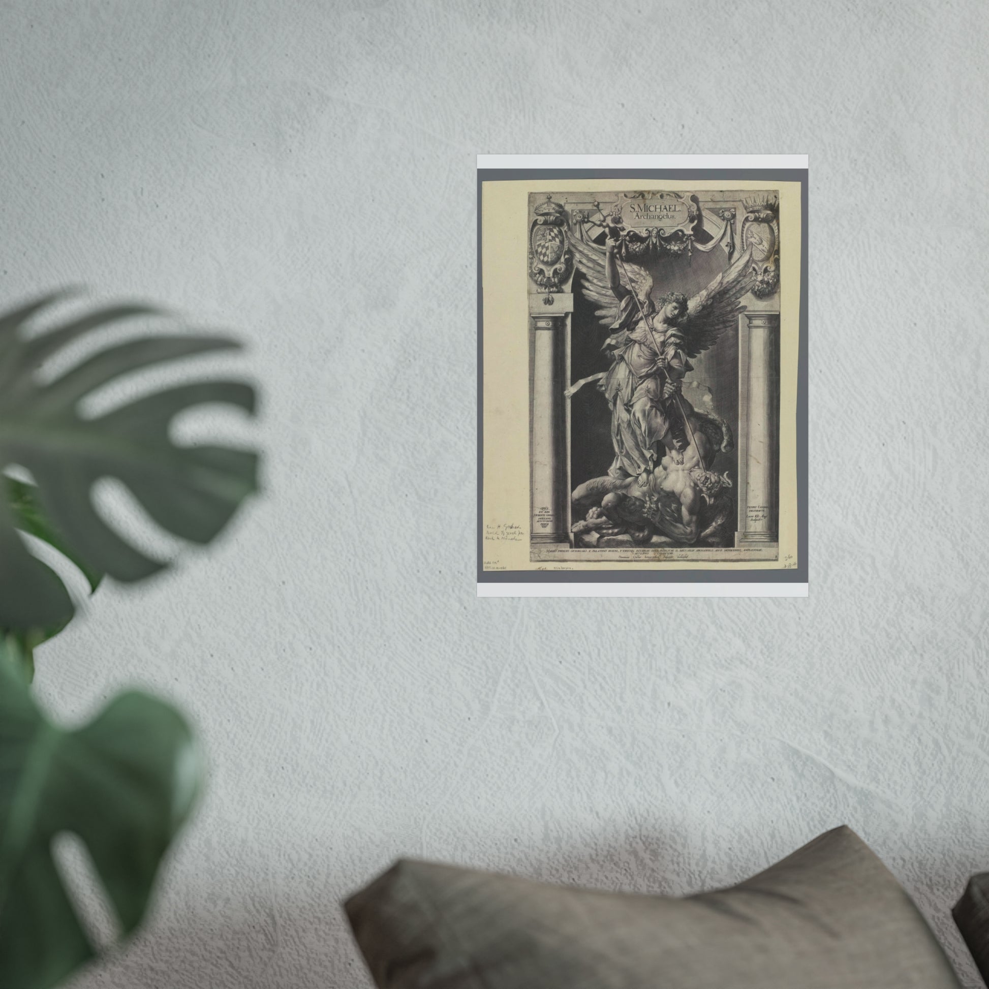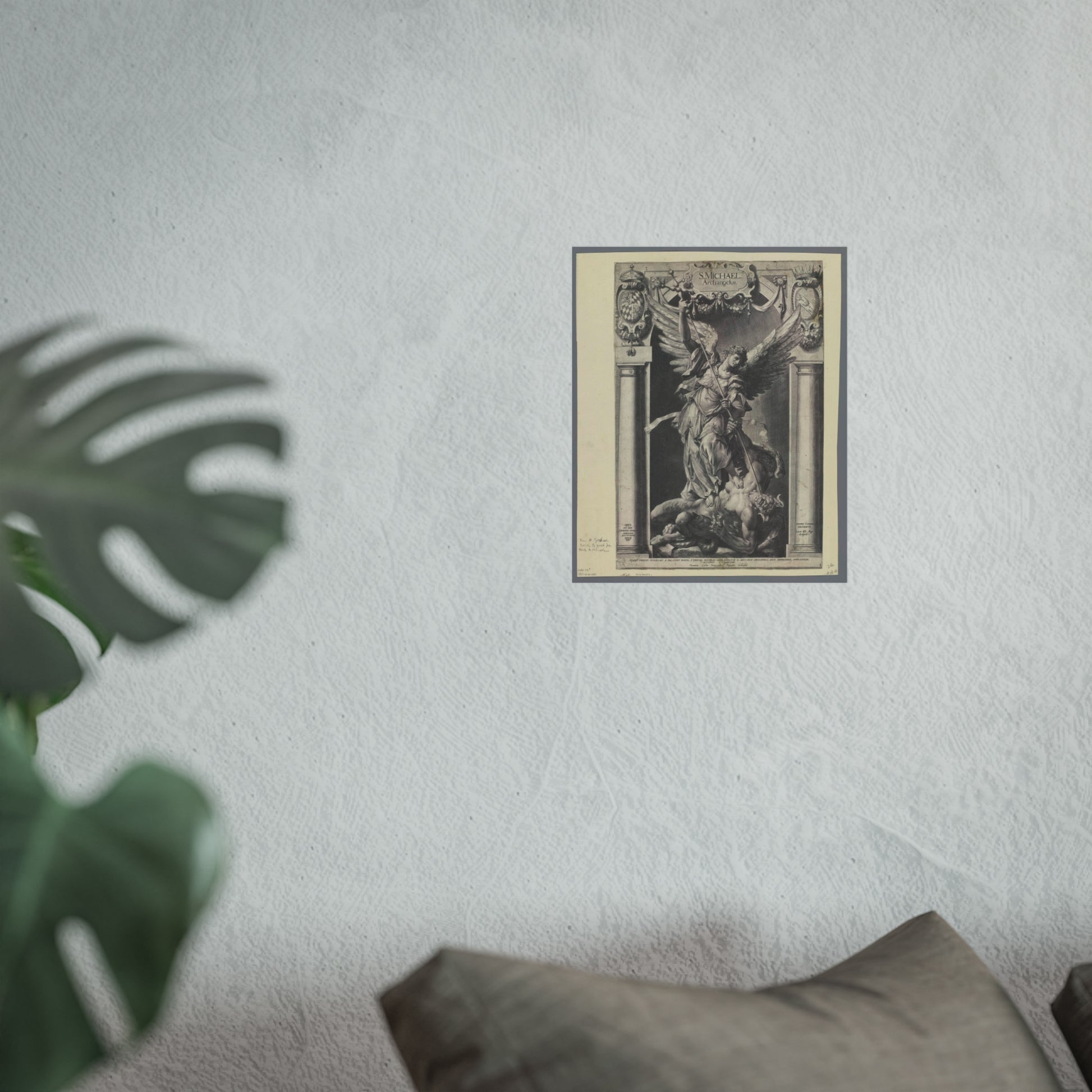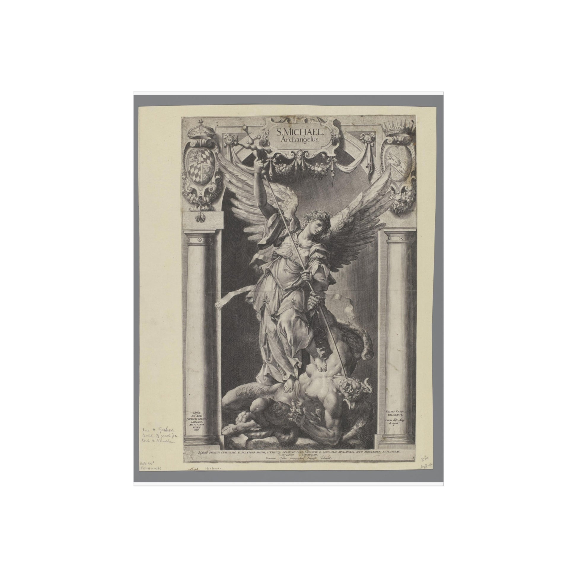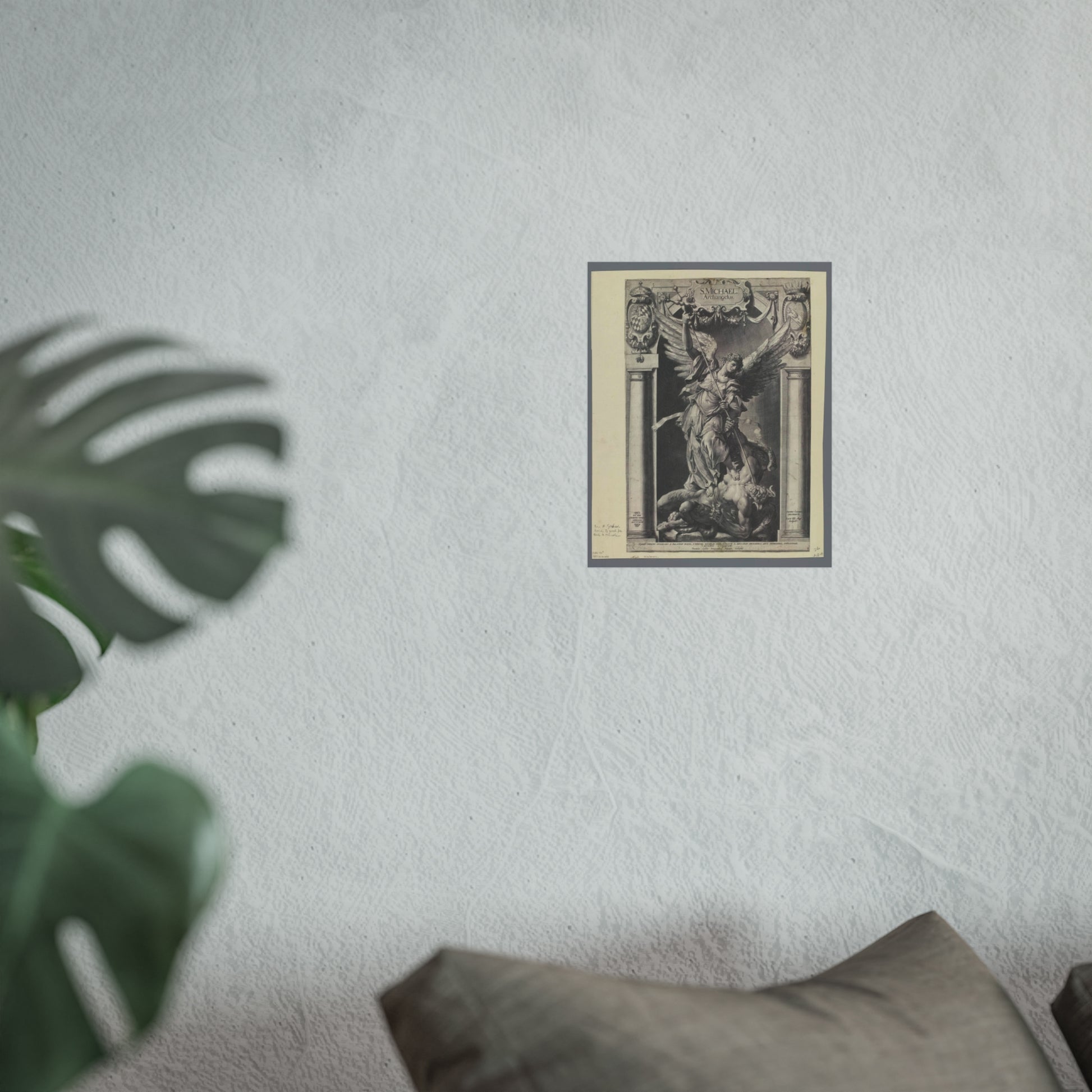 Intricately crafted, this artwork features Latin inscriptions adorning the lower margin and columns, creating a unique blend of visual artistry and classical language.