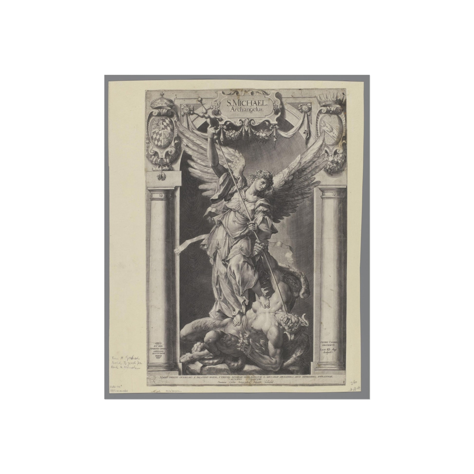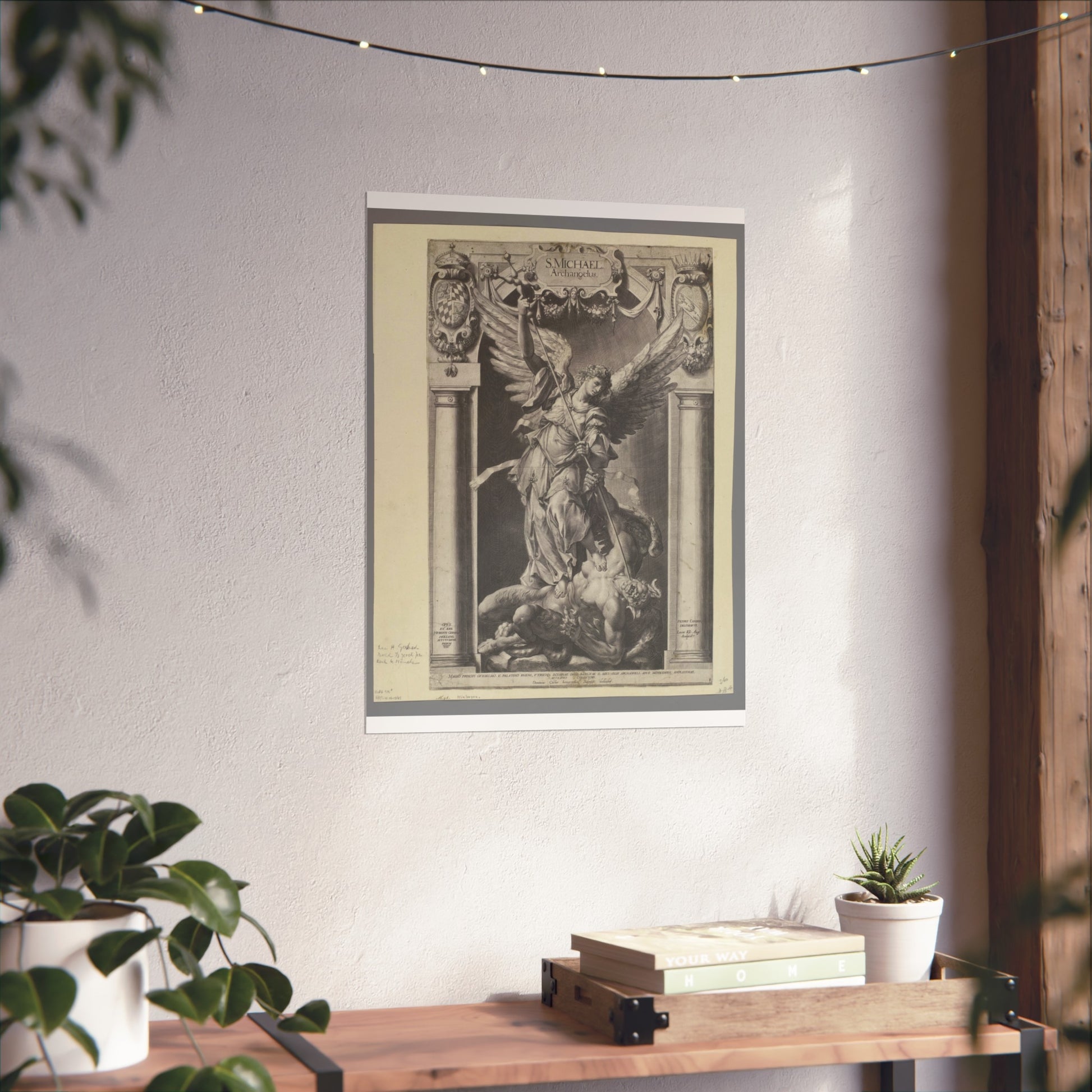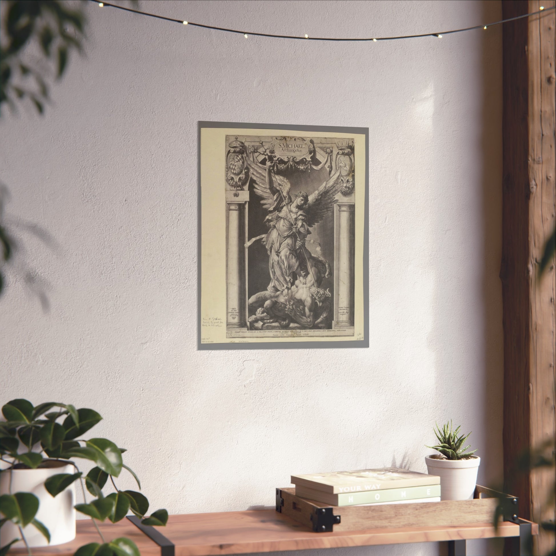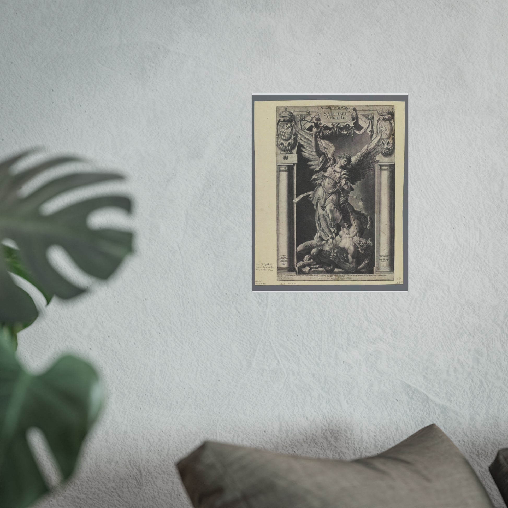 Intricately crafted, this artwork features Latin inscriptions adorning the lower margin and columns, creating a unique blend of visual artistry and classical language.