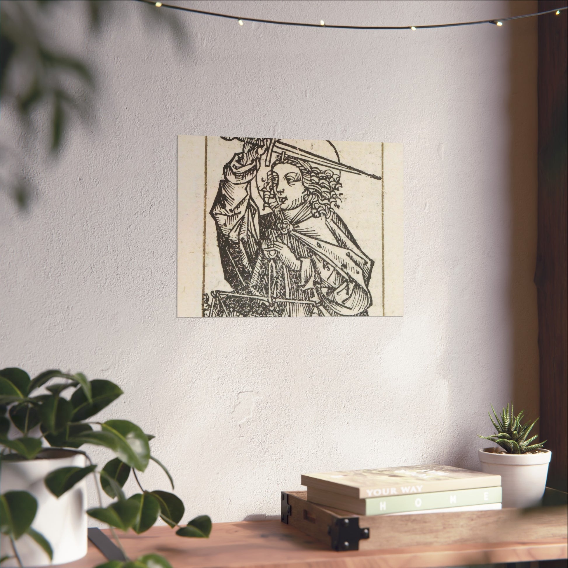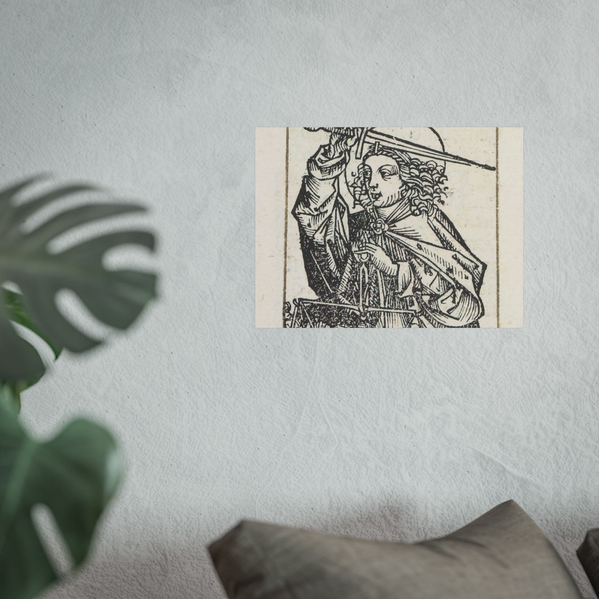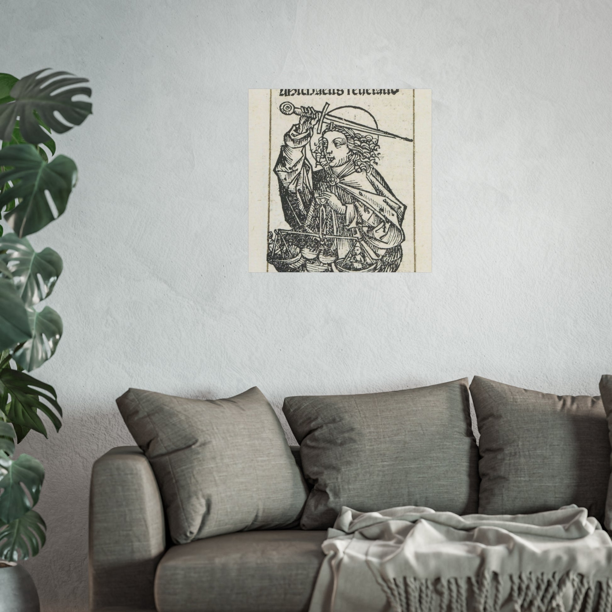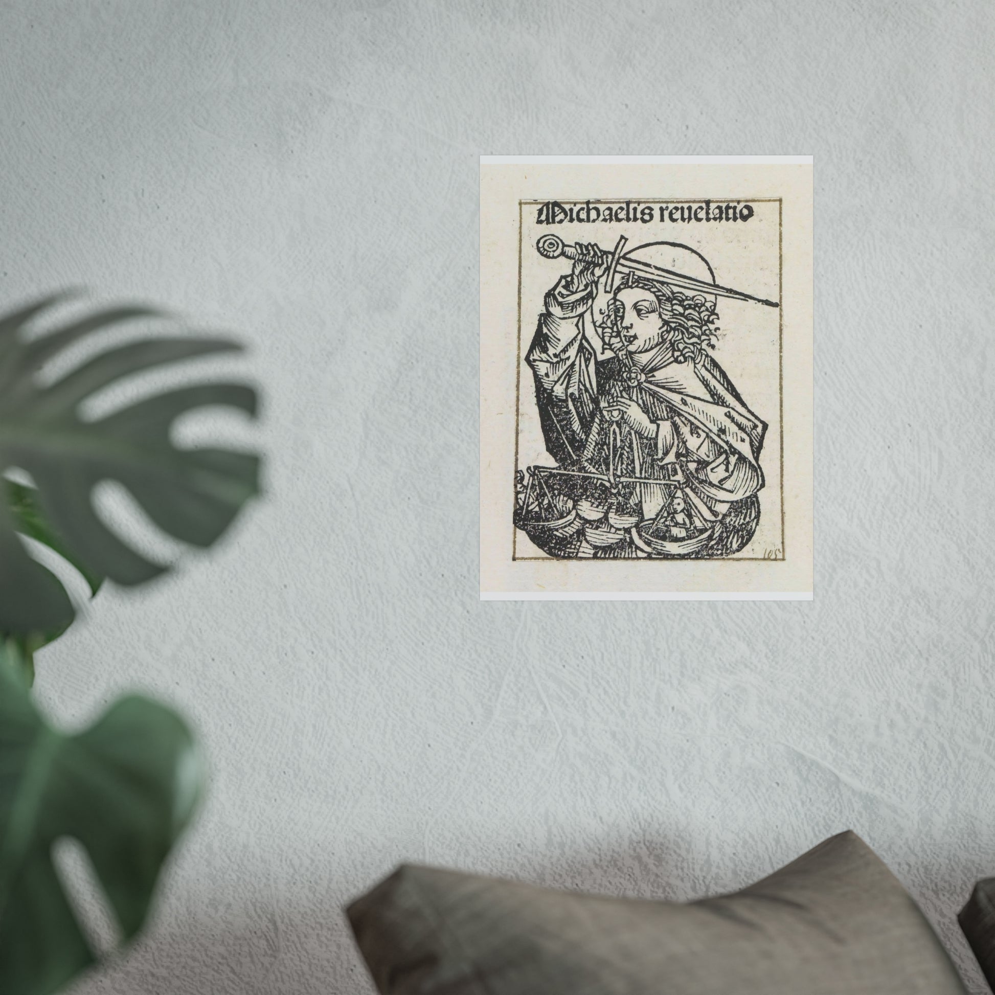 A stunning depiction of Archangel Michael, adorned with a radiant nimbus around his head. In his right hand, he wields a mighty sword, while in his left, he holds the scales of the human soul. This captivating print is part of an exquisite album.
