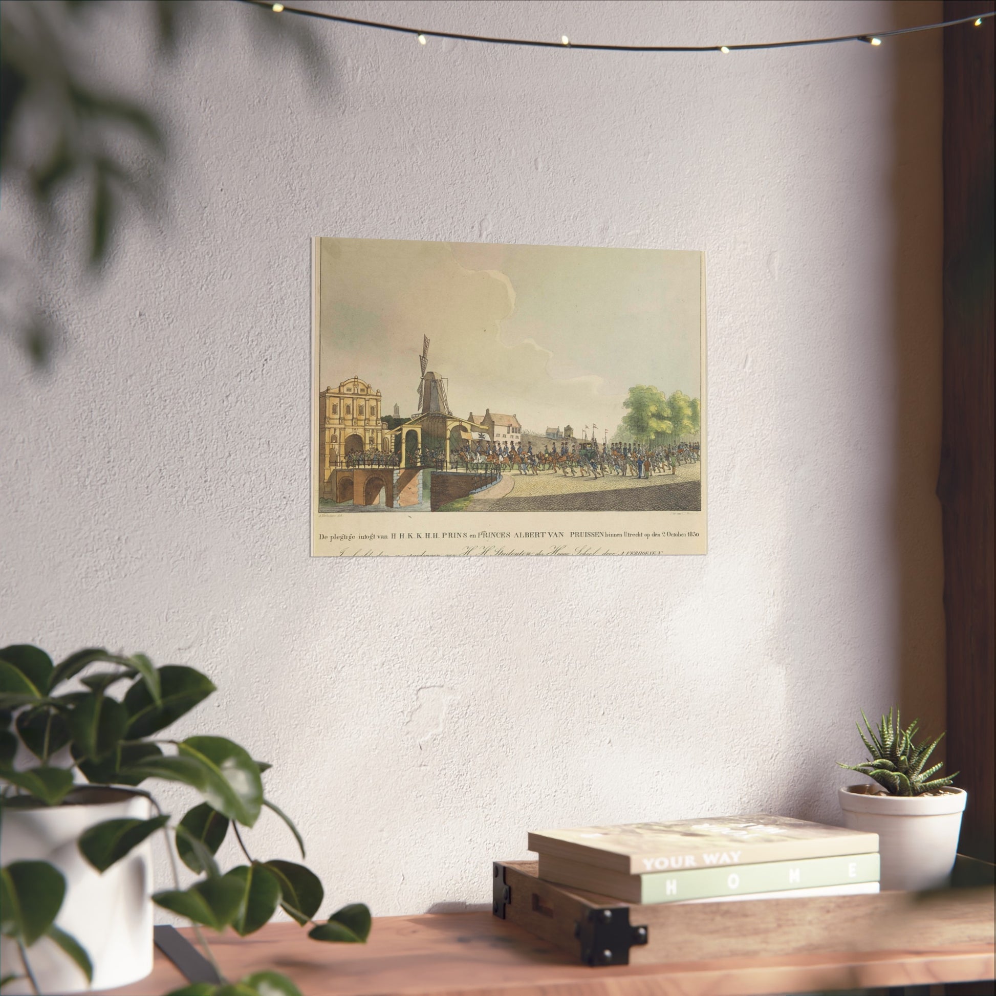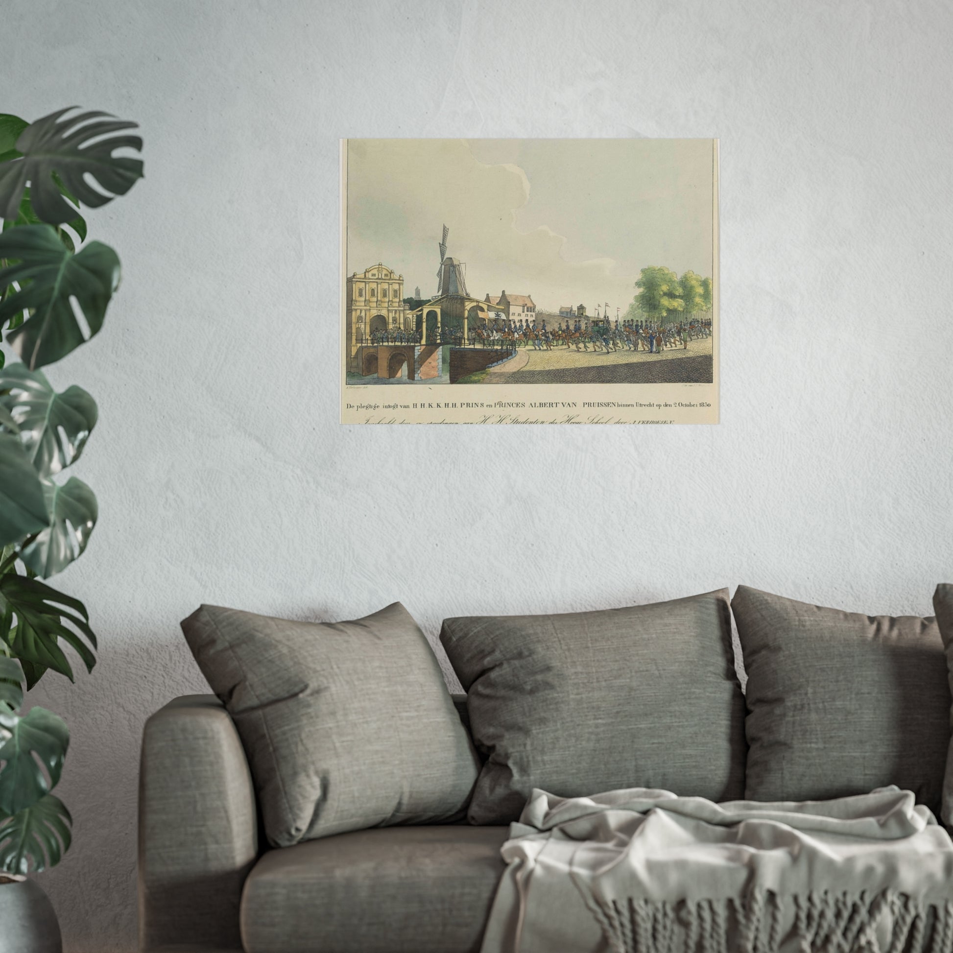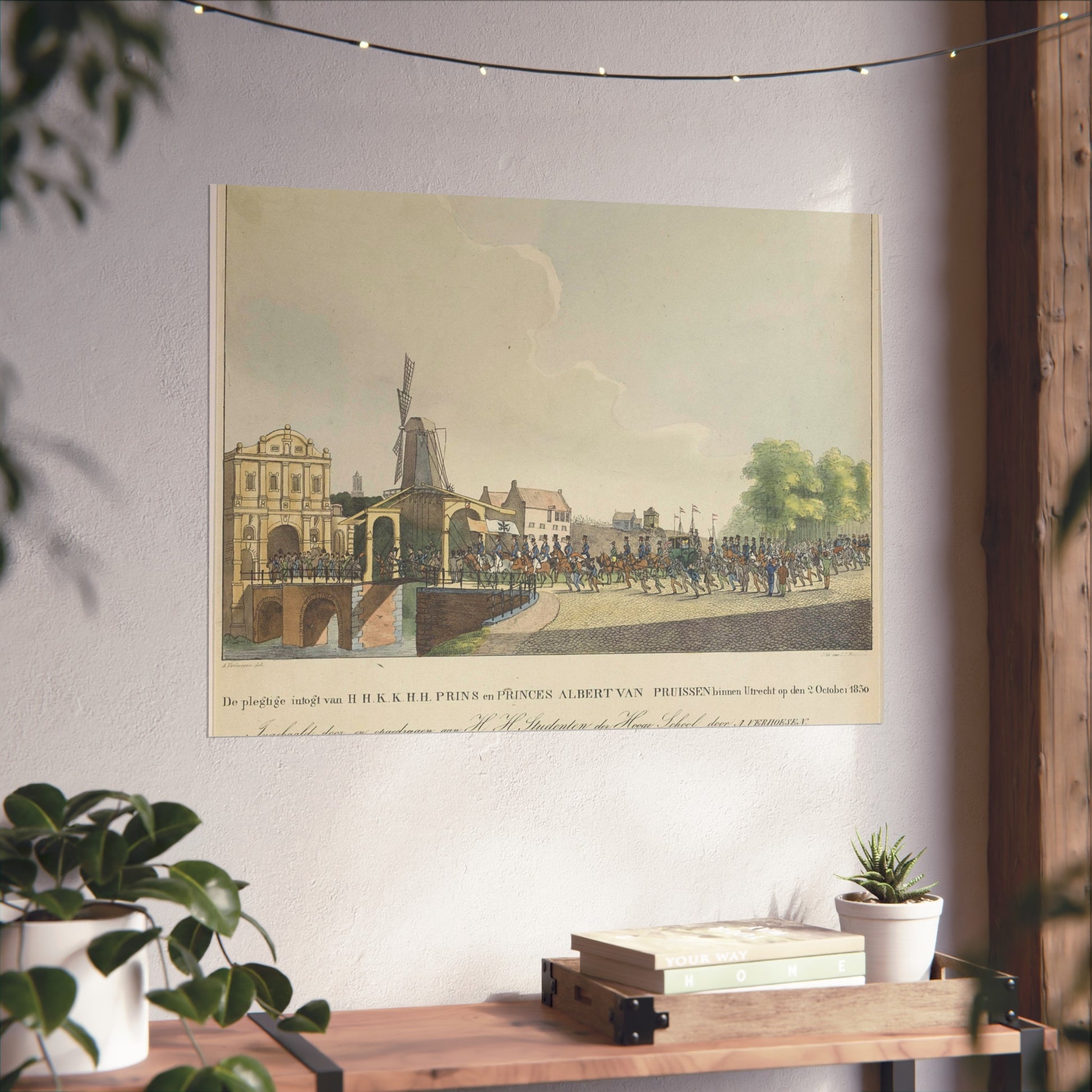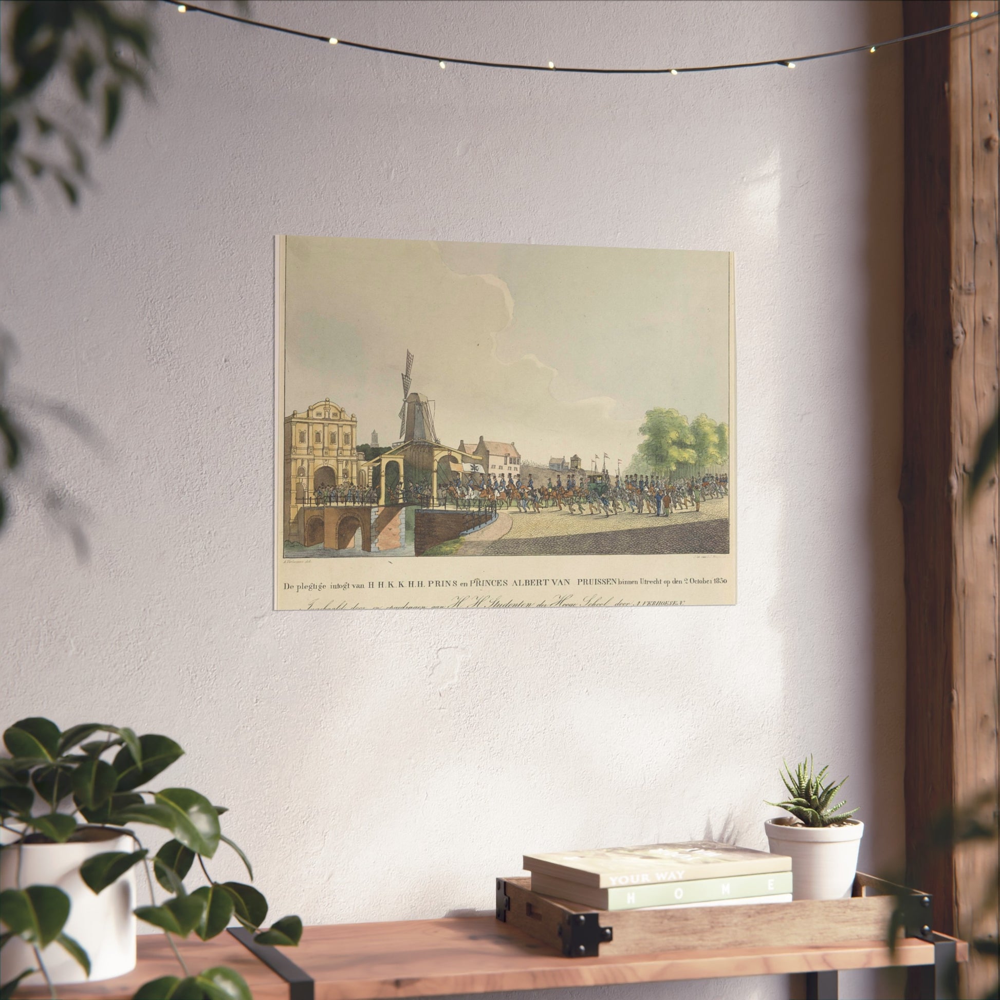This captivating artwork vividly captures the grand arrival of Princess Marianne and her husband, Prince Albert of Prussia, in Utrecht on October 2, 1830. The procession, featuring an opulent carriage, is seen crossing a drawbridge towards the Catharijnepoort. Awaiting them at the gate is an honor guard composed of university students, adding a touch of academic prestige to the royal welcome.
