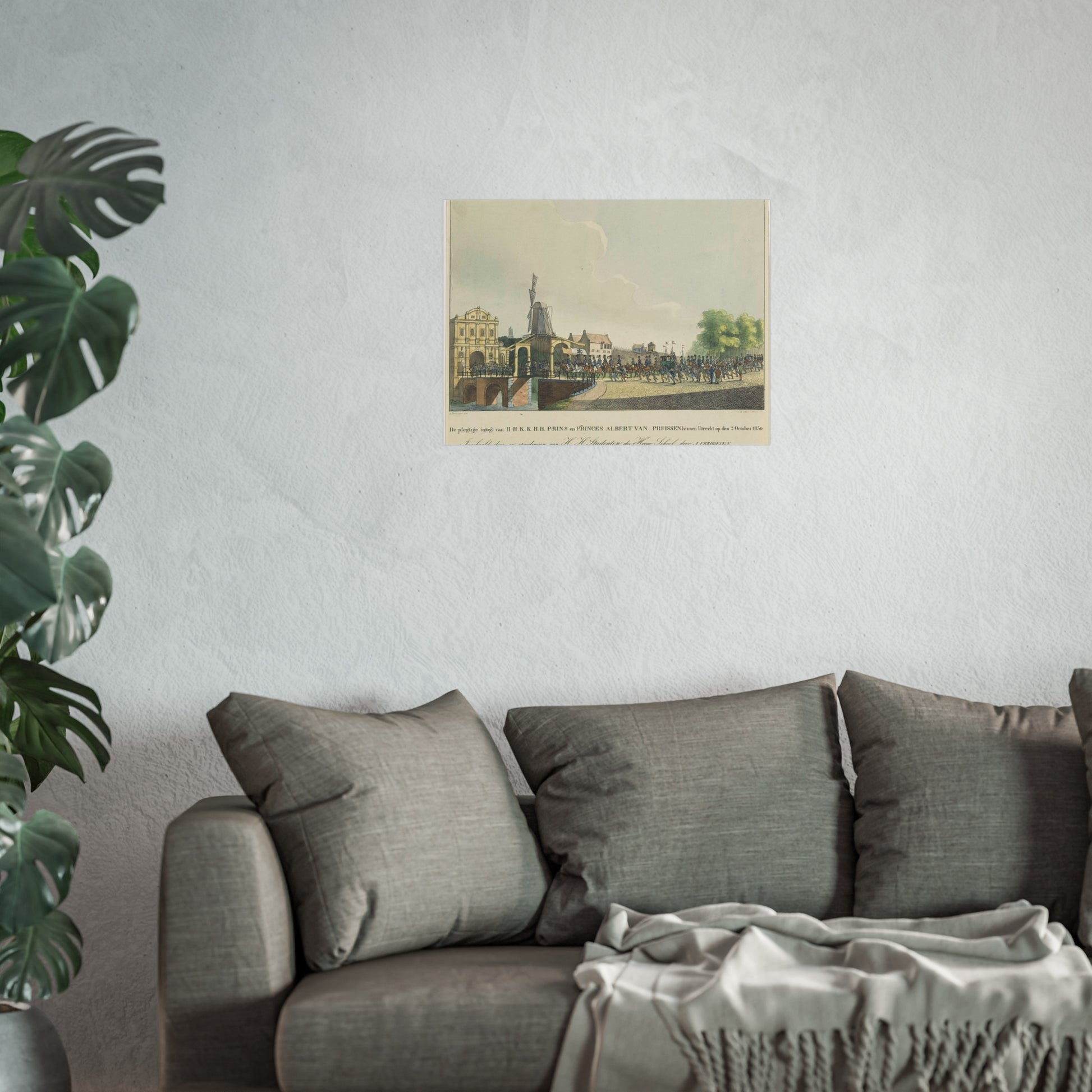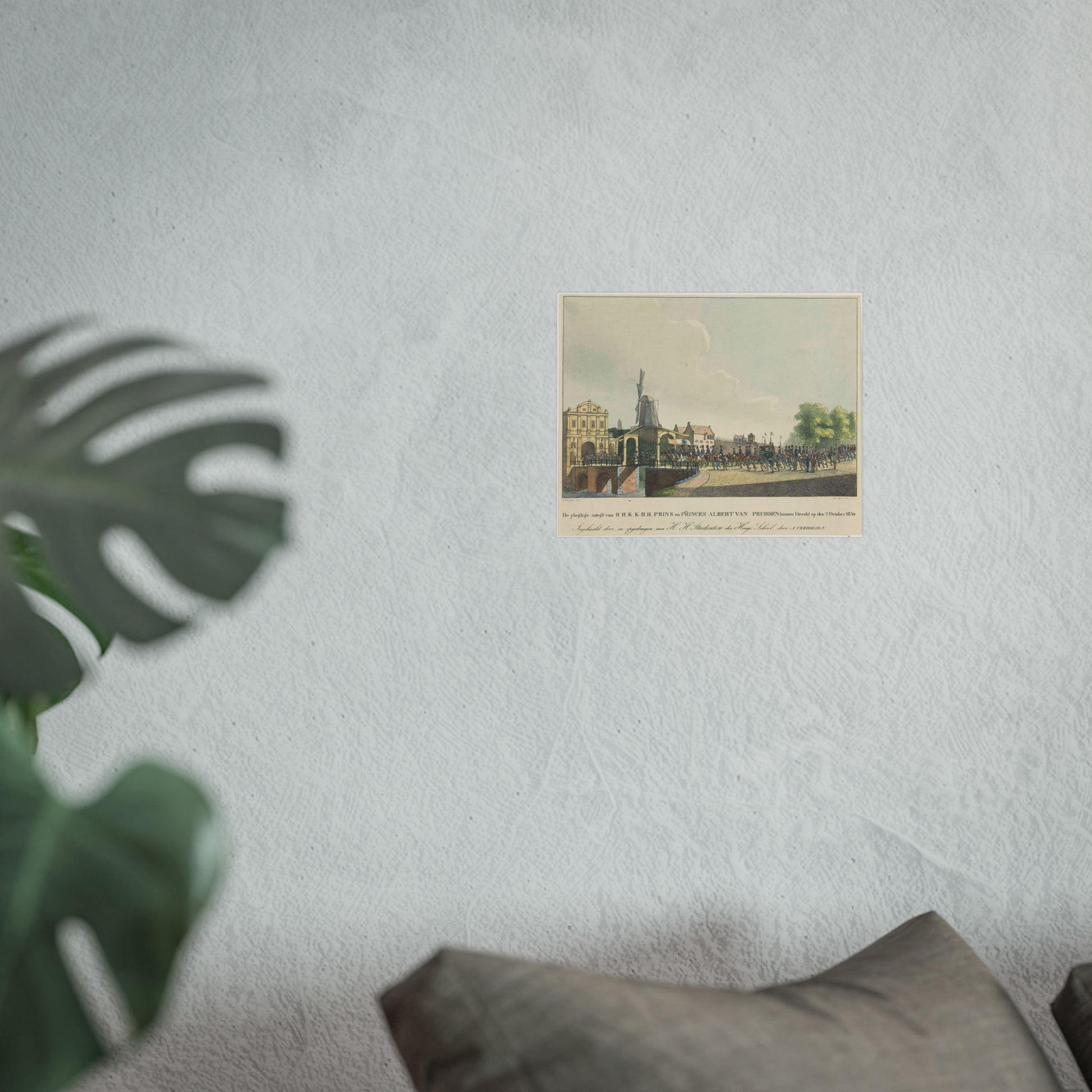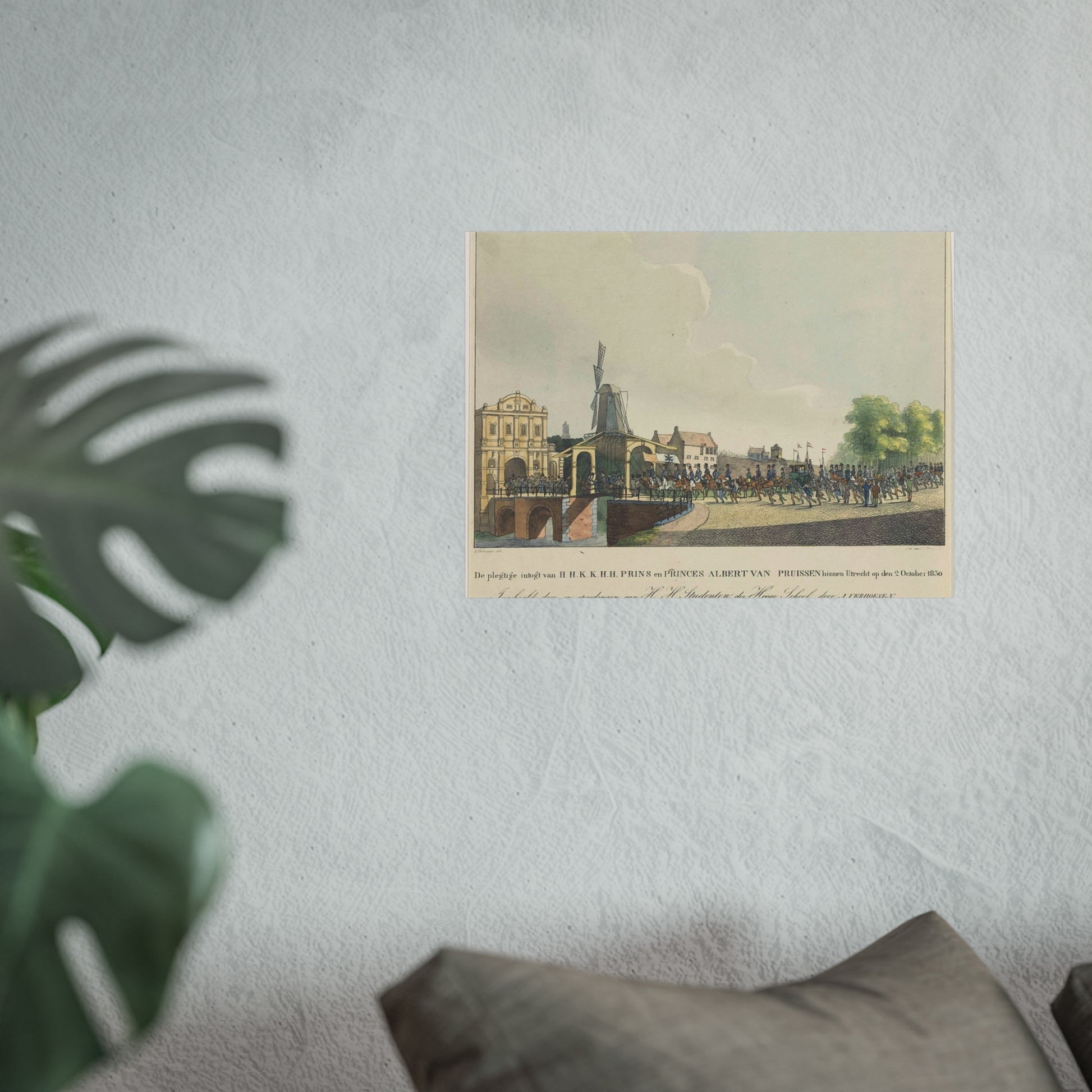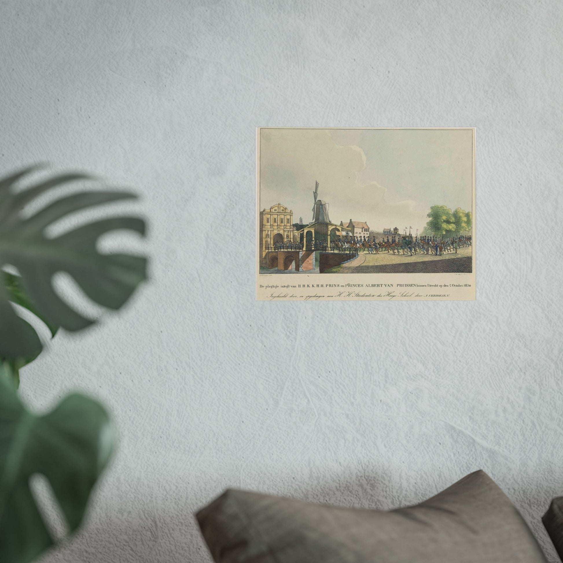 This captivating artwork vividly captures the grand arrival of Princess Marianne and her husband, Prince Albert of Prussia, in Utrecht on October 2, 1830. The procession, featuring an opulent carriage, is seen crossing a drawbridge towards the Catharijnepoort. Awaiting them at the gate is an honor guard composed of university students, adding a touch of academic prestige to the royal welcome.