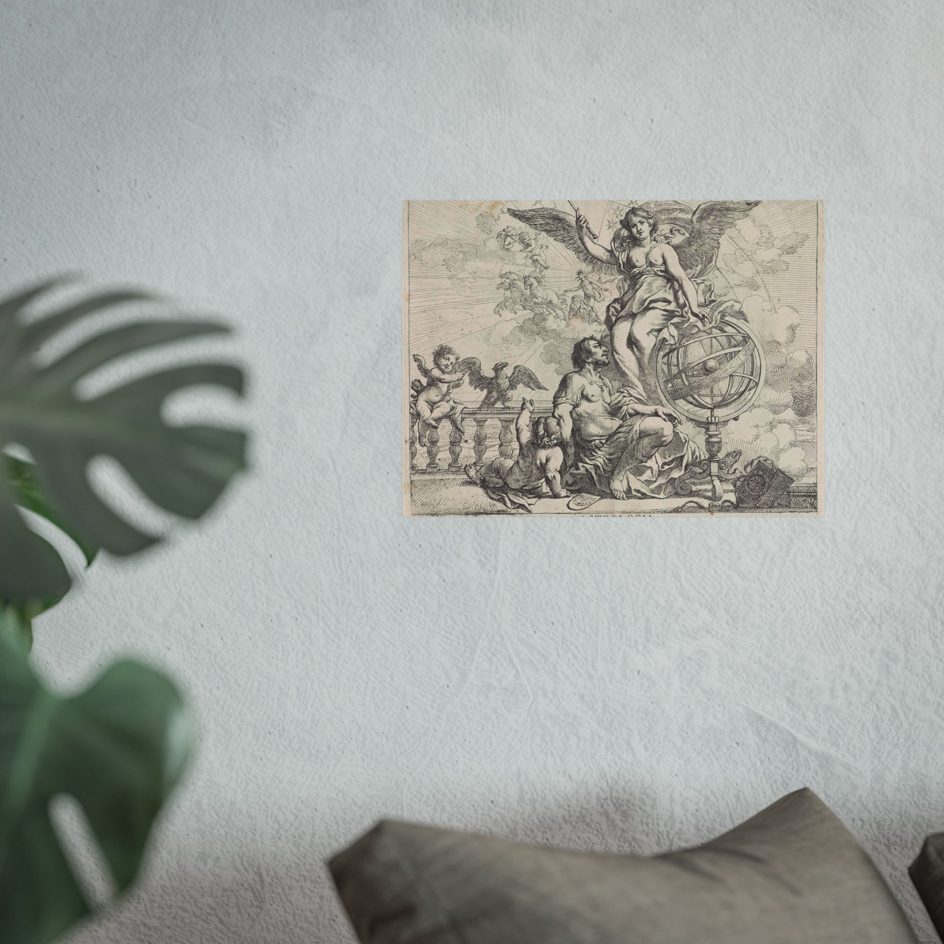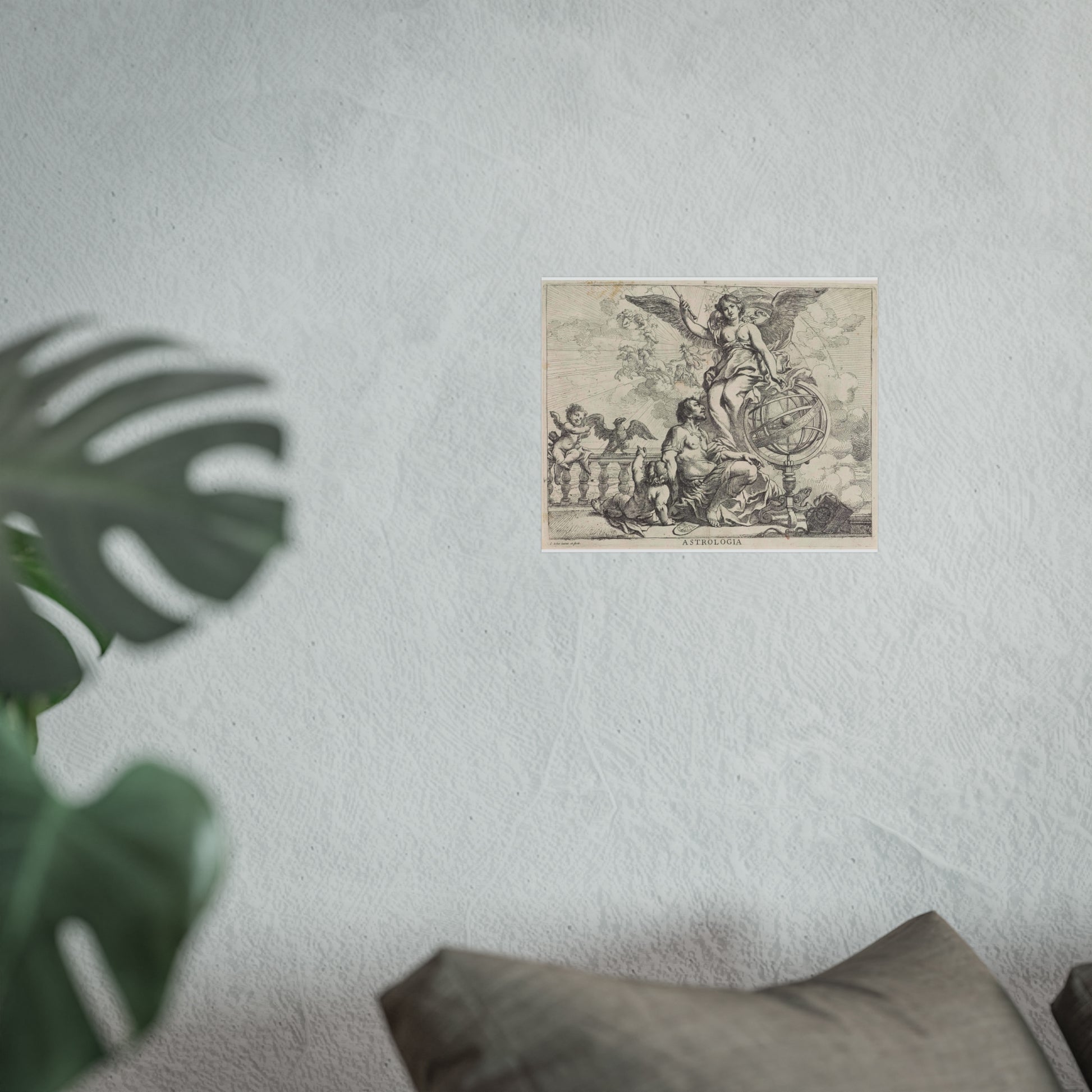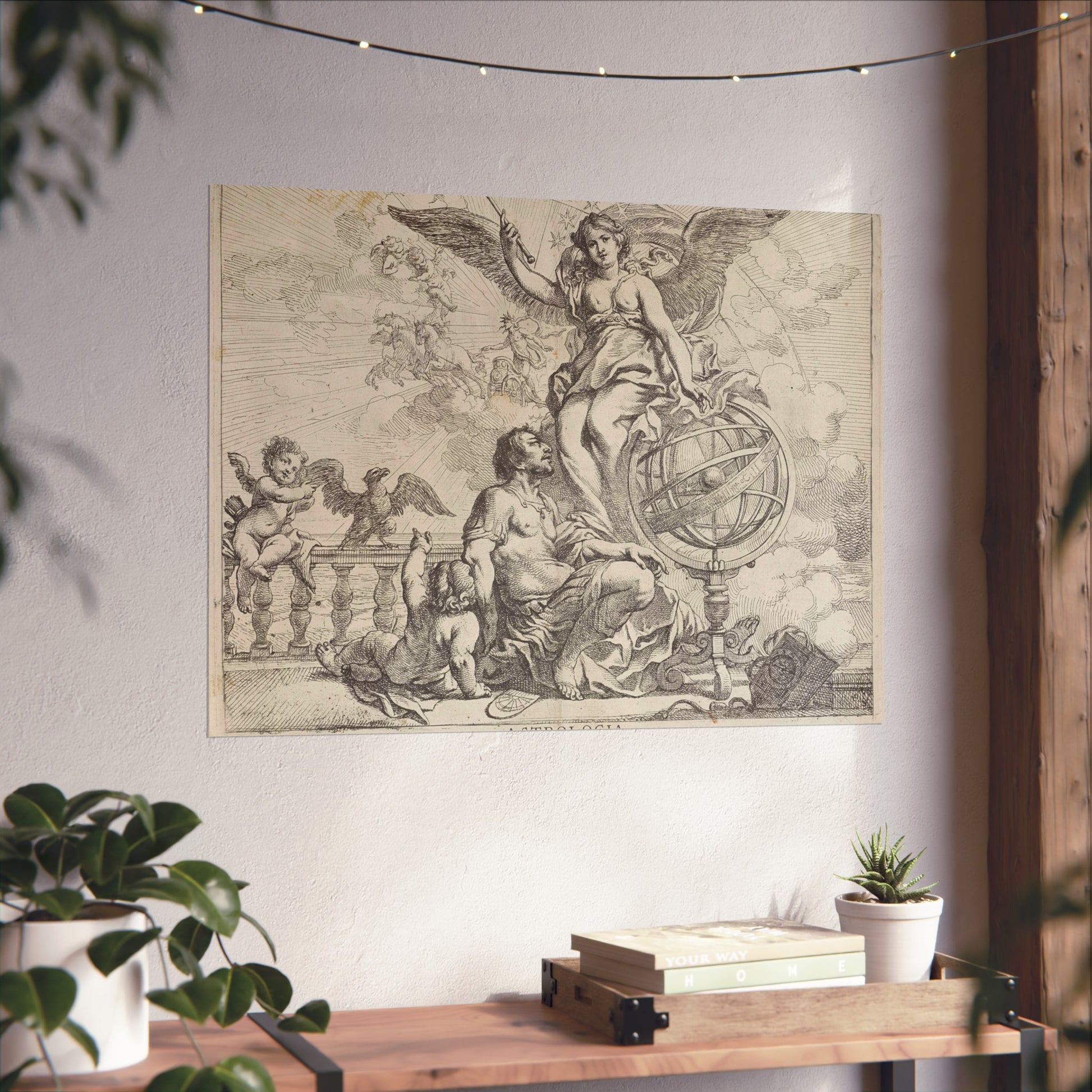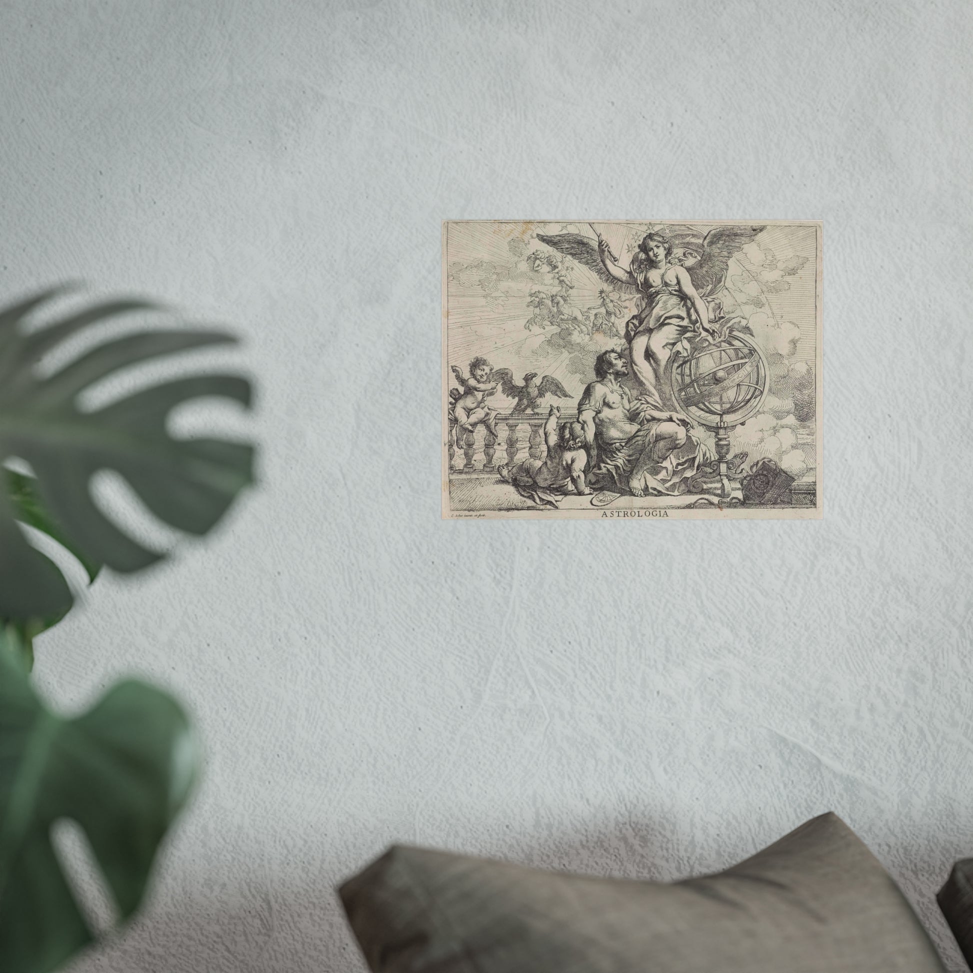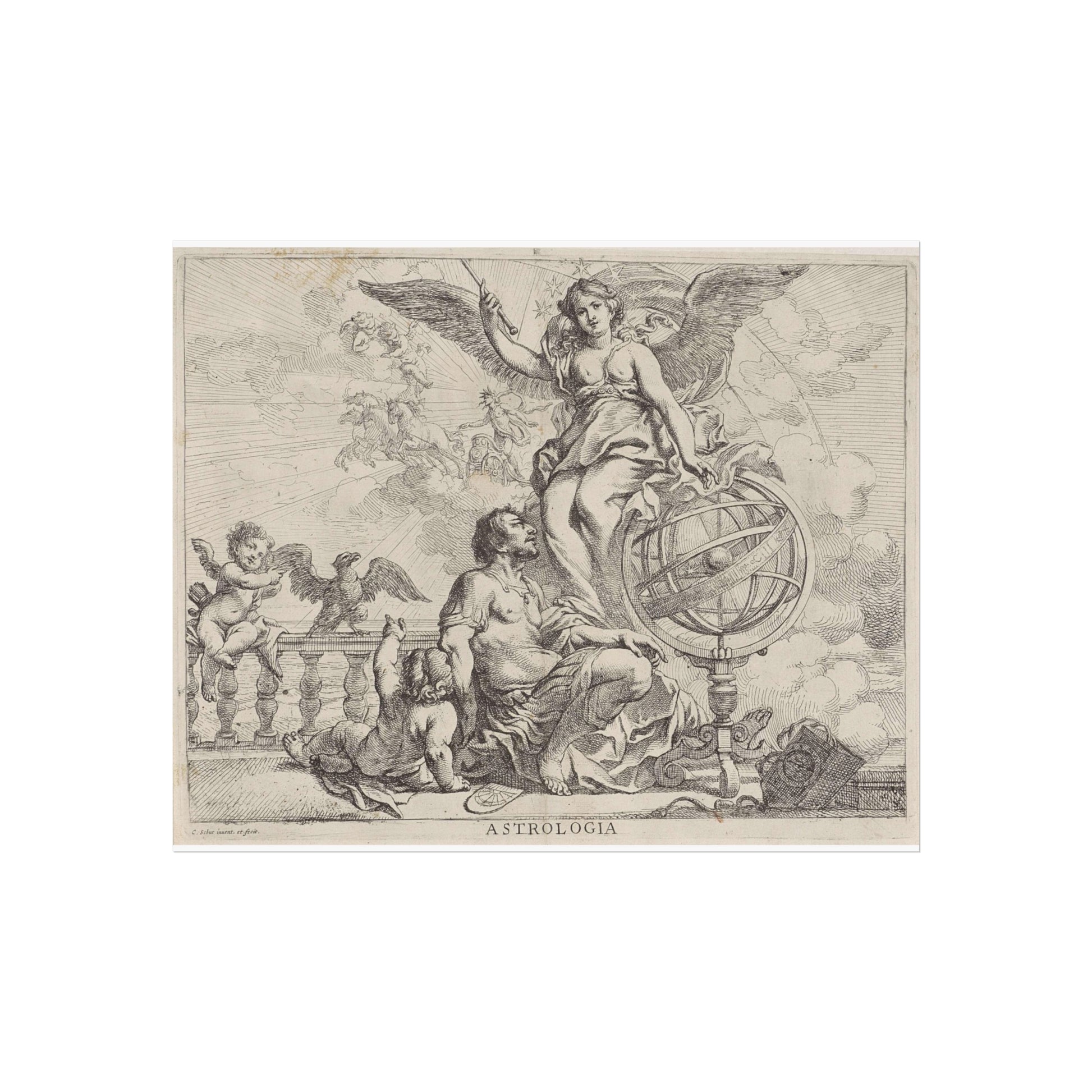 A man gazes upward at a winged figure representing Astrology, who delicately holds an armillary sphere. An eagle and a cherub perch on a balustrade overlooking the sea. Another cherub points skyward towards Apollo, the god of sun, riding his heavenly chariot.