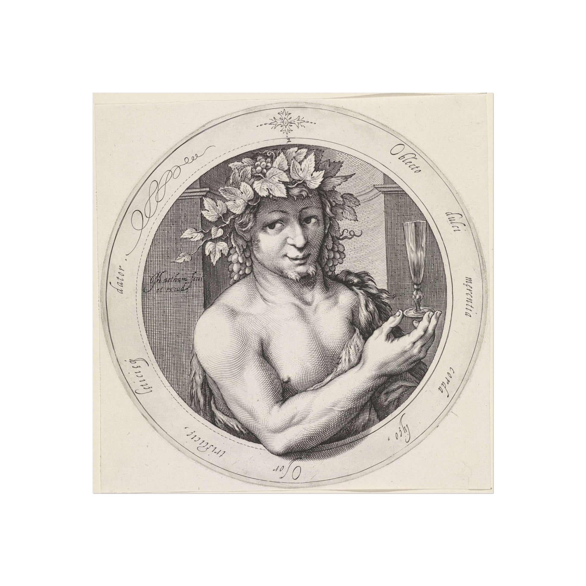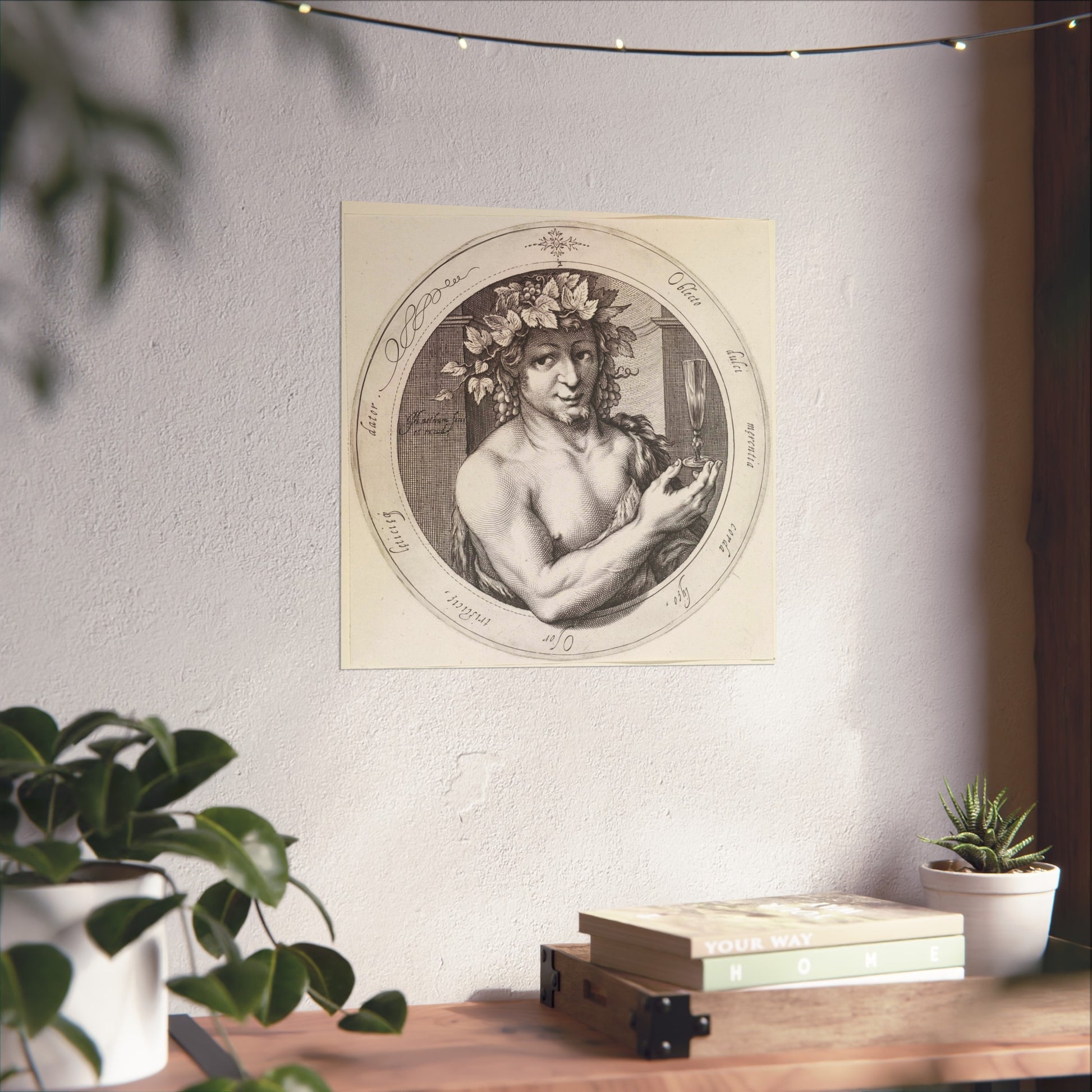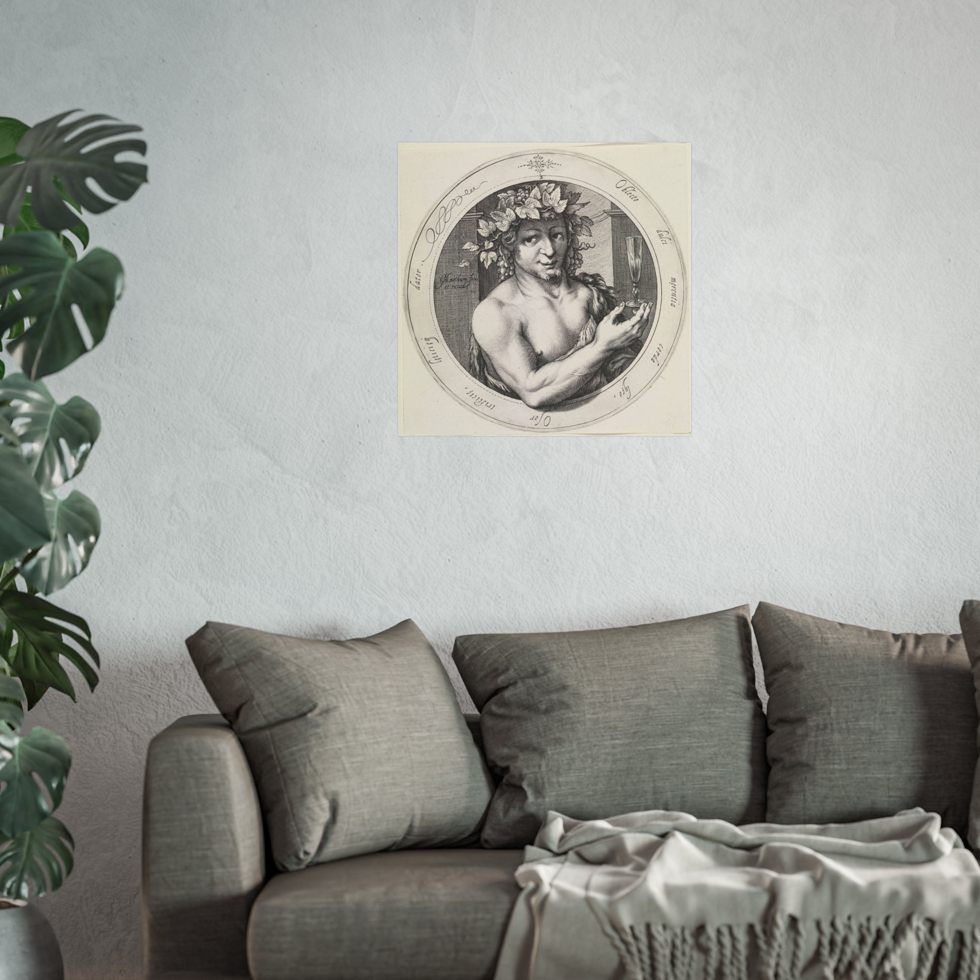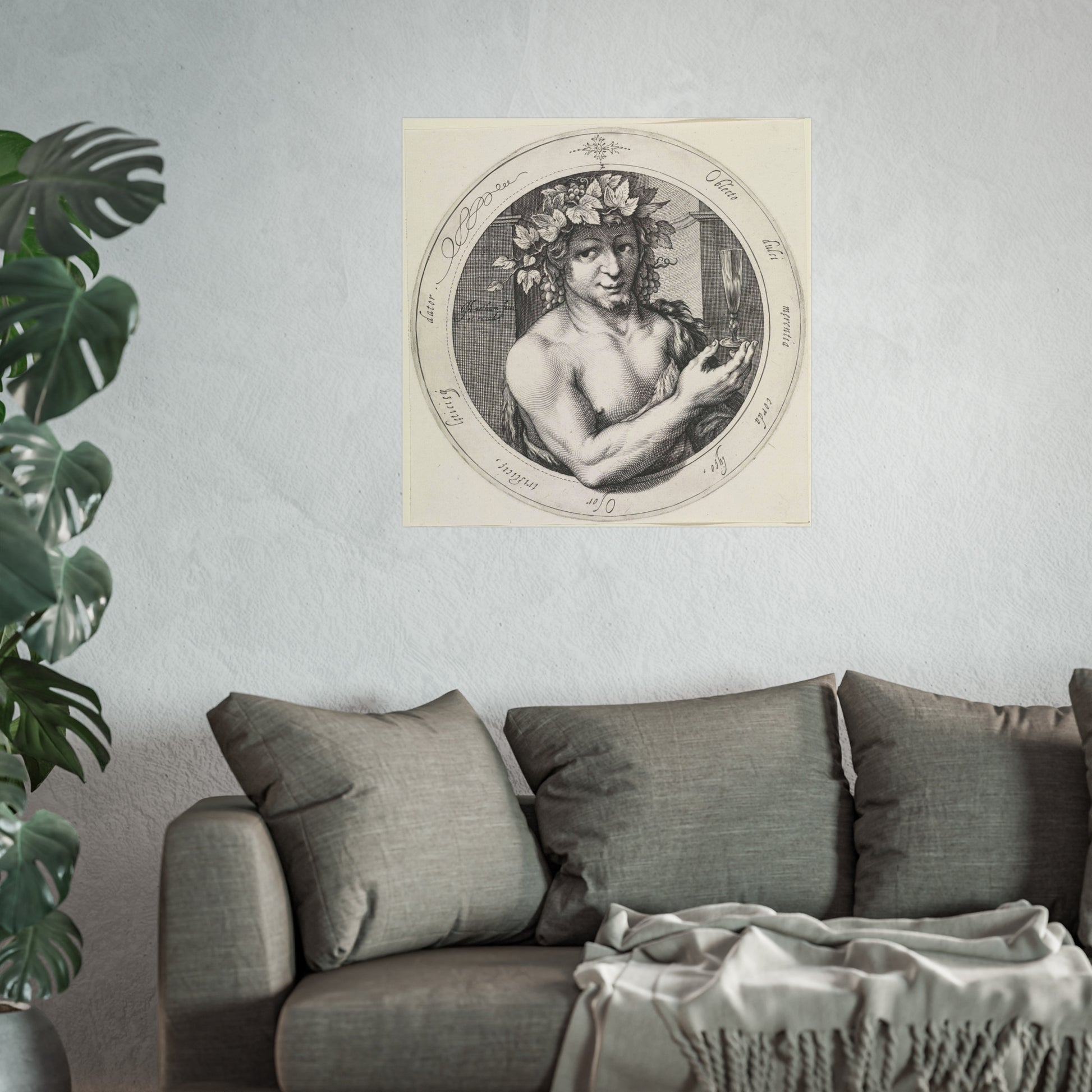 Behold the captivating artwork of Jacob Matham, which showcases Bacchus, the Roman God of wine, merriment, and festivities. He is depicted holding a glass, a symbol of his divine role. The artist's exquisite detailing brings this mythological character to life in a manner that is both intriguing and inspiring.