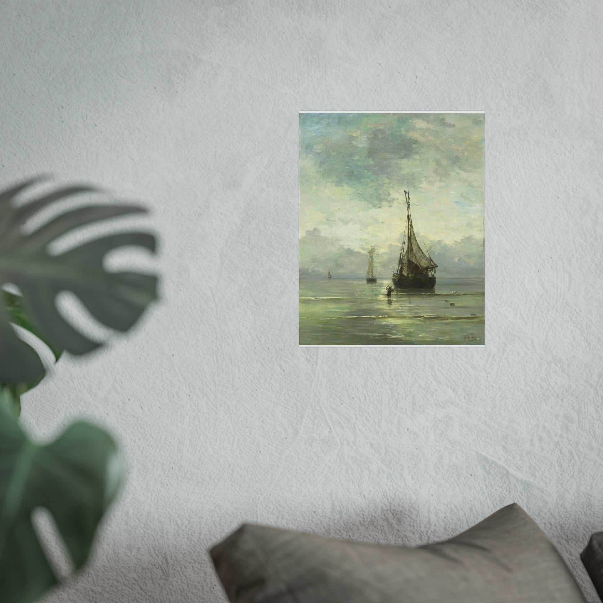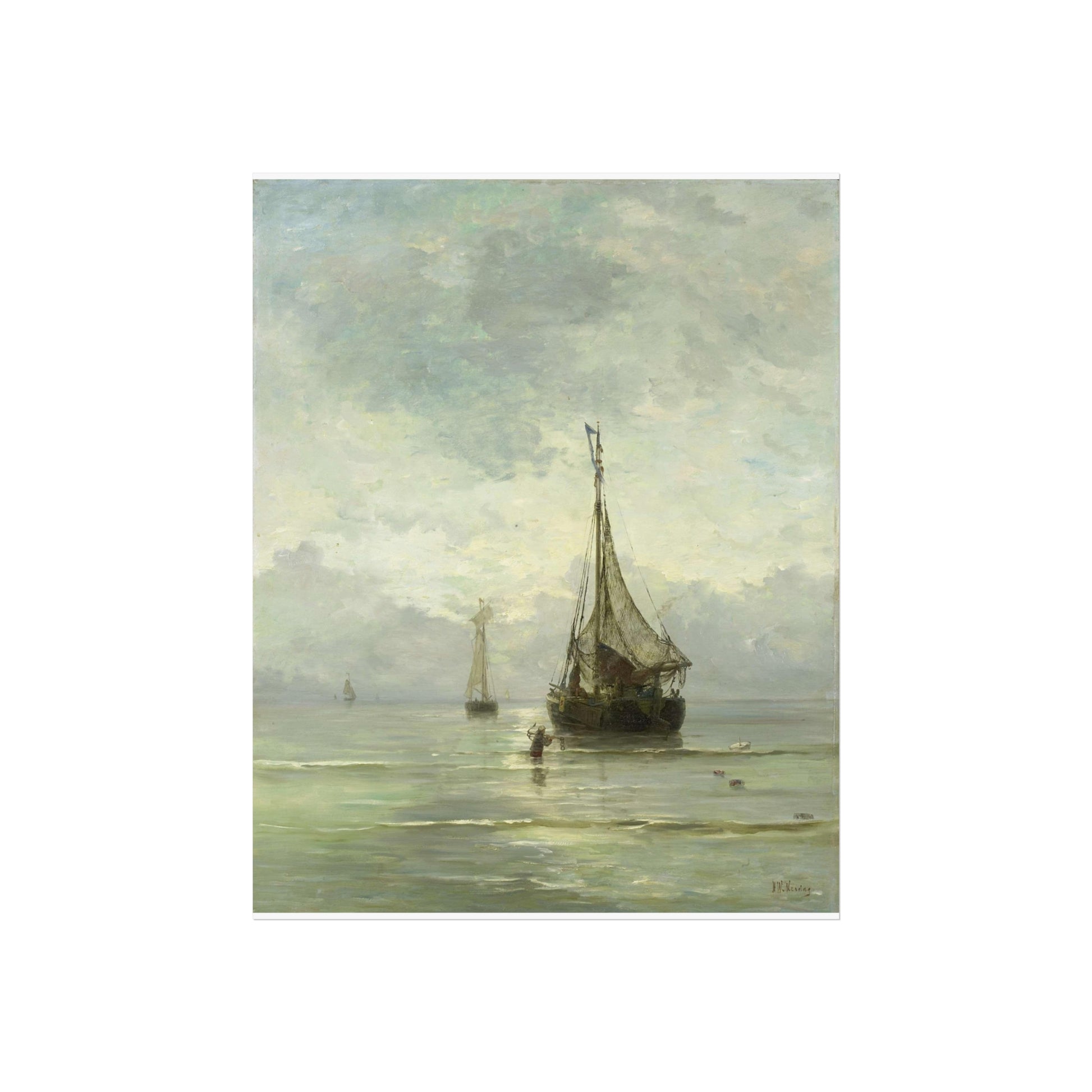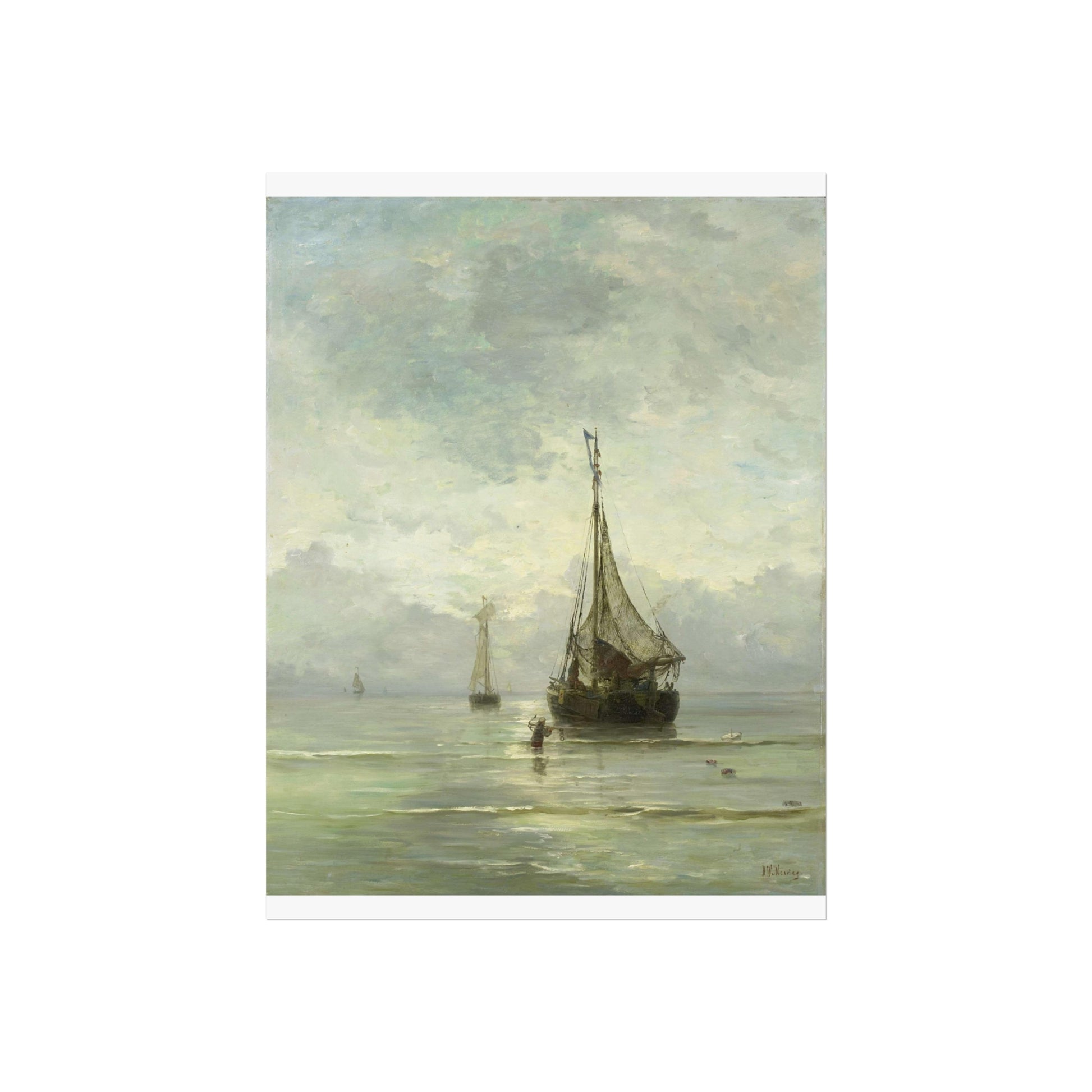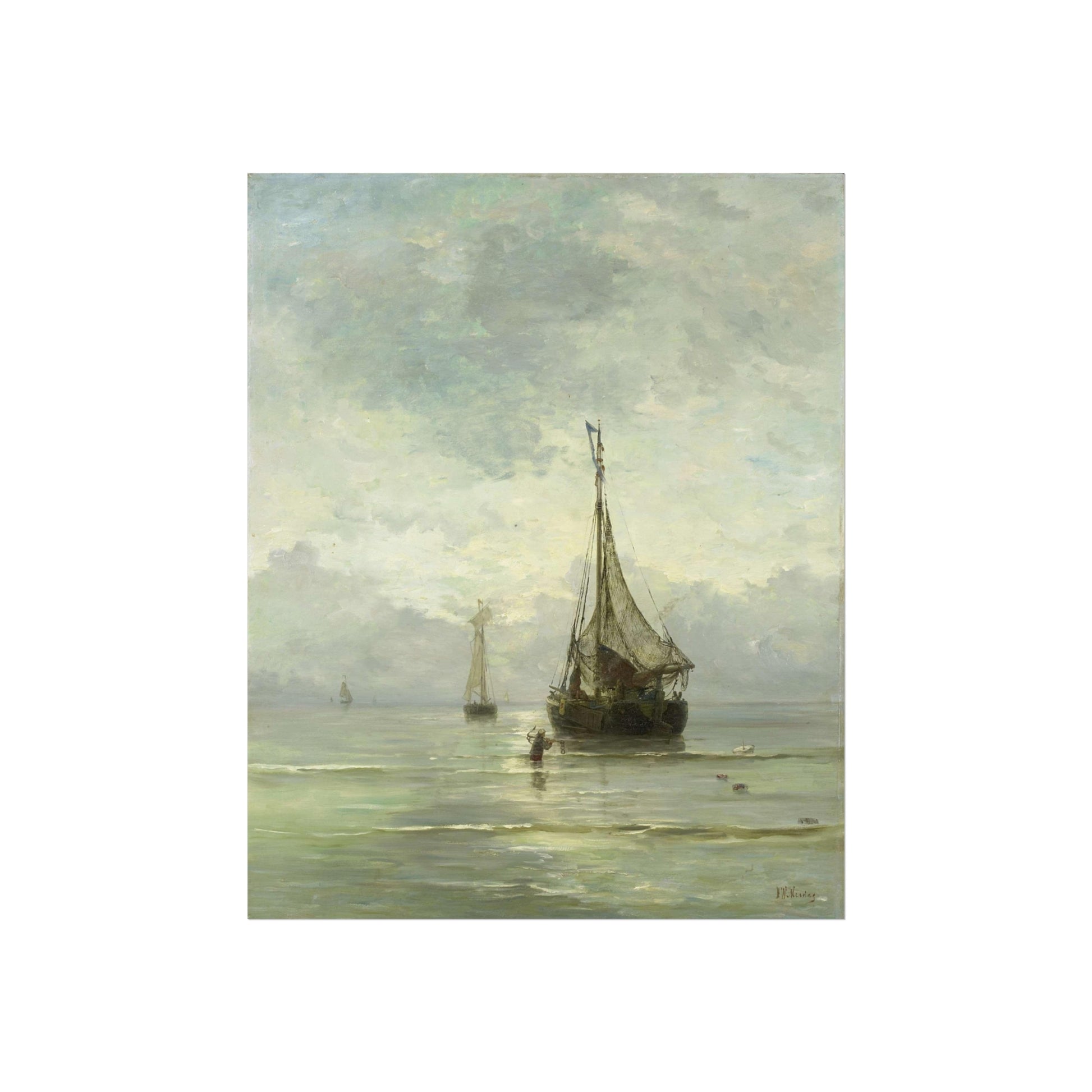 Immerse yourself in the tranquil beauty of a calm sea. Witness fishing boats gently bobbing in the shallow waters near the shore. In the foreground, a man wades through the water, an anchor in hand, adding a touch of human interest to this serene maritime scene.