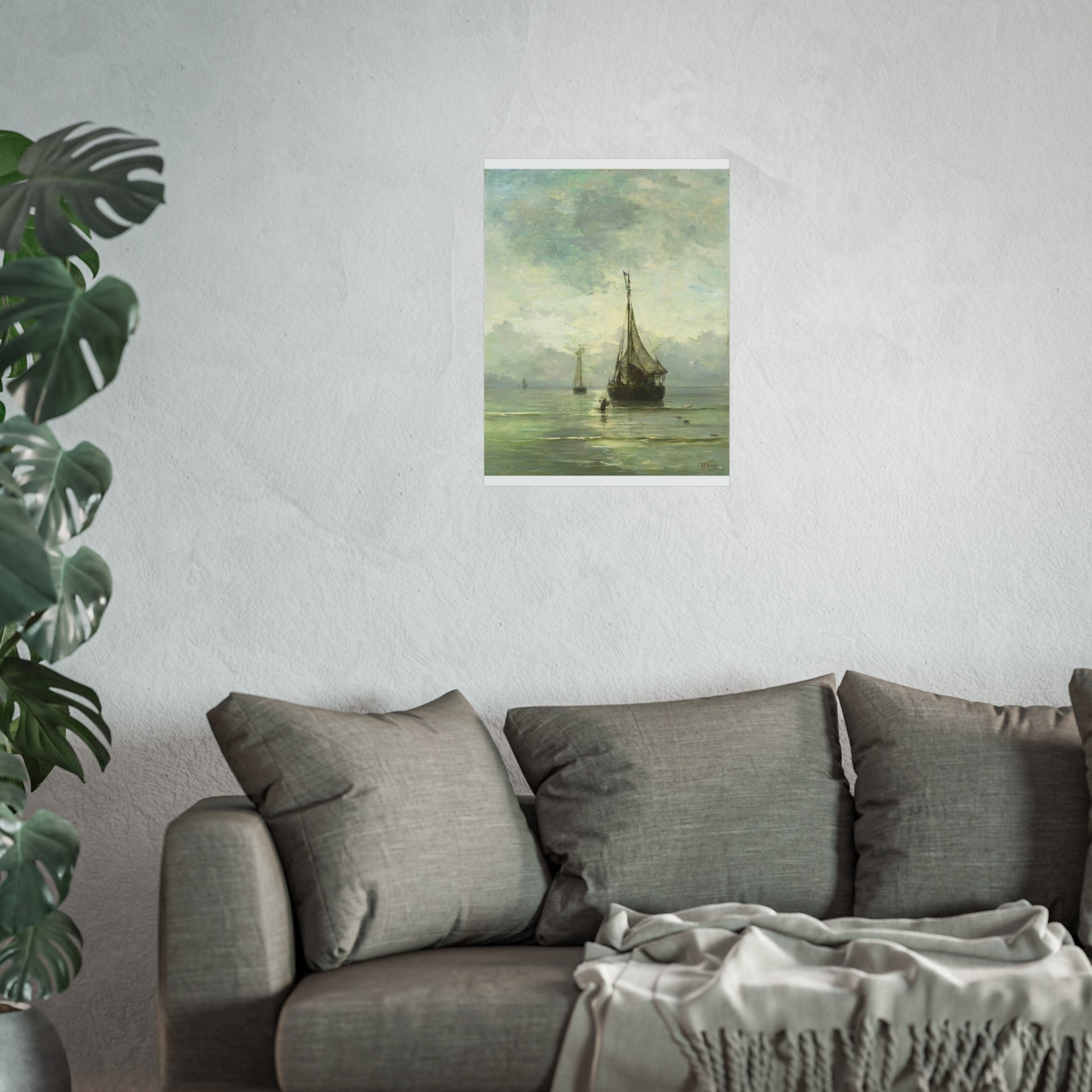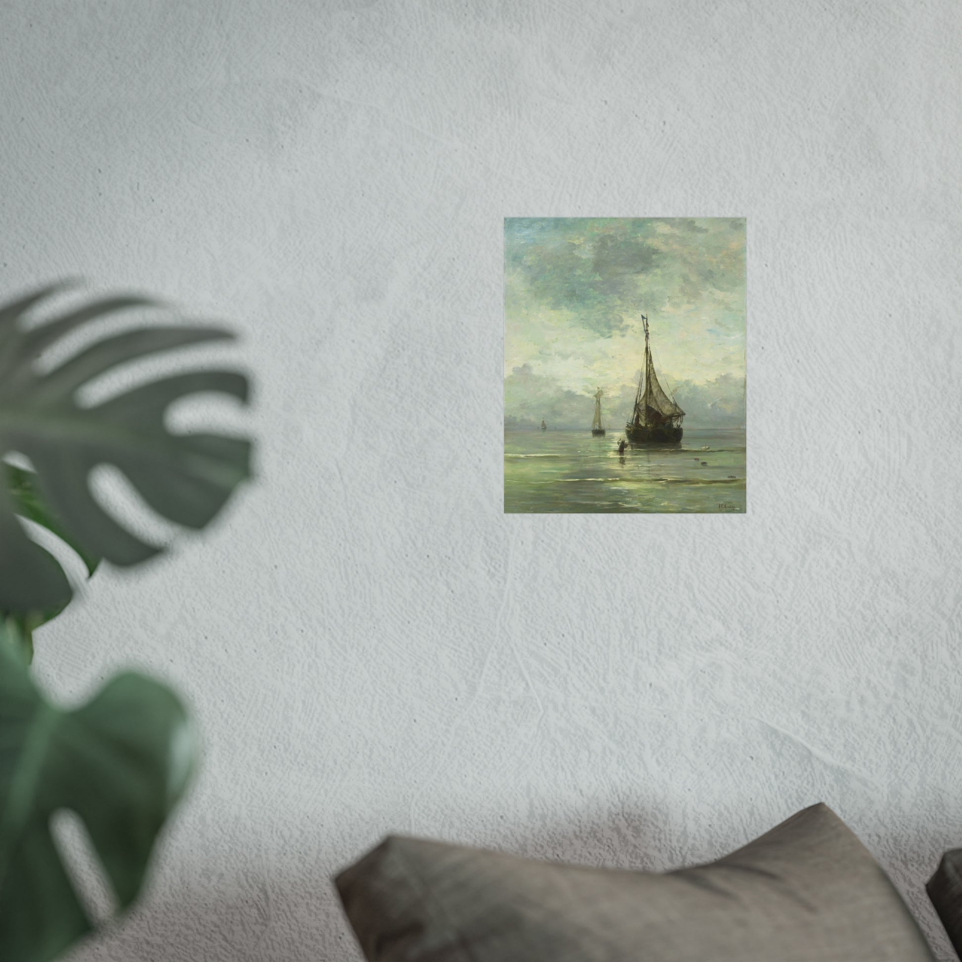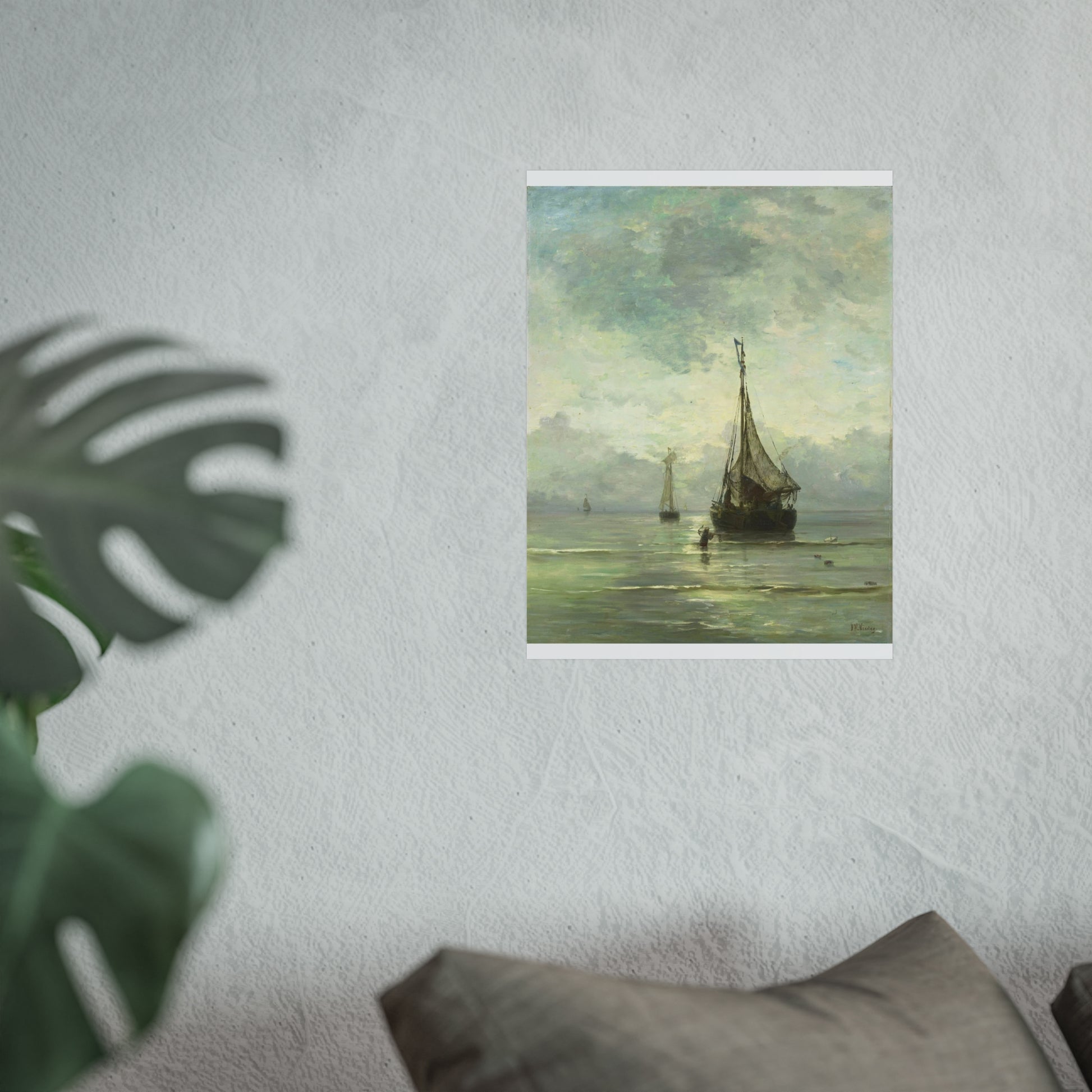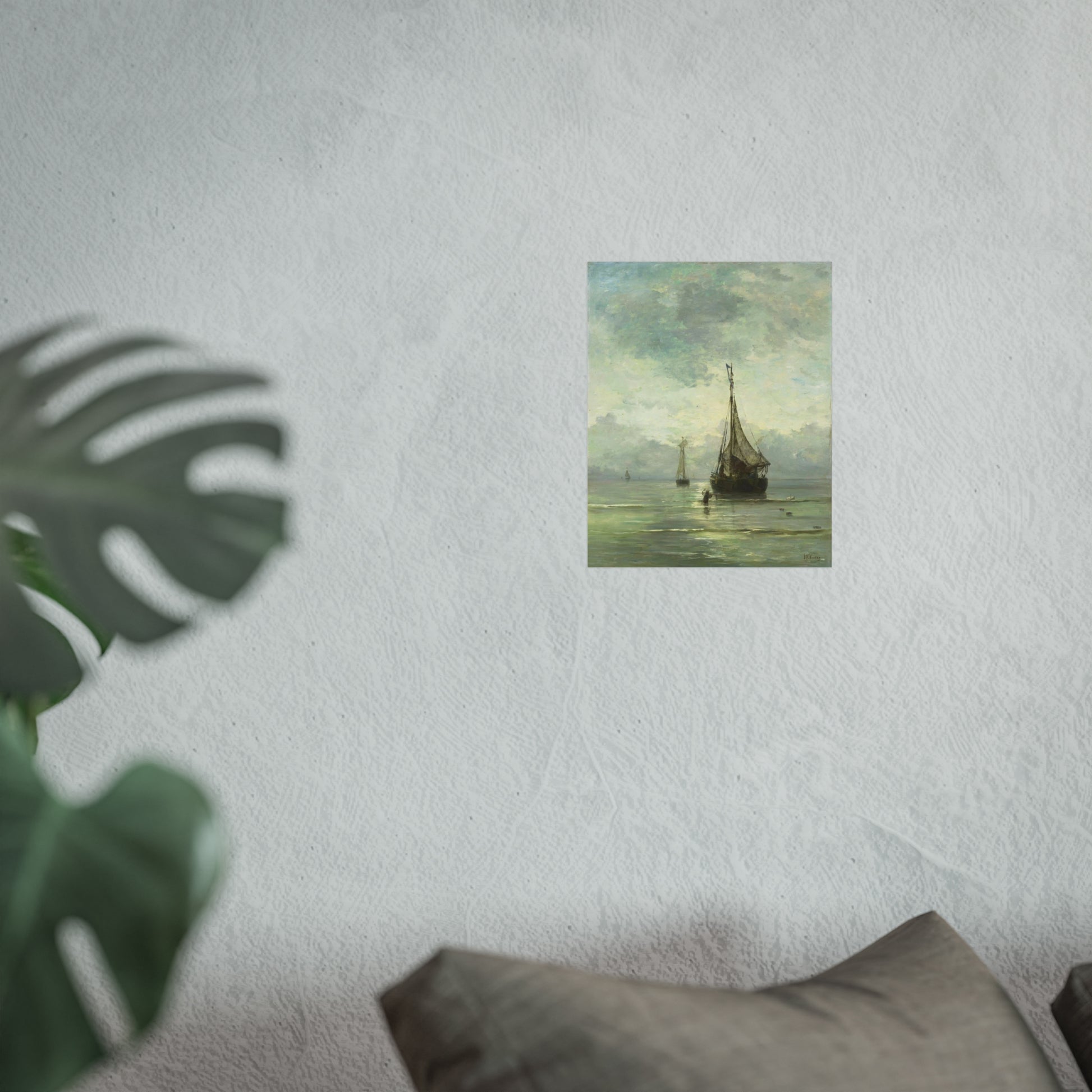 Immerse yourself in the tranquil beauty of a calm sea. Witness fishing boats gently bobbing in the shallow waters near the shore. In the foreground, a man wades through the water, an anchor in hand, adding a touch of human interest to this serene maritime scene.