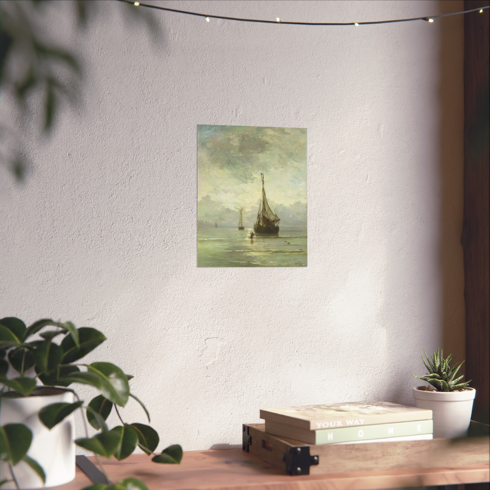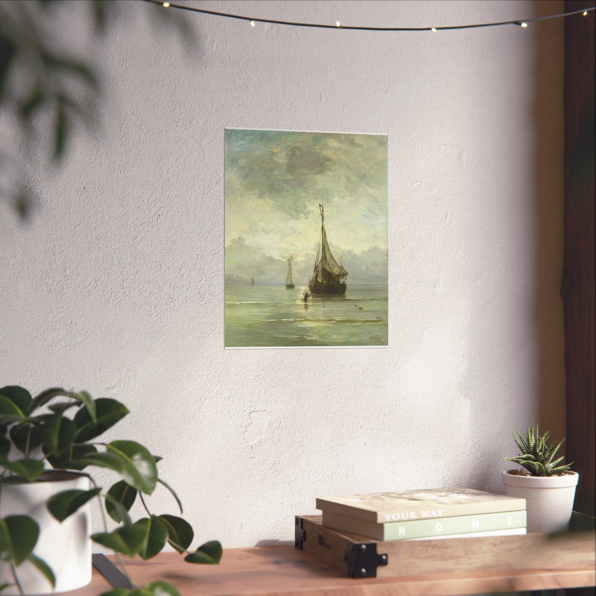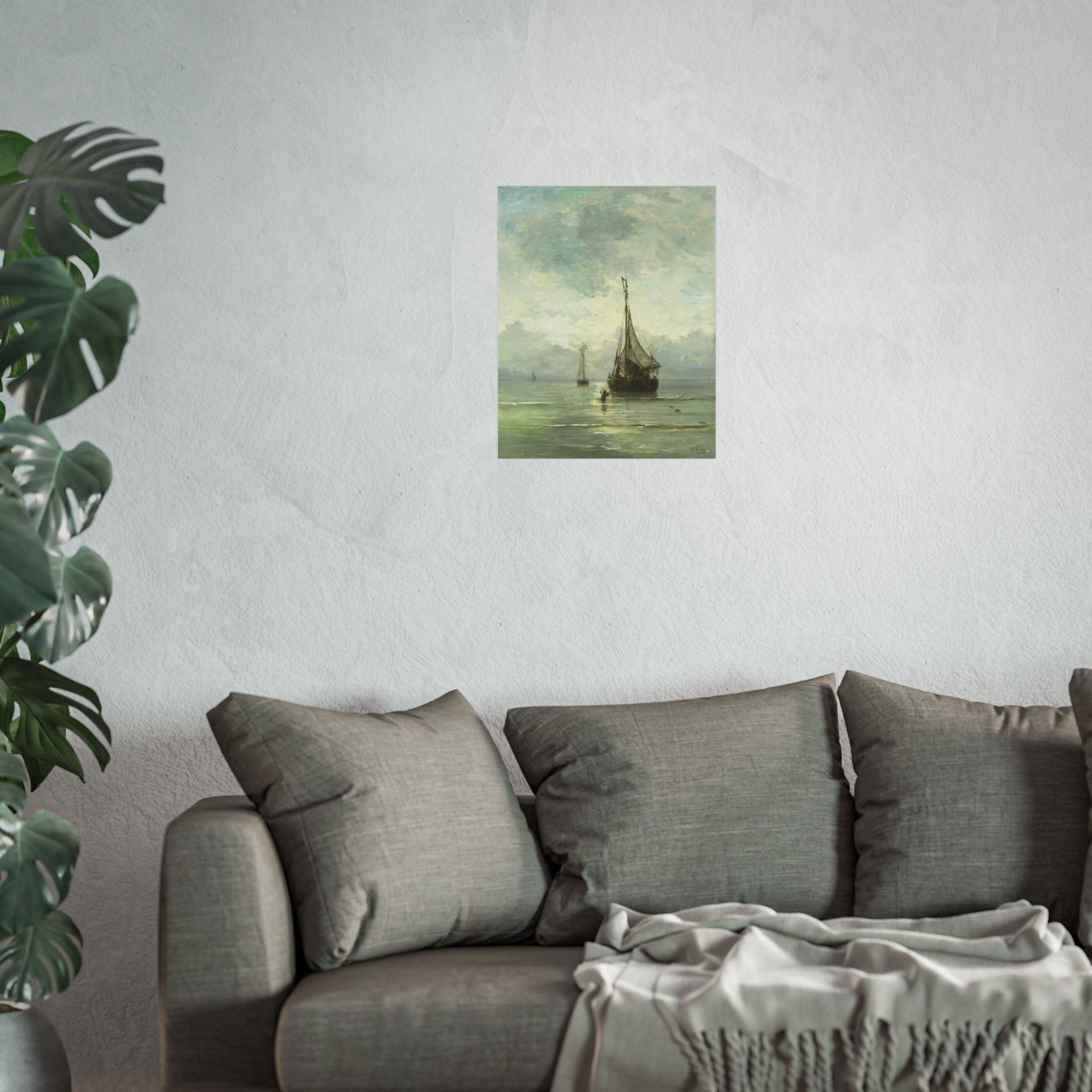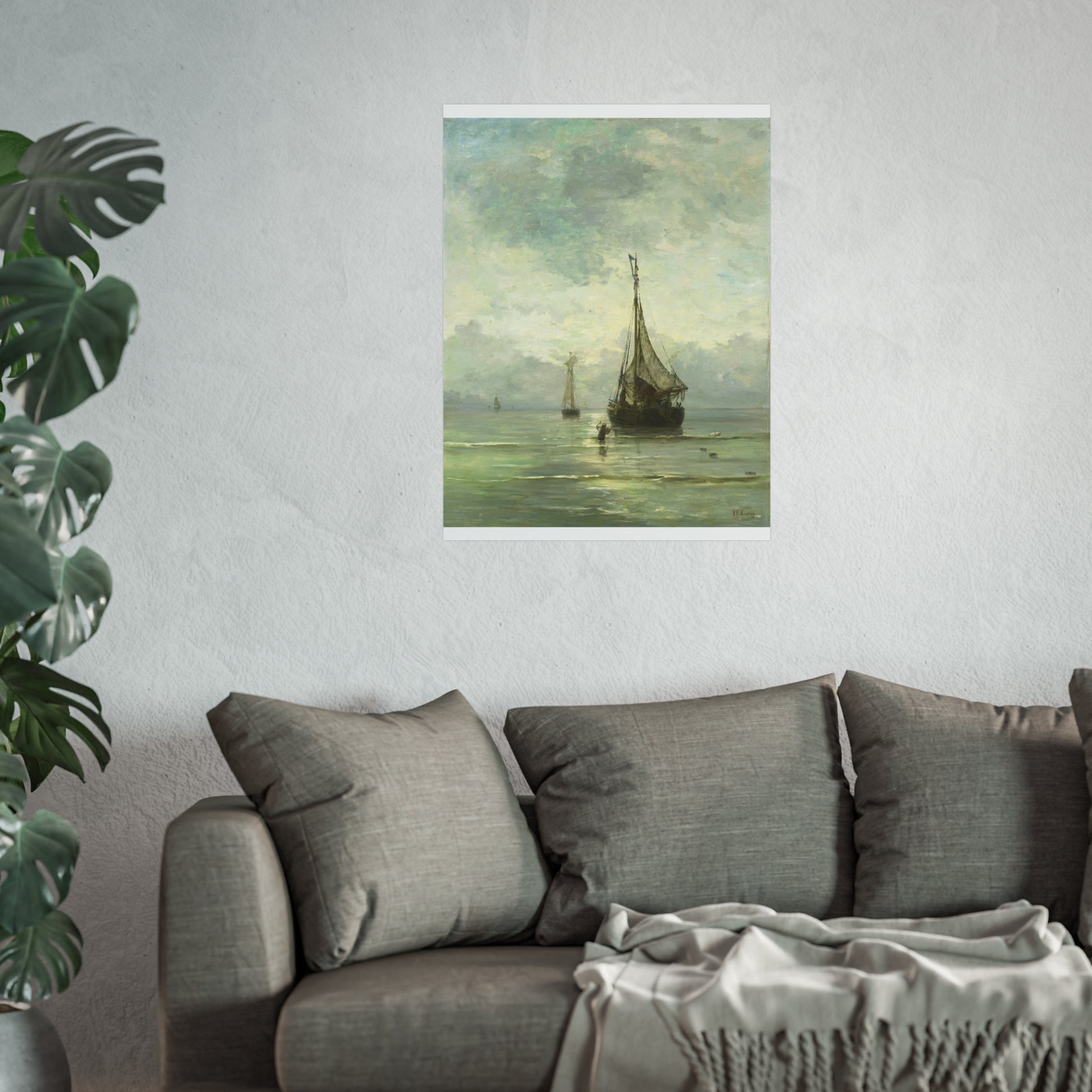Immerse yourself in the tranquil beauty of a calm sea. Witness fishing boats gently bobbing in the shallow waters near the shore. In the foreground, a man wades through the water, an anchor in hand, adding a touch of human interest to this serene maritime scene.