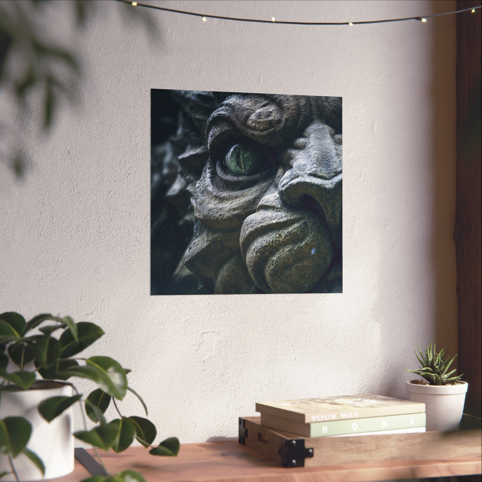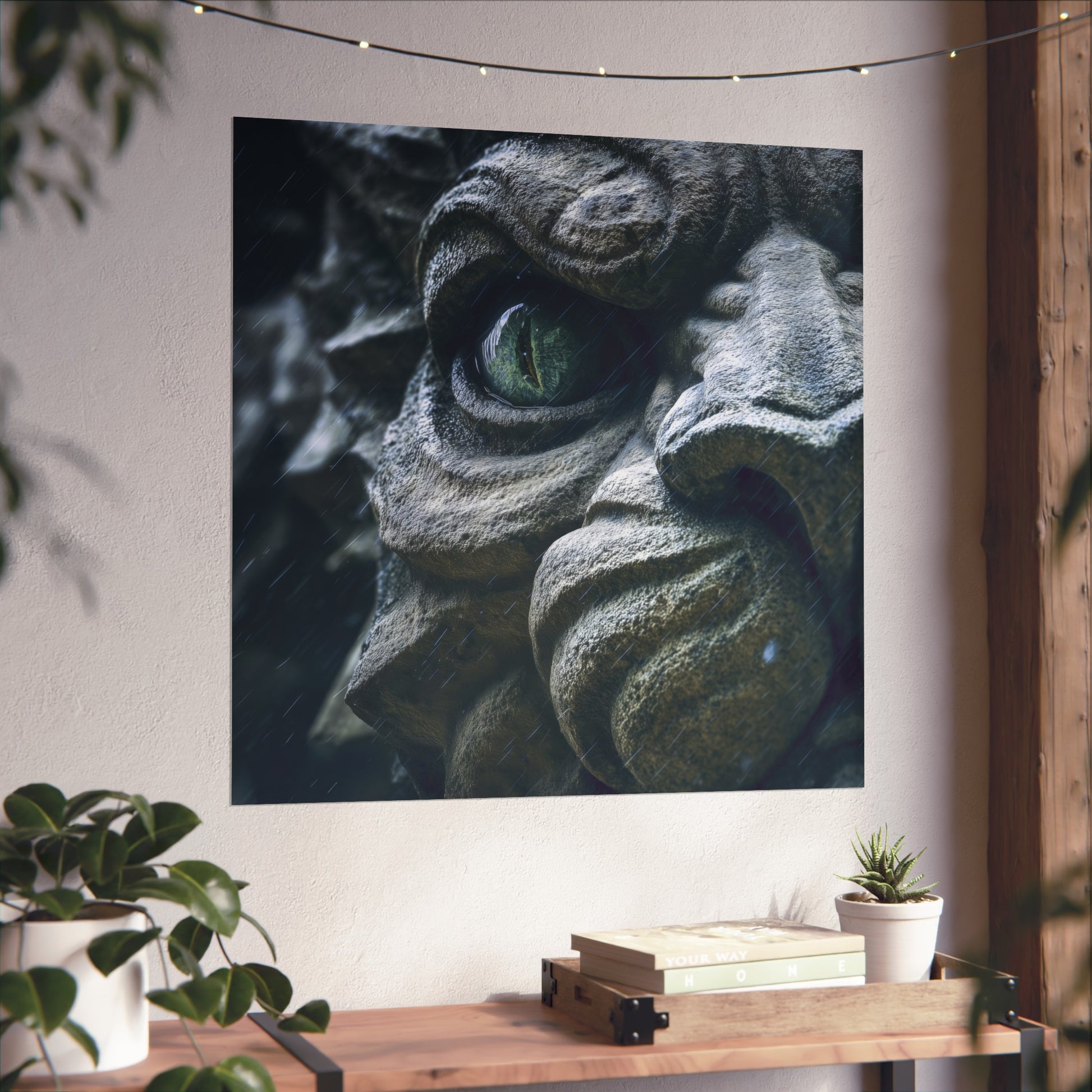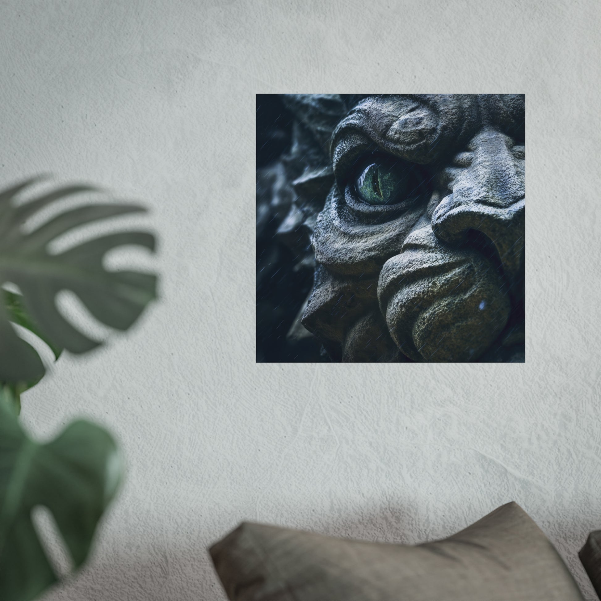 The rain-slicked surface reveals extraordinary detail: every crack, every erosion mark, every fierce feature carved by medieval artisans. The dramatic side lighting creates deep shadows that emphasize the creature's powerful form, while raindrops catch the light like jewels on ancient stone. The storm setting amplifies the atmospheric tension, creating a piece that's both historically evocative and viscerally captivating.