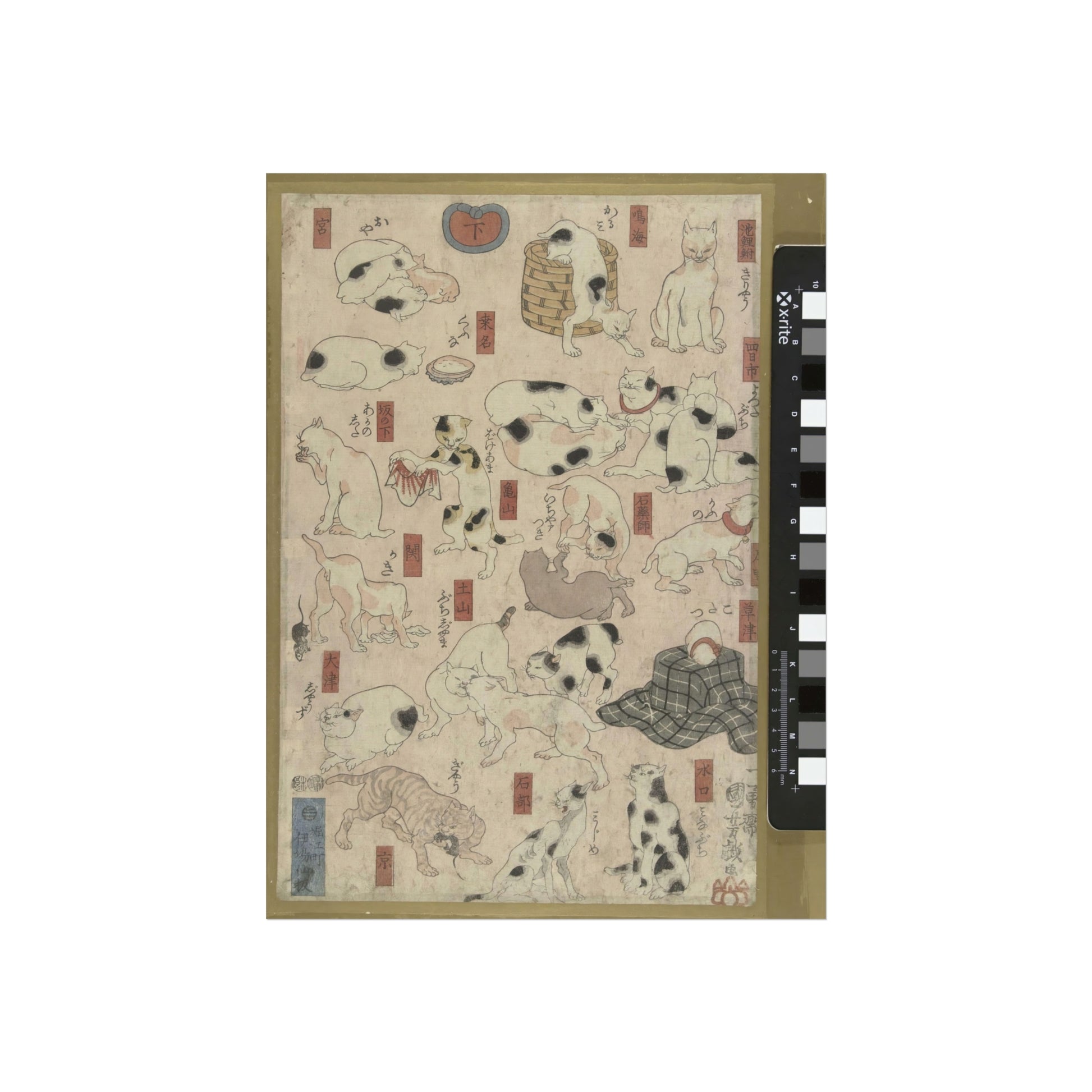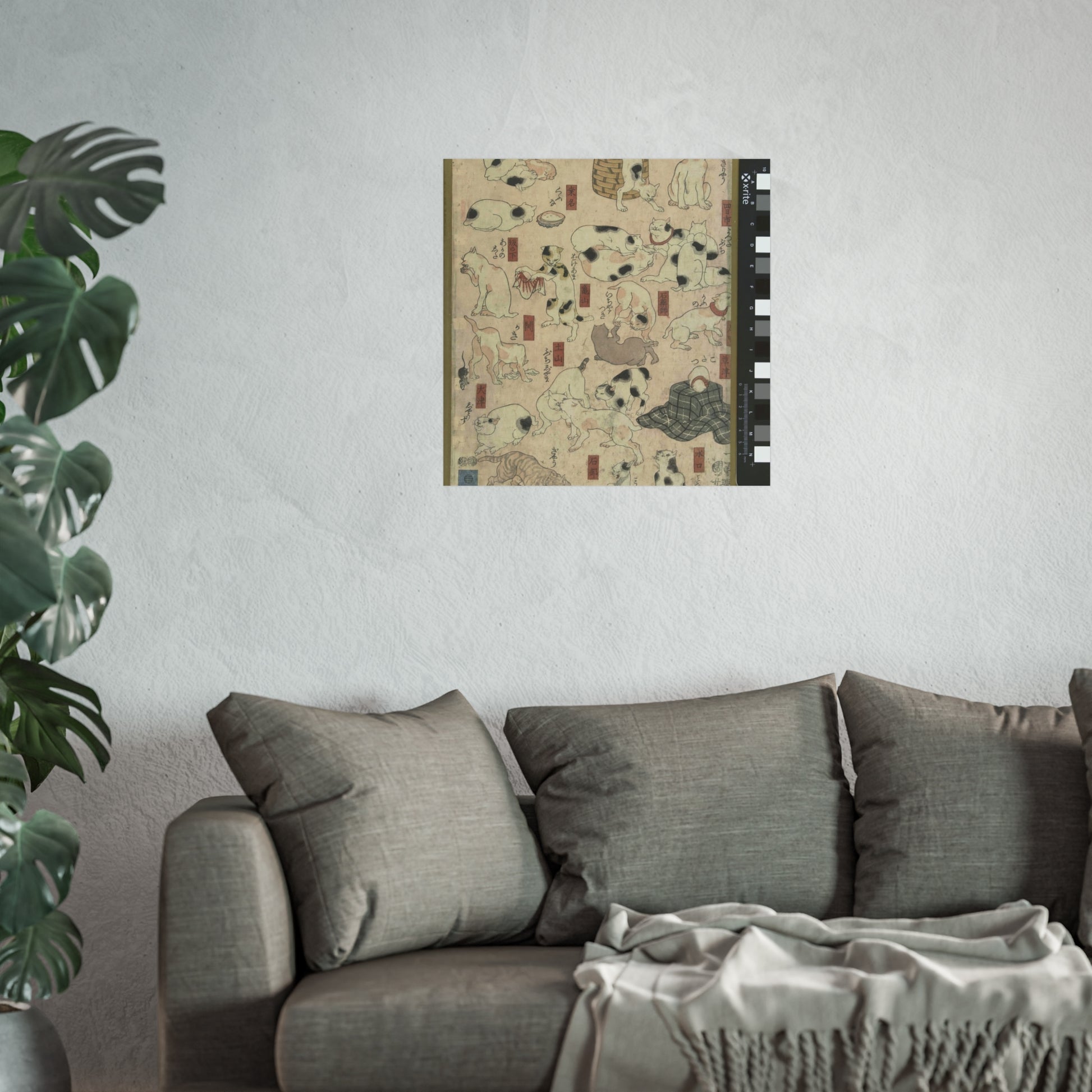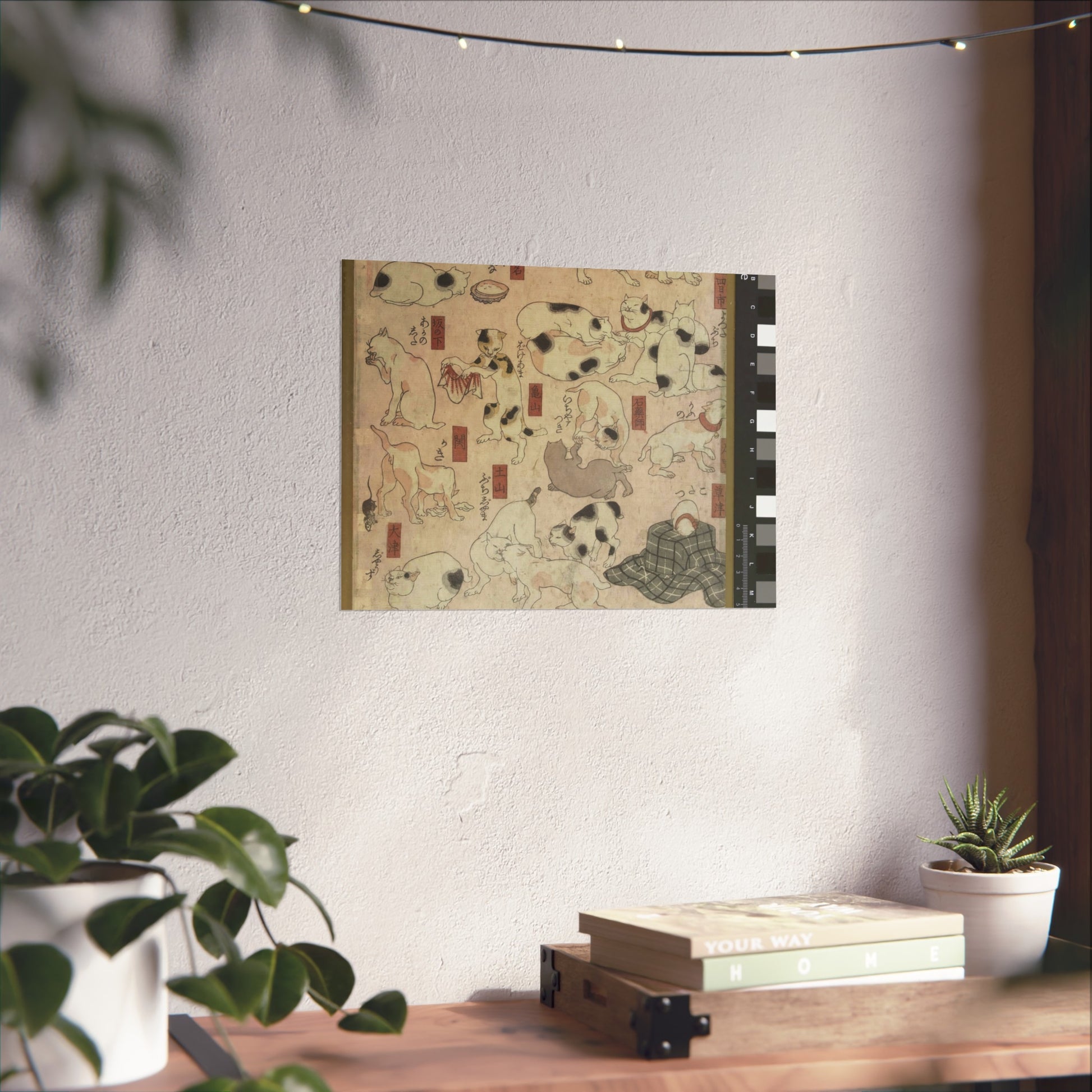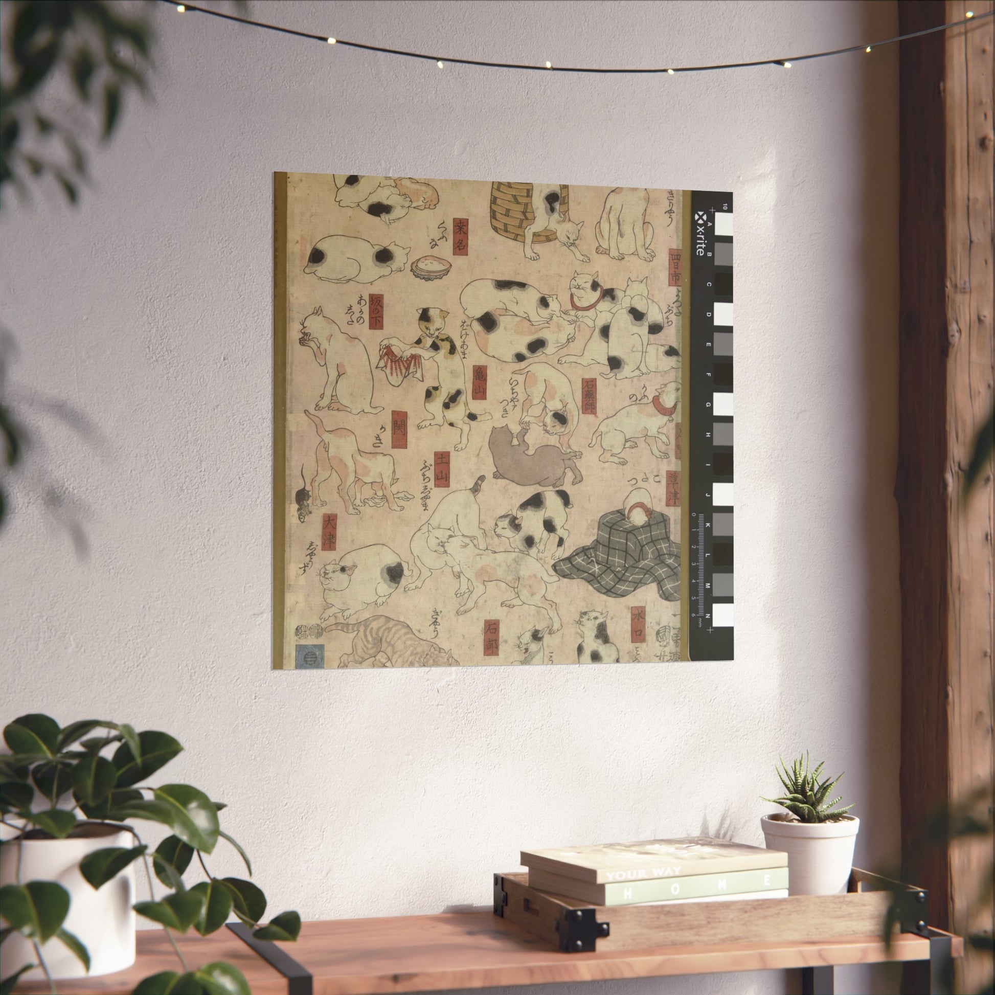A captivating series of cats in various poses, each accompanied by red cartouches displaying the names of stations along the Tokaido road. This artwork is a playful homage to the famous journey from Edo to Kyoto, featuring felines that bring a whimsical charm to each station's name., The painting 'Cats for the 53 Stations of the Tokaido' by Utagawa Kuniyoshi showcases an imaginative interpretation of the traditional Tokaido series. Each cat represents a different station, making this piece both unique and delightful., Utagawa Kuniyoshi's artistic brilliance shines through in this piece, where he combines his love for cats with the iconic Tokaido route. The detailed expressions and varied poses of the cats add an element of humor and creativity to this historical theme., This artwork is not just a visual treat but also a cultural journey, blending Japanese folklore with Kuniyoshi’s distinctive style. It’s perfect for art lovers who appreciate a mix of history and playfulness., Kuniyoshi’s 'Cats for the 53 Stations of the Tokaido' is an engaging piece that draws viewers into a world where cats take center stage in a historical context. It's a testament to the artist's ability to infuse traditional subjects with his unique, whimsical approach., An enchanting depiction where each cat is meticulously drawn to reflect the essence of its corresponding station on the Tokaido road. This piece by Utagawa Kuniyoshi is a fusion of artistry, humor, and cultural significance.