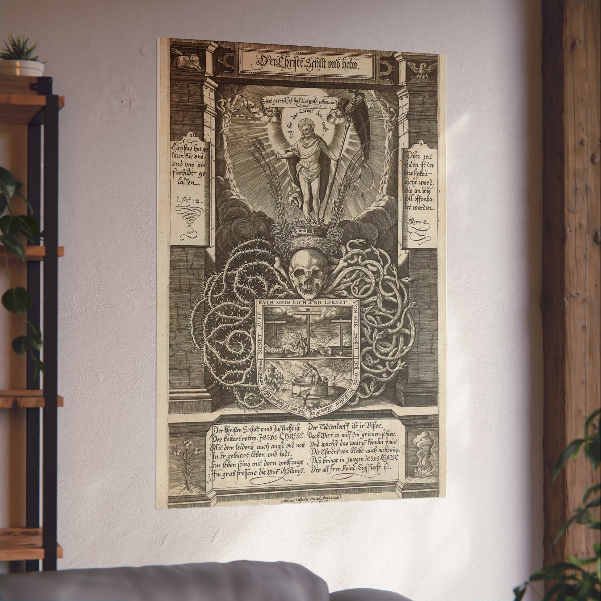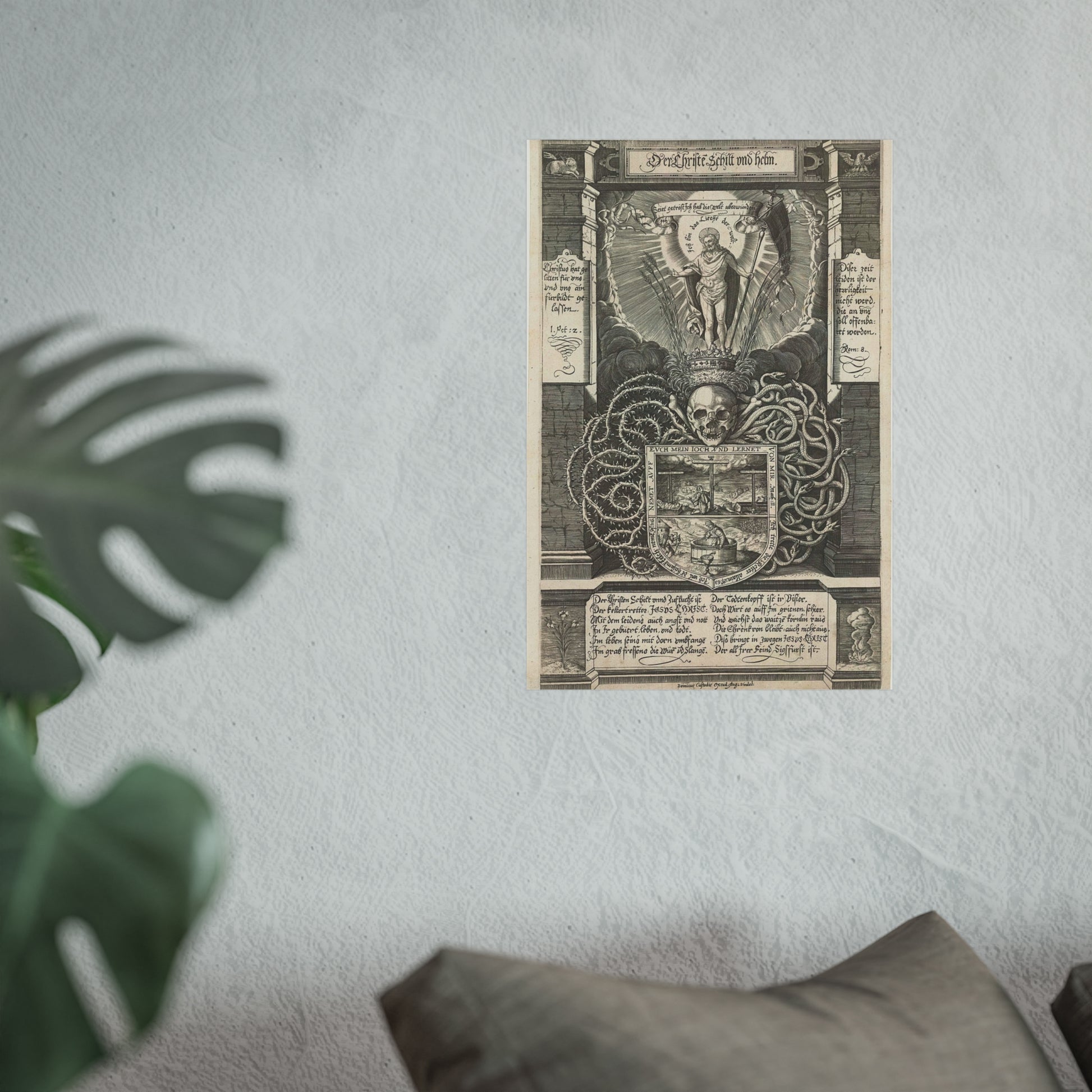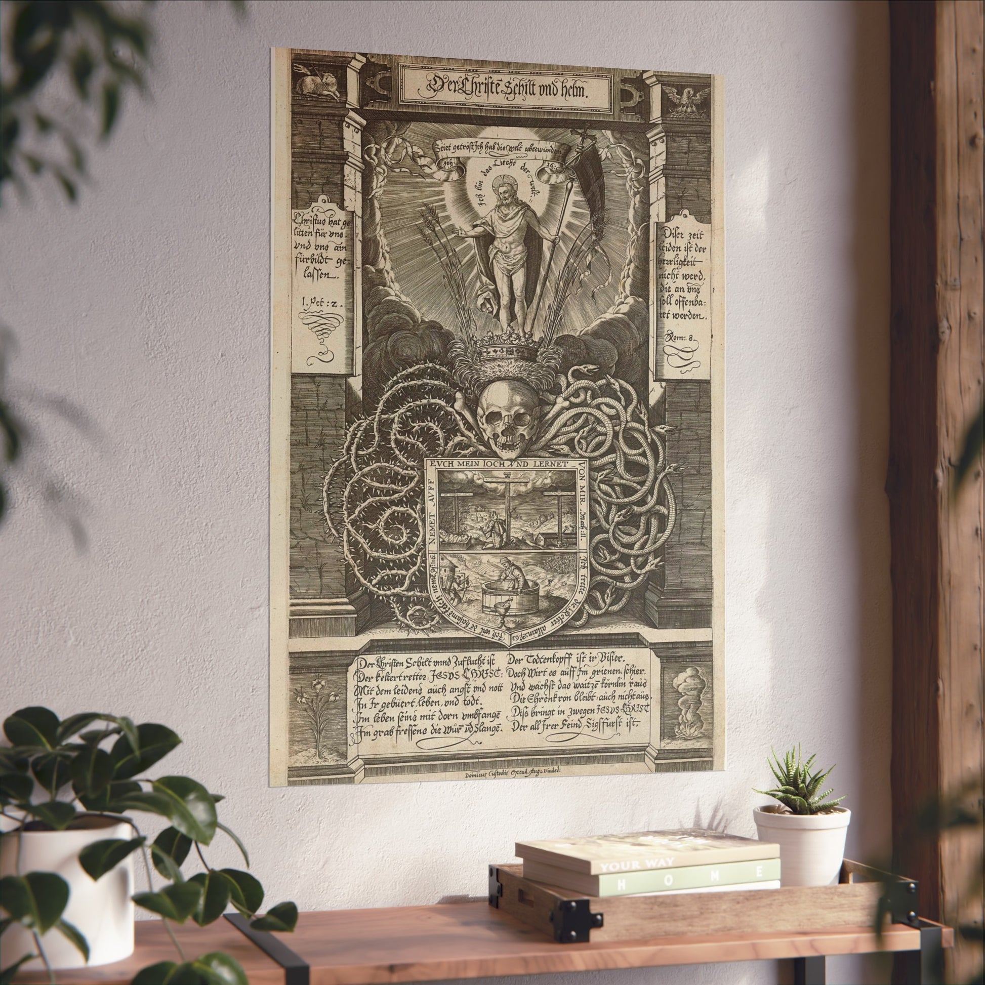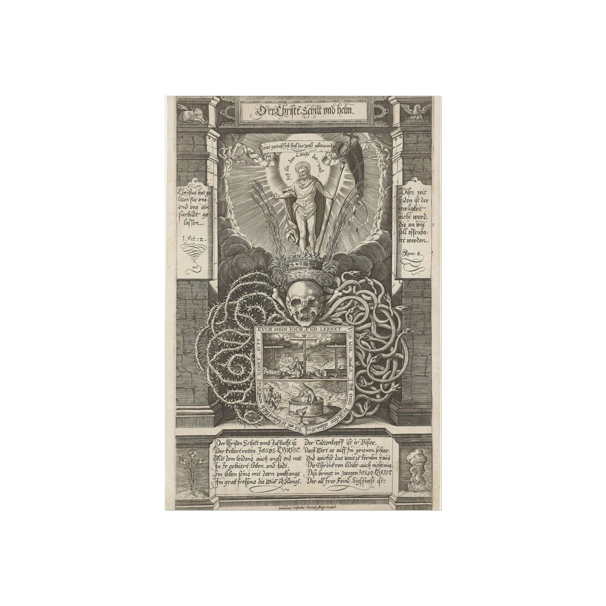 This captivating artwork portrays Christ, symbolizing the light of the world, standing on a crown adorned with ears of corn, which conceals a skull. Beneath the skull are branches of thorns and serpents, adding an element of danger and mystery. At the center of the piece, a shield bearing the image of three crosses and a man inside a wine barrel draws the viewer's attention. Accompanying explanatory texts add depth to the narrative.