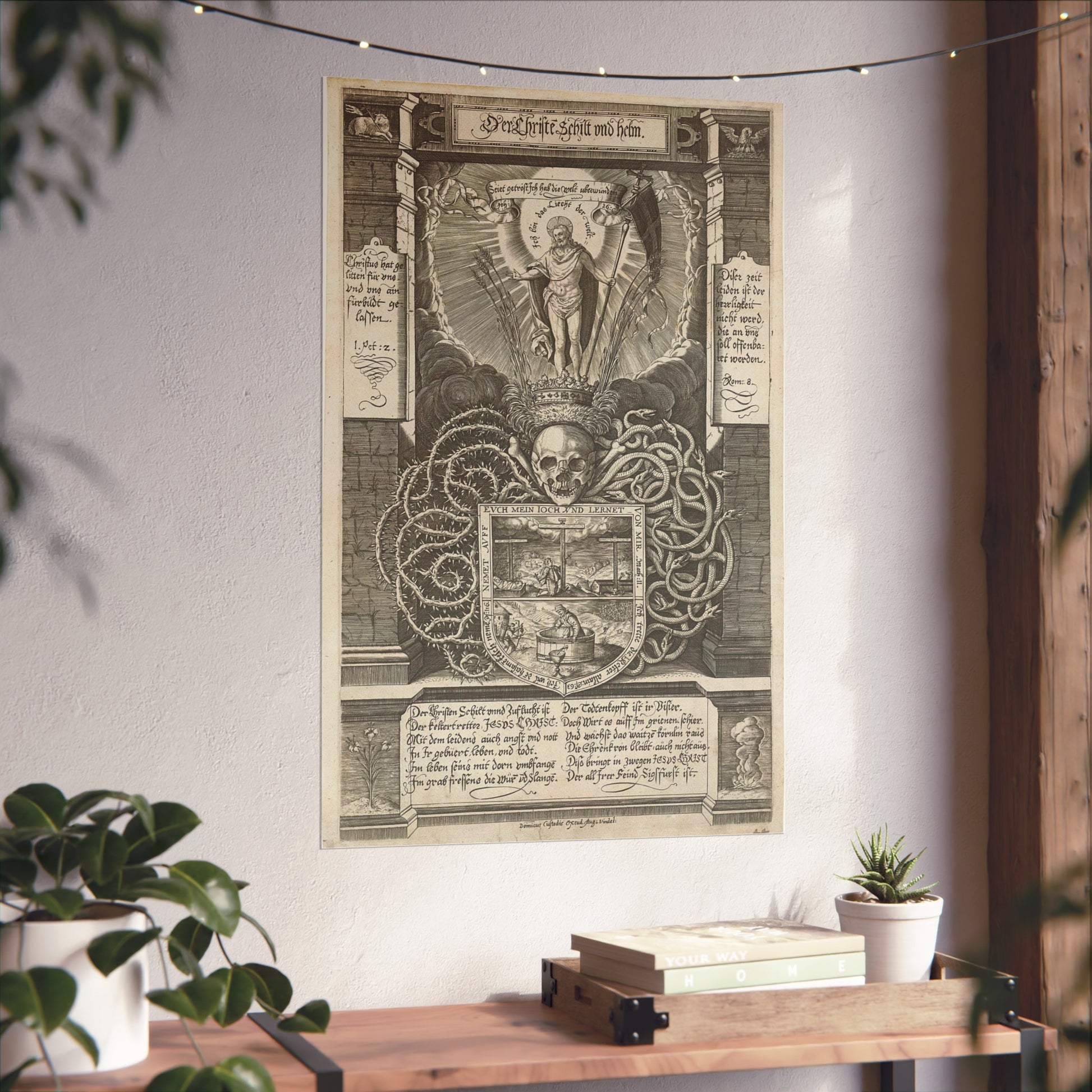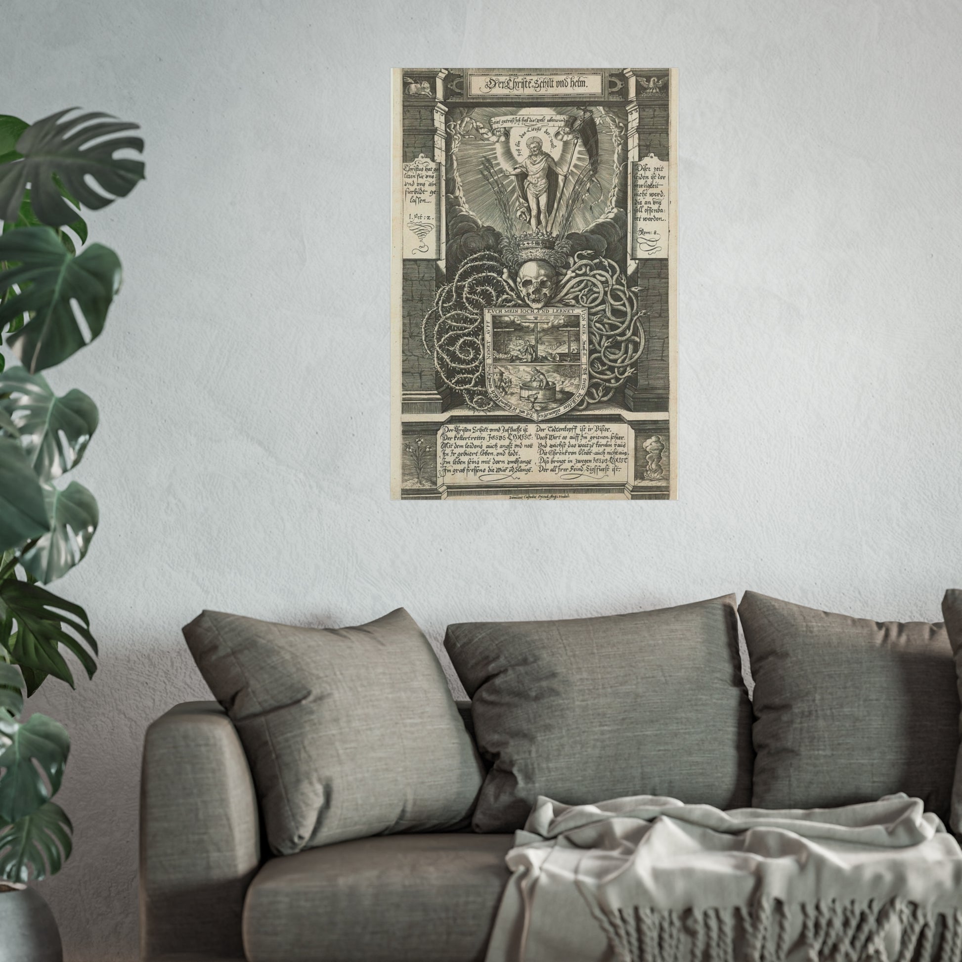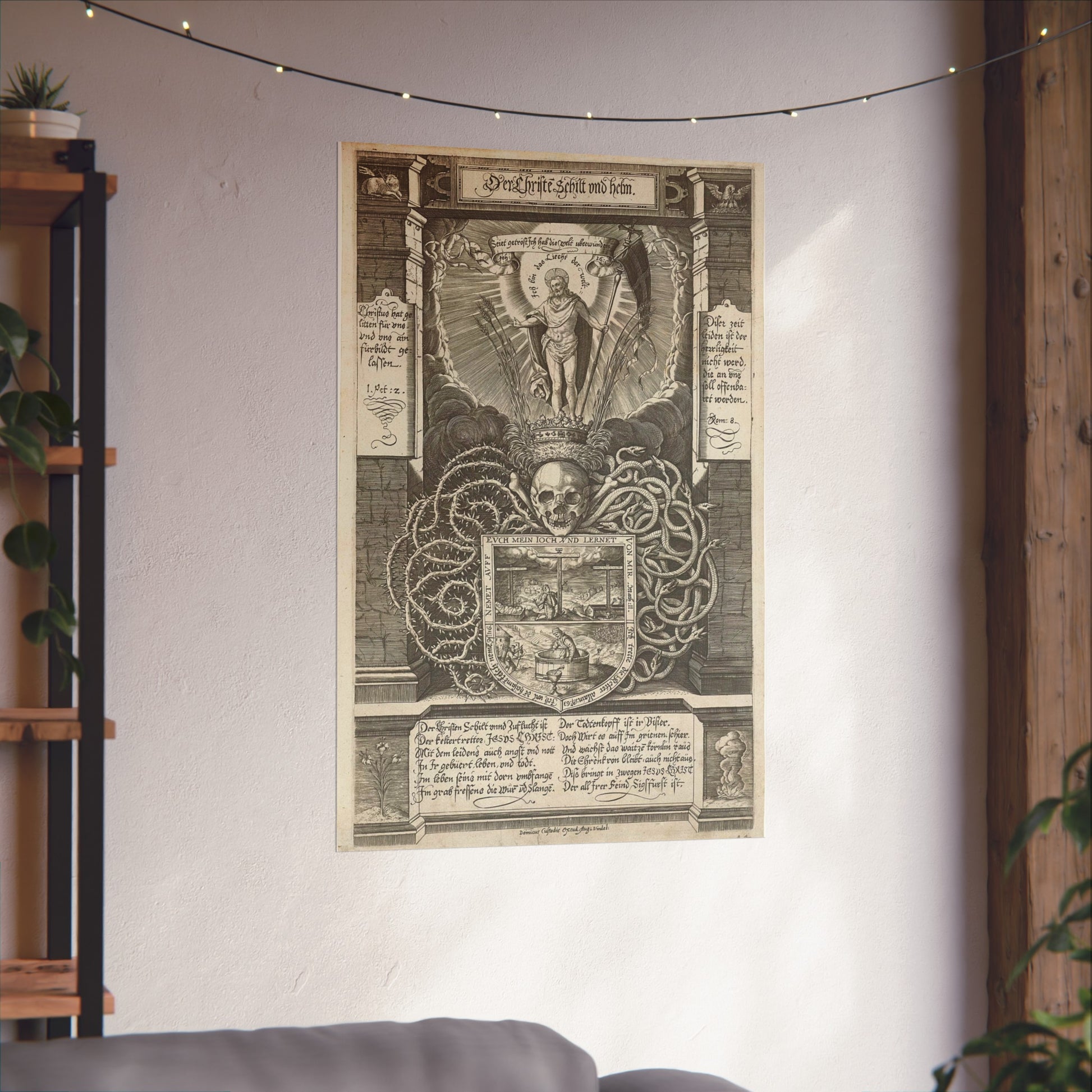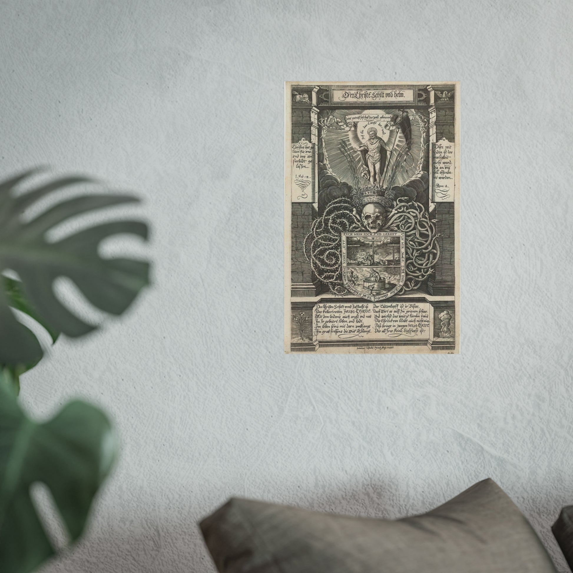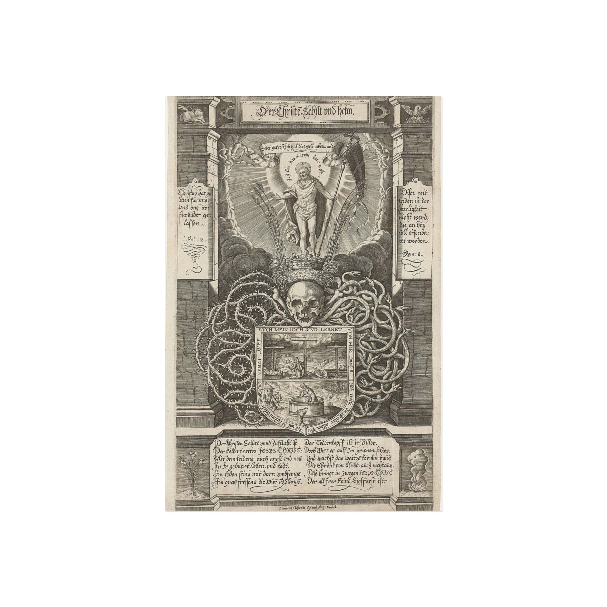 This captivating artwork portrays Christ, symbolizing the light of the world, standing on a crown adorned with ears of corn, which conceals a skull. Beneath the skull are branches of thorns and serpents, adding an element of danger and mystery. At the center of the piece, a shield bearing the image of three crosses and a man inside a wine barrel draws the viewer's attention. Accompanying explanatory texts add depth to the narrative.