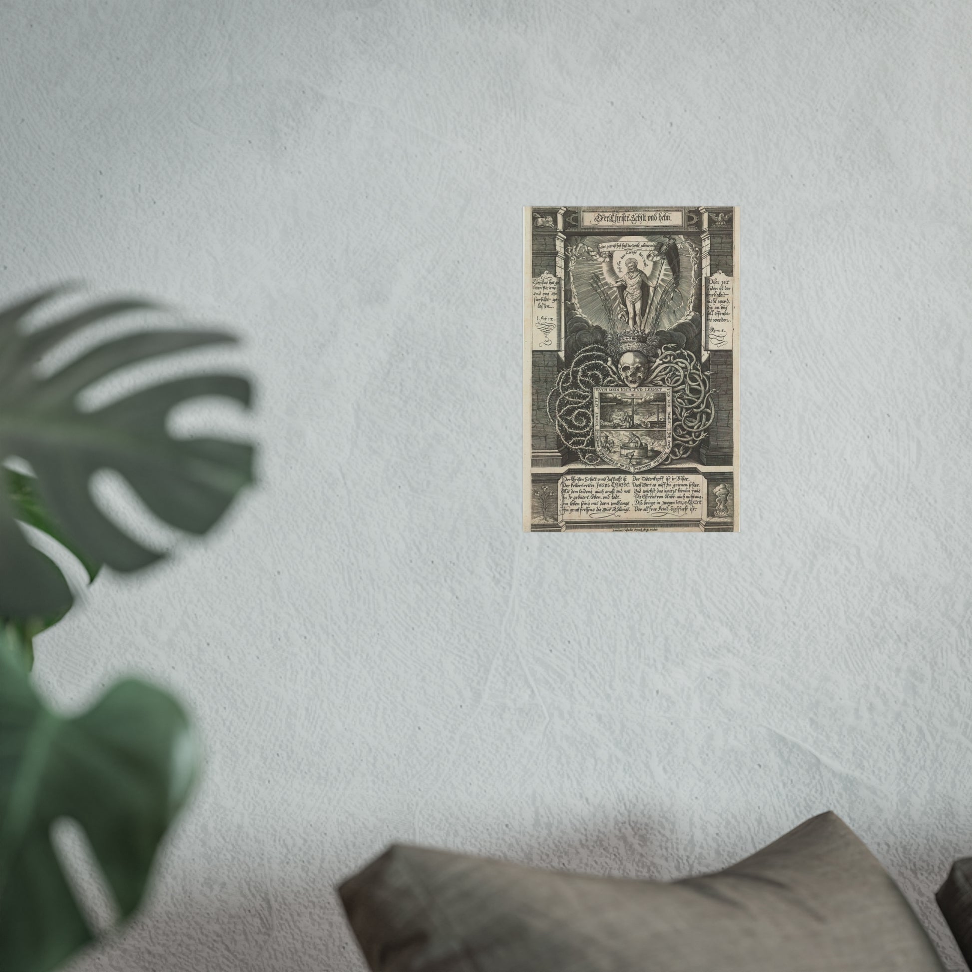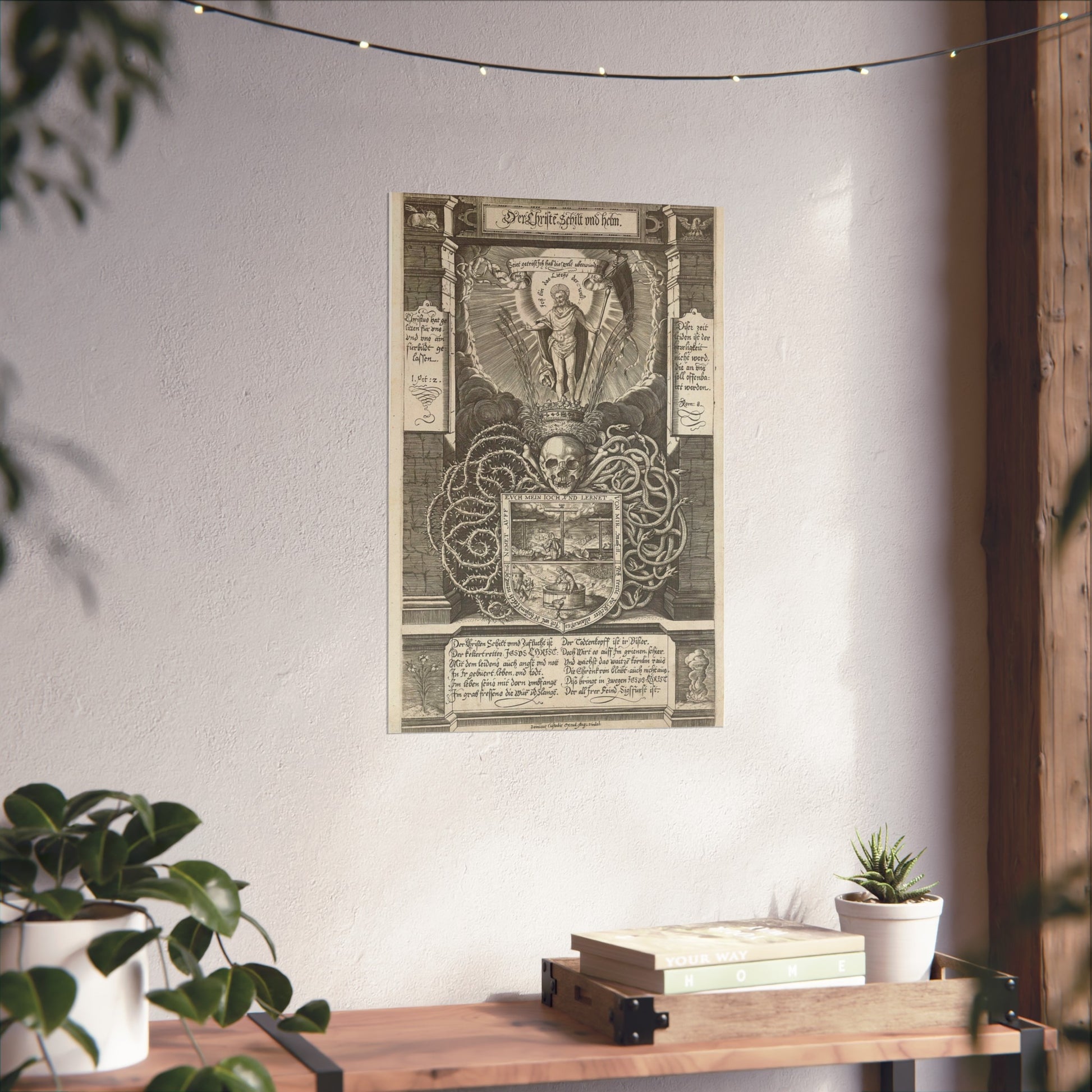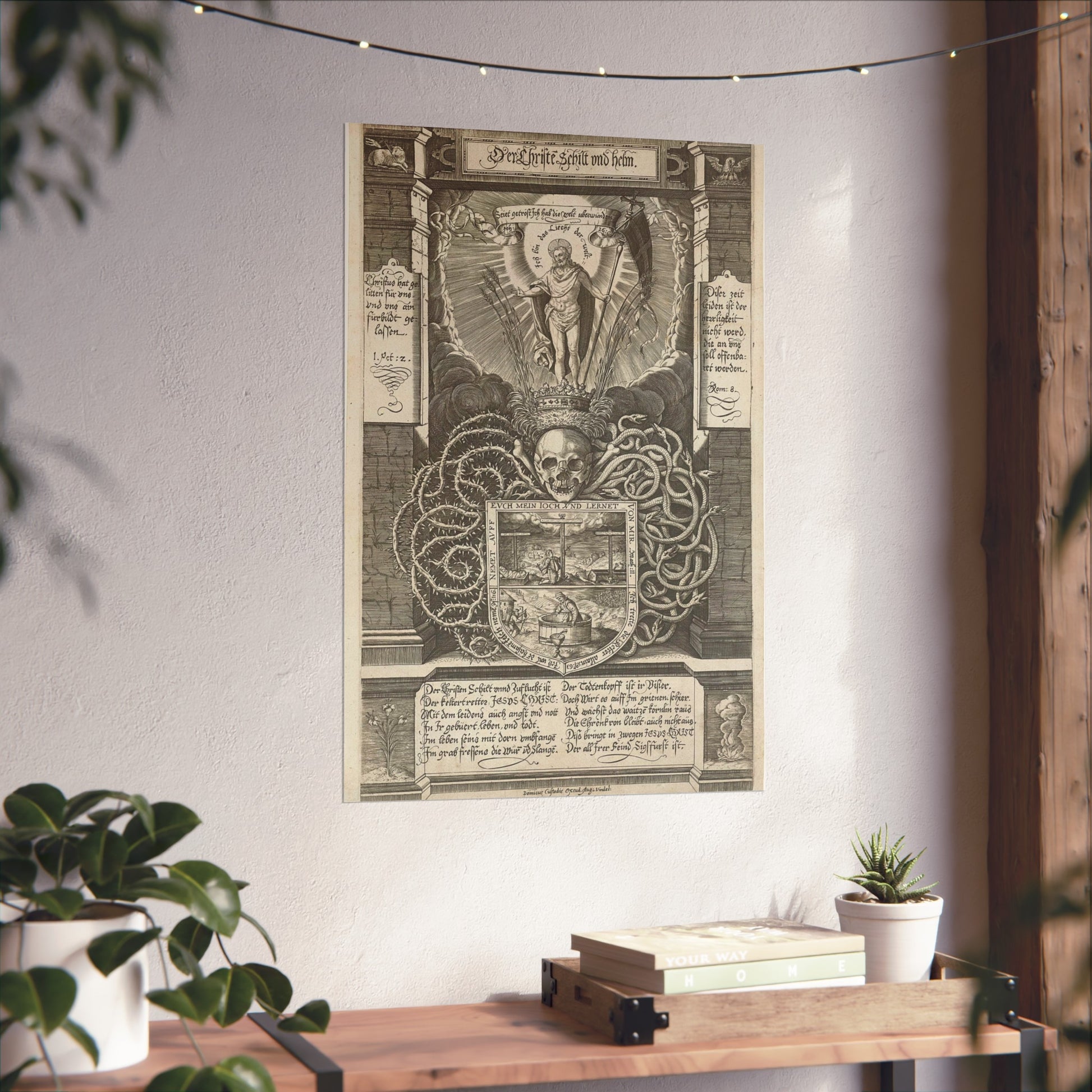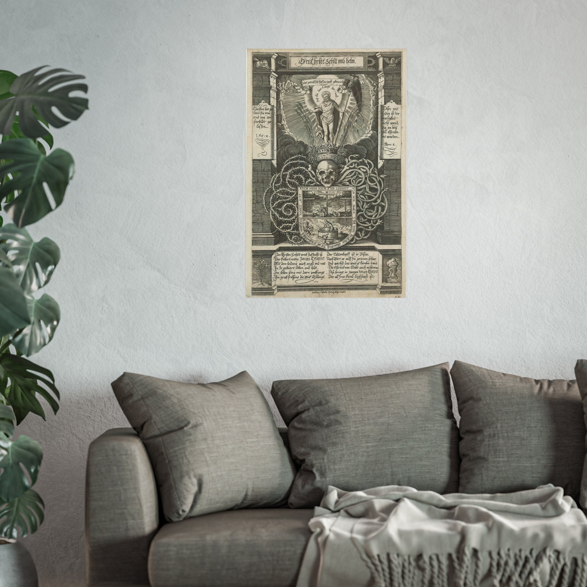 This captivating artwork portrays Christ, symbolizing the light of the world, standing on a crown adorned with ears of corn, which conceals a skull. Beneath the skull are branches of thorns and serpents, adding an element of danger and mystery. At the center of the piece, a shield bearing the image of three crosses and a man inside a wine barrel draws the viewer's attention. Accompanying explanatory texts add depth to the narrative.