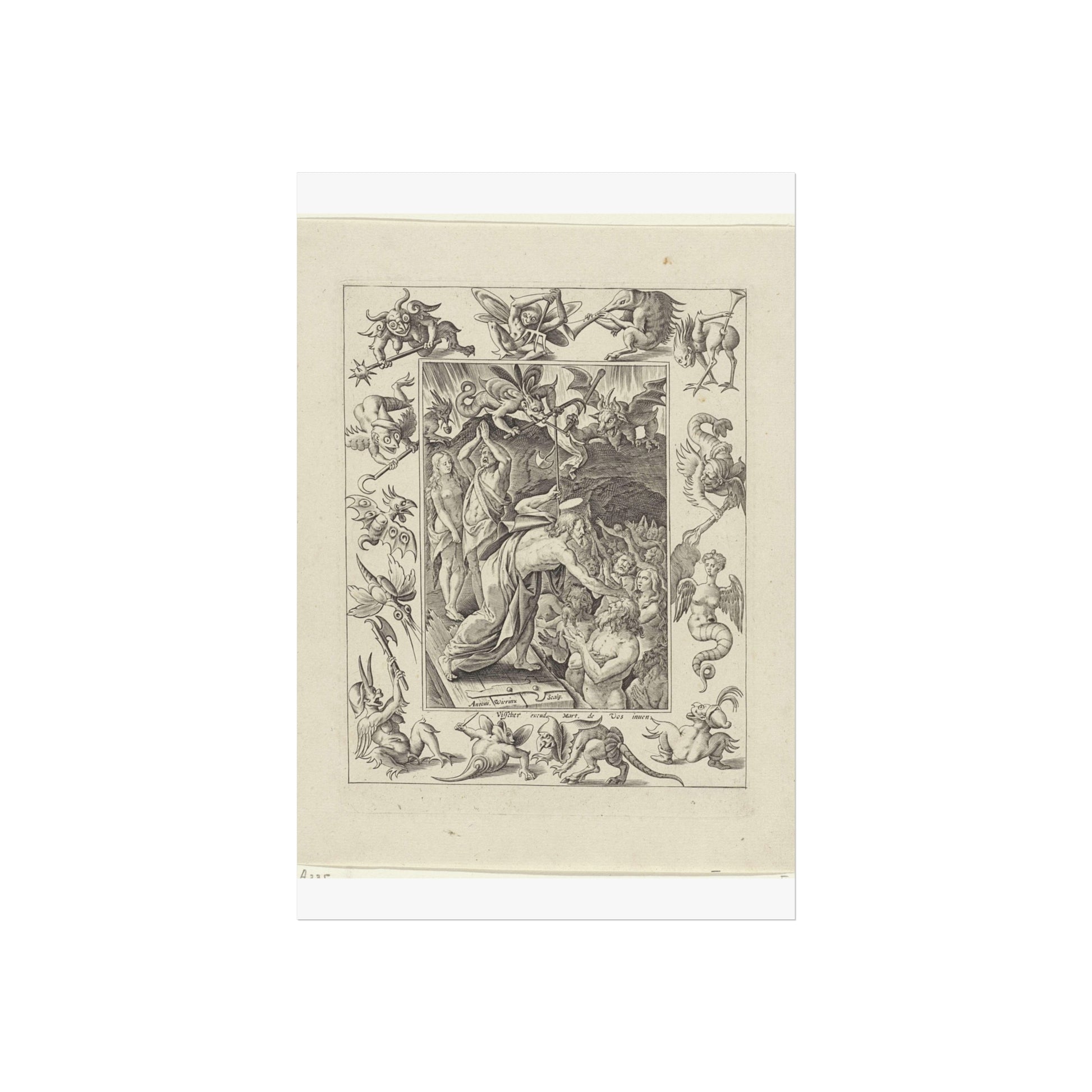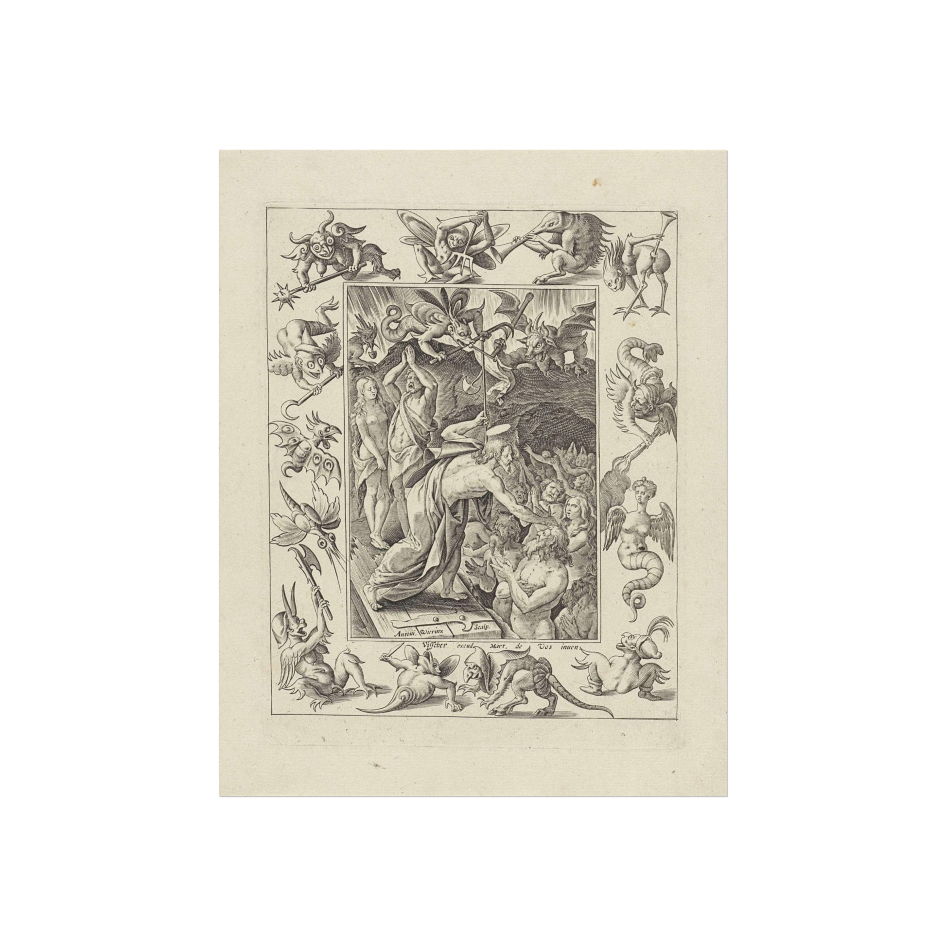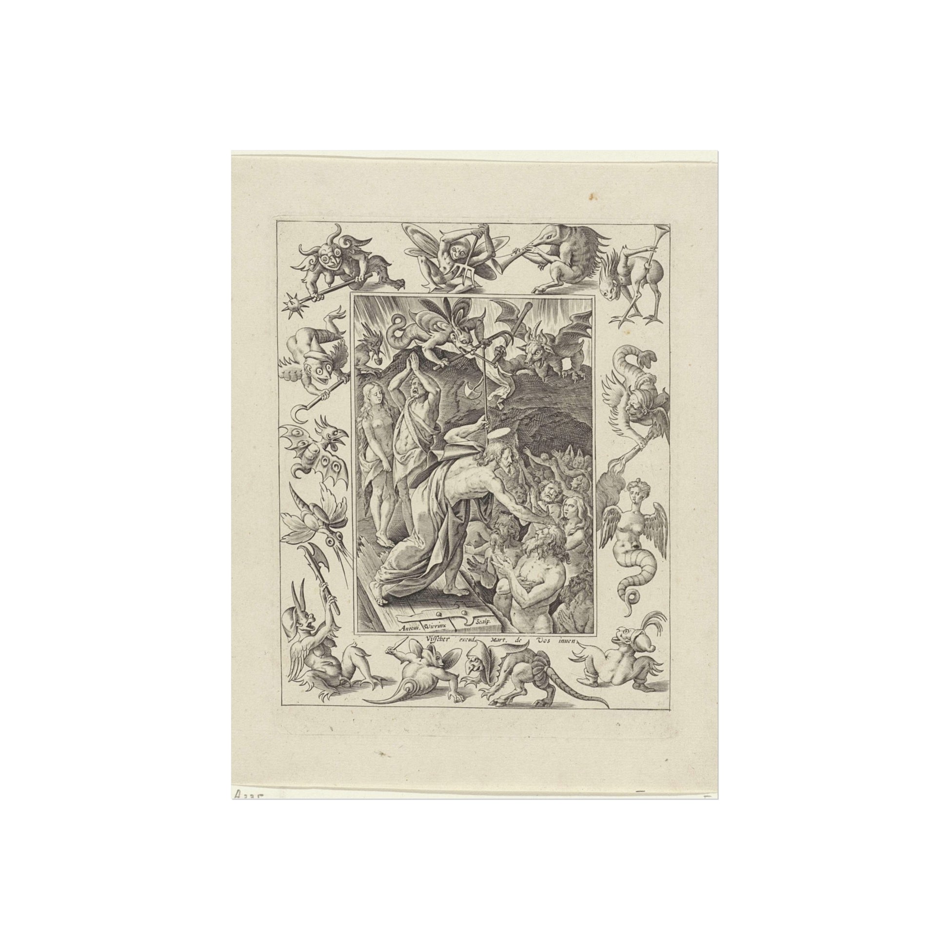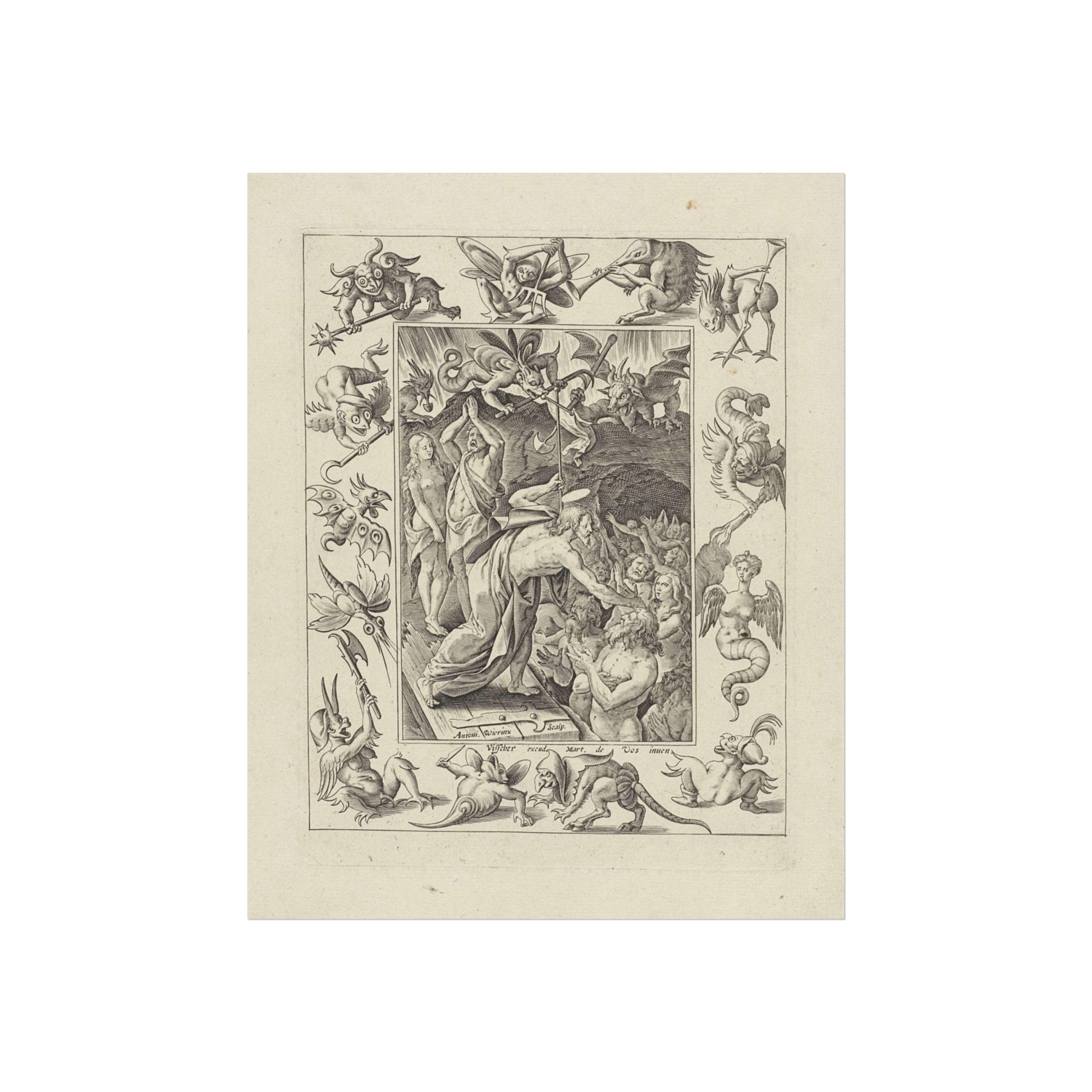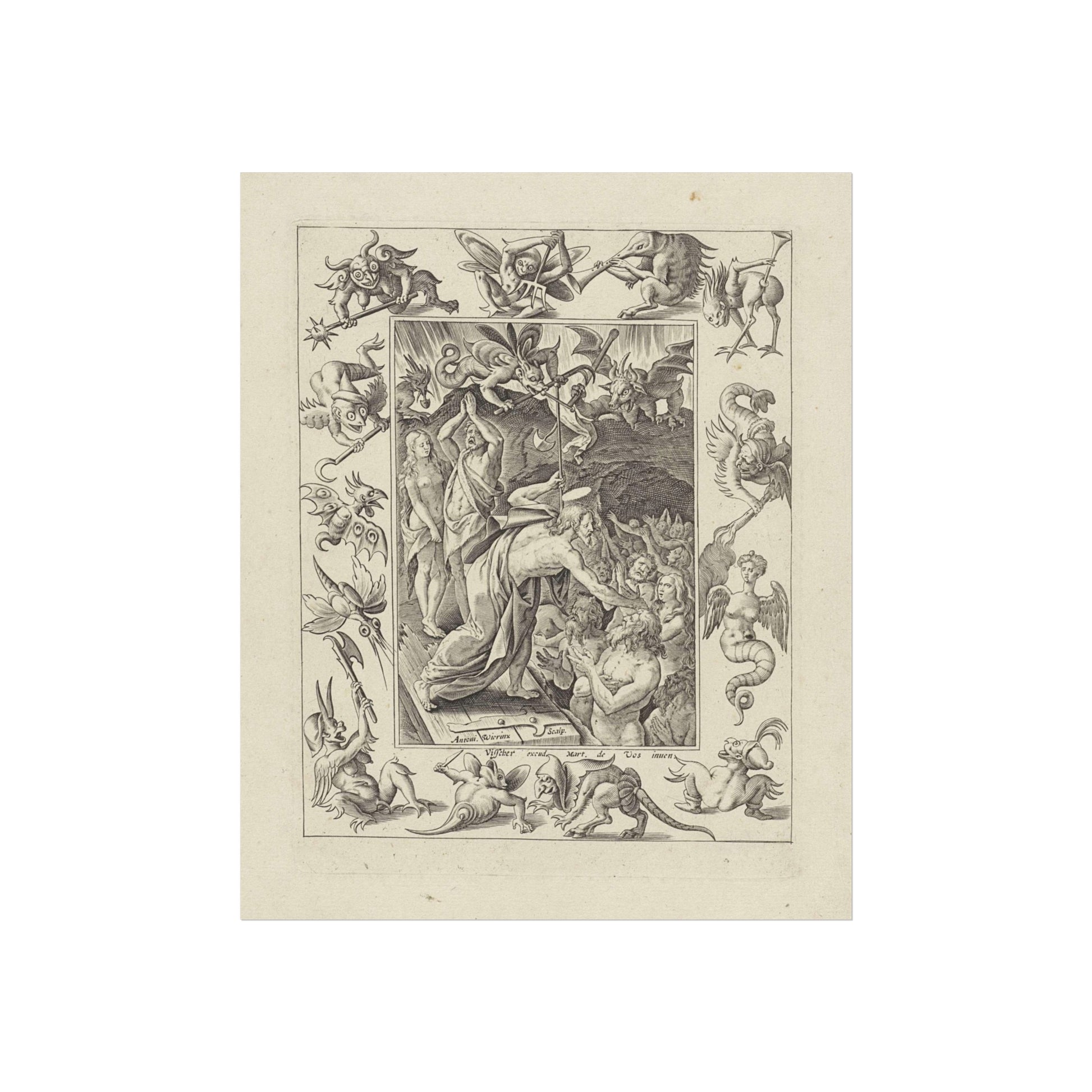 In a captivating display of divine intervention, Christ descends into limbo after his death. At the gates of hell, he extends his hand to anonymous figures, offering salvation. Three devils watch the scene unfold, their expressions a mix of shock and awe. The entire scene is framed by an ornate border, adorned with various demonic figures, adding a layer of intrigue and complexity to the piece.