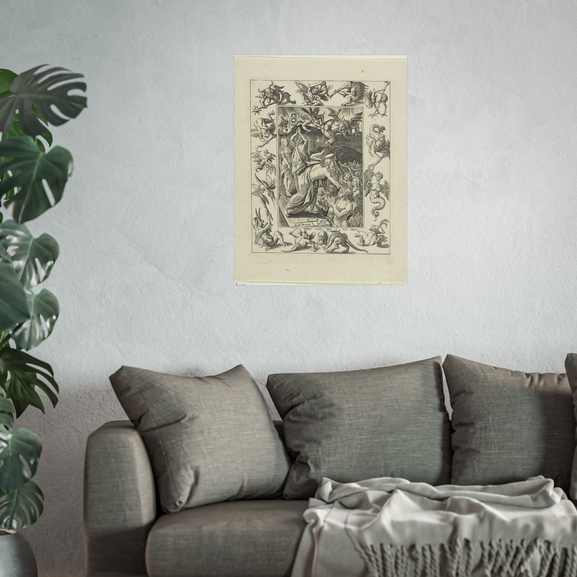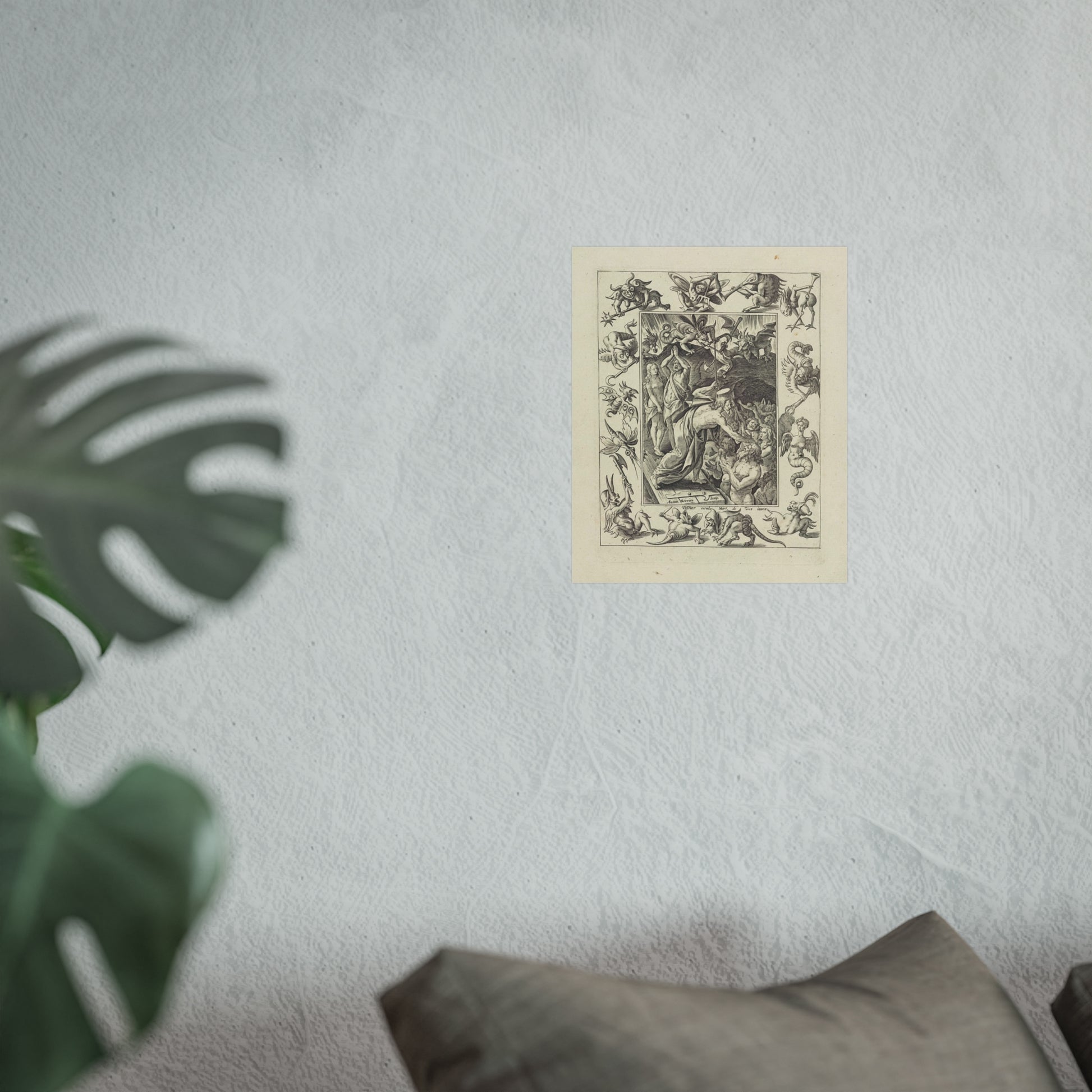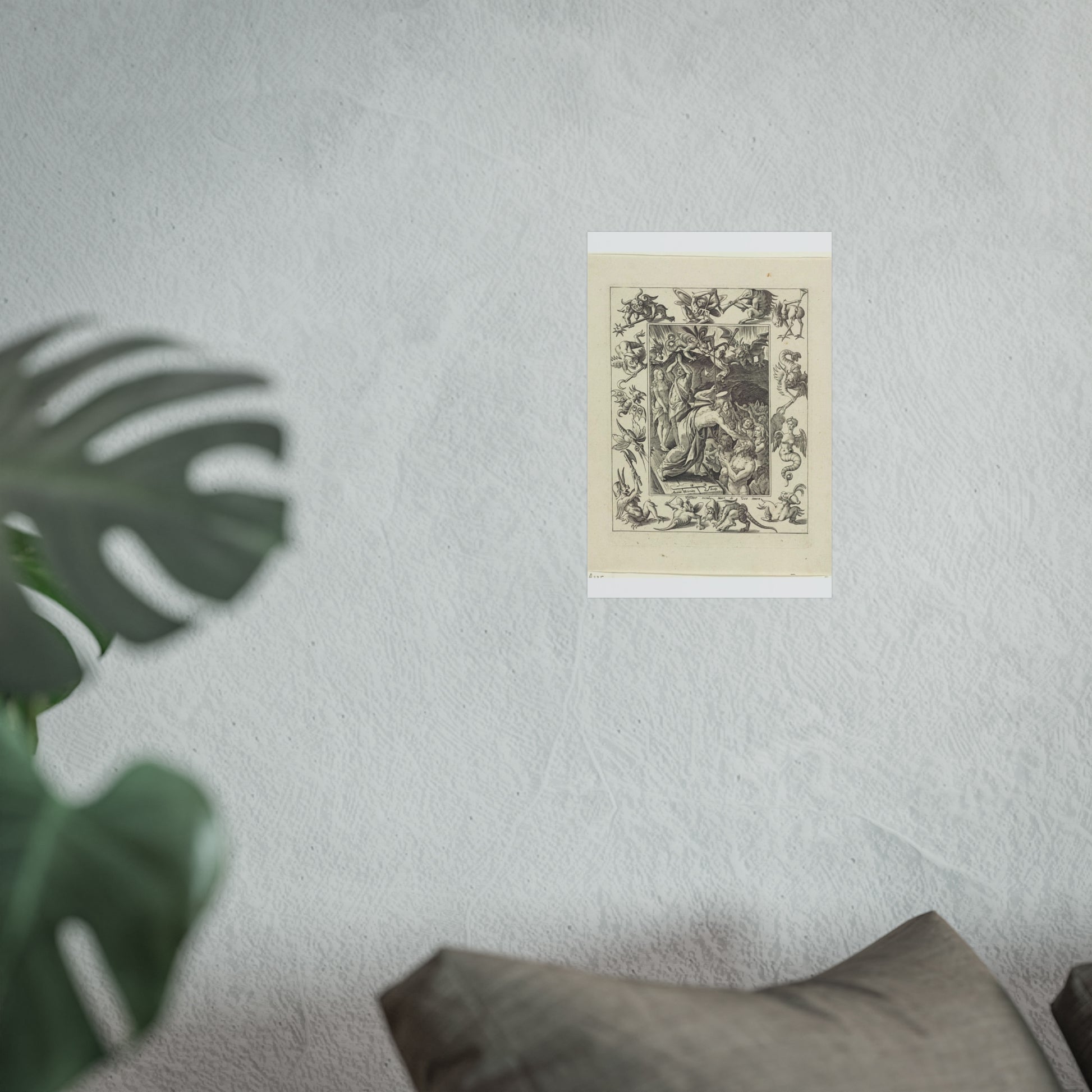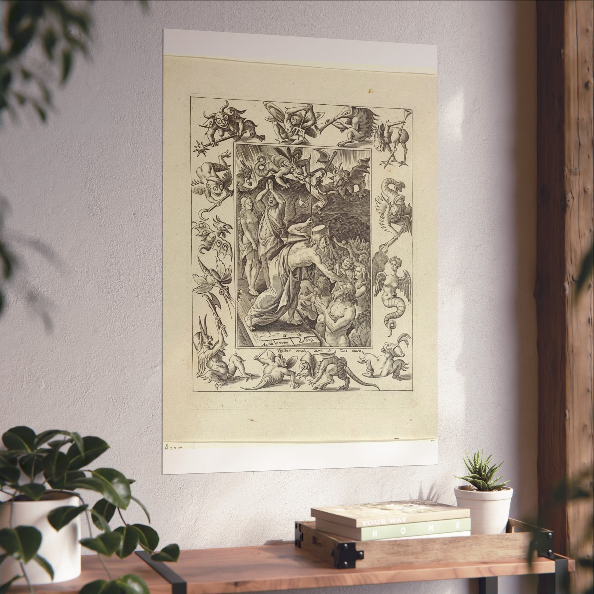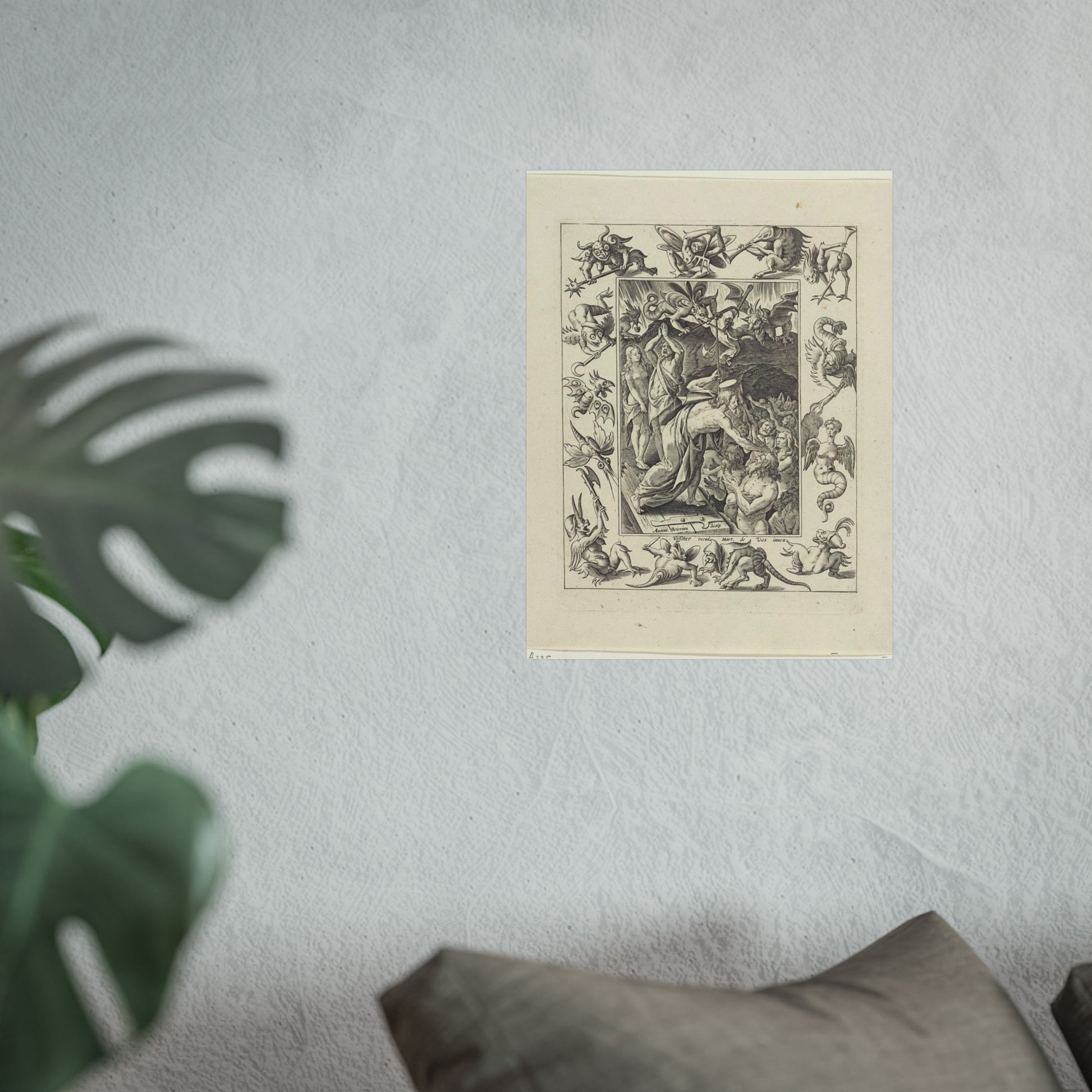In a captivating display of divine intervention, Christ descends into limbo after his death. At the gates of hell, he extends his hand to anonymous figures, offering salvation. Three devils watch the scene unfold, their expressions a mix of shock and awe. The entire scene is framed by an ornate border, adorned with various demonic figures, adding a layer of intrigue and complexity to the piece.