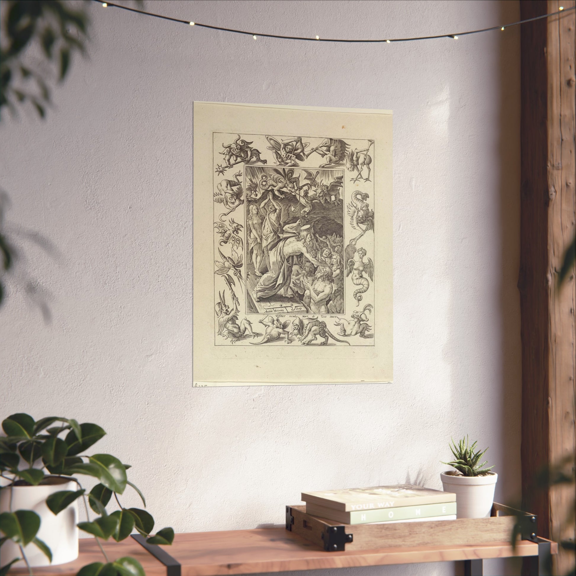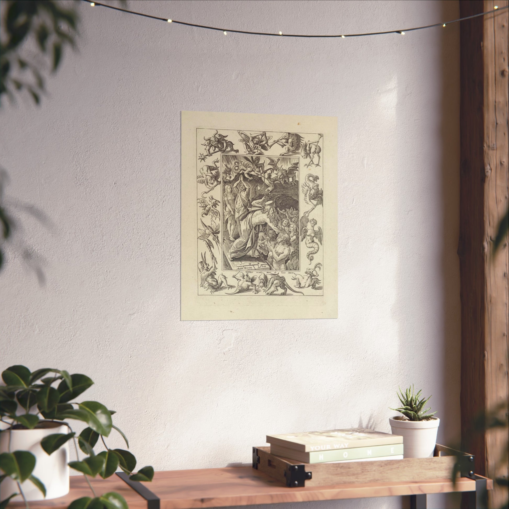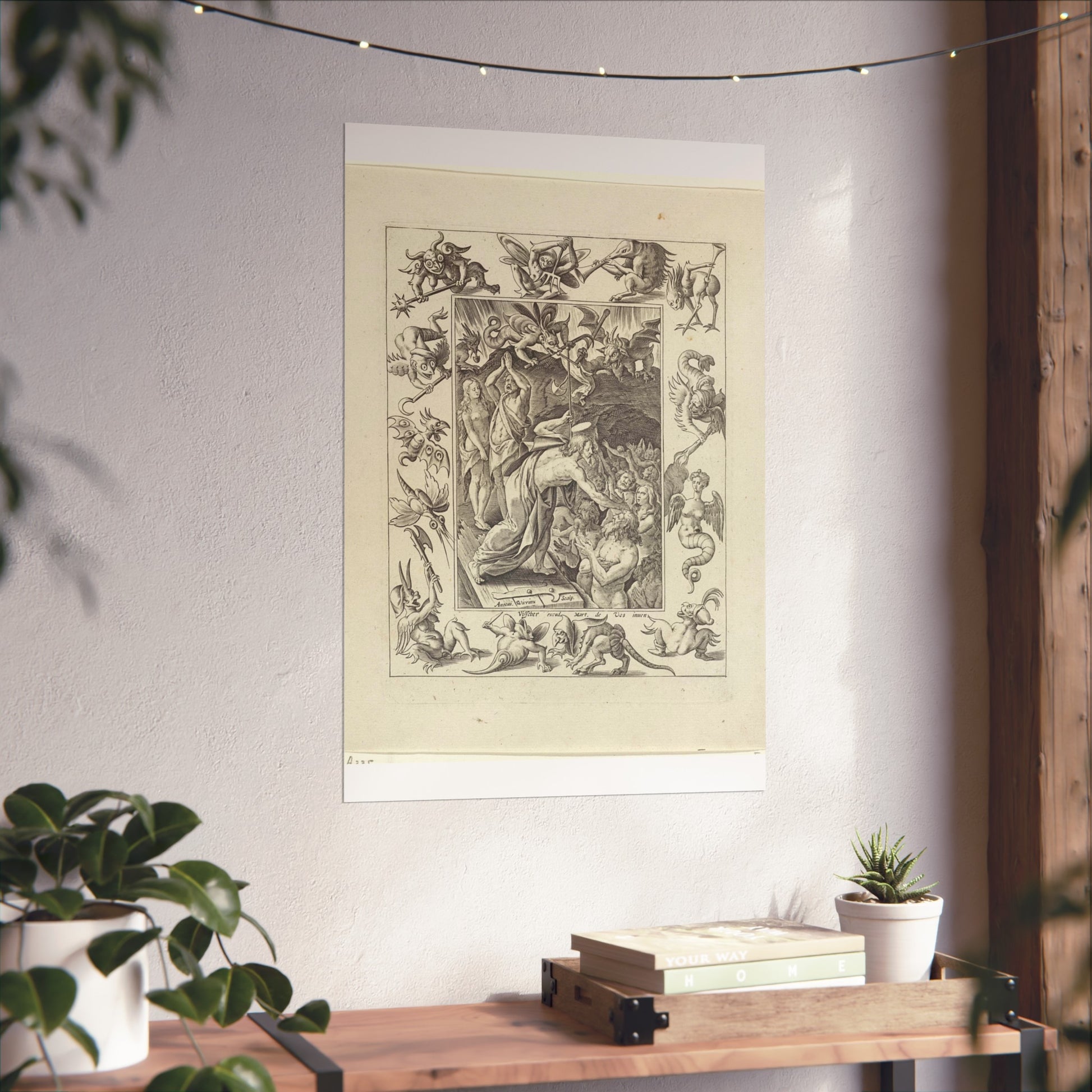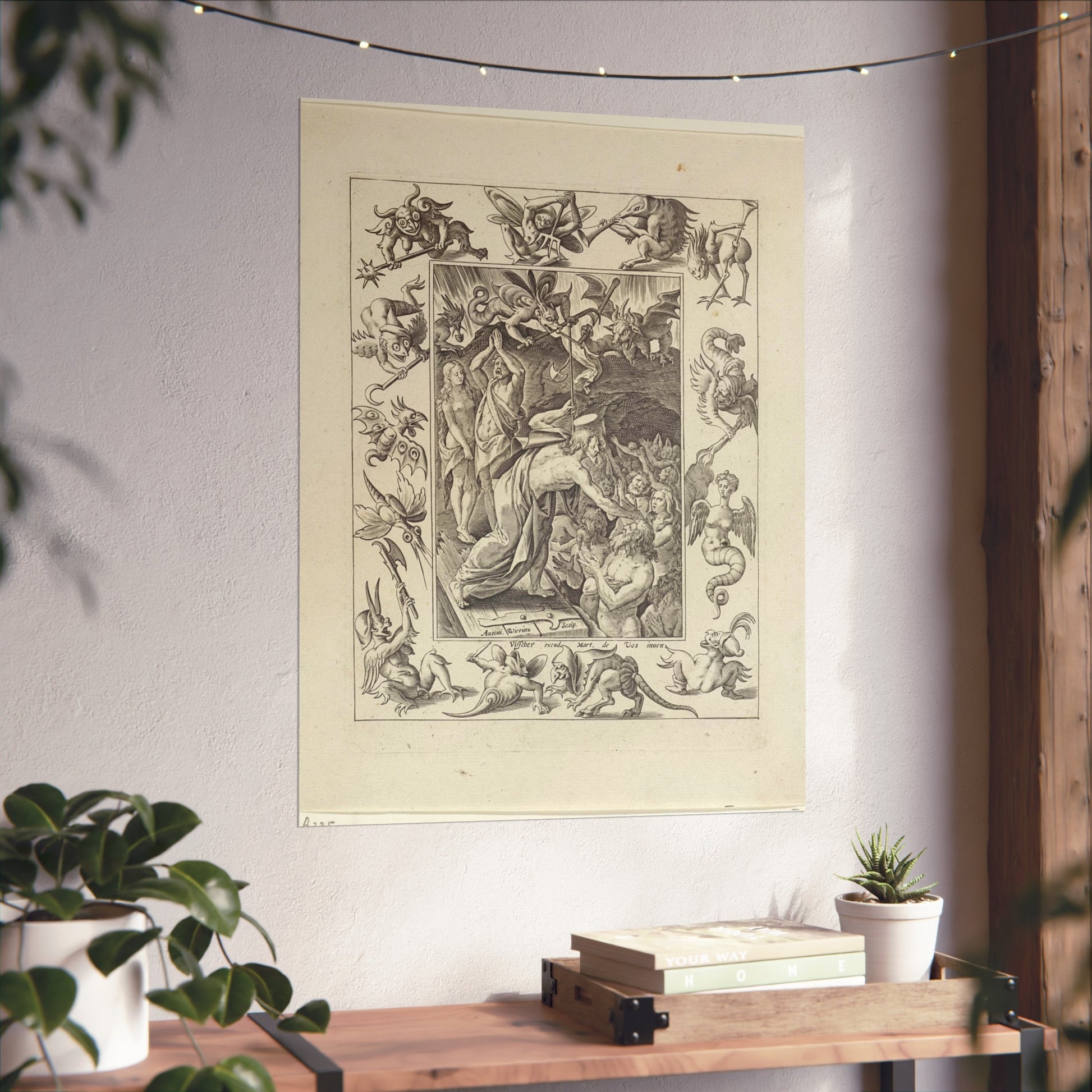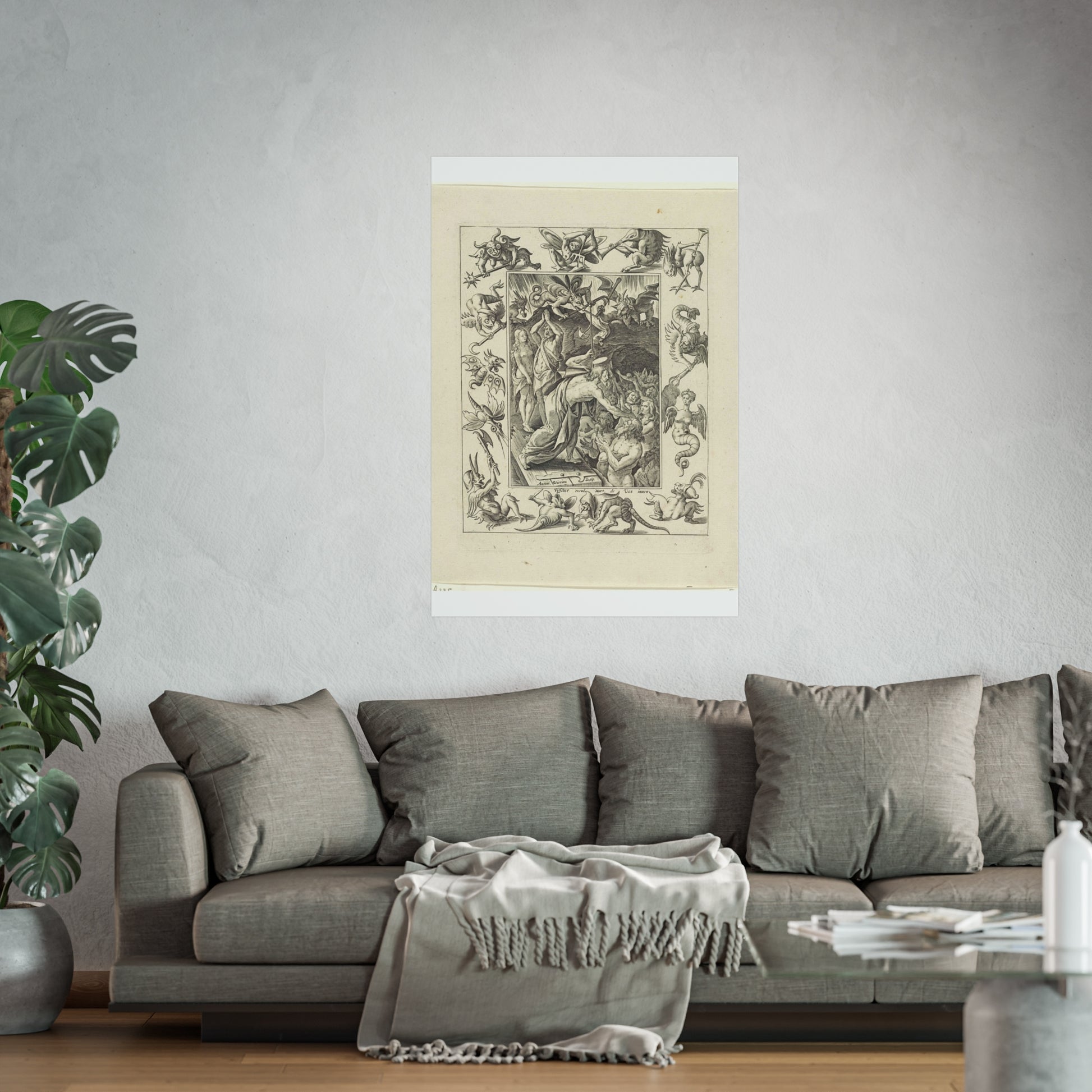 In a captivating display of divine intervention, Christ descends into limbo after his death. At the gates of hell, he extends his hand to anonymous figures, offering salvation. Three devils watch the scene unfold, their expressions a mix of shock and awe. The entire scene is framed by an ornate border, adorned with various demonic figures, adding a layer of intrigue and complexity to the piece.
