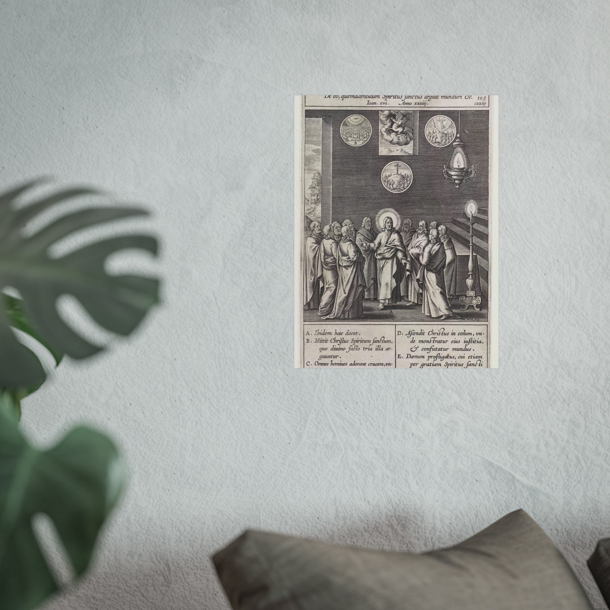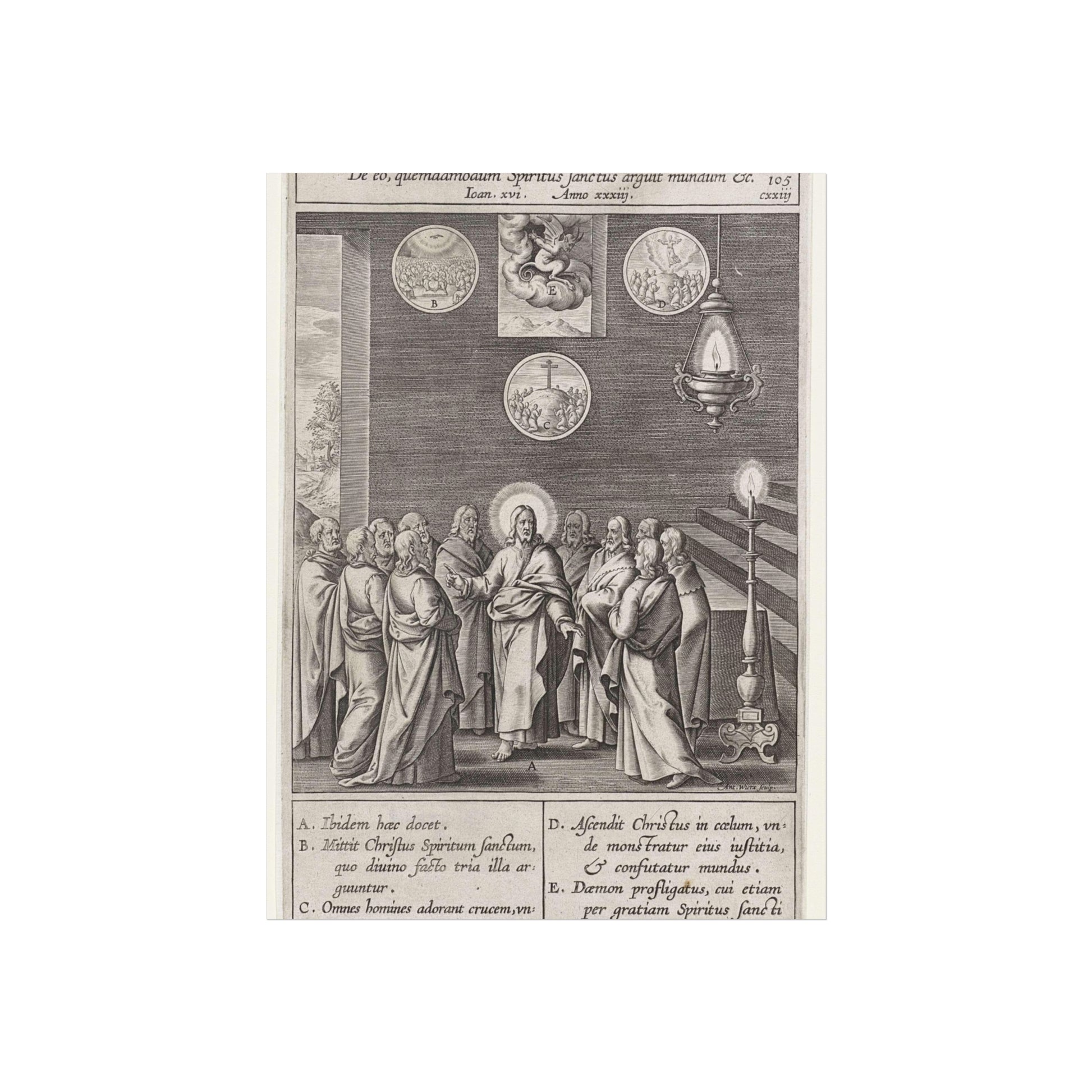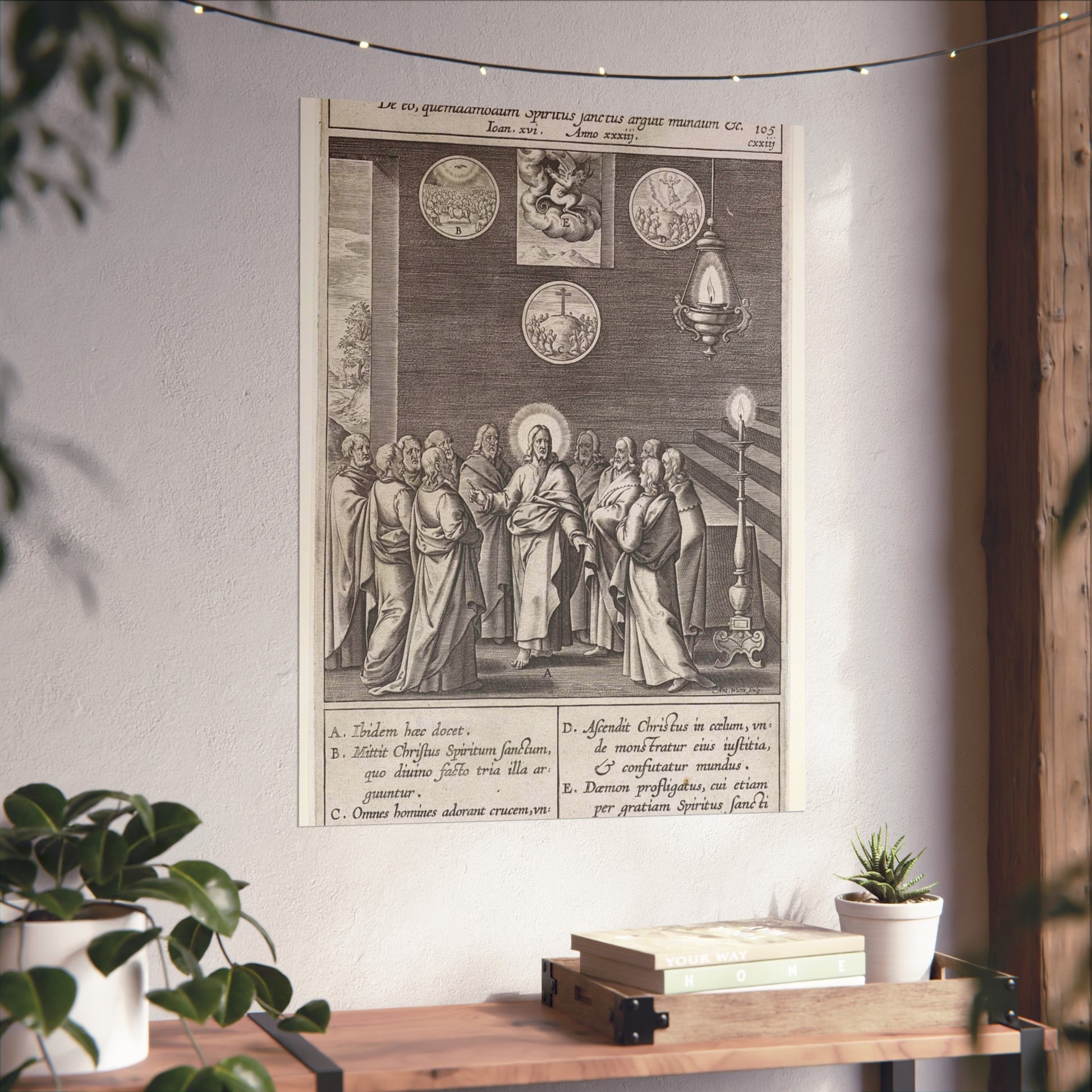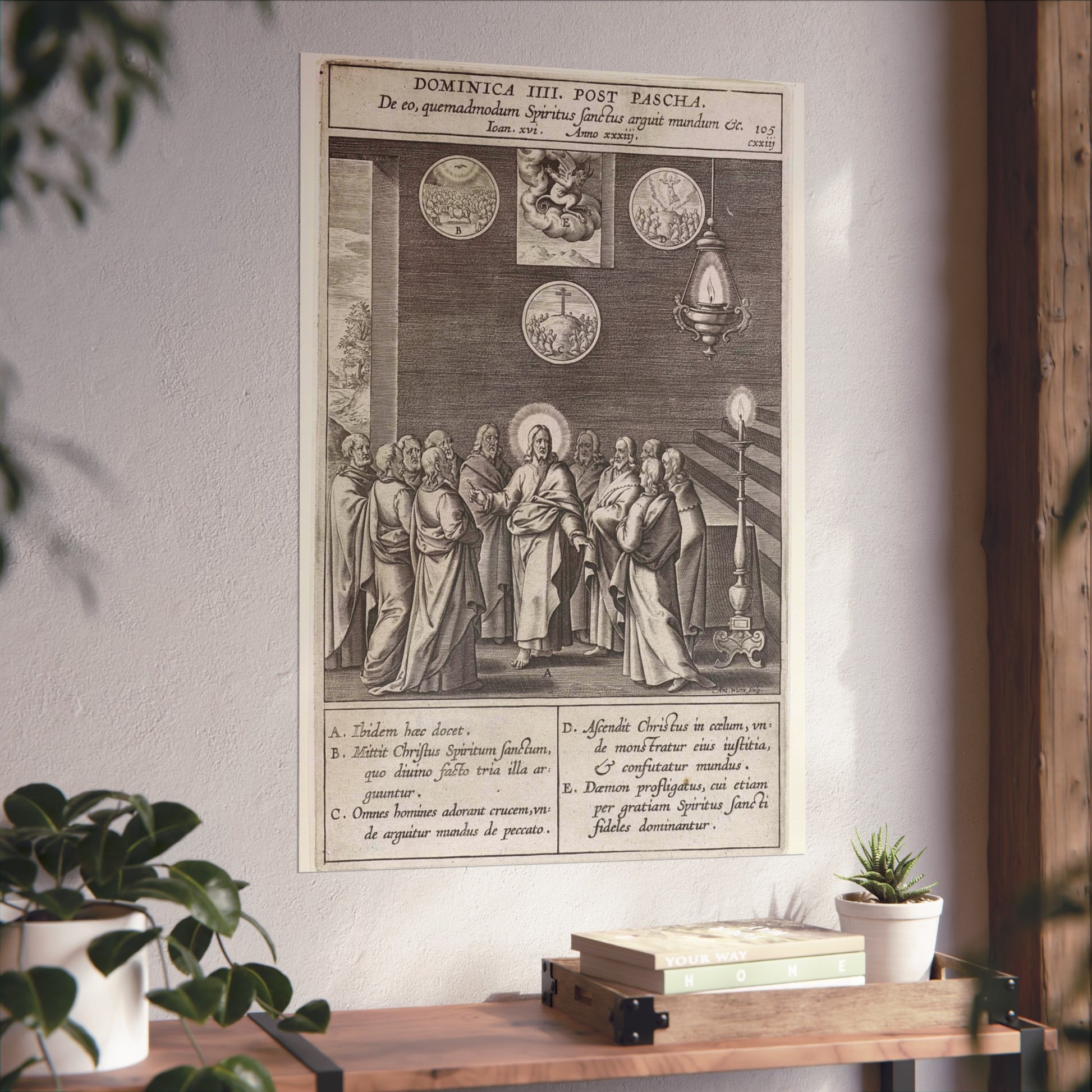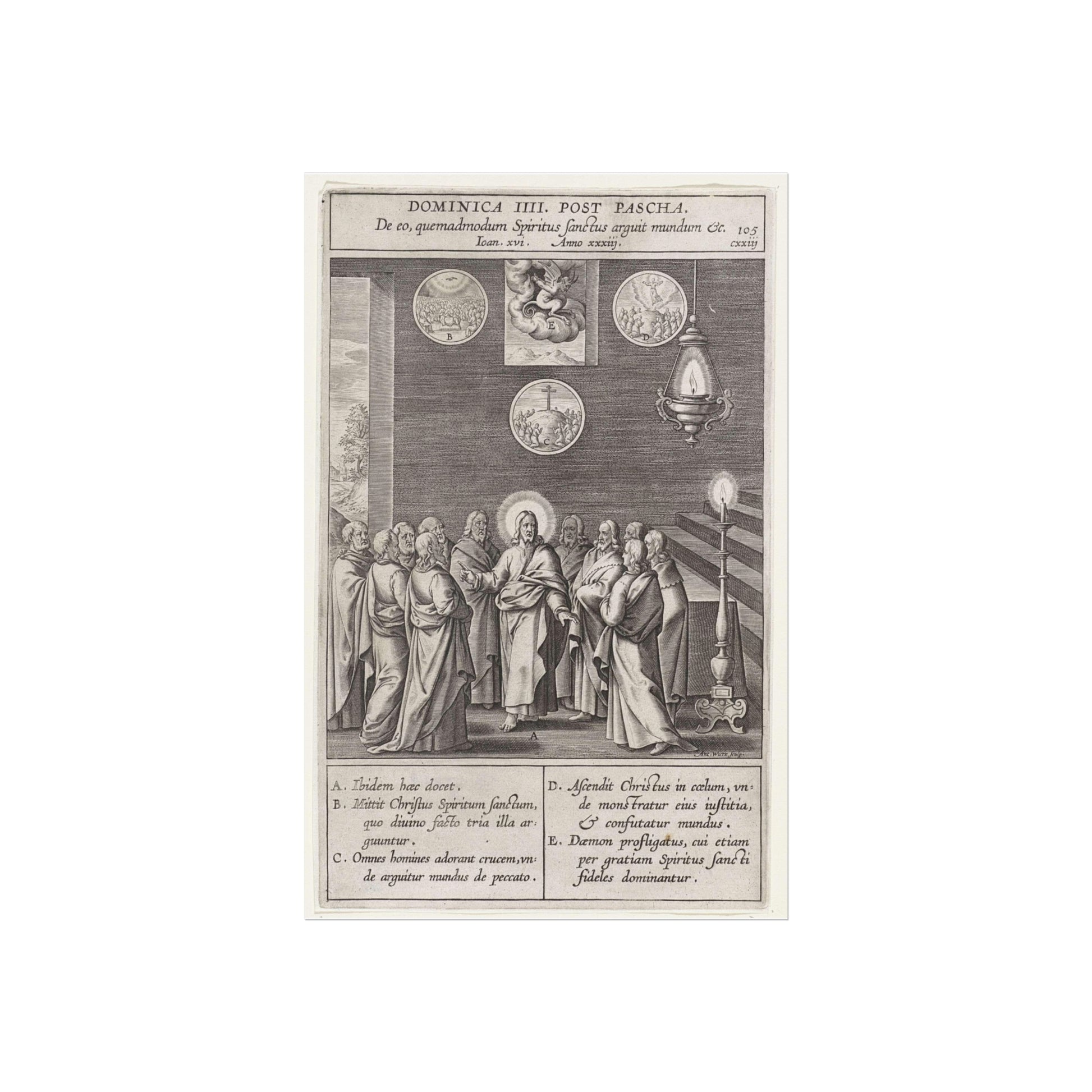 This captivating work features Christ enlightening his disciples with the words, 'I have spoken to you in metaphors, but the time will come when I will no longer use metaphors, but will speak to you directly about the Father.' In the scene, various elements are marked with letters corresponding to a legend in the margin, adding an intriguing layer of symbolism.