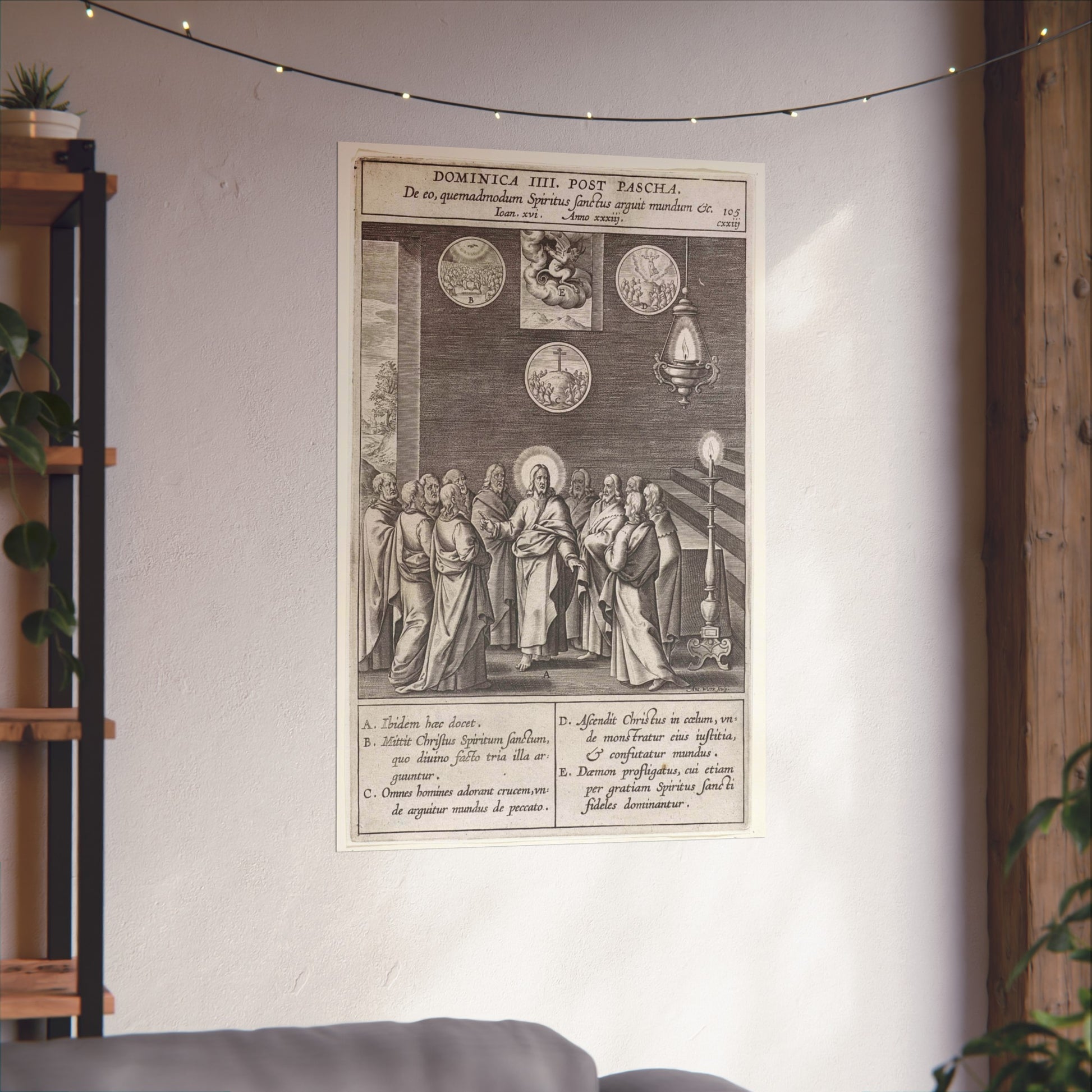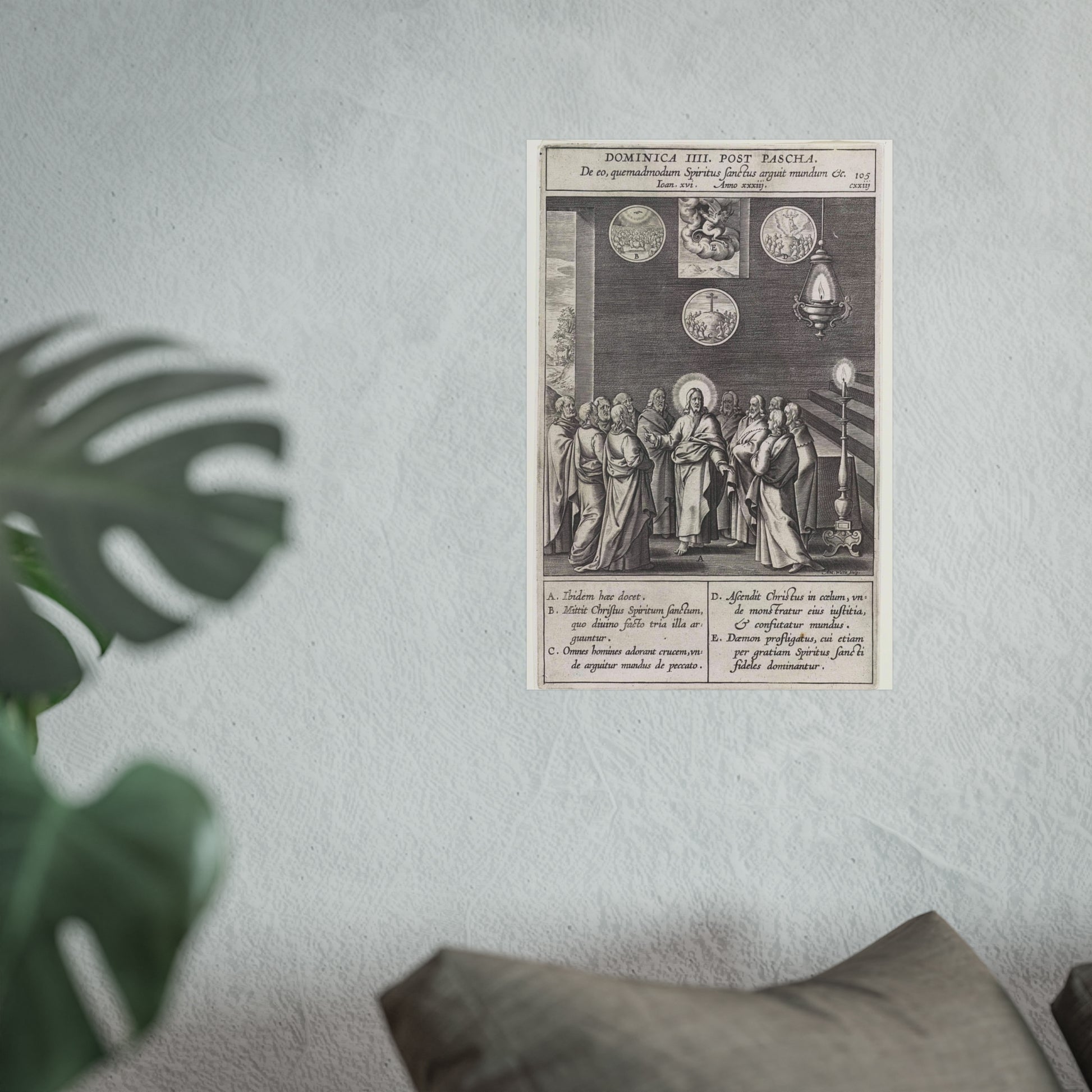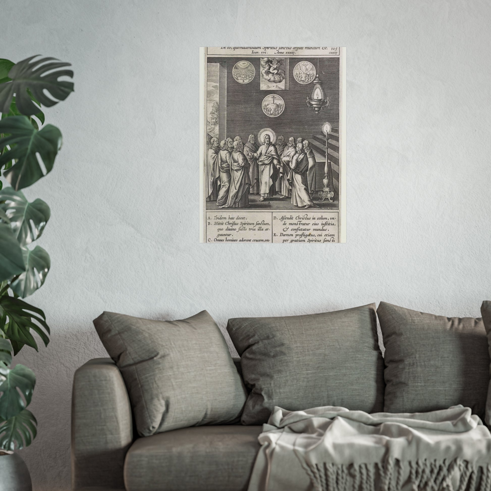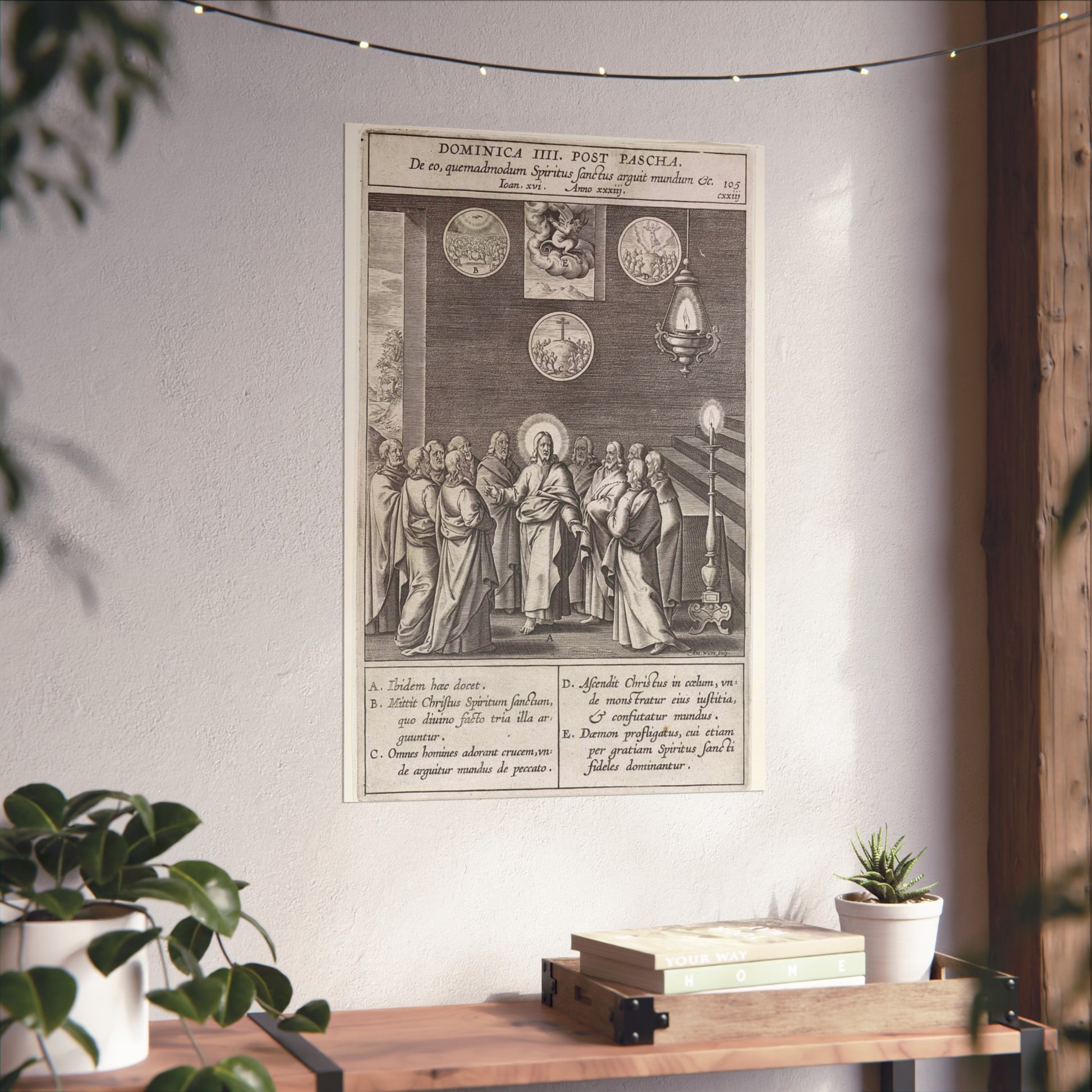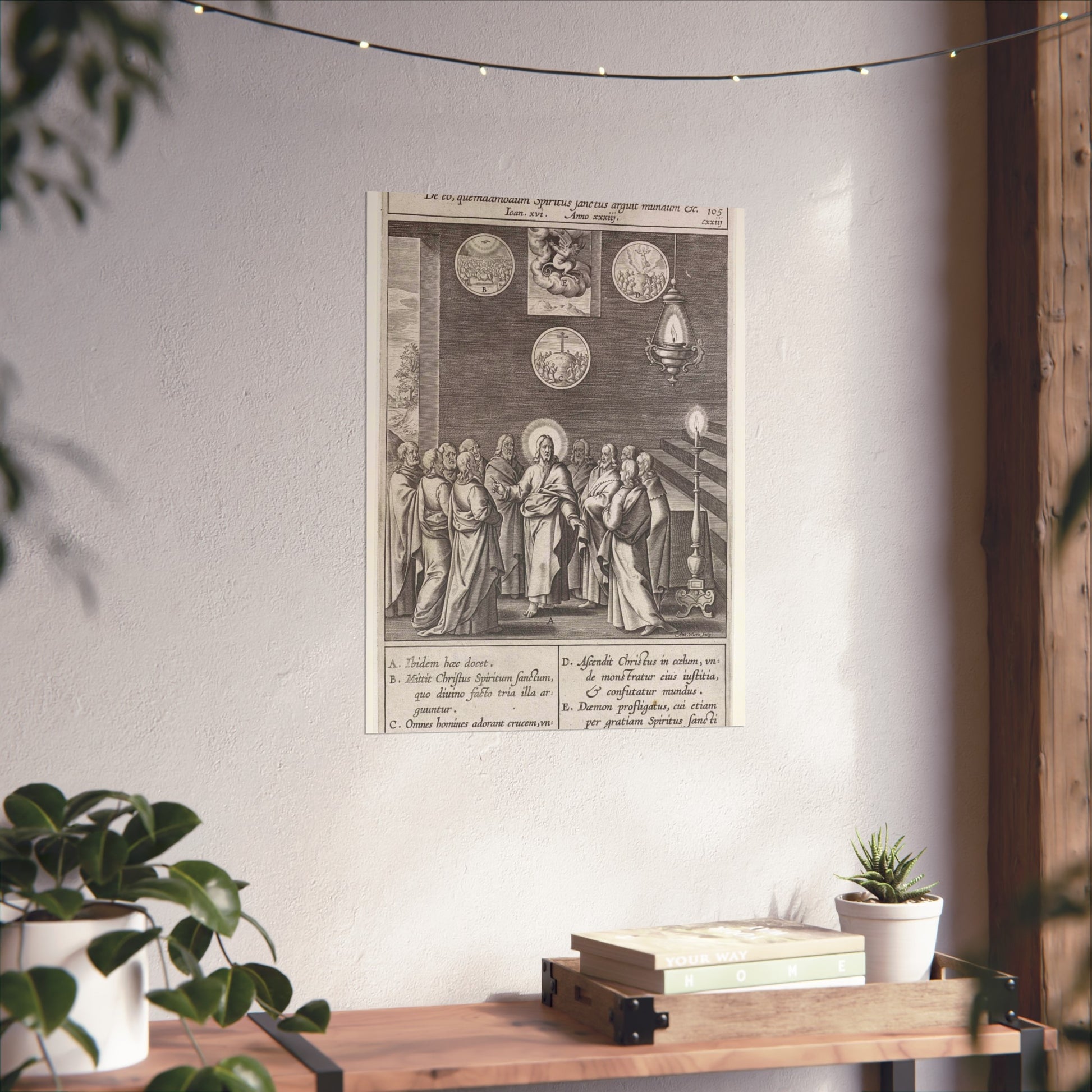 This captivating work features Christ enlightening his disciples with the words, 'I have spoken to you in metaphors, but the time will come when I will no longer use metaphors, but will speak to you directly about the Father.' In the scene, various elements are marked with letters corresponding to a legend in the margin, adding an intriguing layer of symbolism.