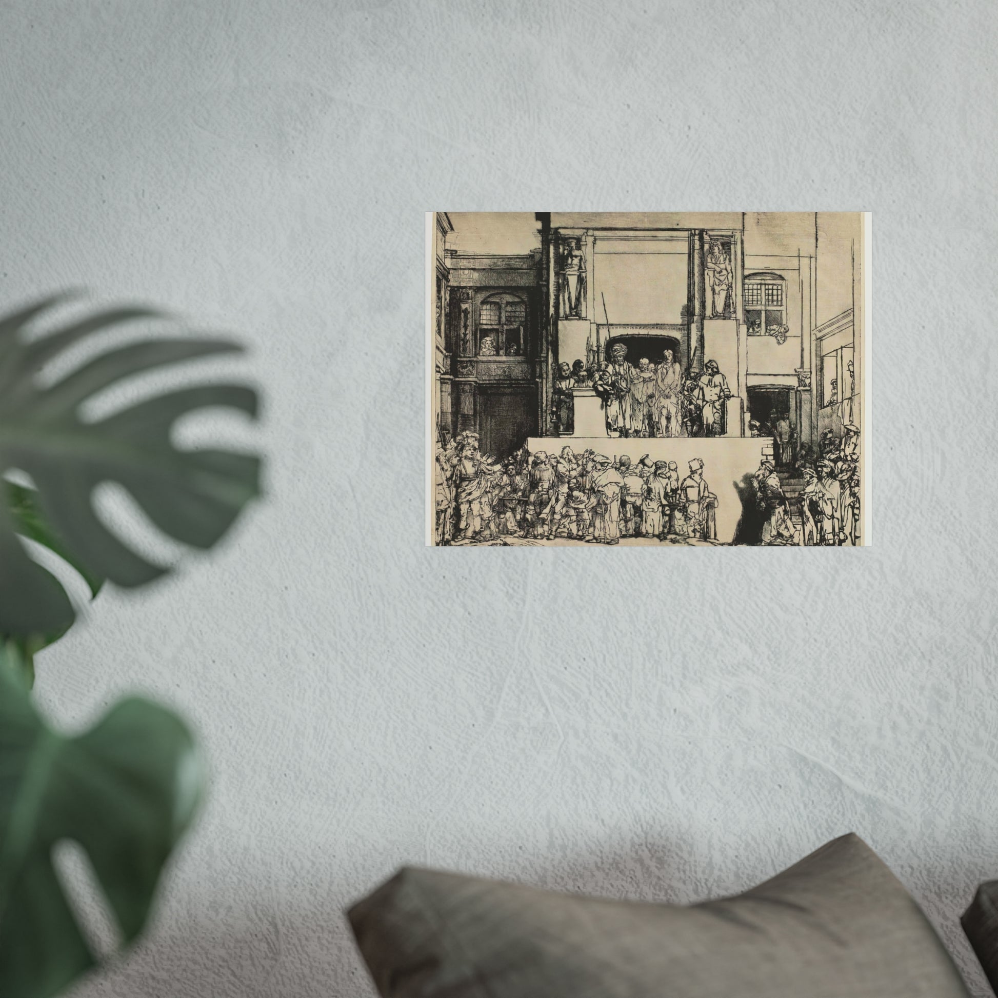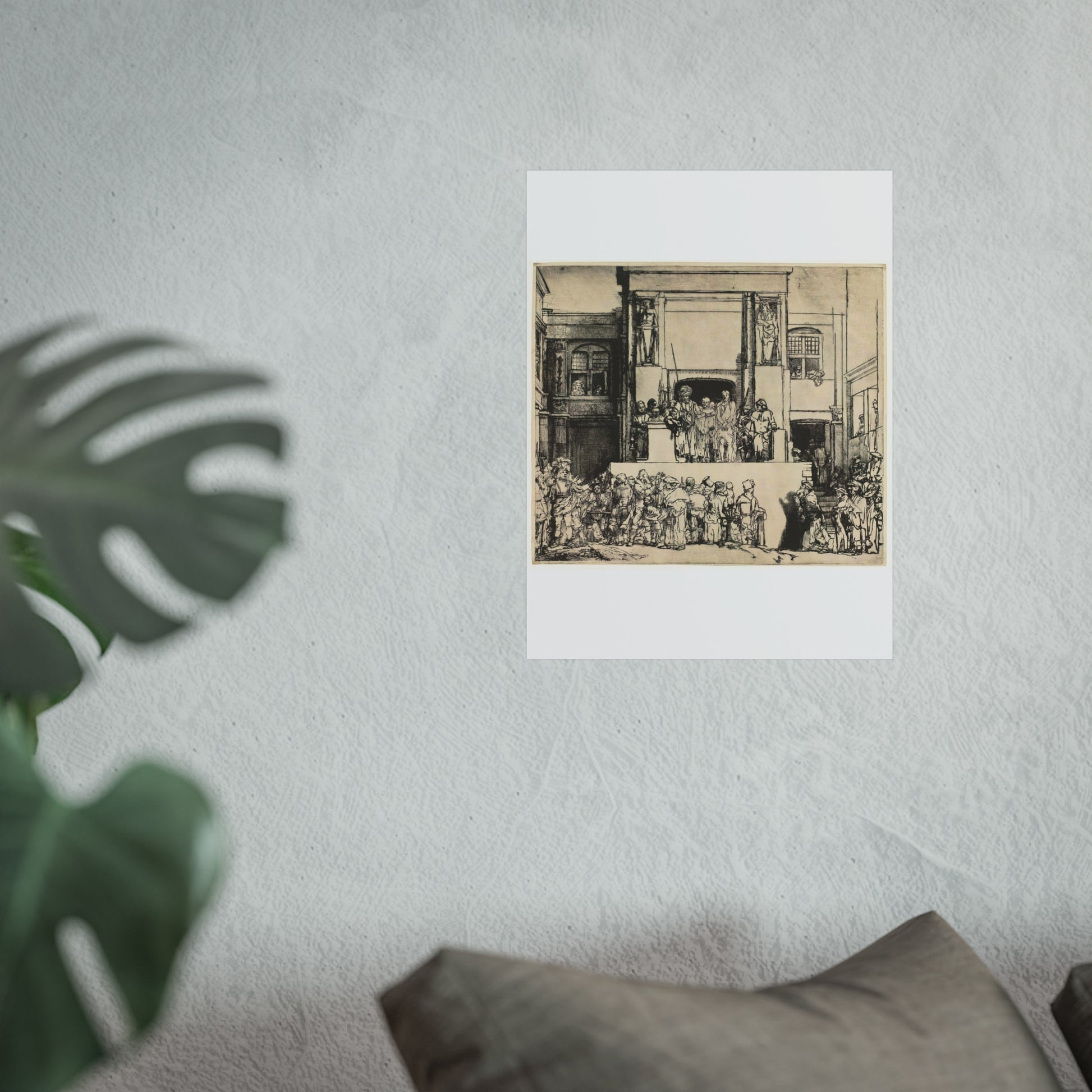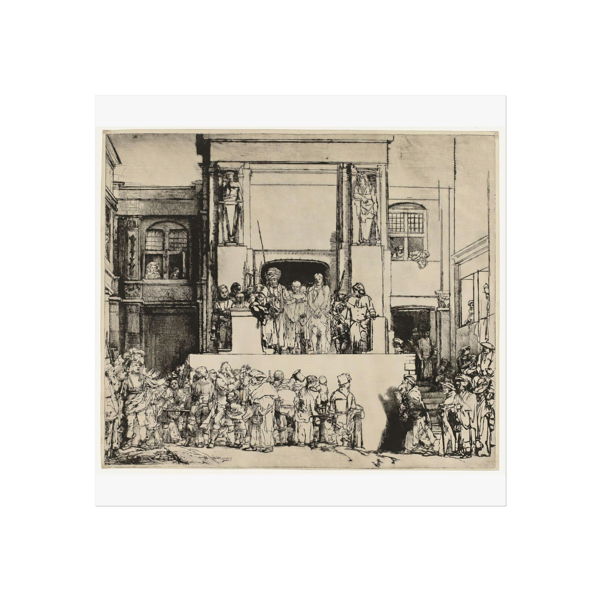 Rembrandt van Rijn's 'Christ Presented to the People (Ecce Homo)' captures a poignant moment in Christian history with profound emotional depth. The painting depicts the scene where Jesus is shown to the crowd by Pontius Pilate, who declares 'Ecce Homo' or 'Behold the Man.' Rembrandt's masterful use of light and shadow highlights the tension and drama of the moment, drawing the viewer into the scene. The expressions on the faces of the characters convey a range of emotions from sorrow to indifference, making it a compelling study of human nature and divine suffering.