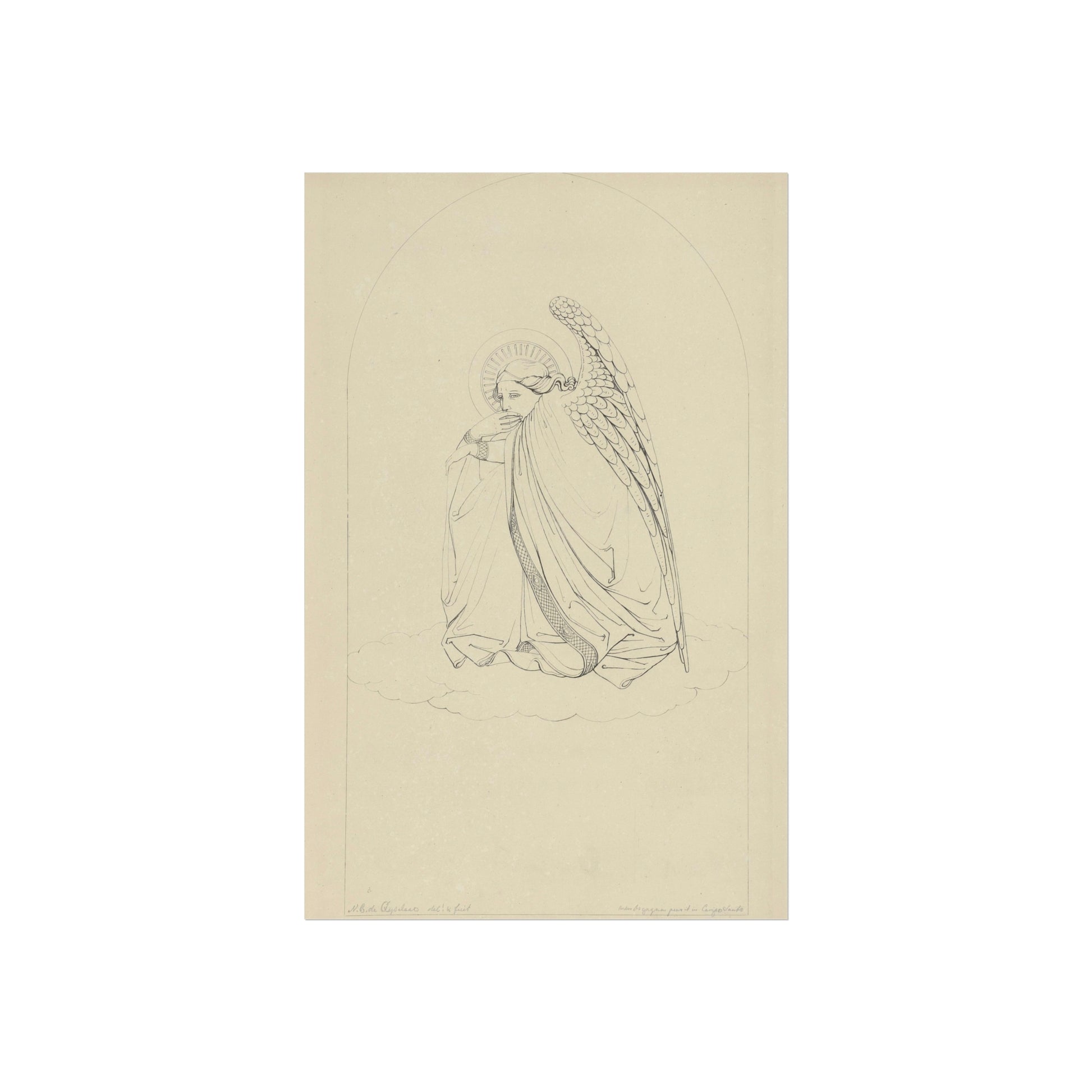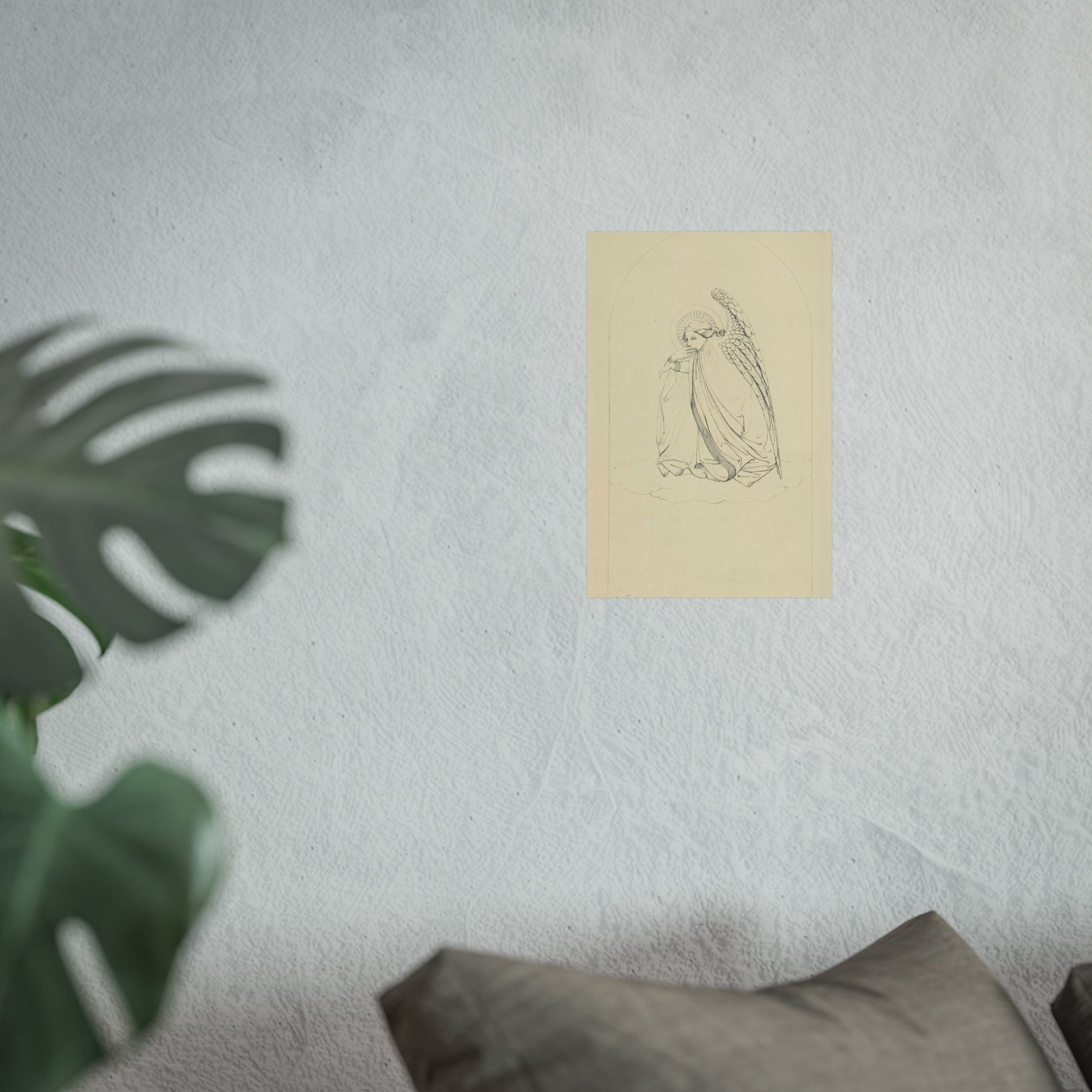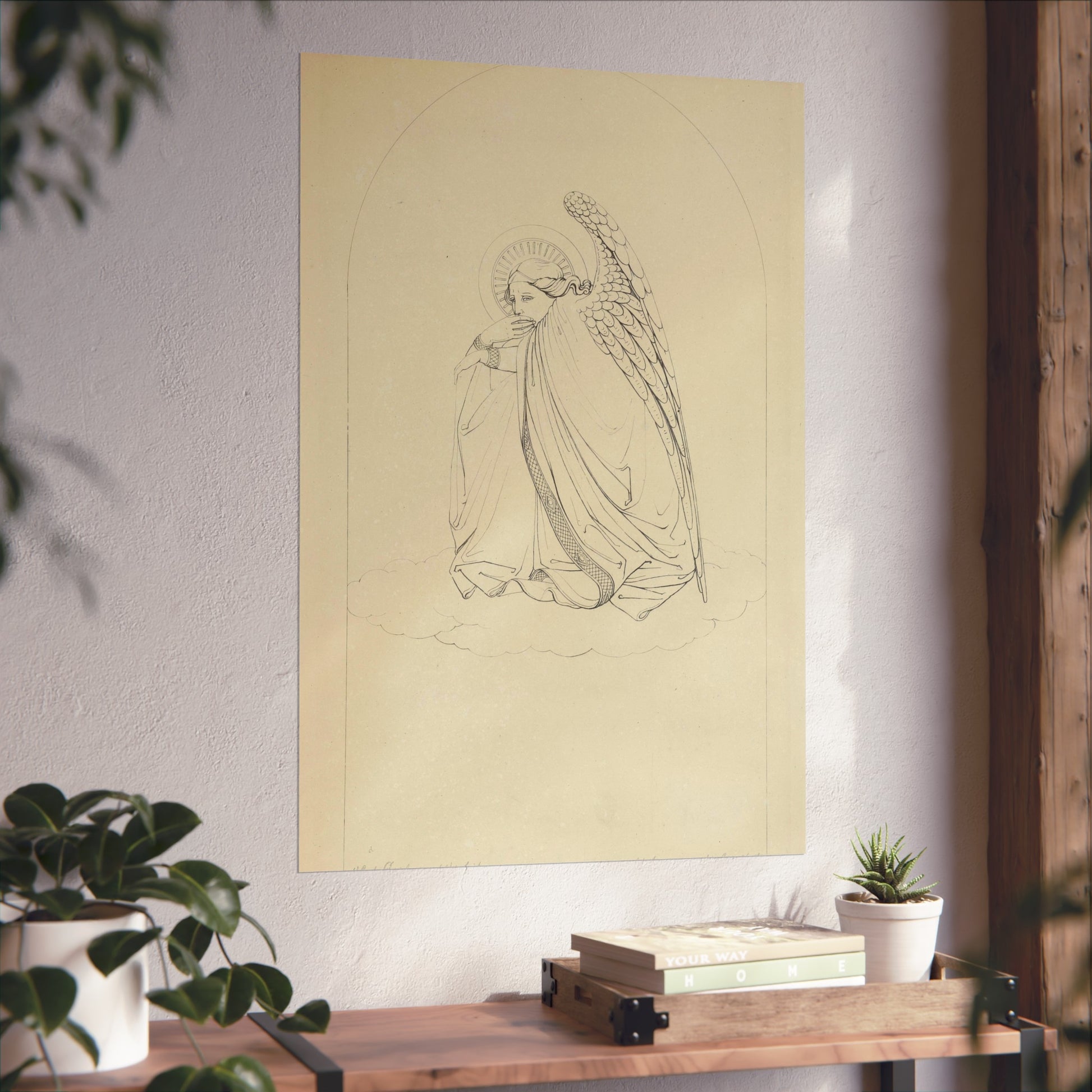 Behold a captivating portrayal of an angel in a crouched position, hand delicately placed over the mouth. This intriguing pose suggests a moment of silence, reflection, or perhaps the harboring of a divine secret.
