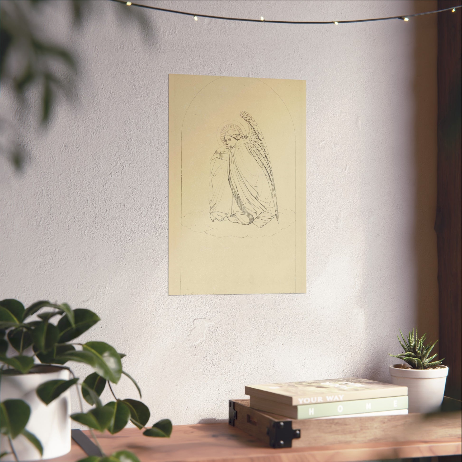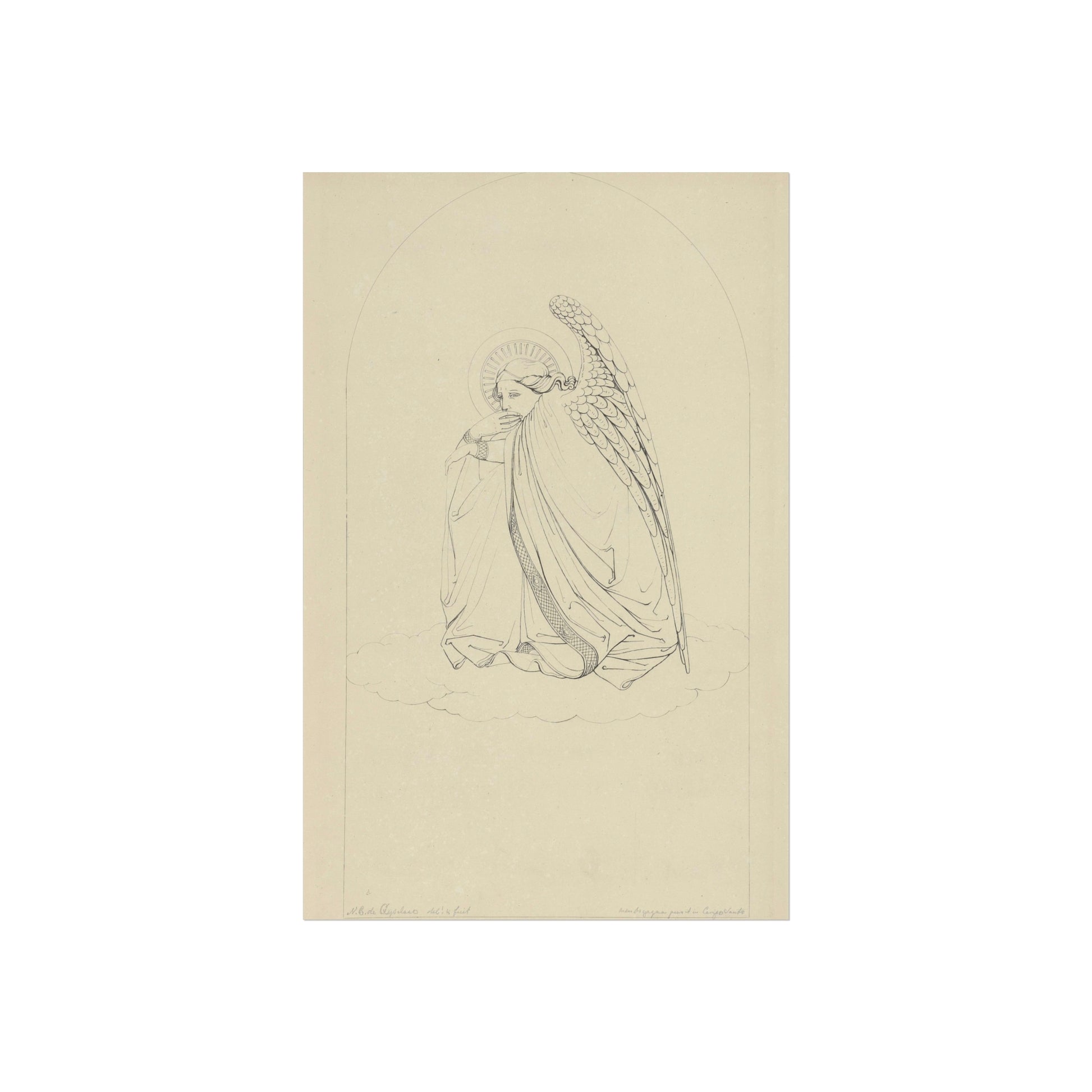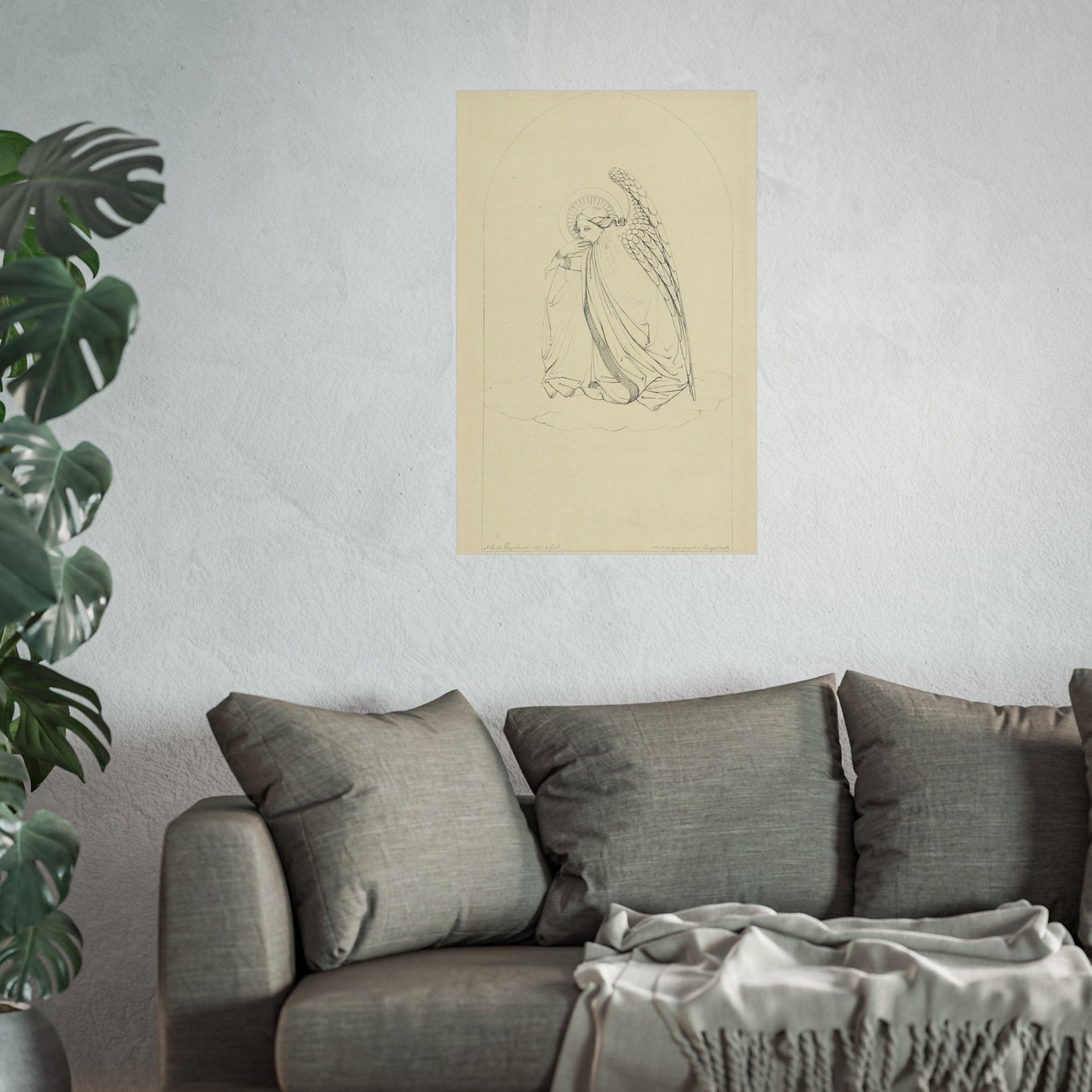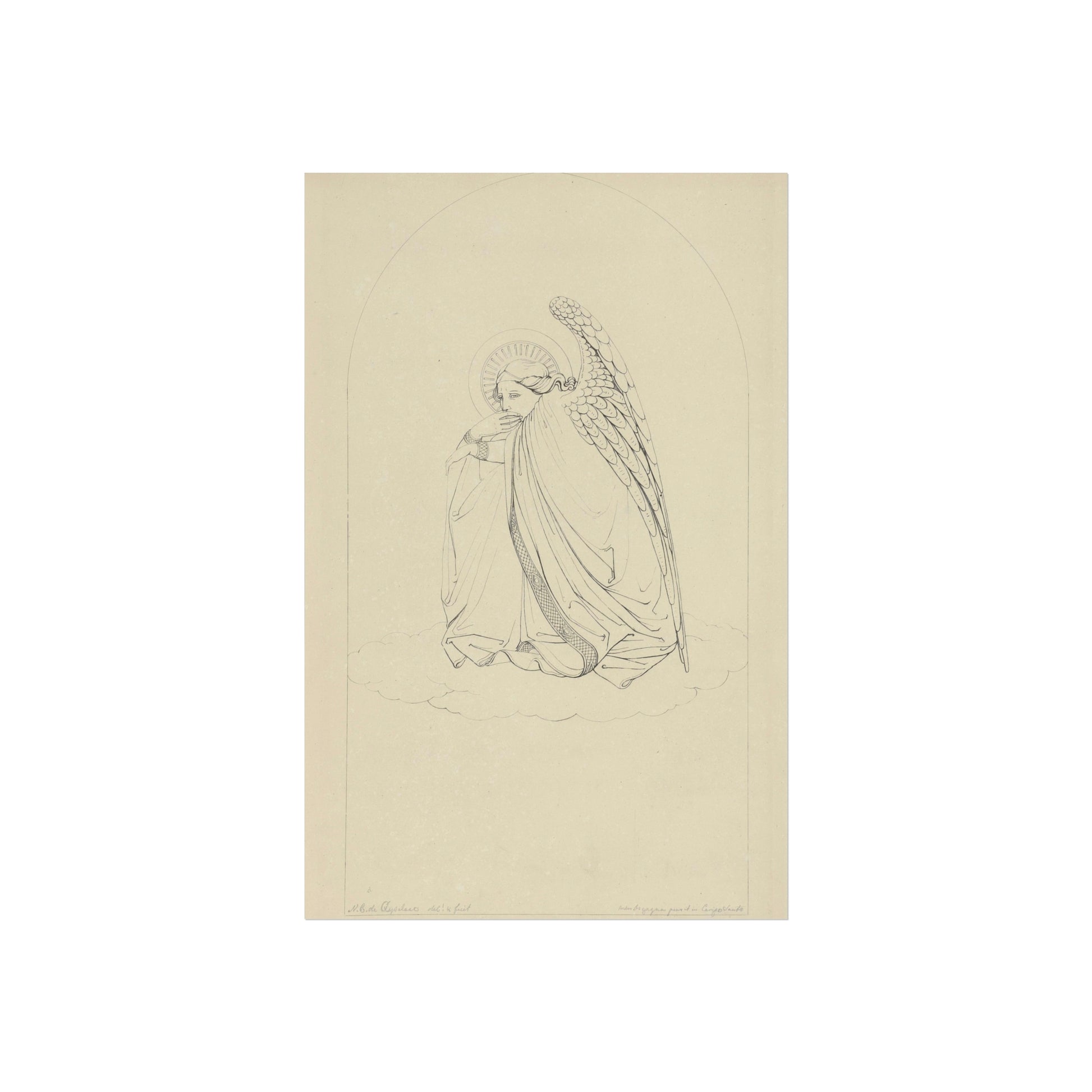 Behold a captivating portrayal of an angel in a crouched position, hand delicately placed over the mouth. This intriguing pose suggests a moment of silence, reflection, or perhaps the harboring of a divine secret.