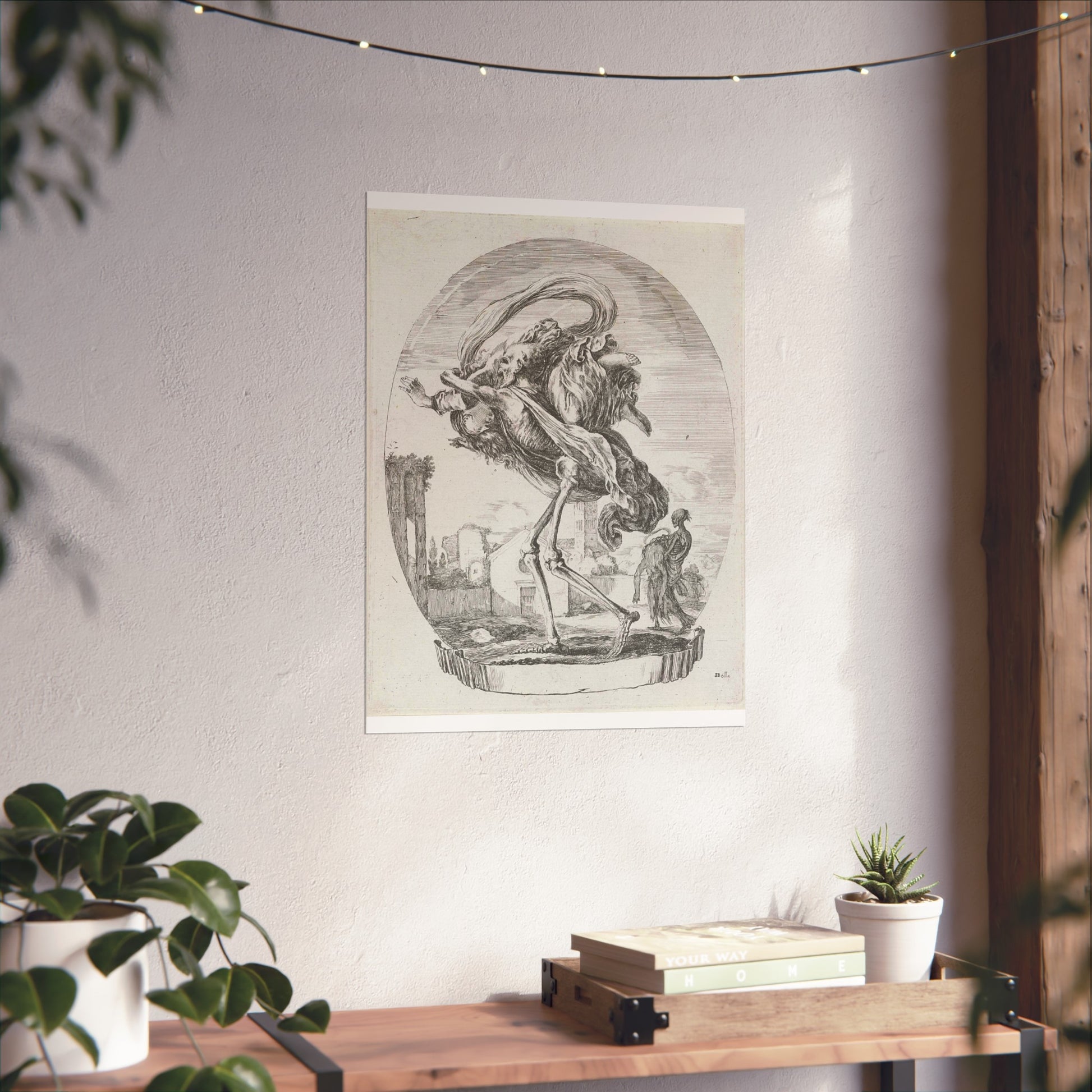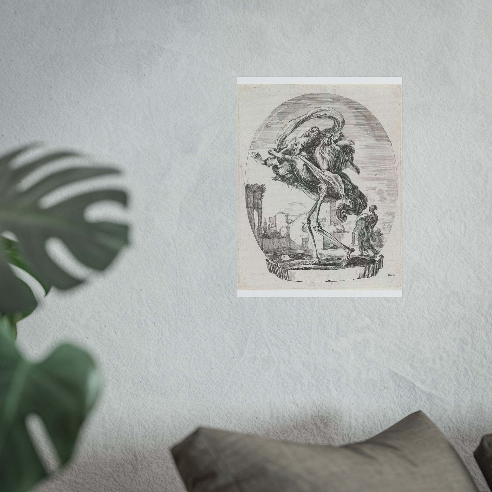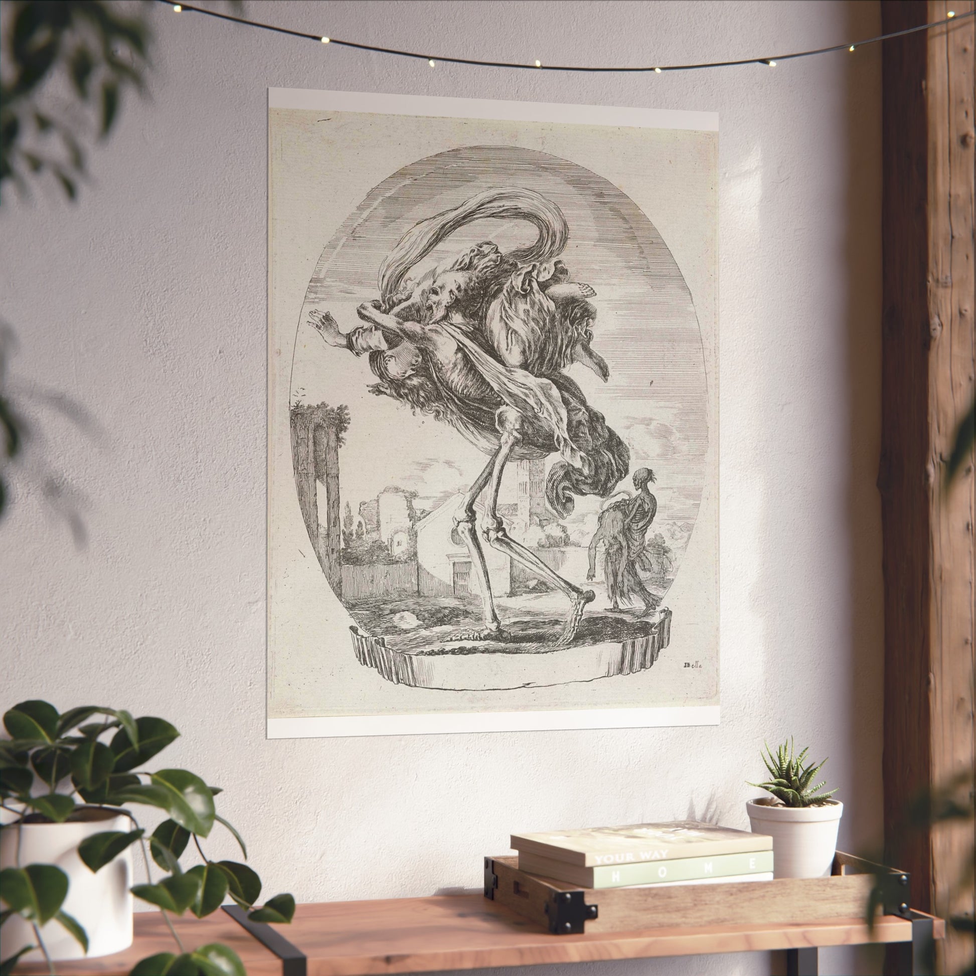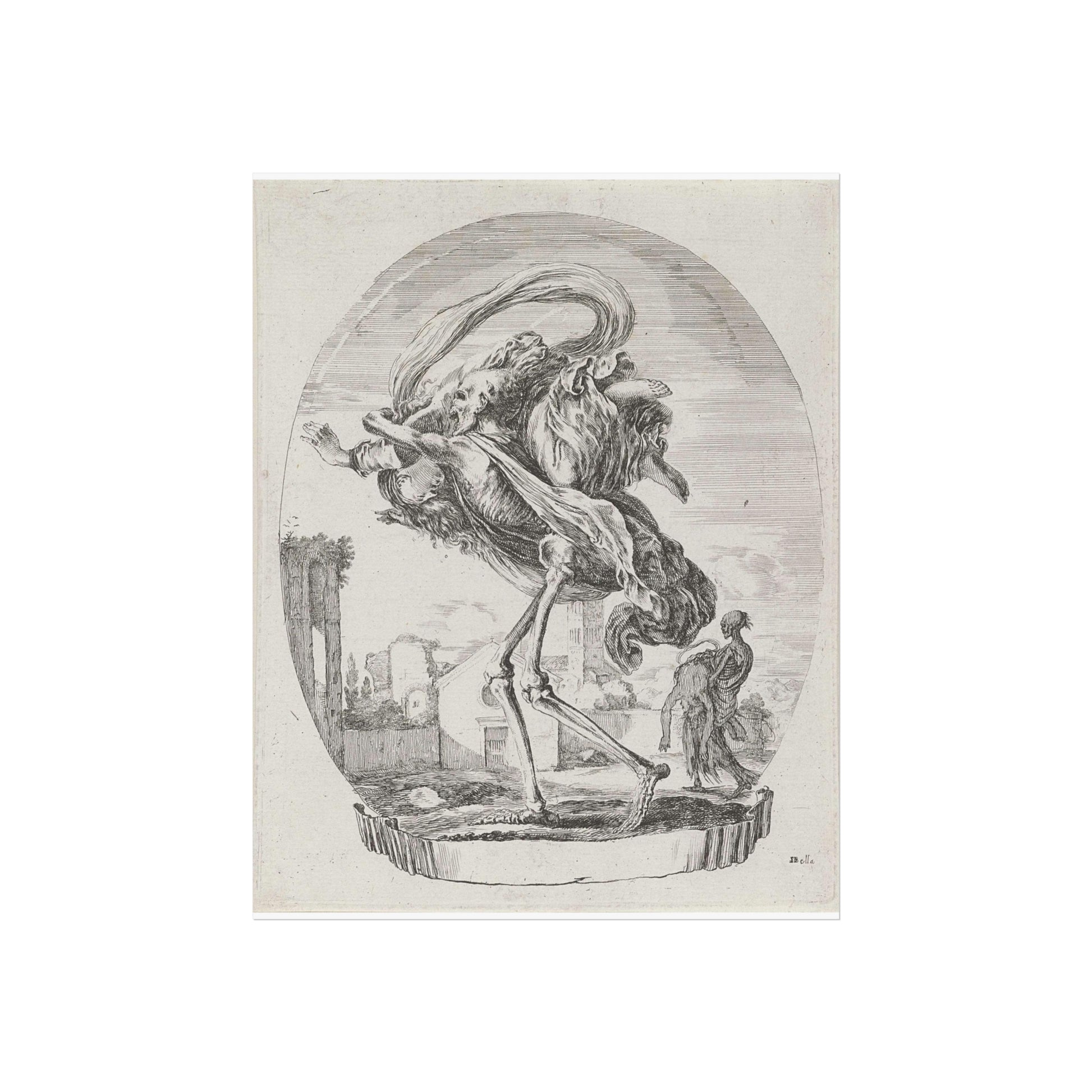 This captivating artwork showcases the macabre figure of Death, represented as a skeleton, carrying a woman over his shoulder. In the backdrop, another skeleton is seen holding a woman in his arms, adding to the chilling narrative of the piece.