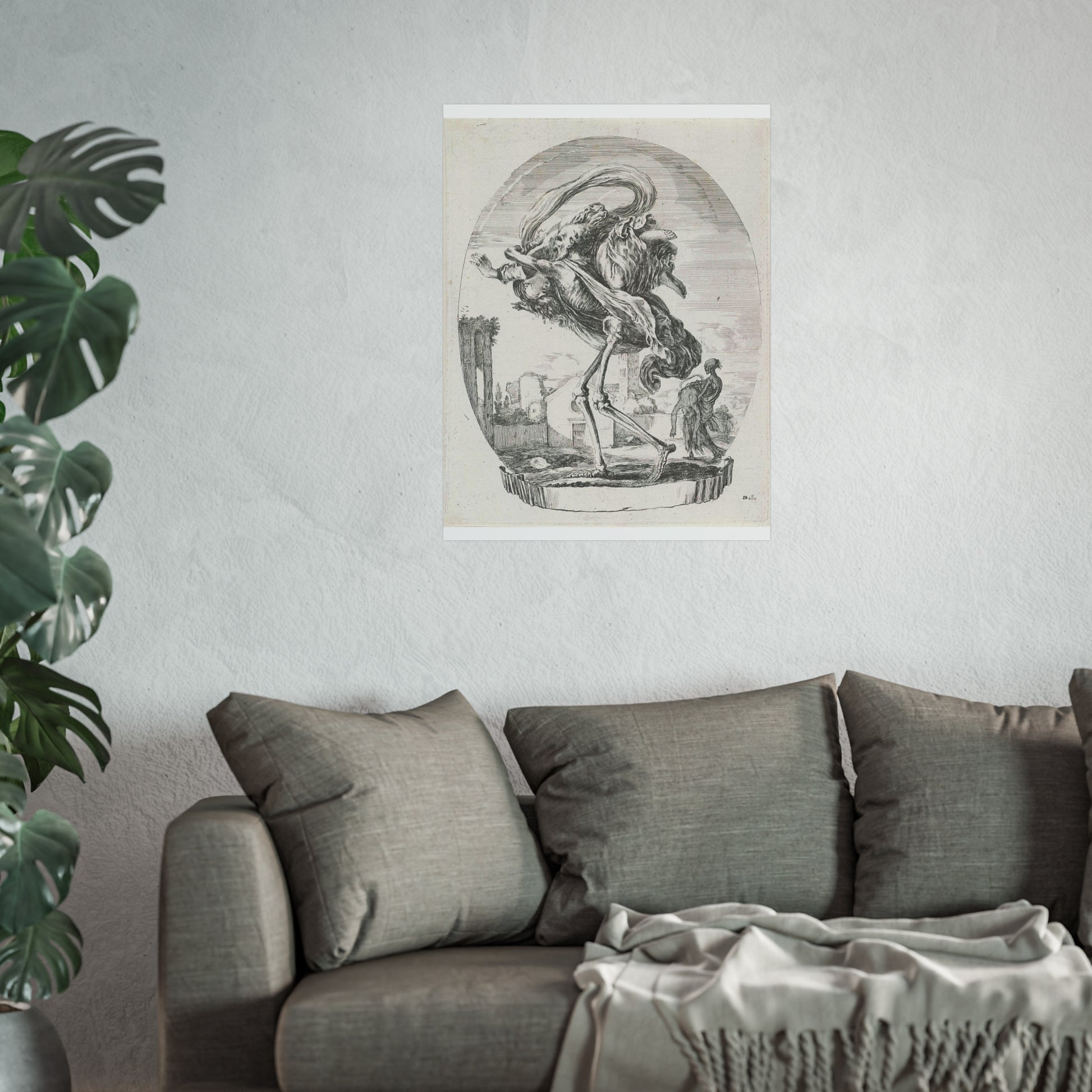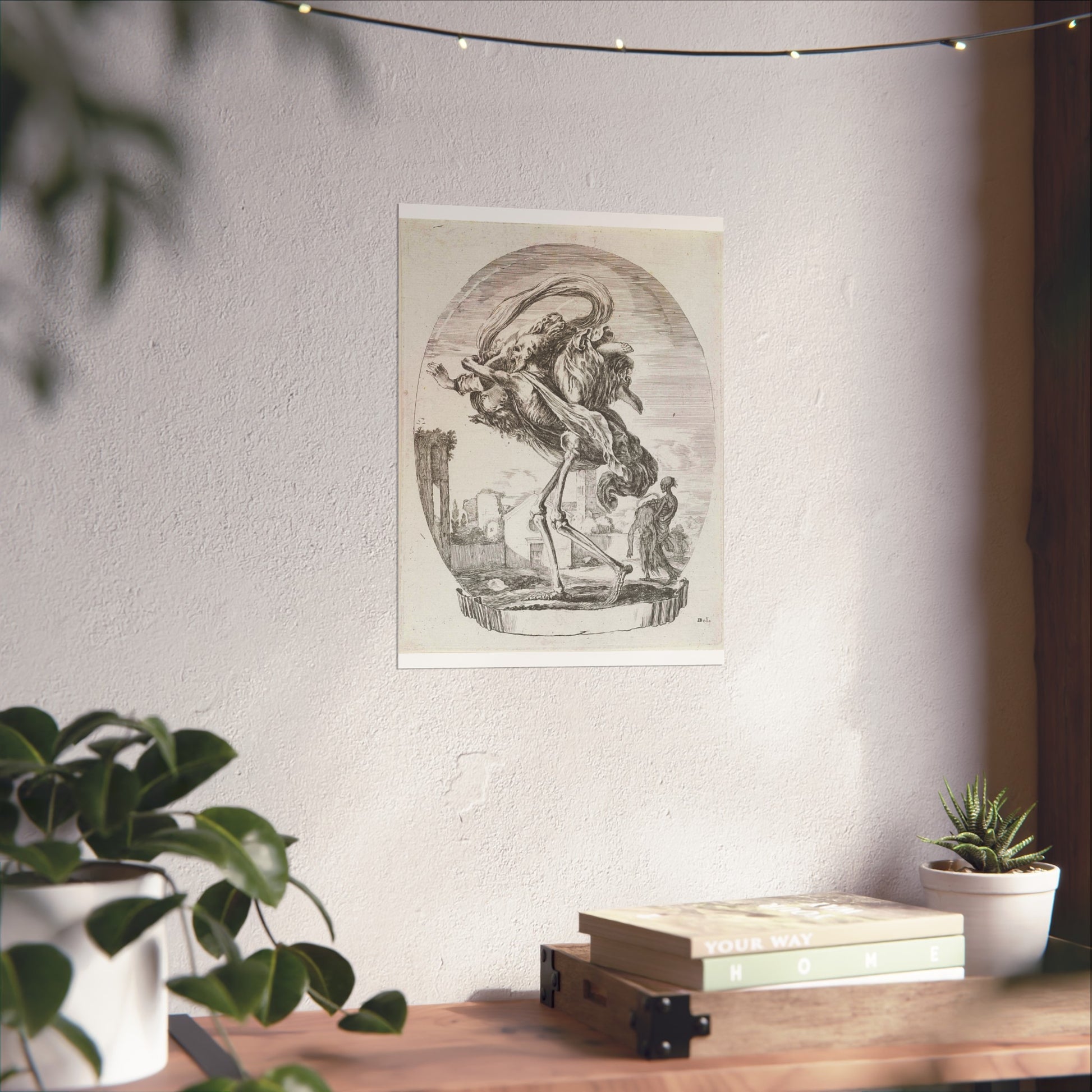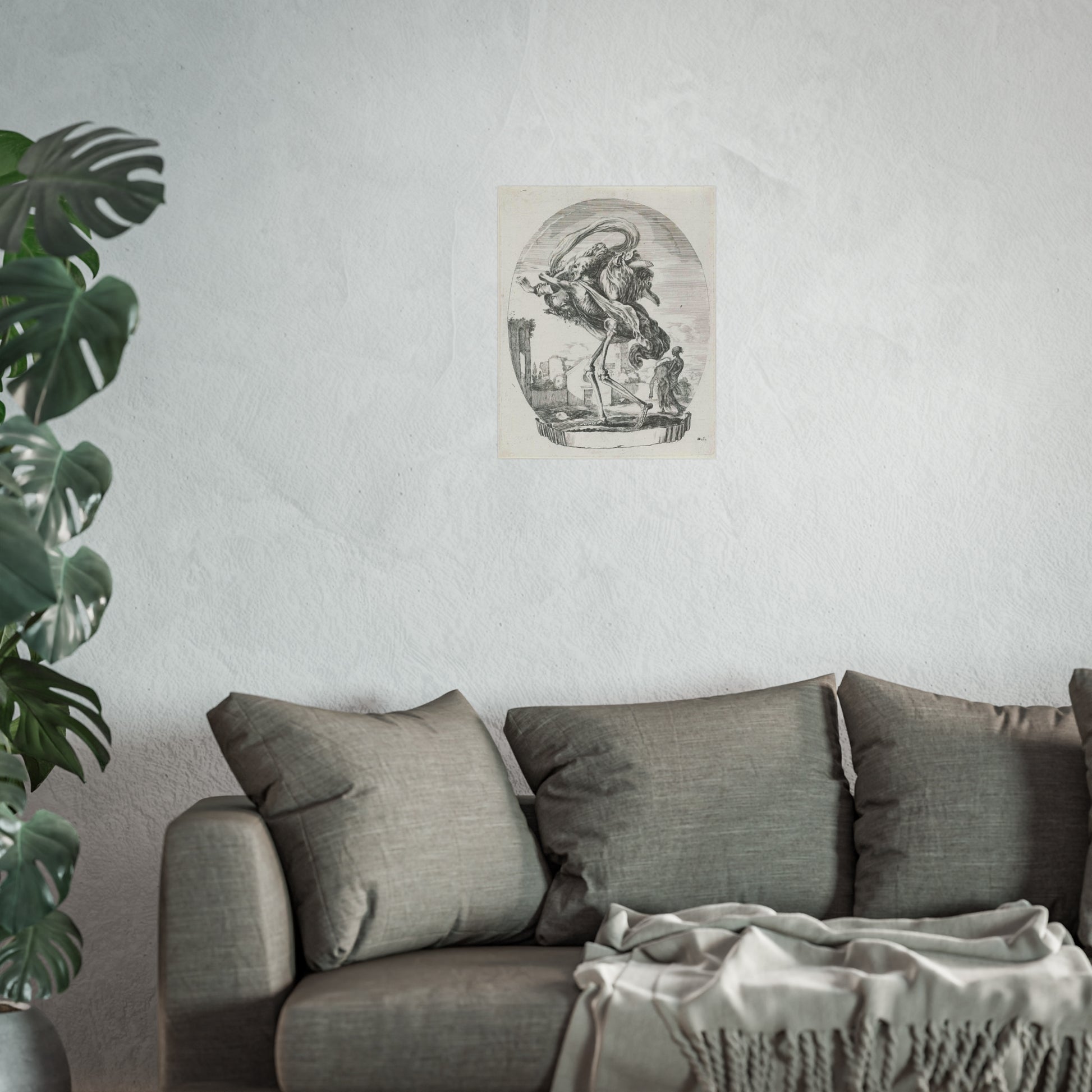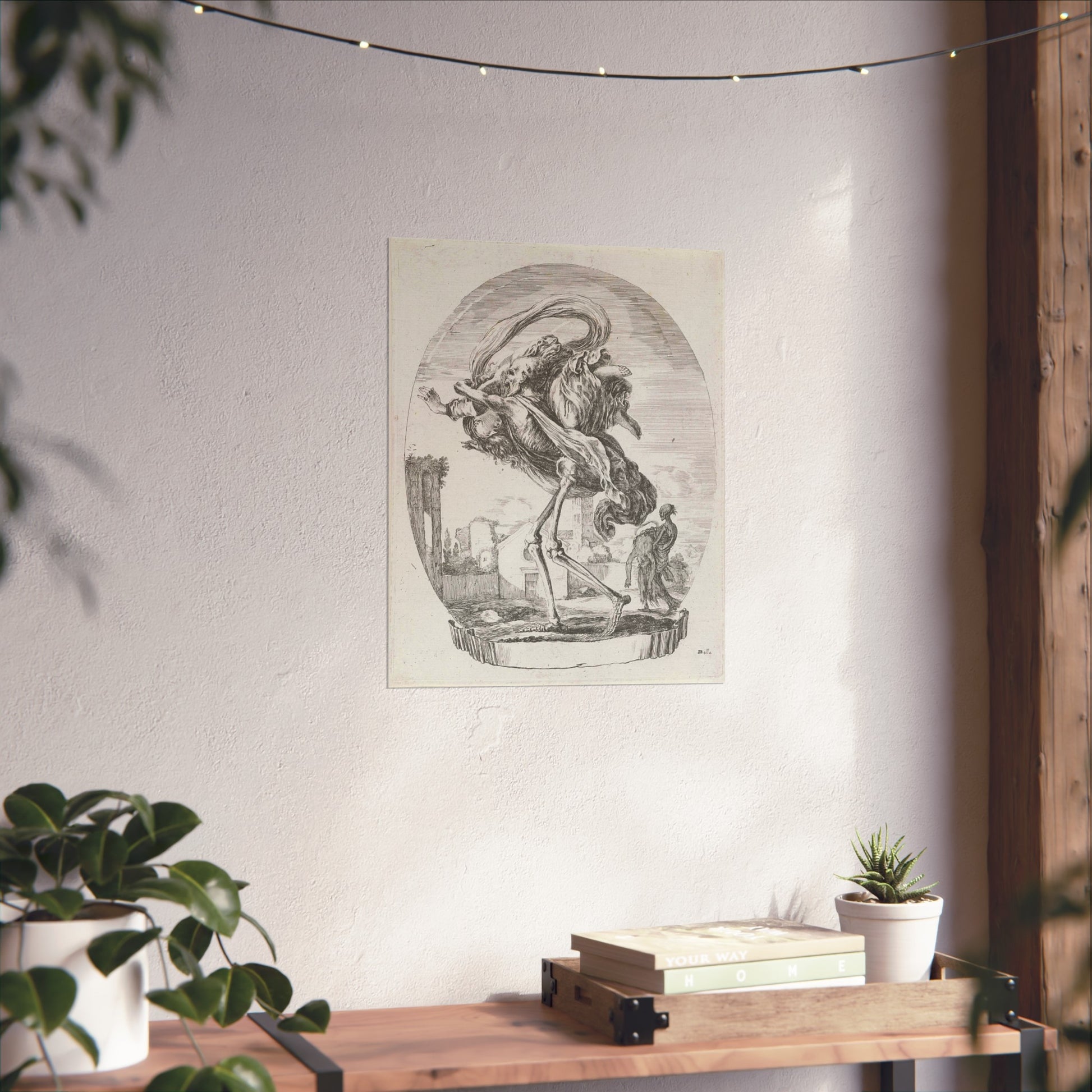 This captivating artwork showcases the macabre figure of Death, represented as a skeleton, carrying a woman over his shoulder. In the backdrop, another skeleton is seen holding a woman in his arms, adding to the chilling narrative of the piece.
