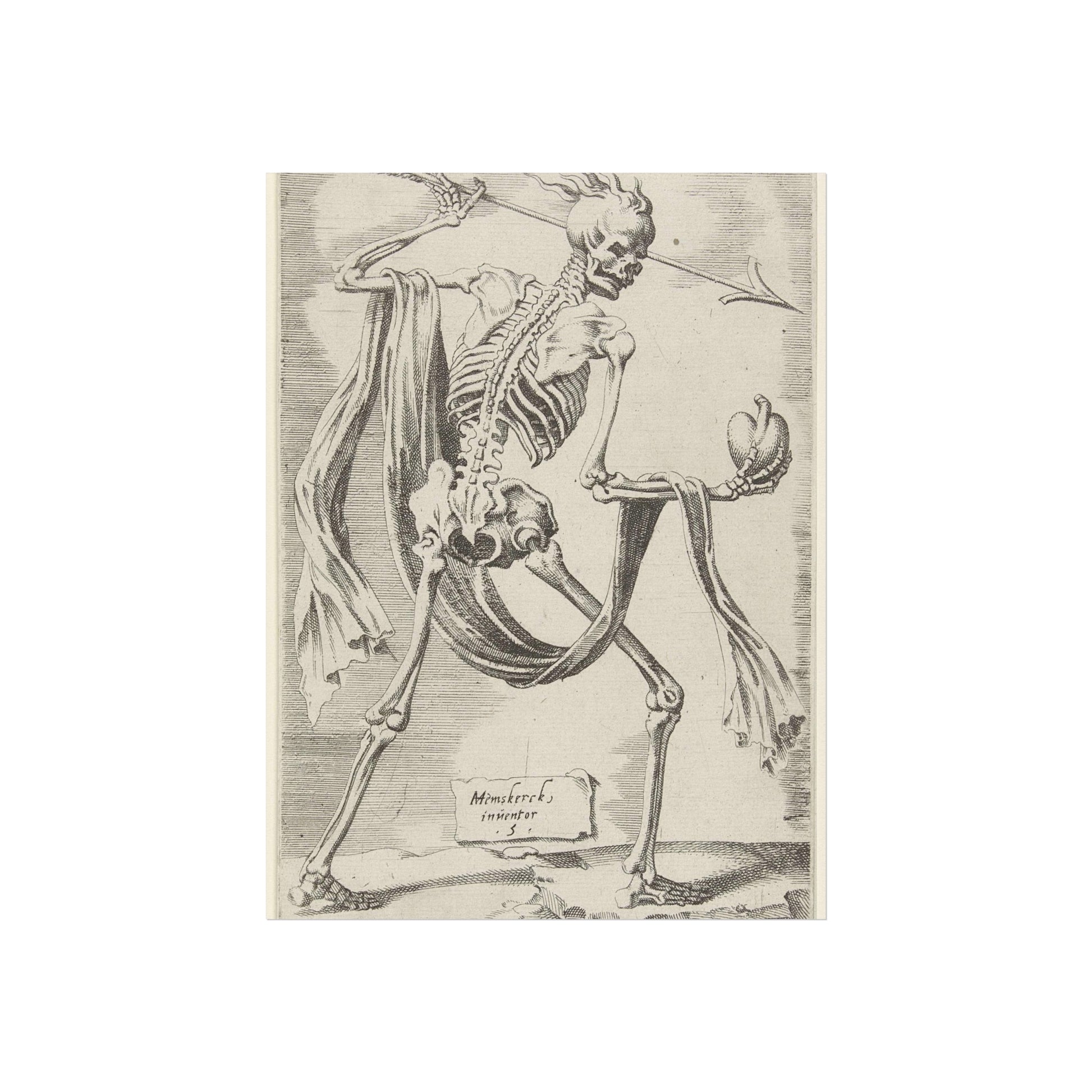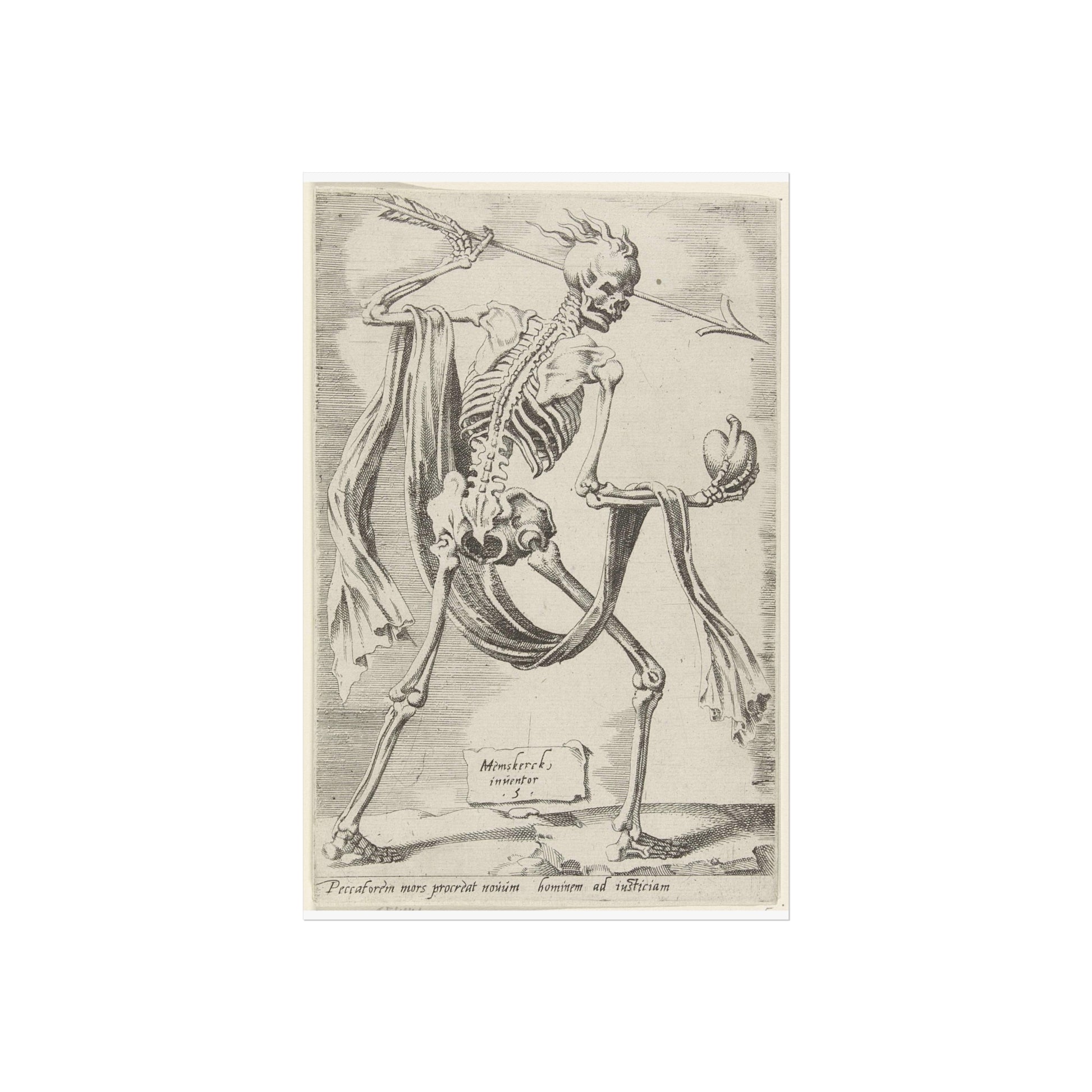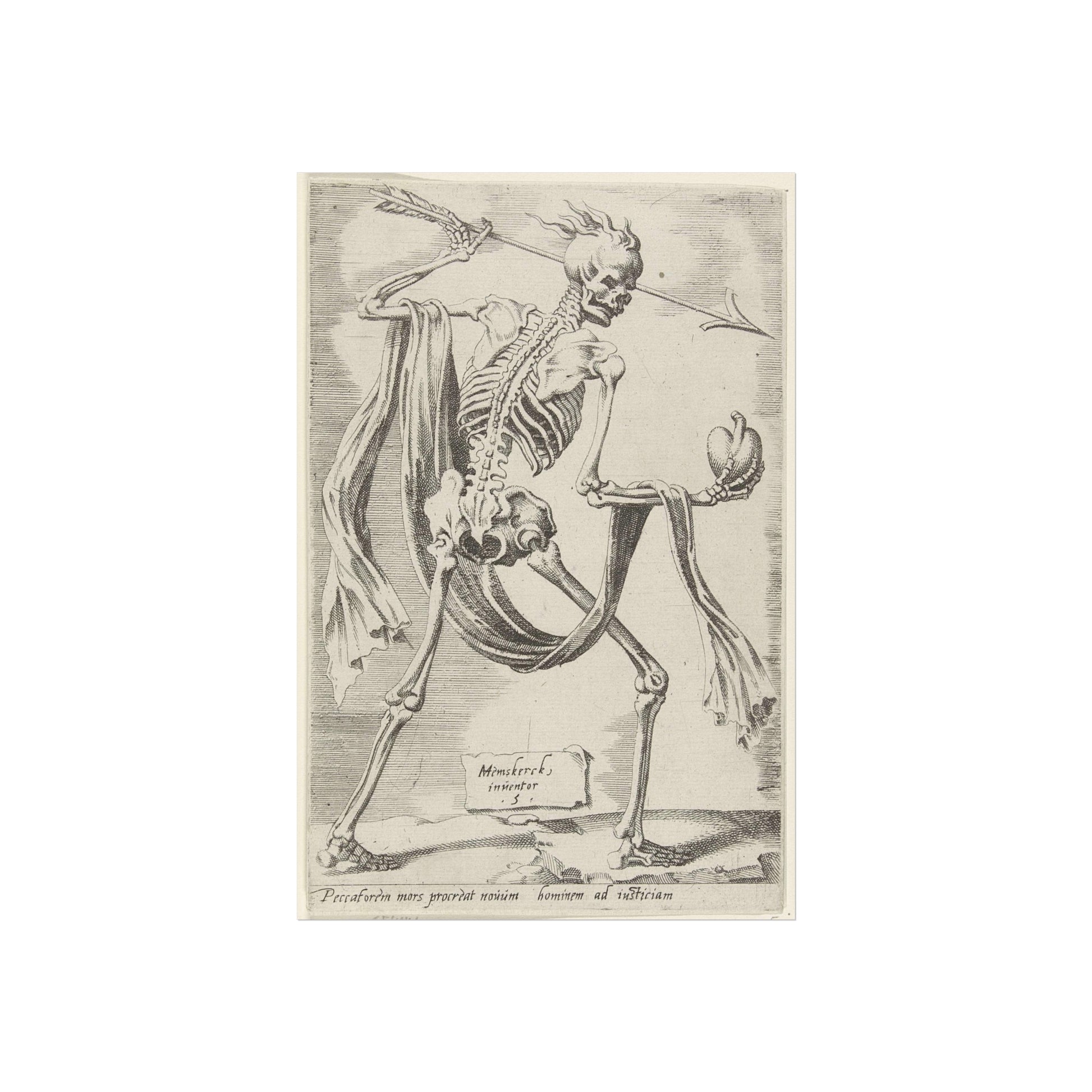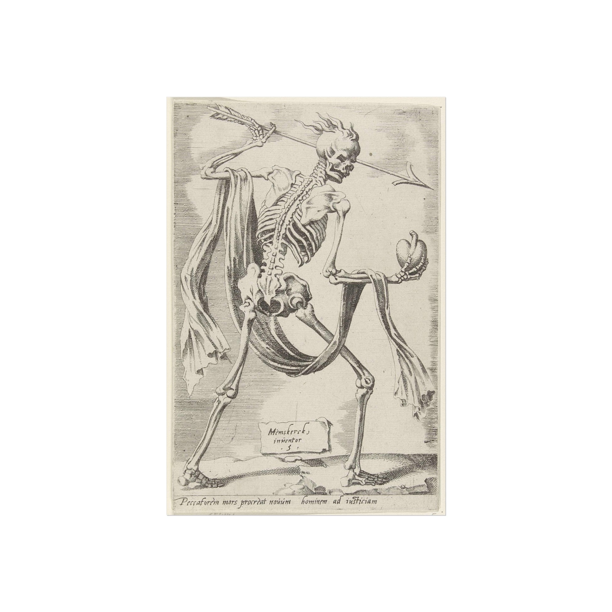 The chilling personification of Death is depicted holding a human heart in his right hand, poised to pierce it with the spear clutched in his left. This print, annotated with a Latin inscription, is part of a riveting fourteen-part series that explores the path to eternal bliss.