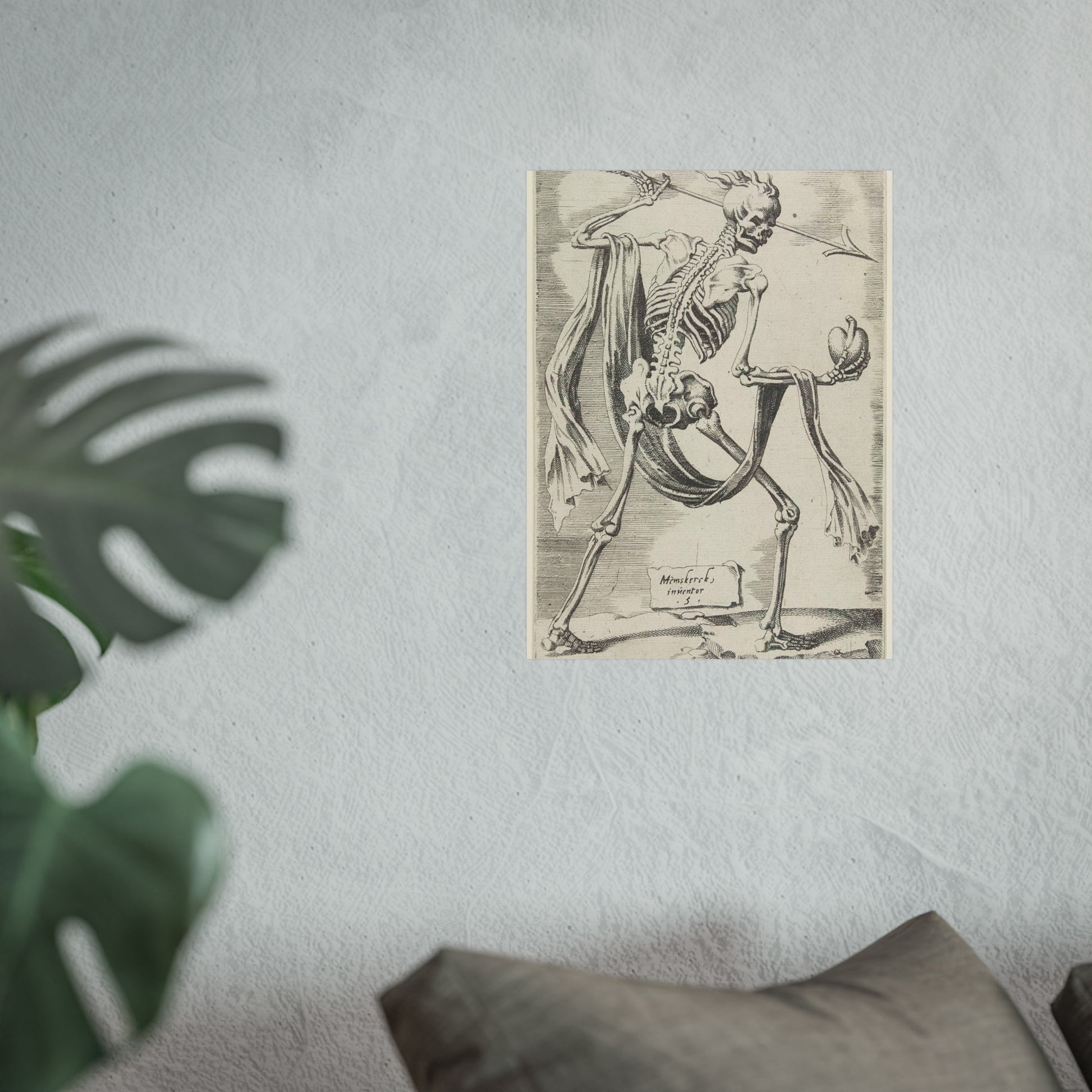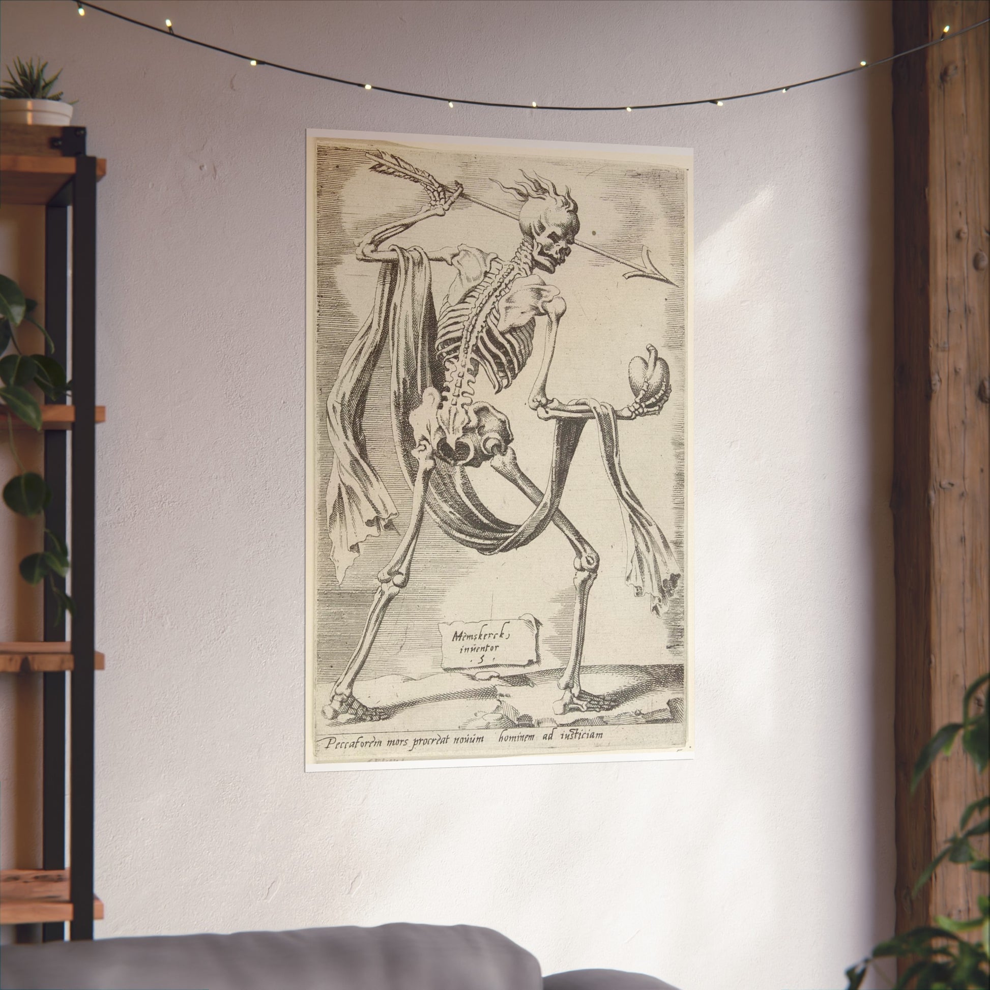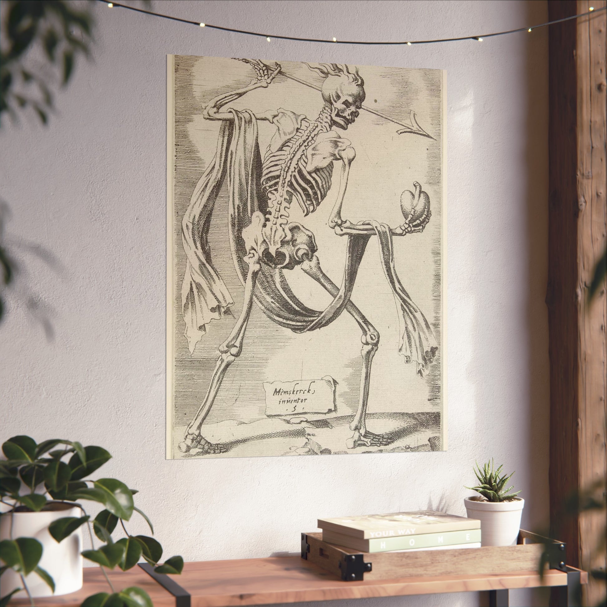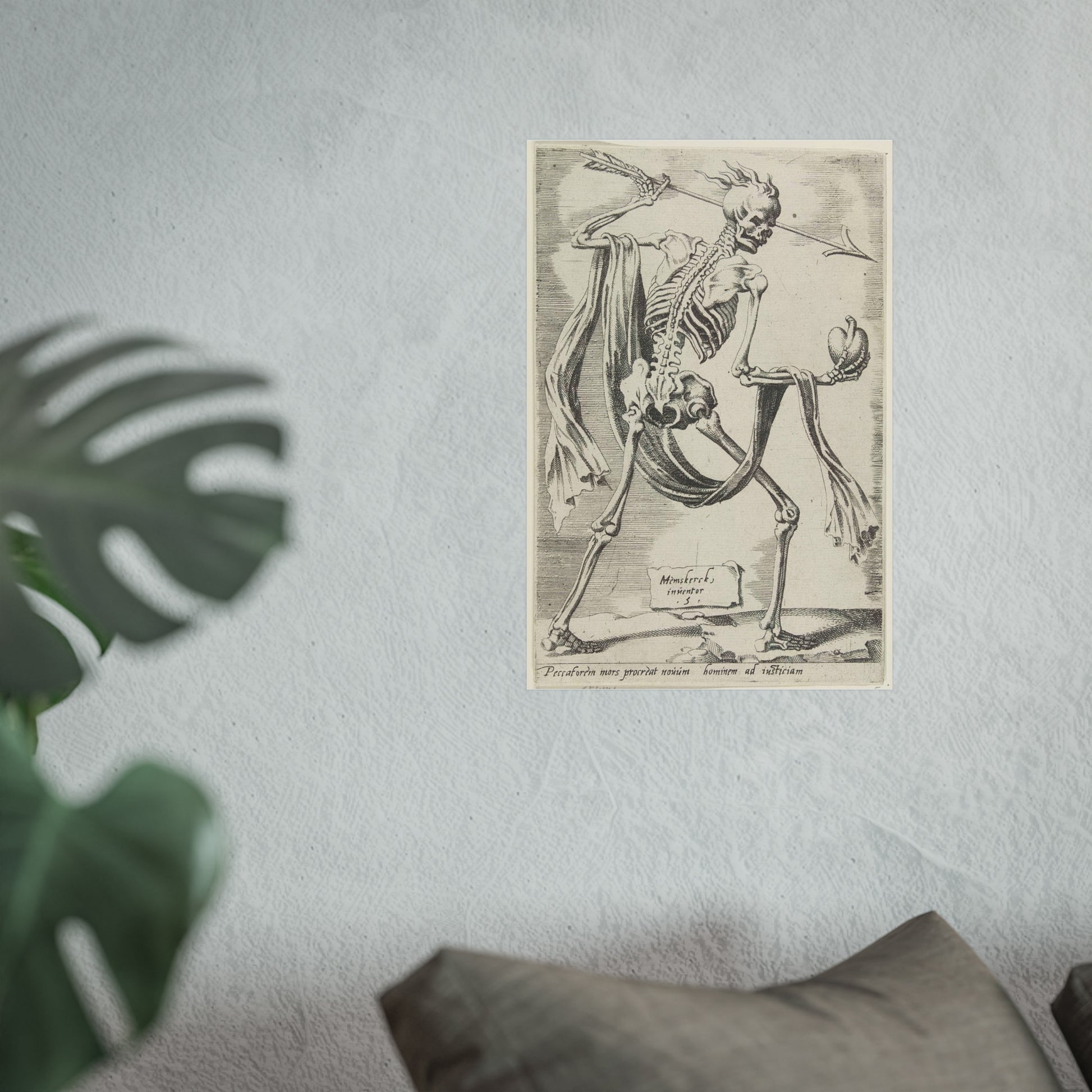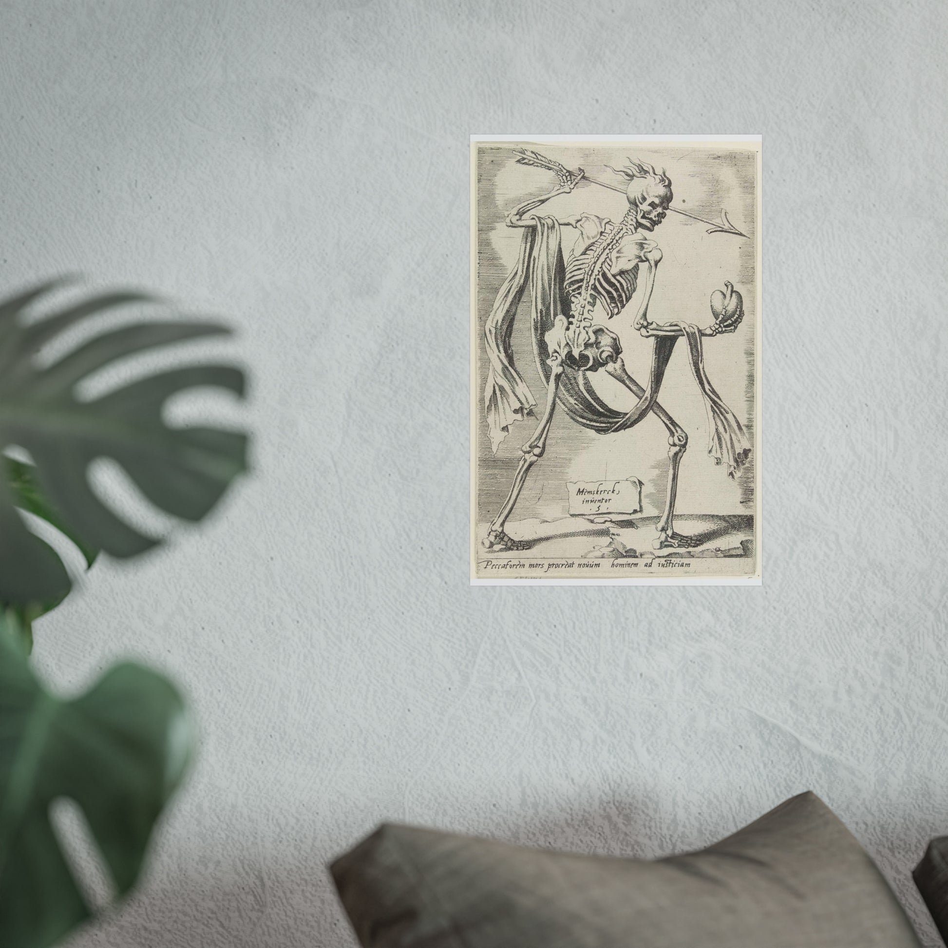 The chilling personification of Death is depicted holding a human heart in his right hand, poised to pierce it with the spear clutched in his left. This print, annotated with a Latin inscription, is part of a riveting fourteen-part series that explores the path to eternal bliss.