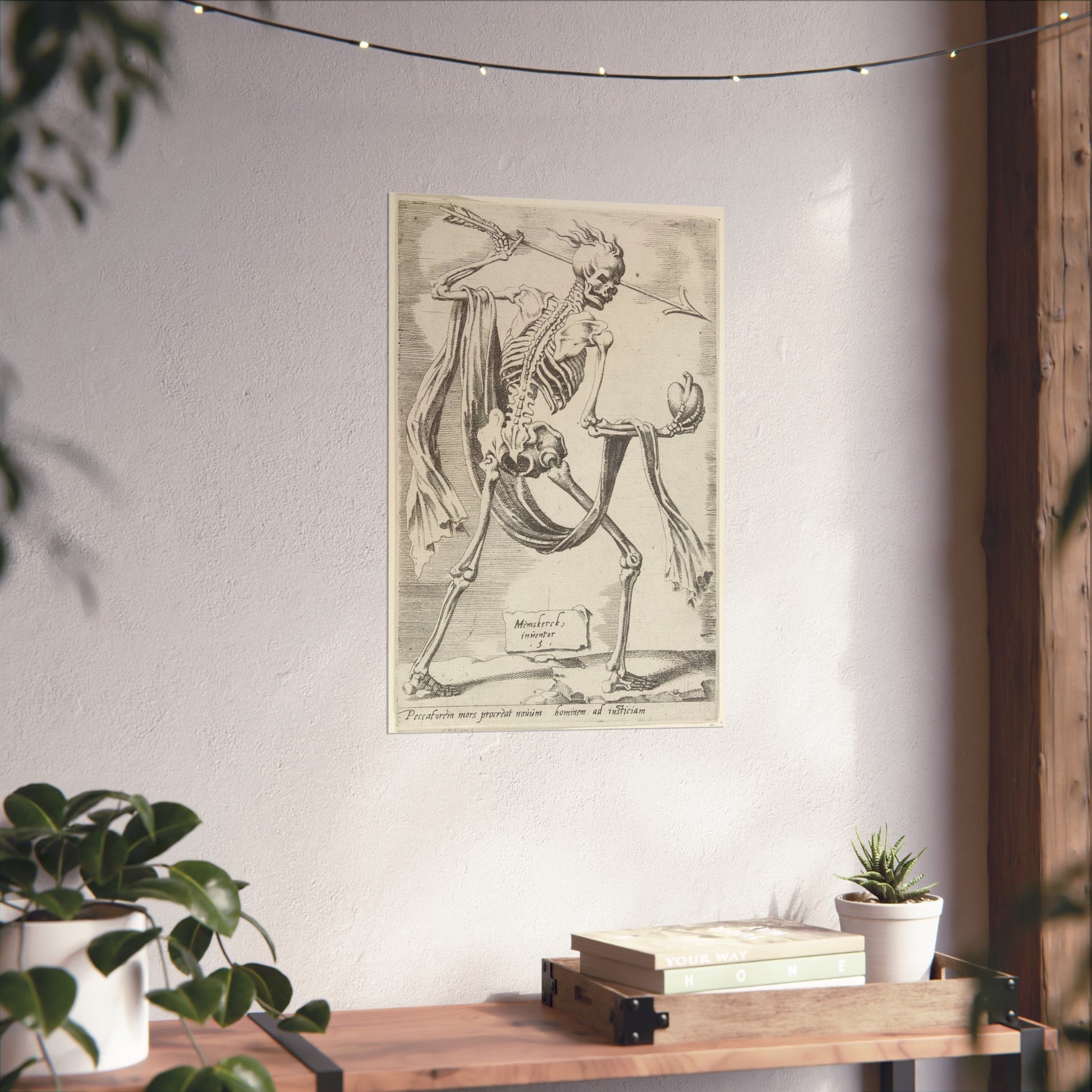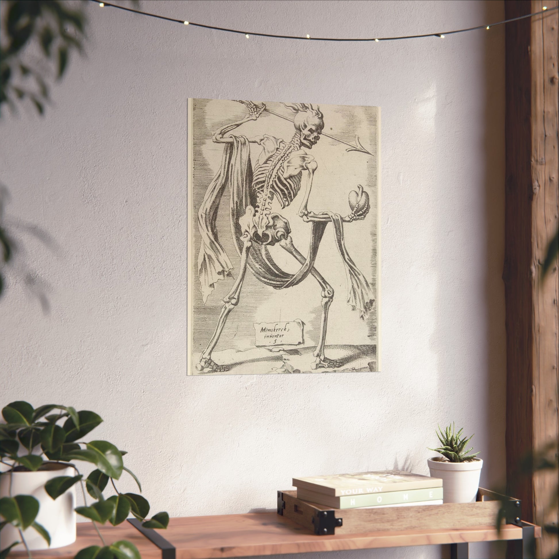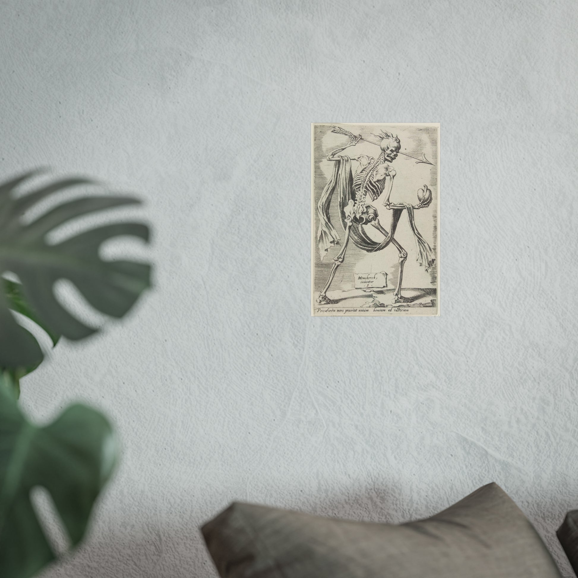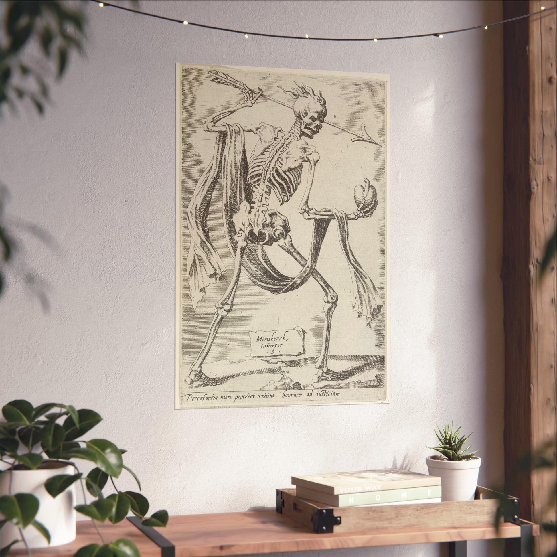 The chilling personification of Death is depicted holding a human heart in his right hand, poised to pierce it with the spear clutched in his left. This print, annotated with a Latin inscription, is part of a riveting fourteen-part series that explores the path to eternal bliss.