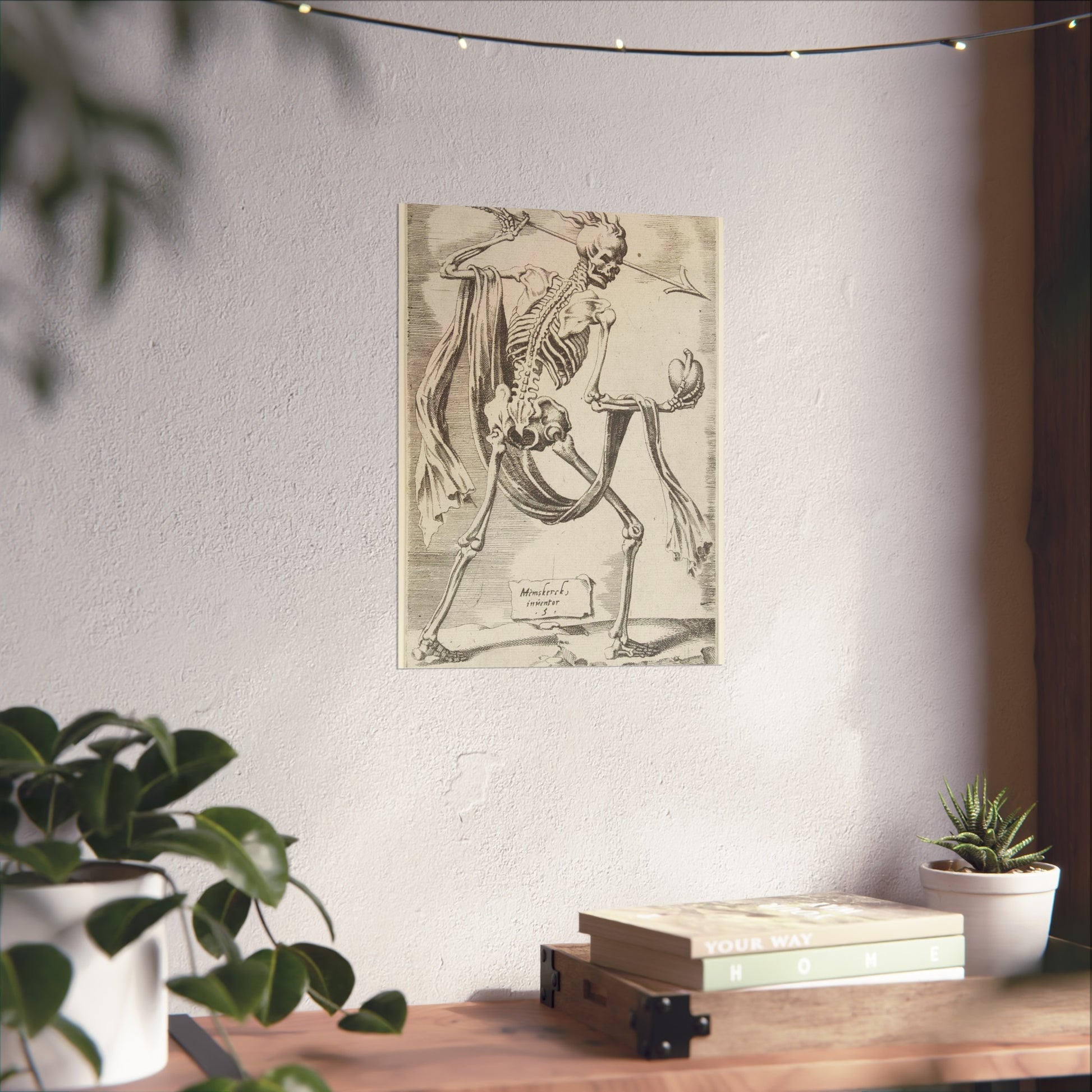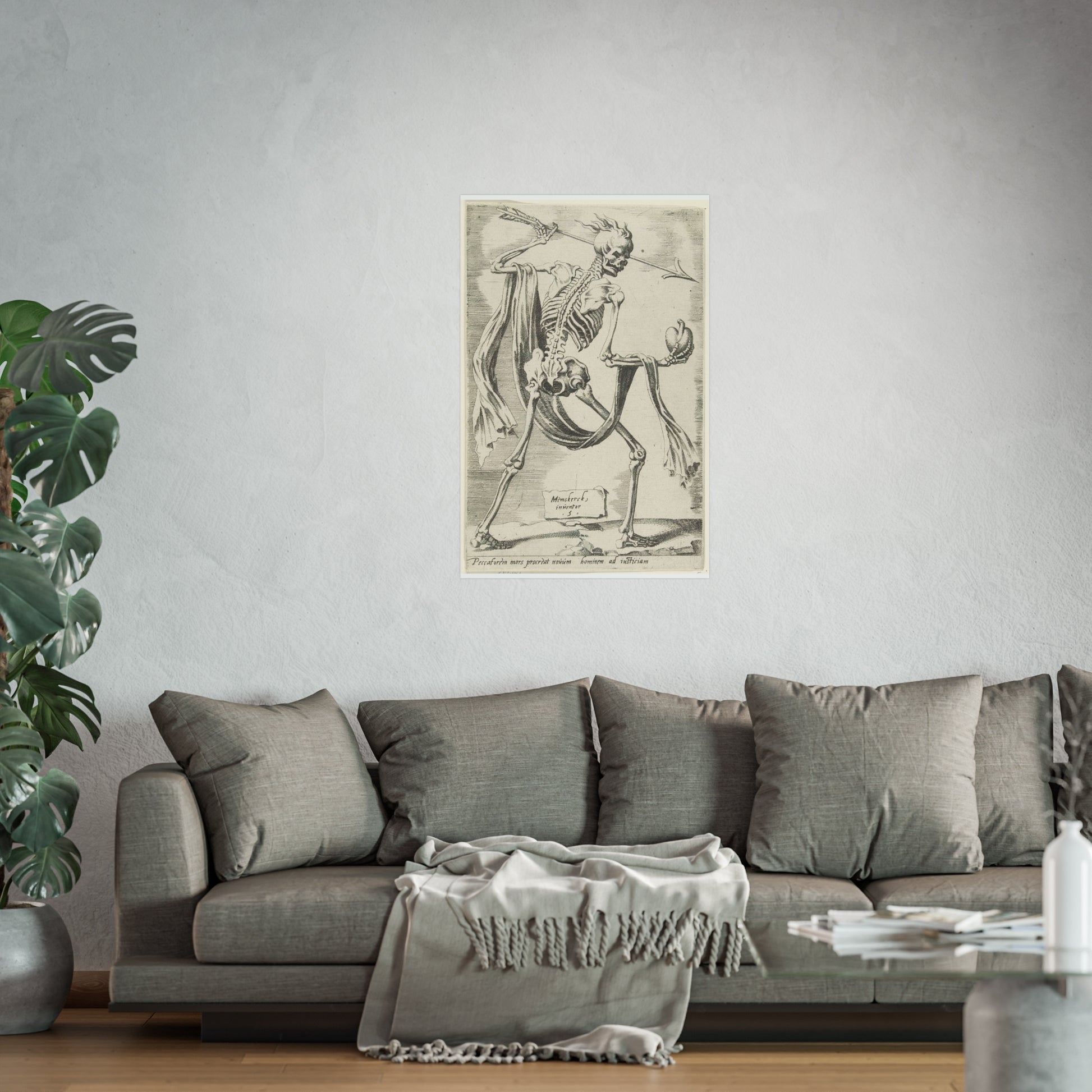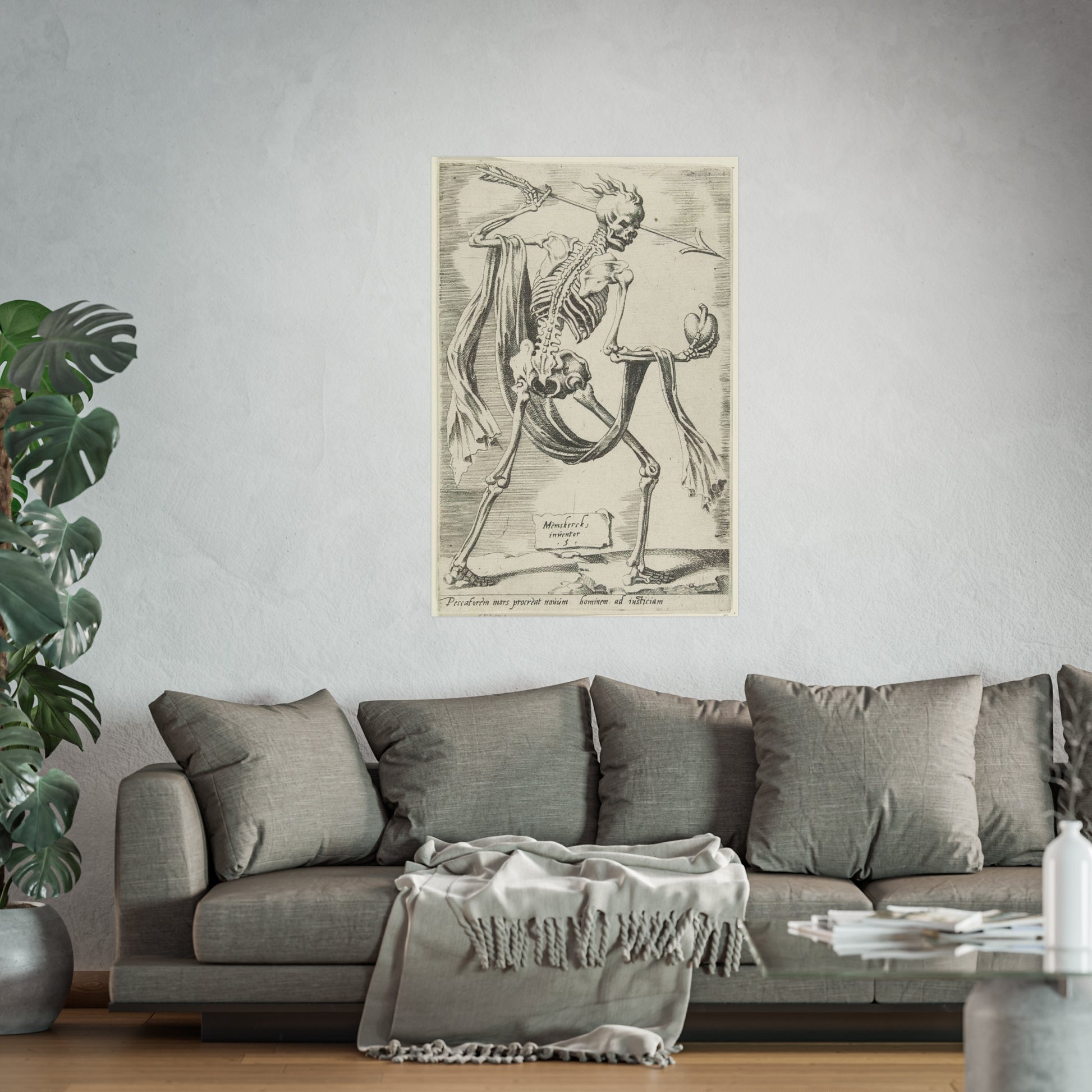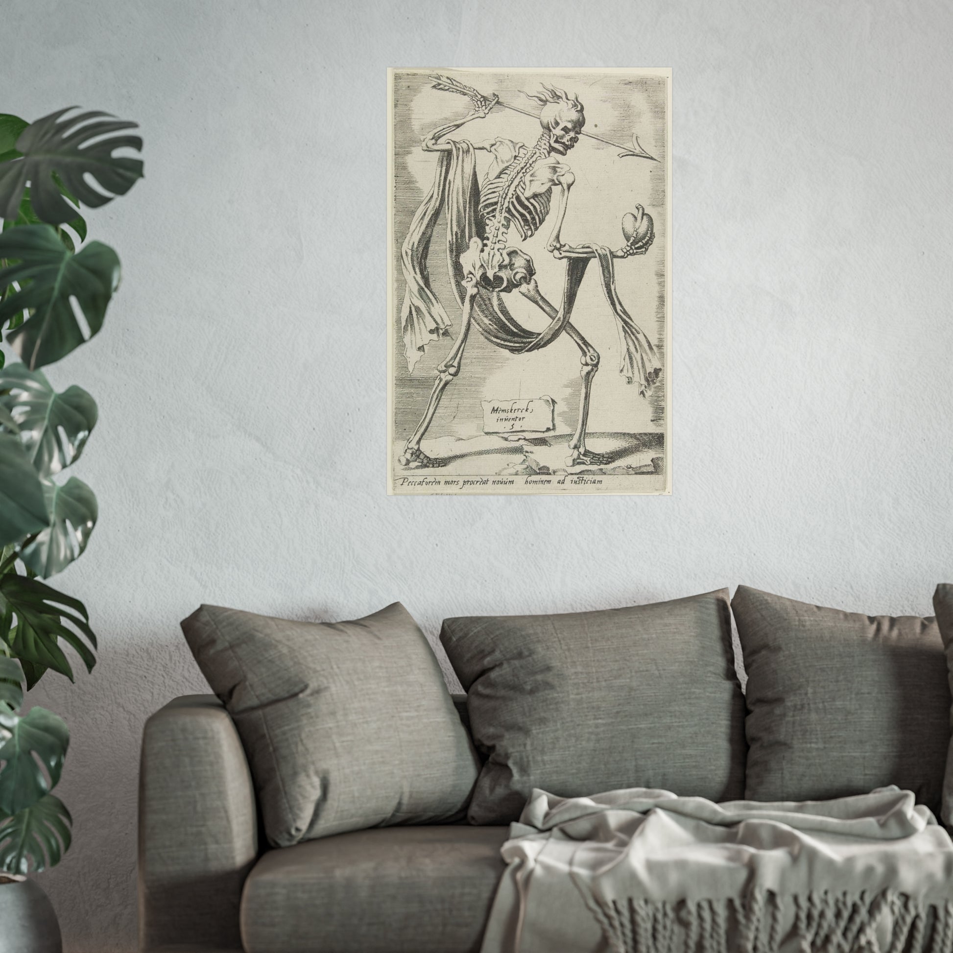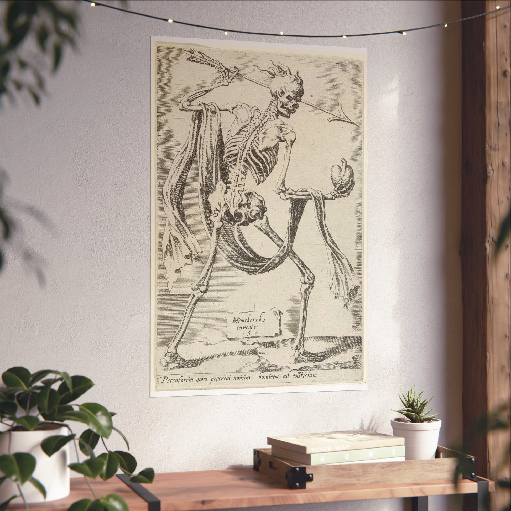 The chilling personification of Death is depicted holding a human heart in his right hand, poised to pierce it with the spear clutched in his left. This print, annotated with a Latin inscription, is part of a riveting fourteen-part series that explores the path to eternal bliss.