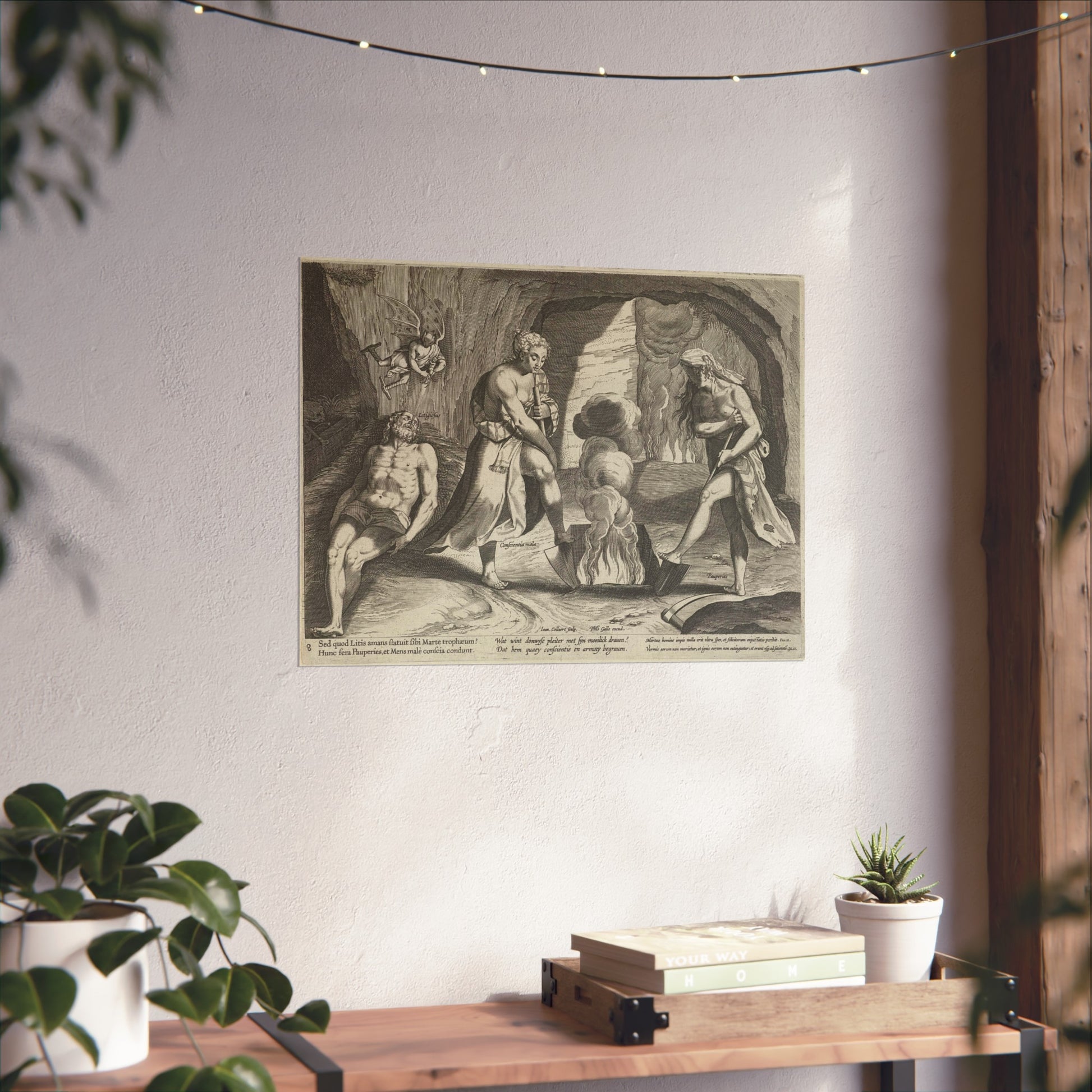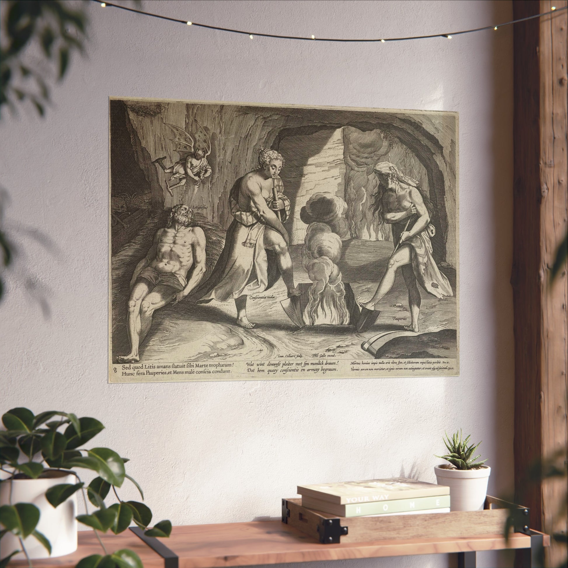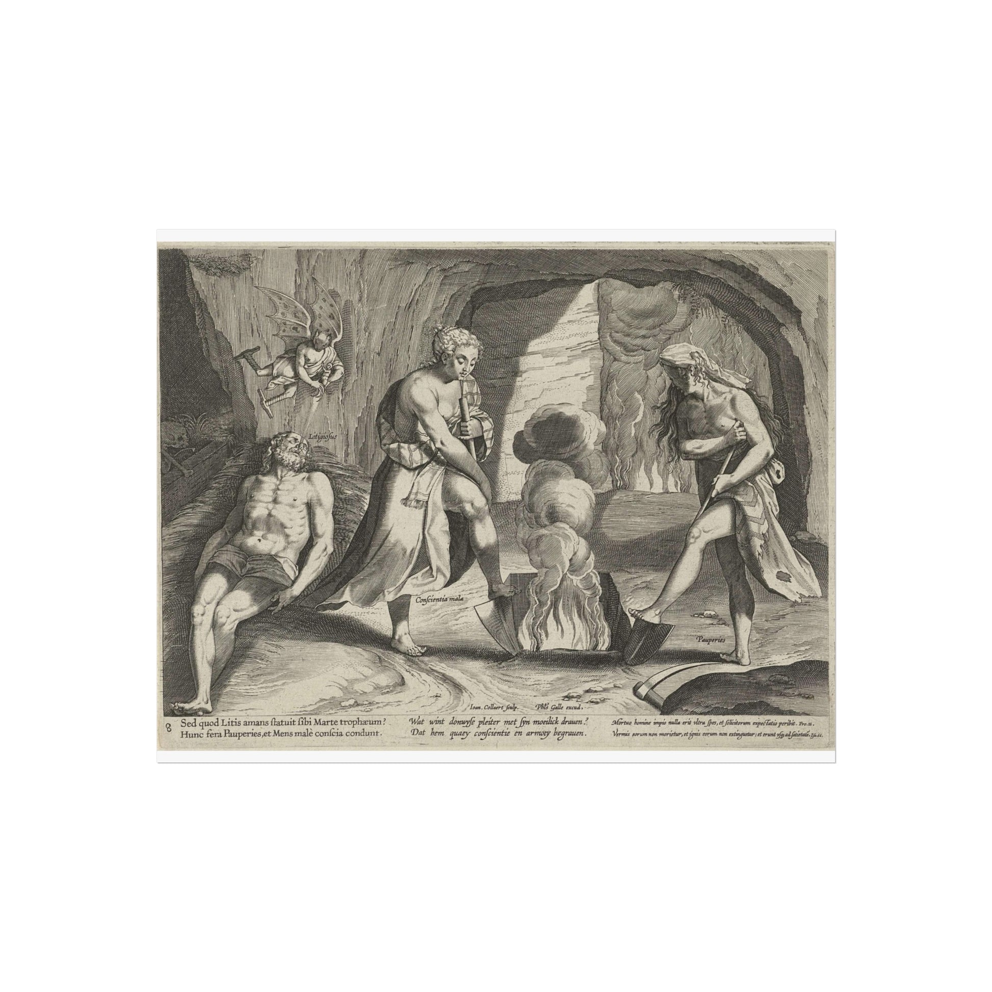 In a dramatic scene set within a cave, the Foolish Accuser, known as Litigiosus, is captured on his deathbed, exhaling his final breath. The embodiment of Litigation, Lis, hovers above him with devilish wings, ready to snatch his soul. Poverty (Pauperies) and Guilty Conscience (Conscientia Mala) are seen digging his grave, where hellfire ominously burns. This print includes three inscriptions in Latin and Dutch and is part of an eight-part series exploring the abuses in litigation.