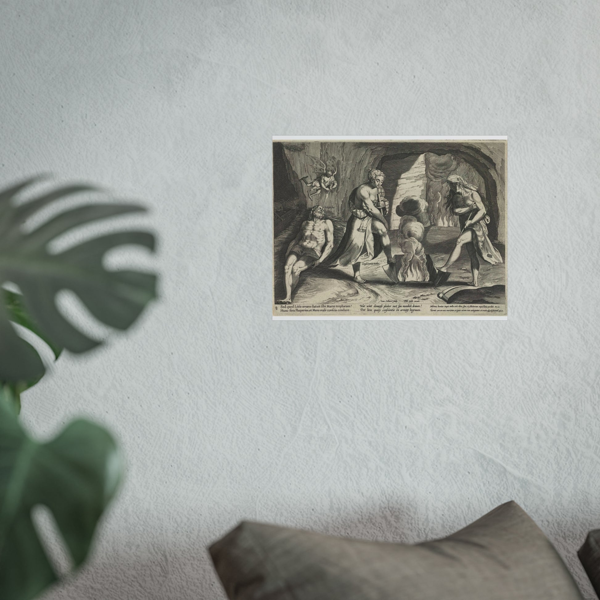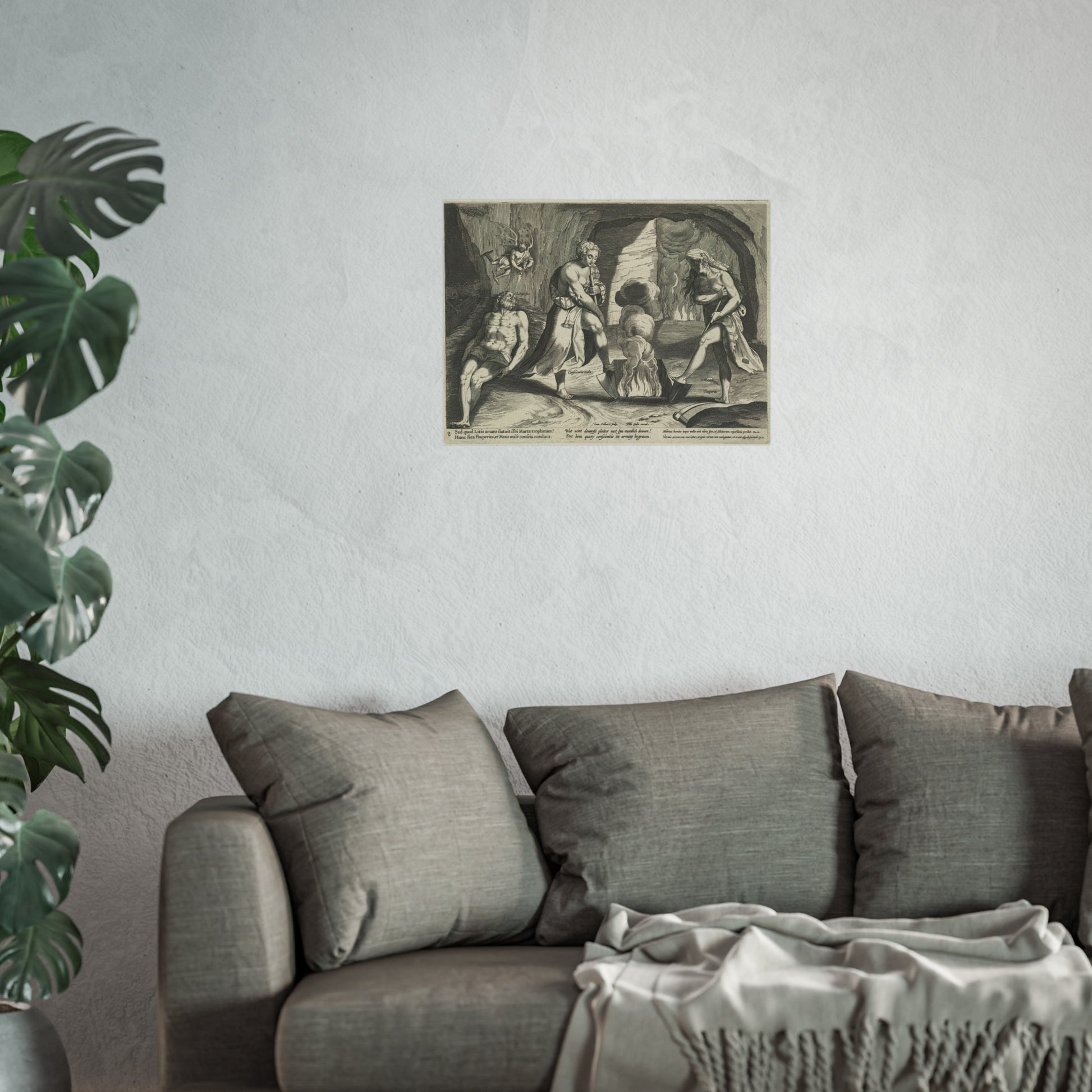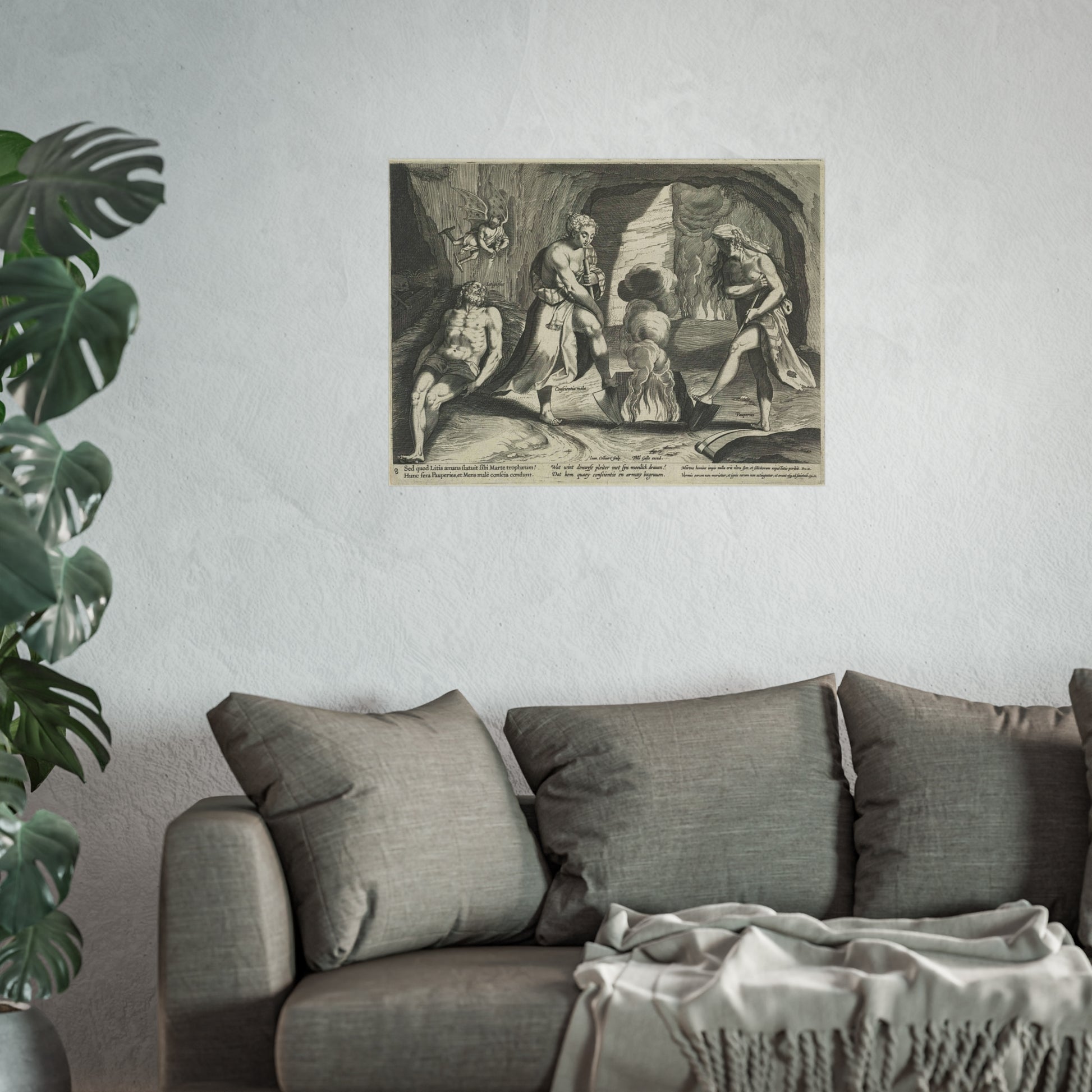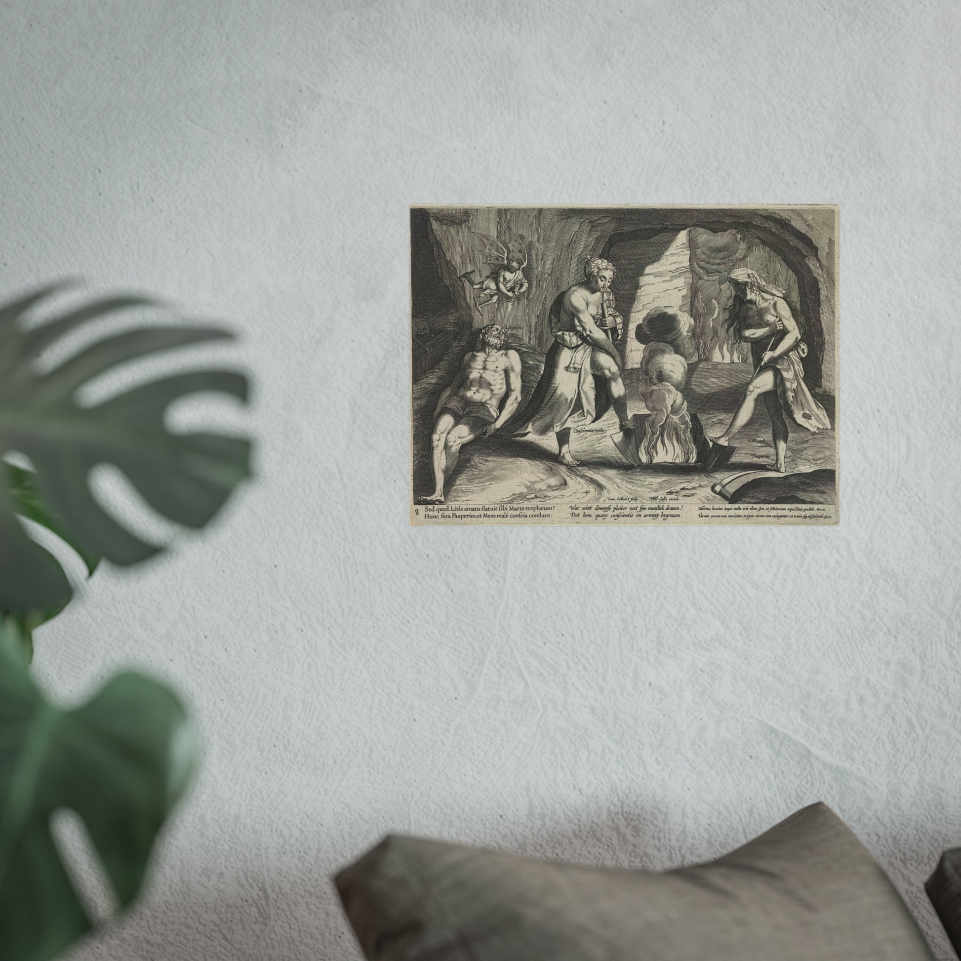 In a dramatic scene set within a cave, the Foolish Accuser, known as Litigiosus, is captured on his deathbed, exhaling his final breath. The embodiment of Litigation, Lis, hovers above him with devilish wings, ready to snatch his soul. Poverty (Pauperies) and Guilty Conscience (Conscientia Mala) are seen digging his grave, where hellfire ominously burns. This print includes three inscriptions in Latin and Dutch and is part of an eight-part series exploring the abuses in litigation.