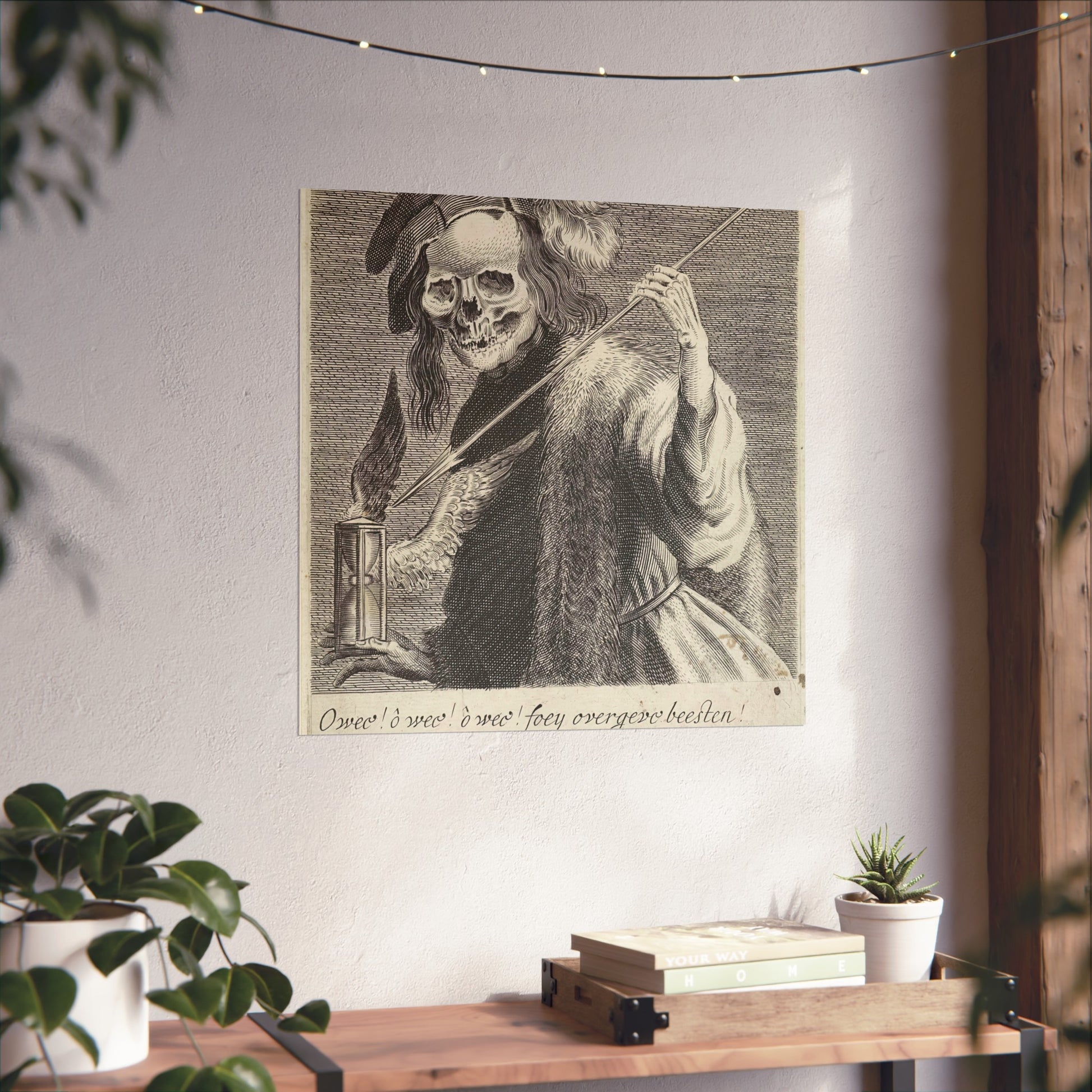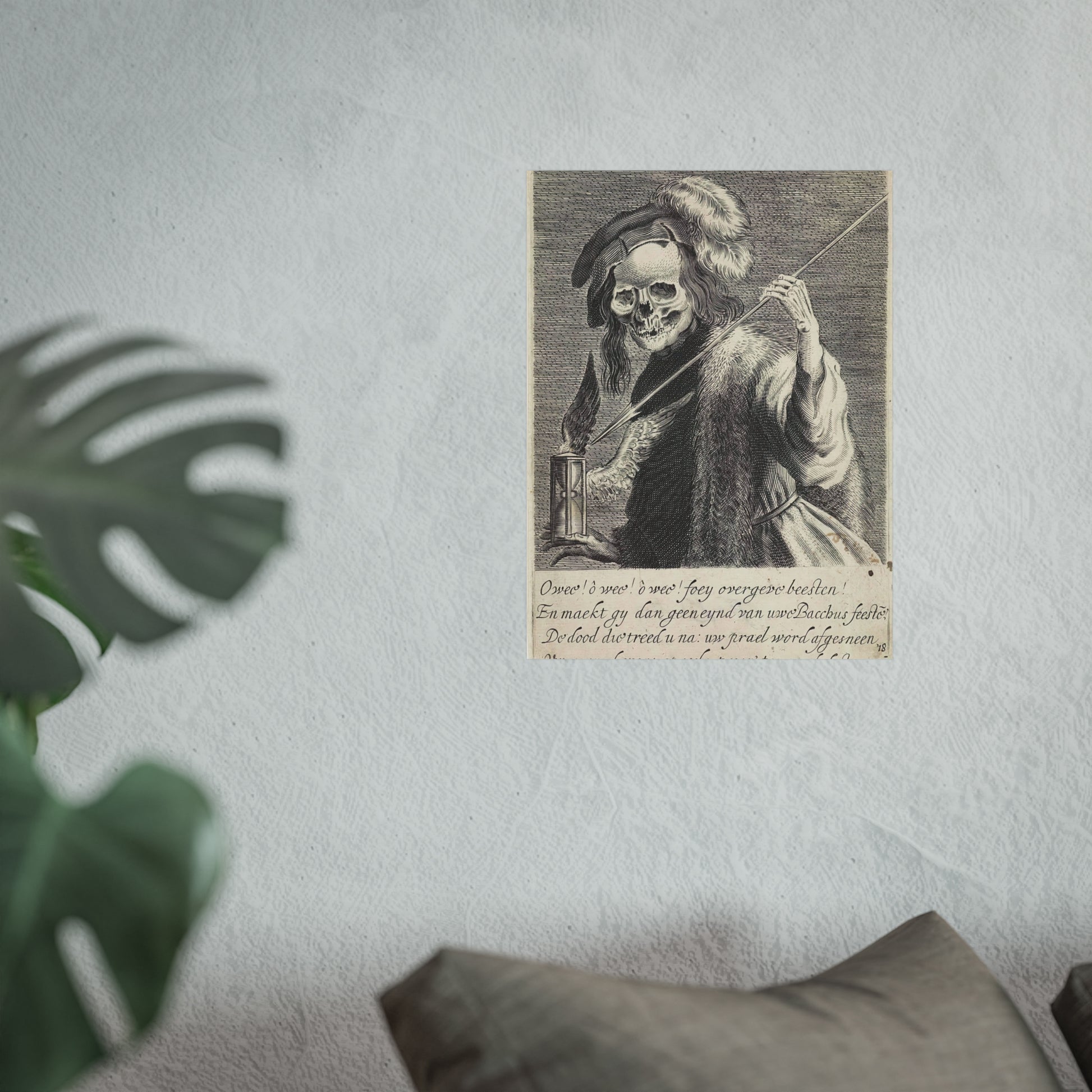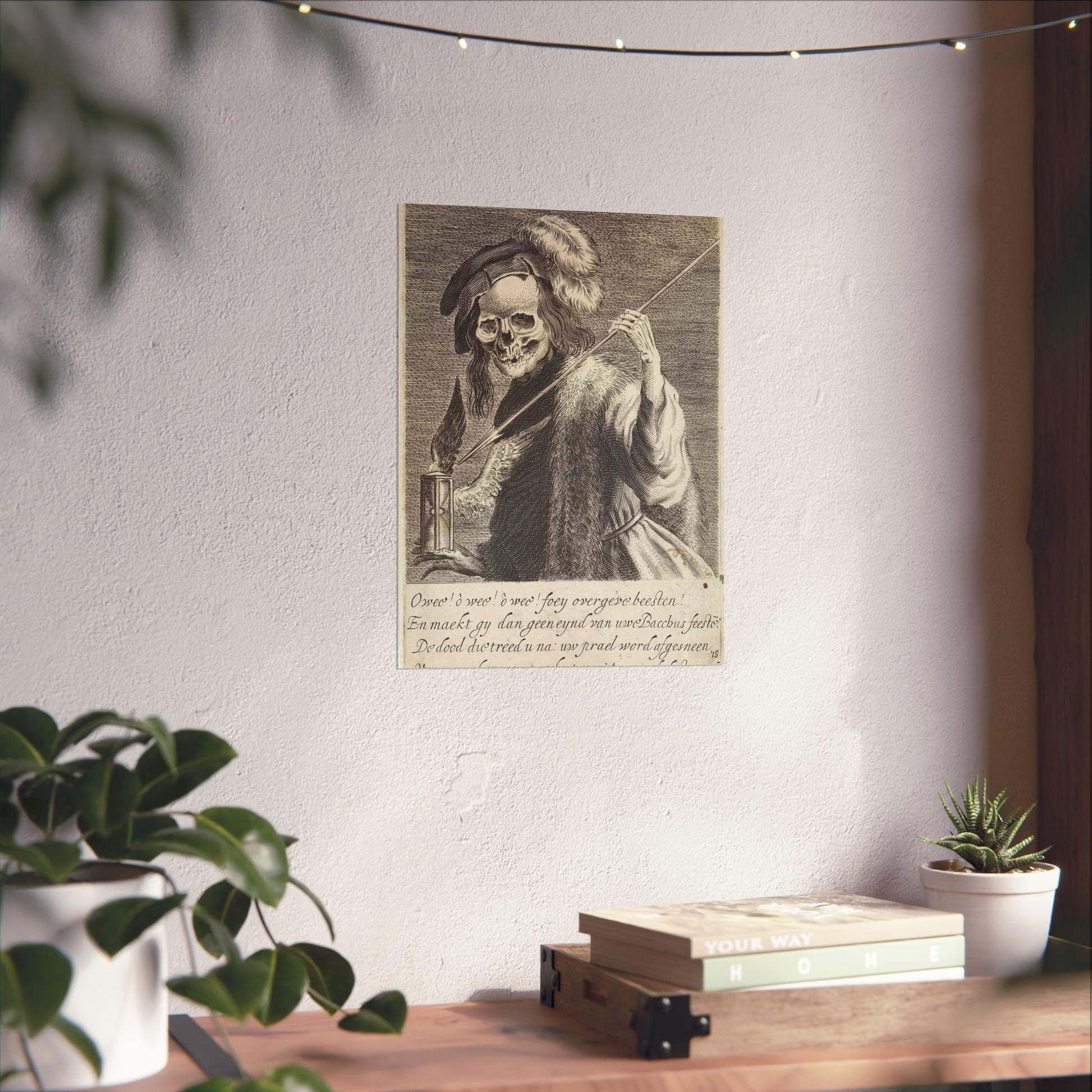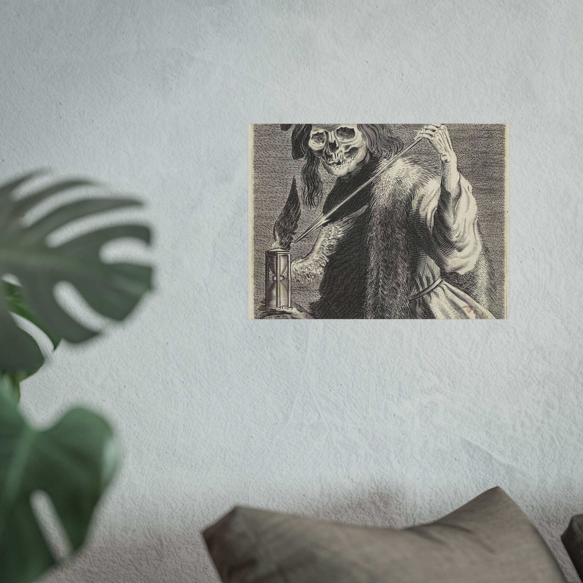 Death with a winged hourglass and an arrow. This is the final piece in an eighteen-part series by Jan van de Velde (II). The artwork vividly captures the inevitability of time and mortality through its symbolic elements.