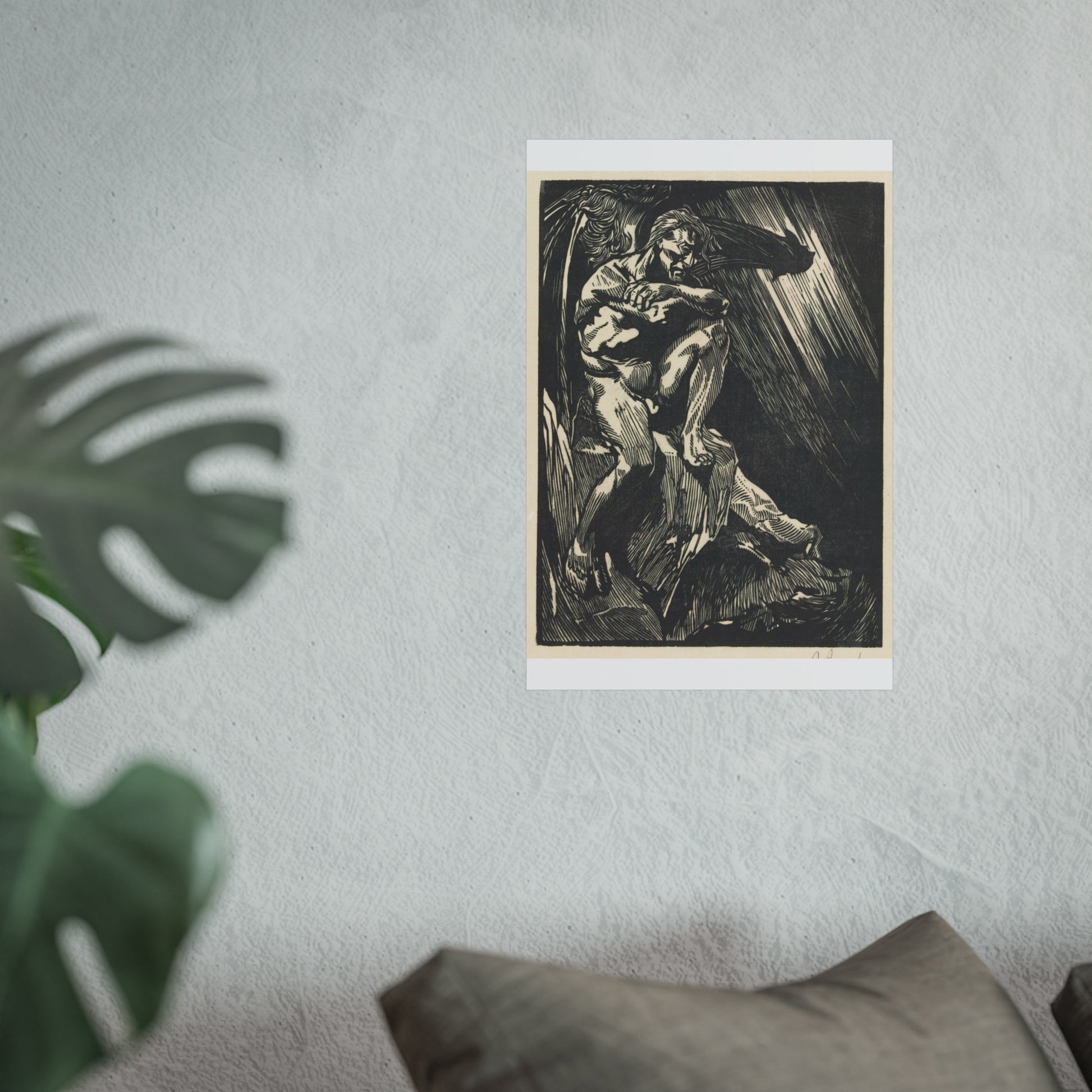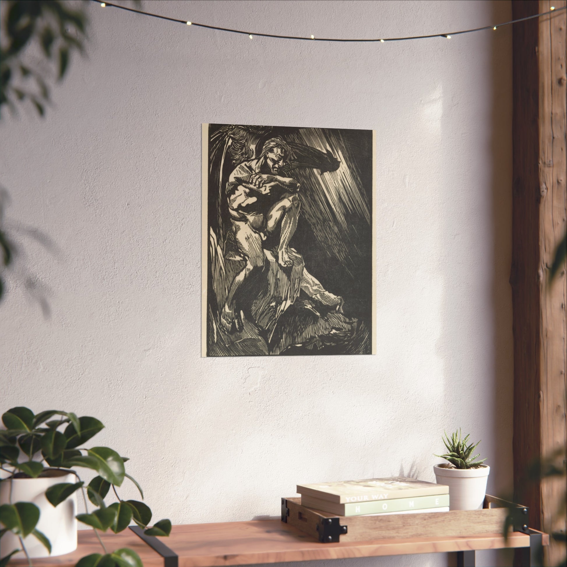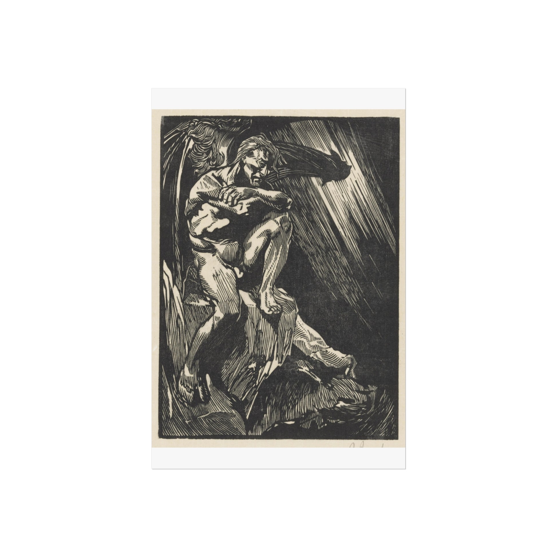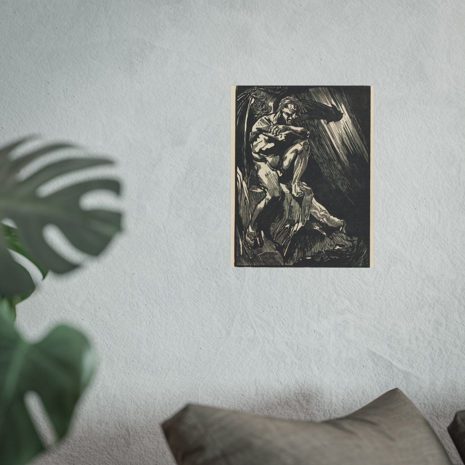 A captivating portrayal of a winged, nude man poised upon a rocky terrain. His arms are gracefully rested on his elevated left knee, creating an intriguing composition.